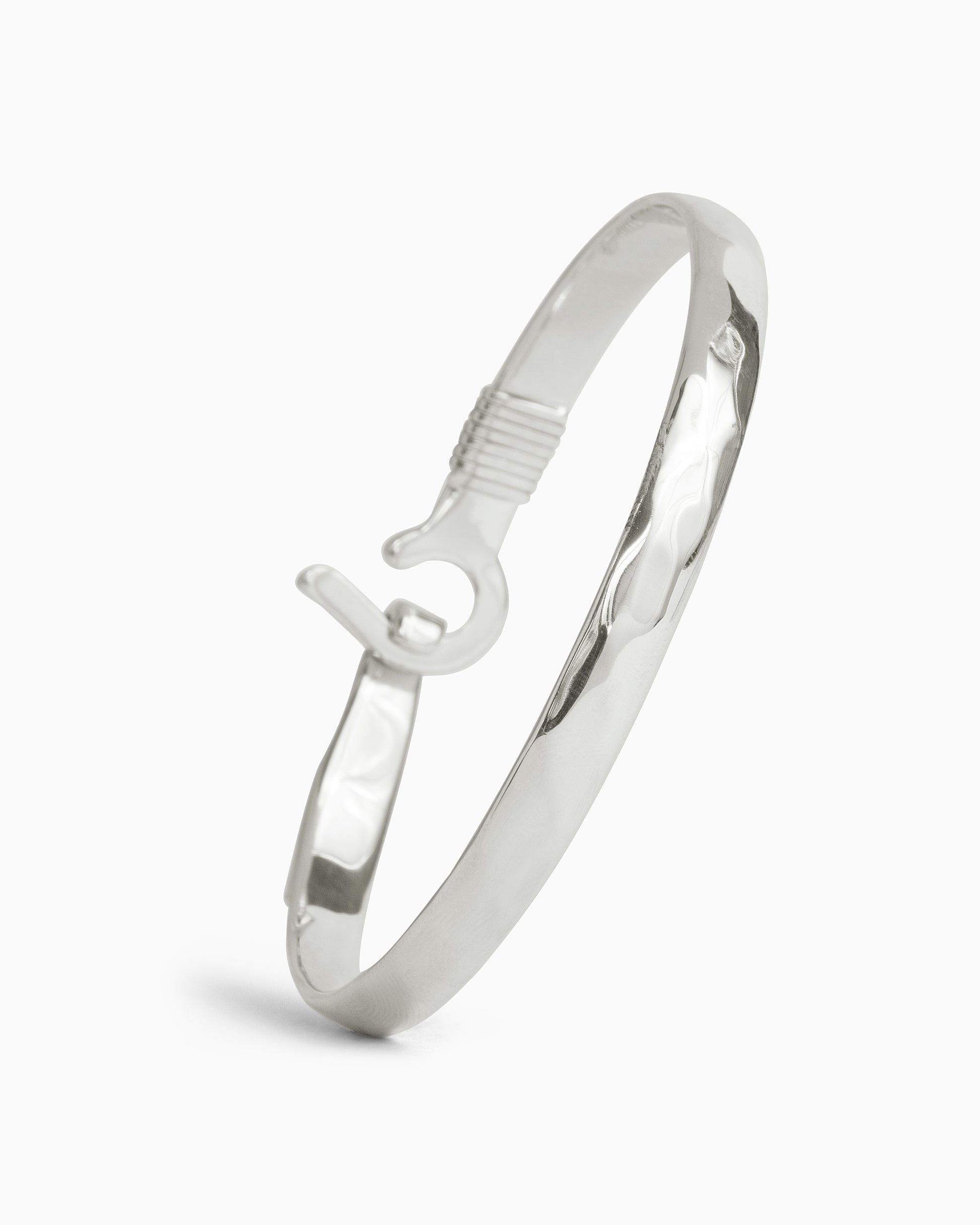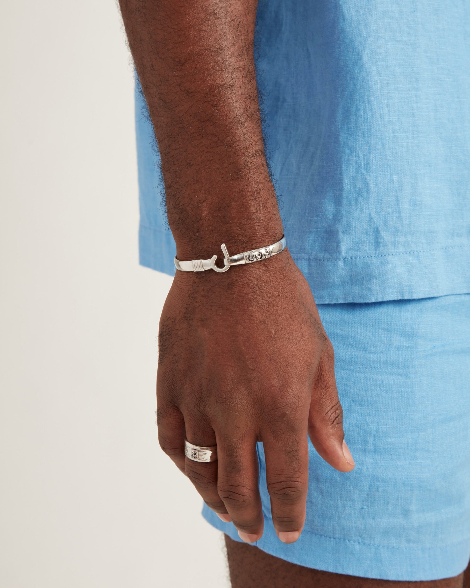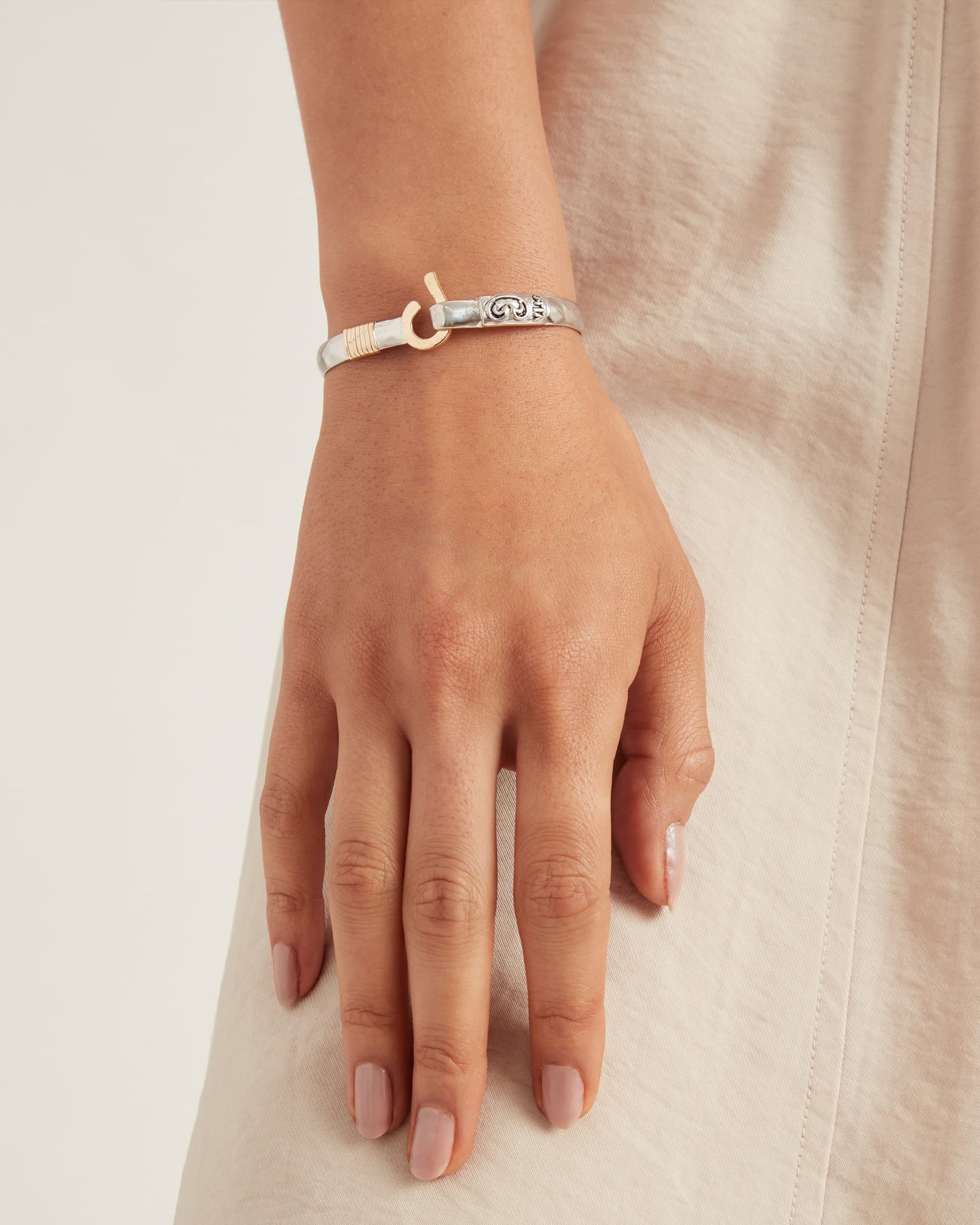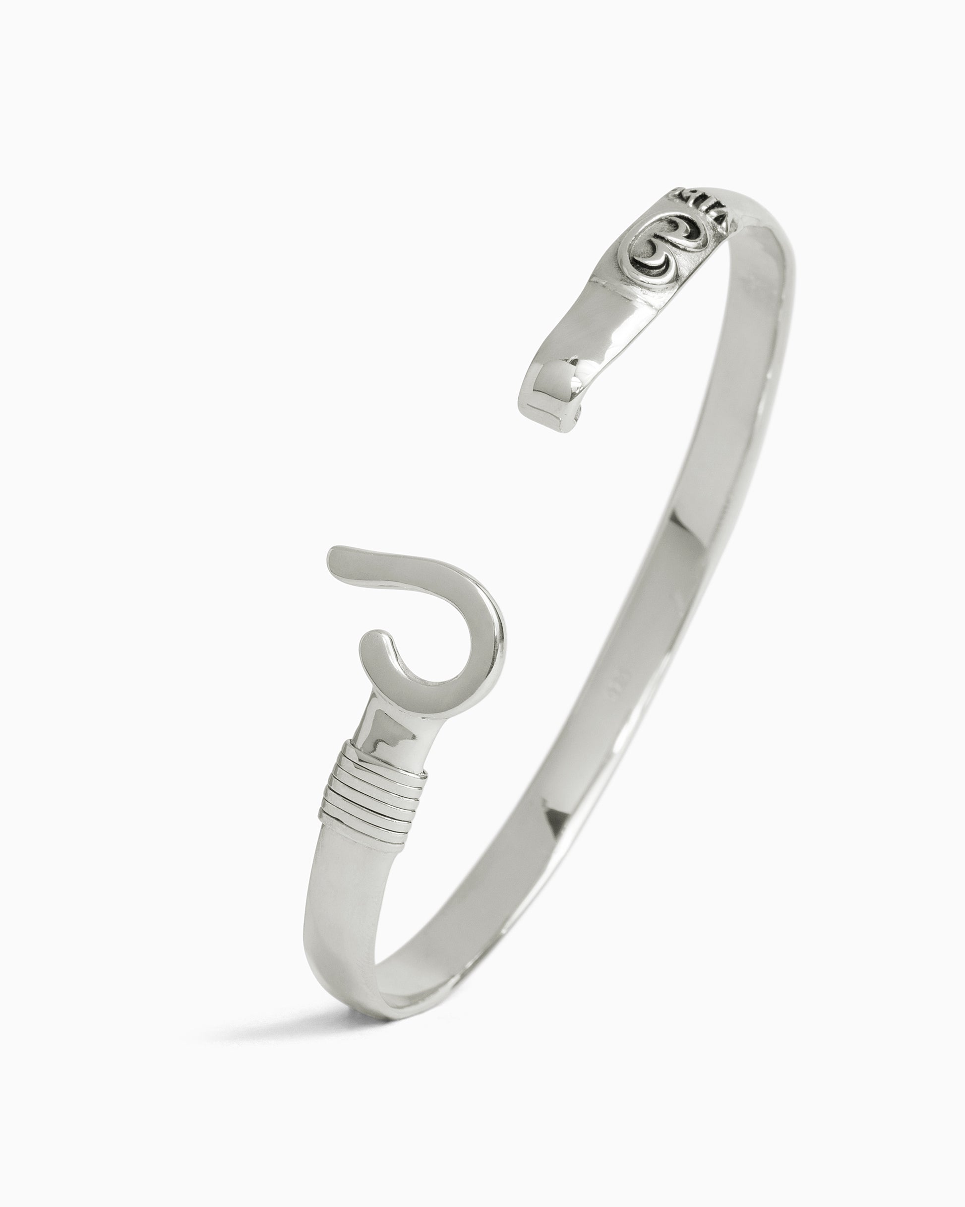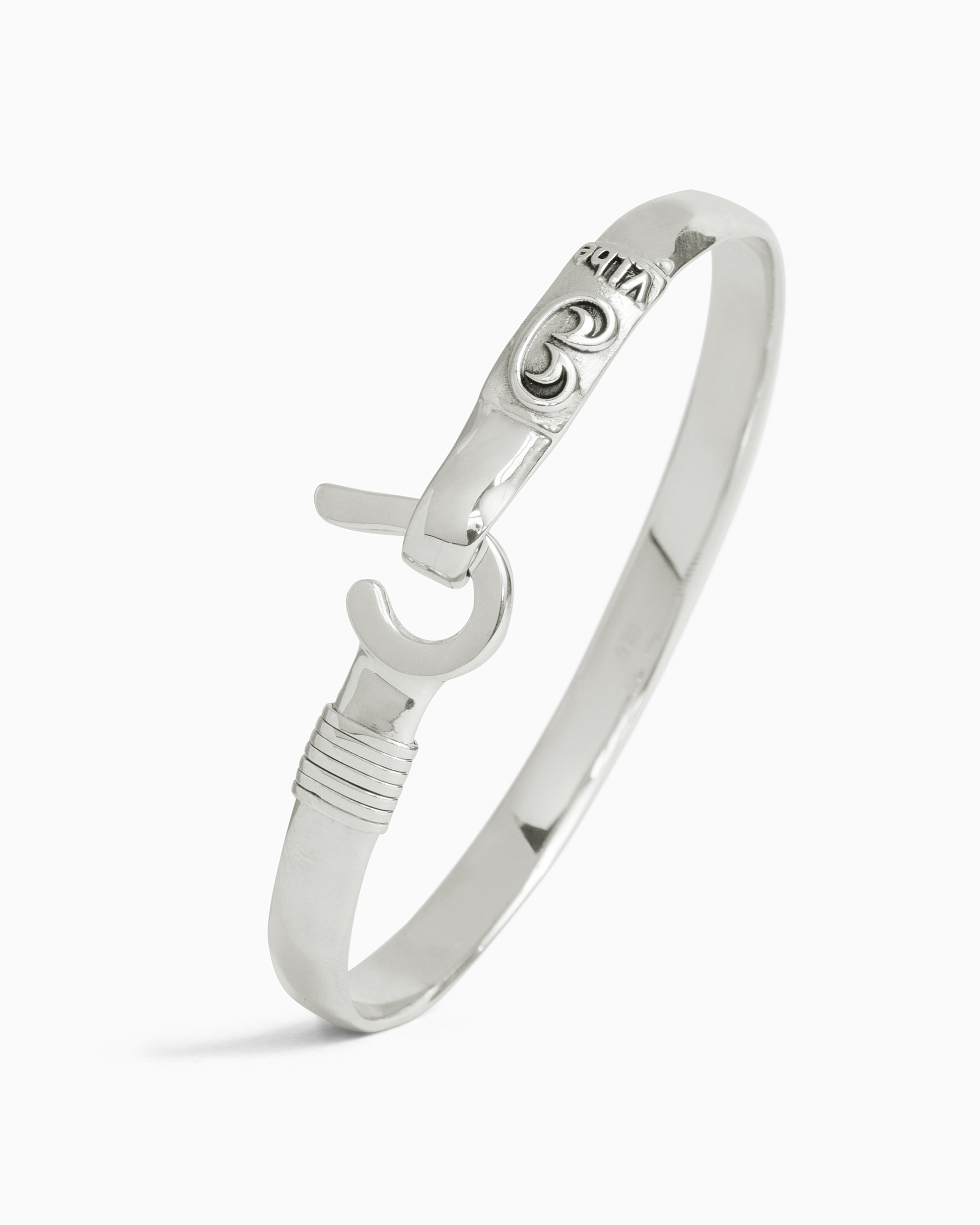 A Vibe signature, the St. John Hook Bracelet is fashioned in gently hammered sterling silver with a "J" hook clasp to honor the island of St. John. Featuring a replica of the St. John petroglyph and seven good luck wraps, solo or stacked, it is sure to be a favorite statement piece. Found in many of our designs, Vibe’s seven good luck wraps represent love, laughter, happiness, good fortune, health, unity, and peace. In the Caribbean tradition, wear your hook facing in to keep love close to your heart, and facing out if you are open to a new love in your life. Wear this piece on its own or stack it with other bracelets for a layered look. For added fun, embellish your new hook bracelet with one or more of Vibe's fun and unique charms!