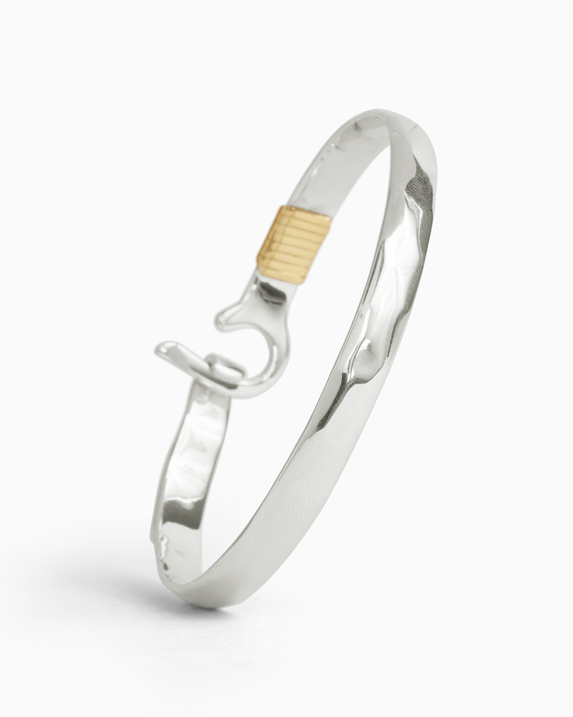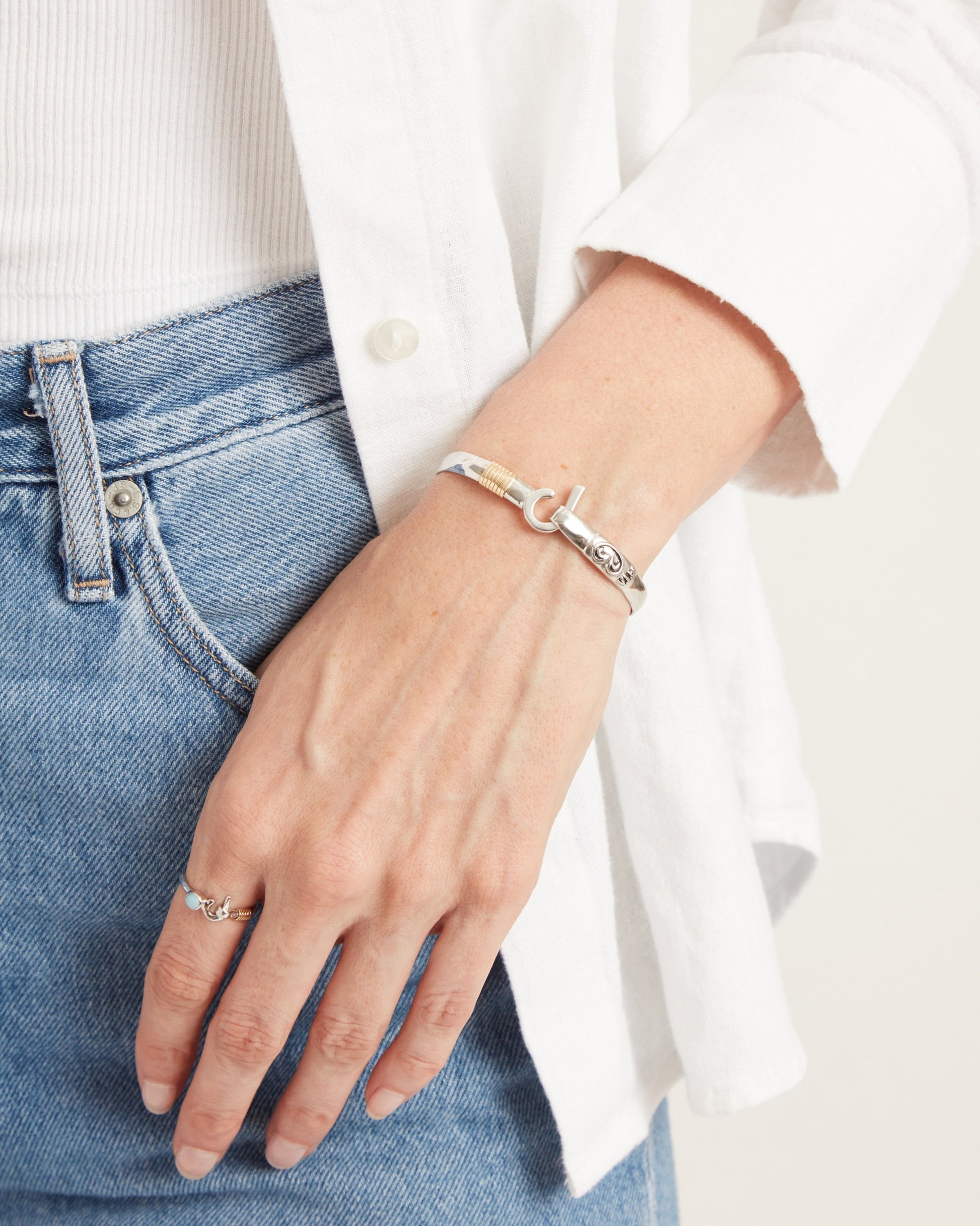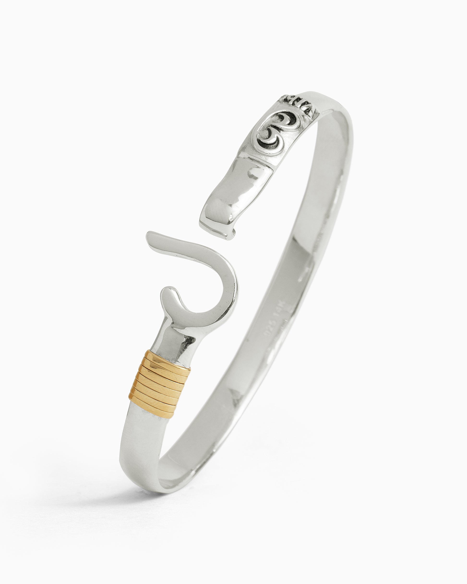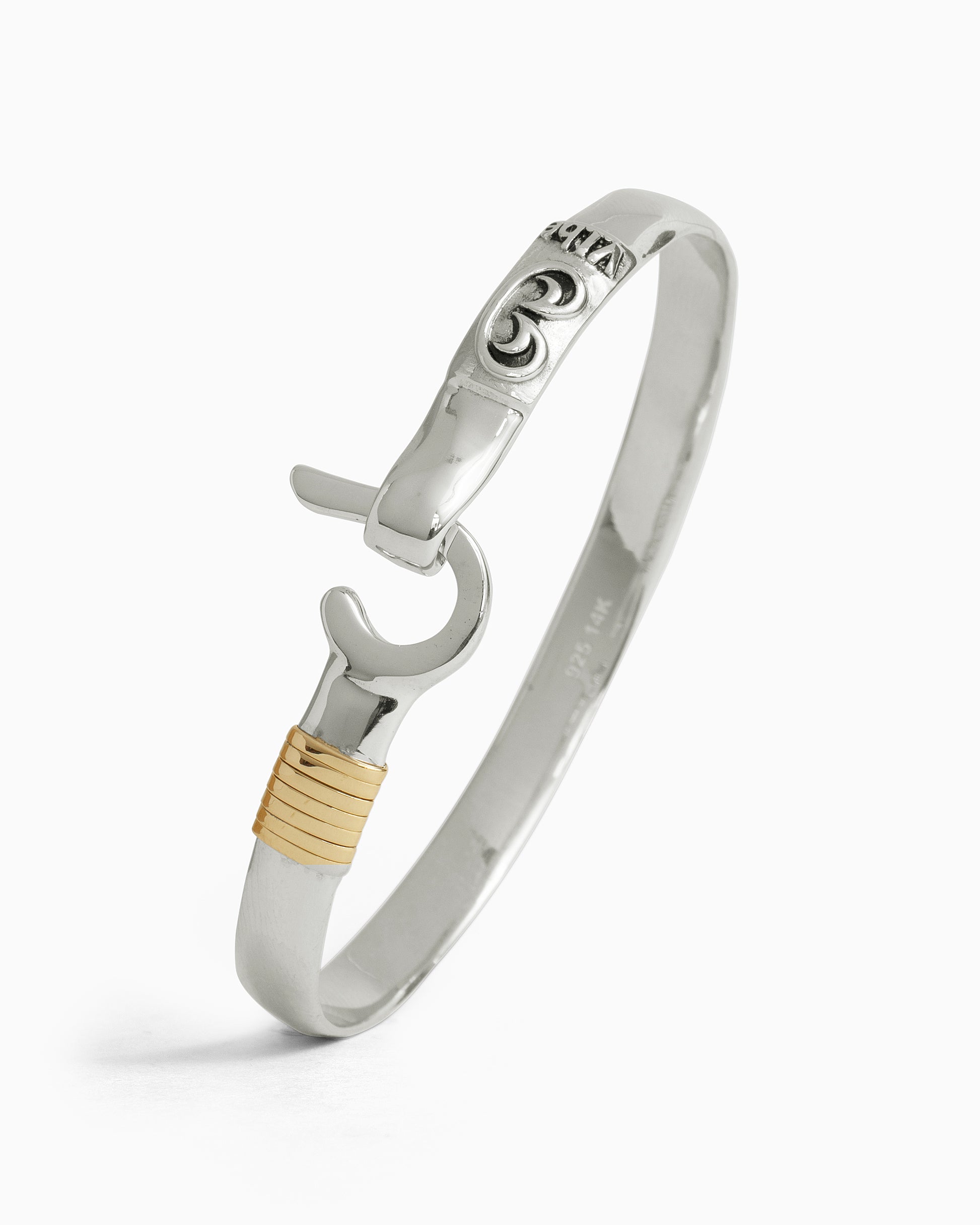 A Vibe signature, the St. John Hook Bracelet is fashioned in gently hammered sterling silver with a "J" hook clasp to honor the island of St. John. Featuring a replica of the St. John petroglyph and seven good luck wraps, solo or stacked, it is sure to be a favorite statement piece. Found in many of our designs, Vibe’s seven good luck wraps represent love, laughter, happiness, good fortune, health, unity, and peace. In the Caribbean tradition, wear your hook facing in to keep love close to your heart, and facing out if you are open to a new love in your life. Wear this piece on its own or stack it with other bracelets for a layered look. For added fun, embellish your new hook bracelet with one or more of Vibe's fun and unique charms!