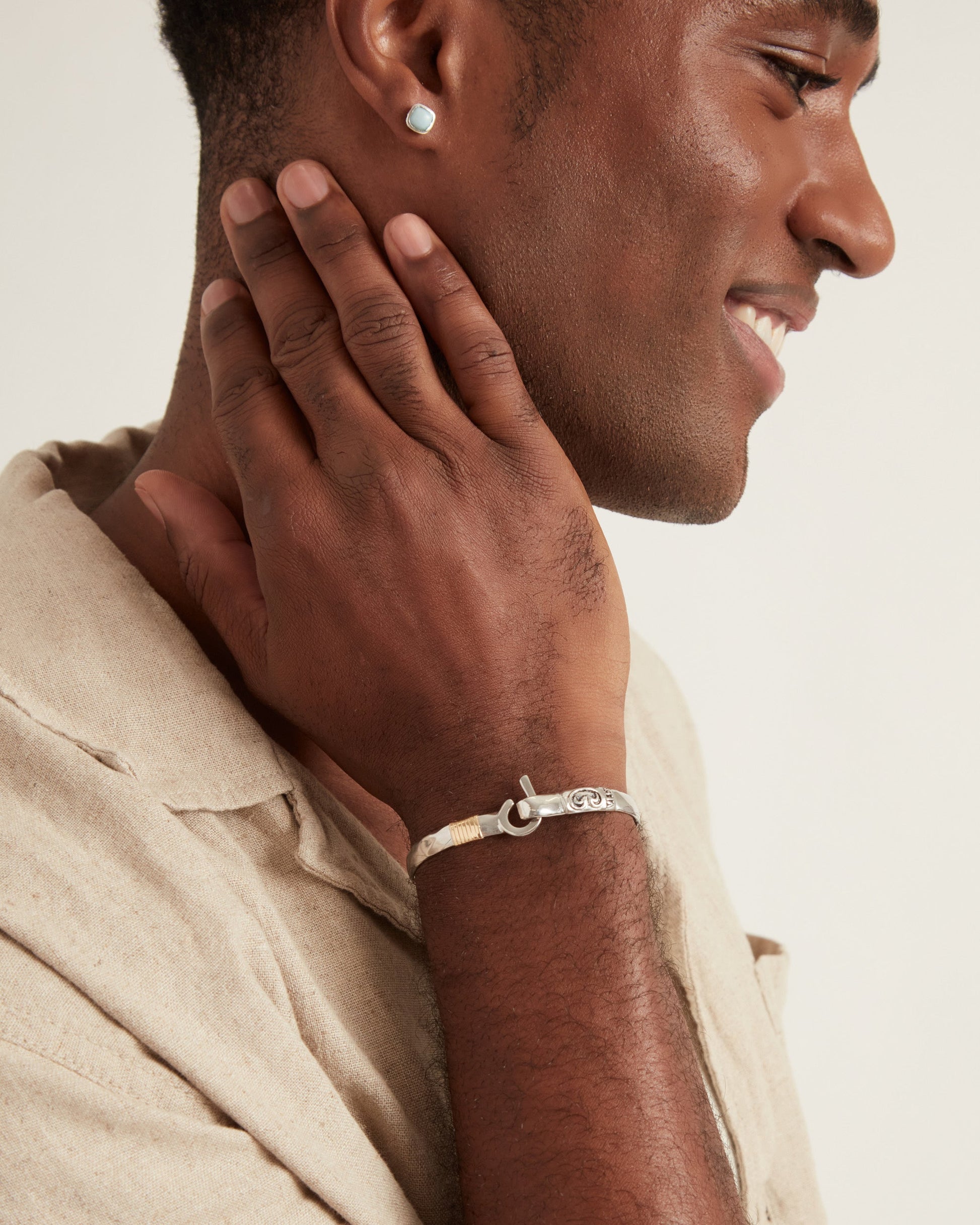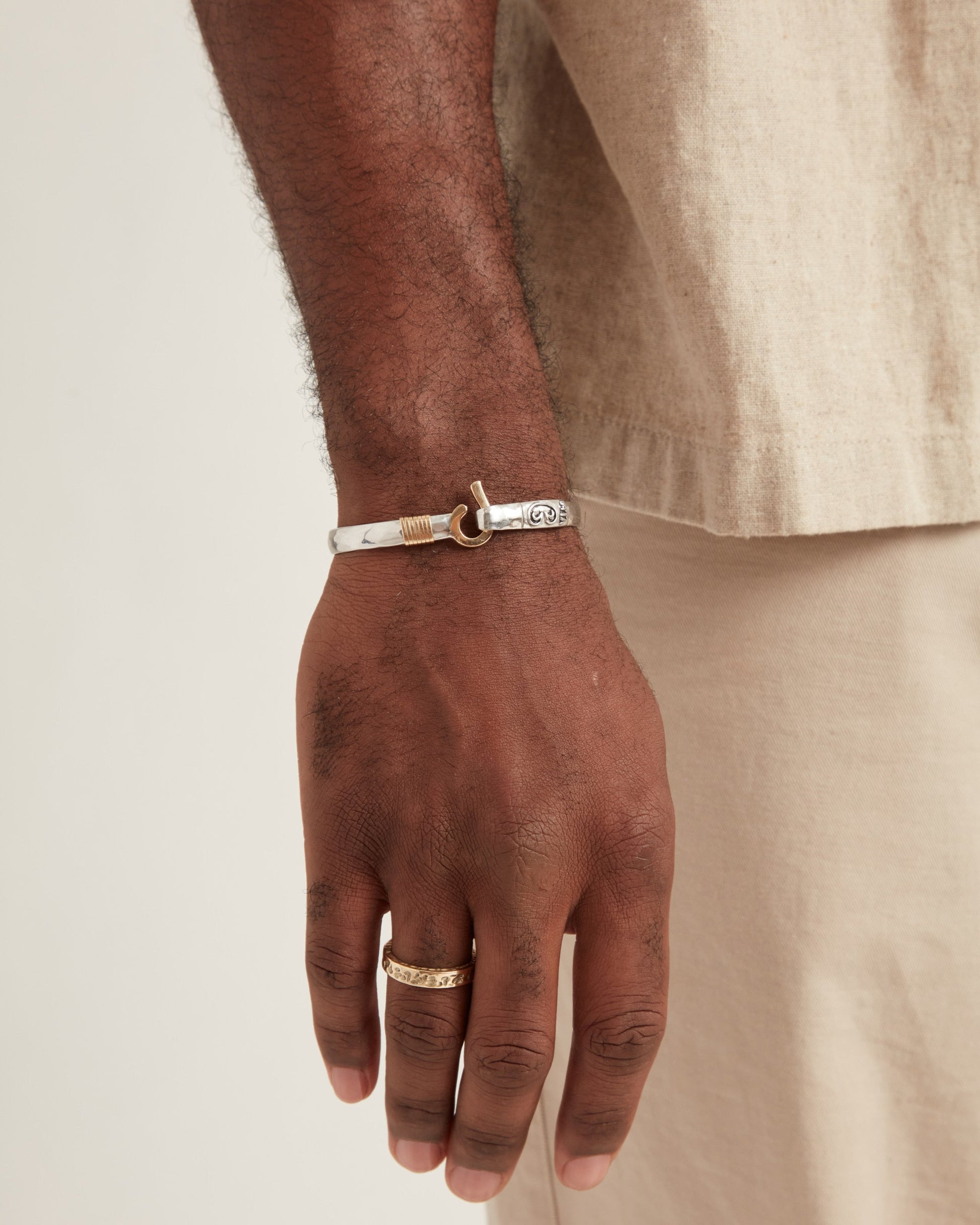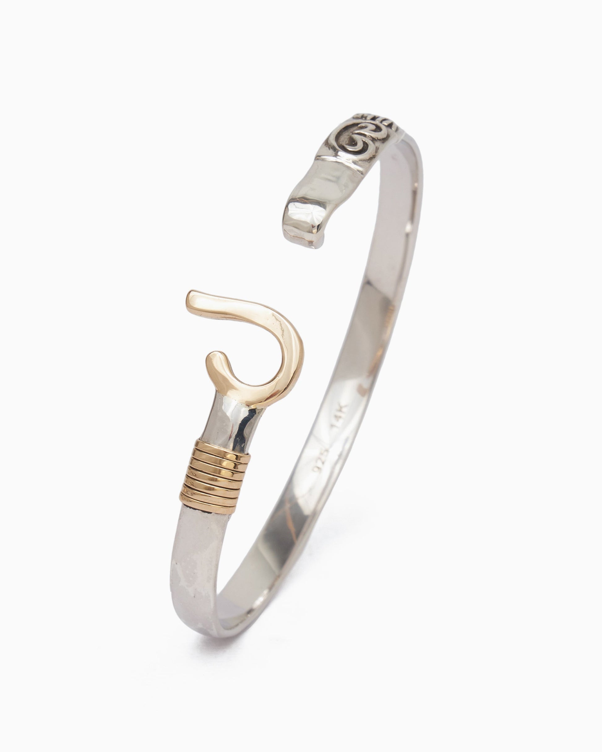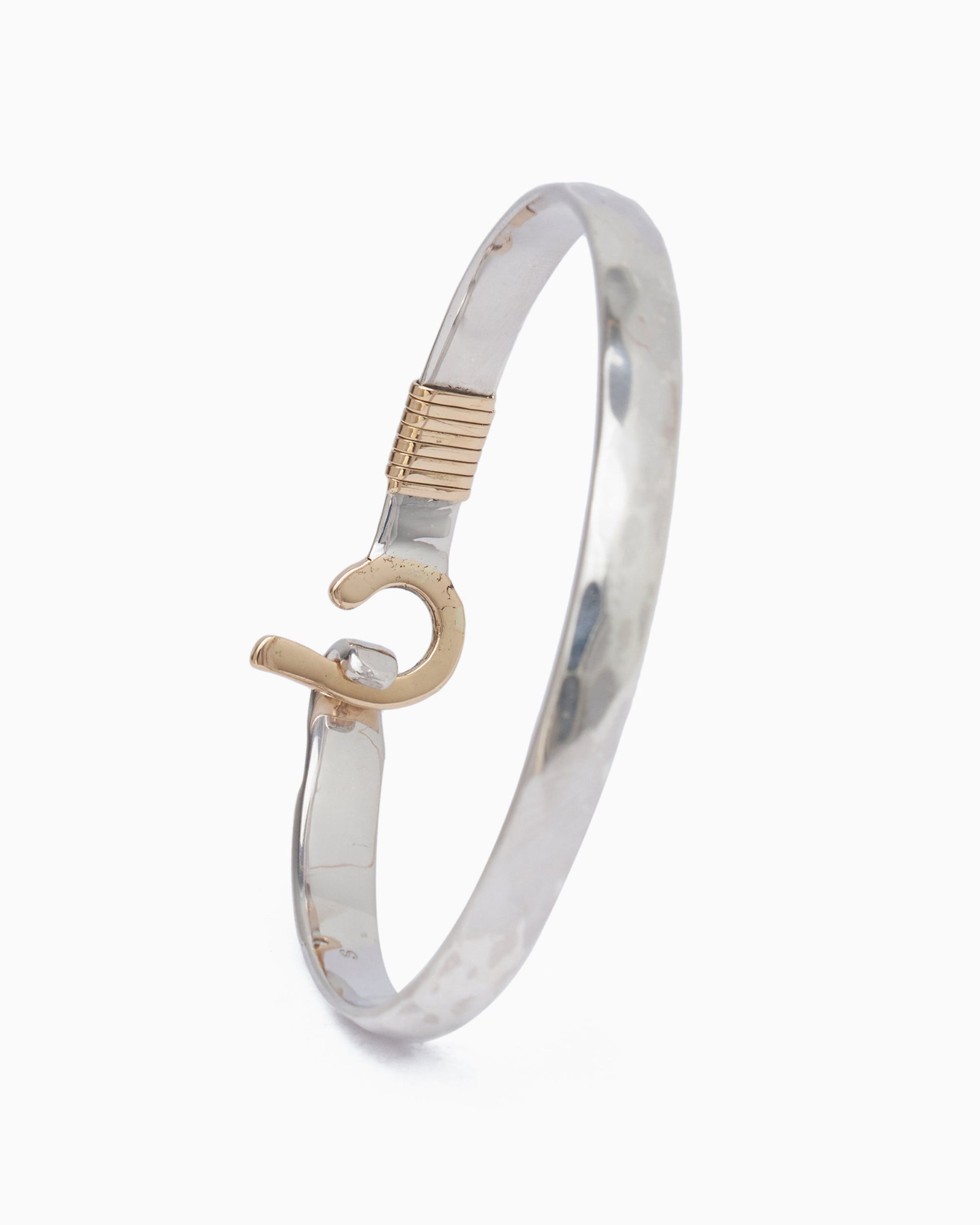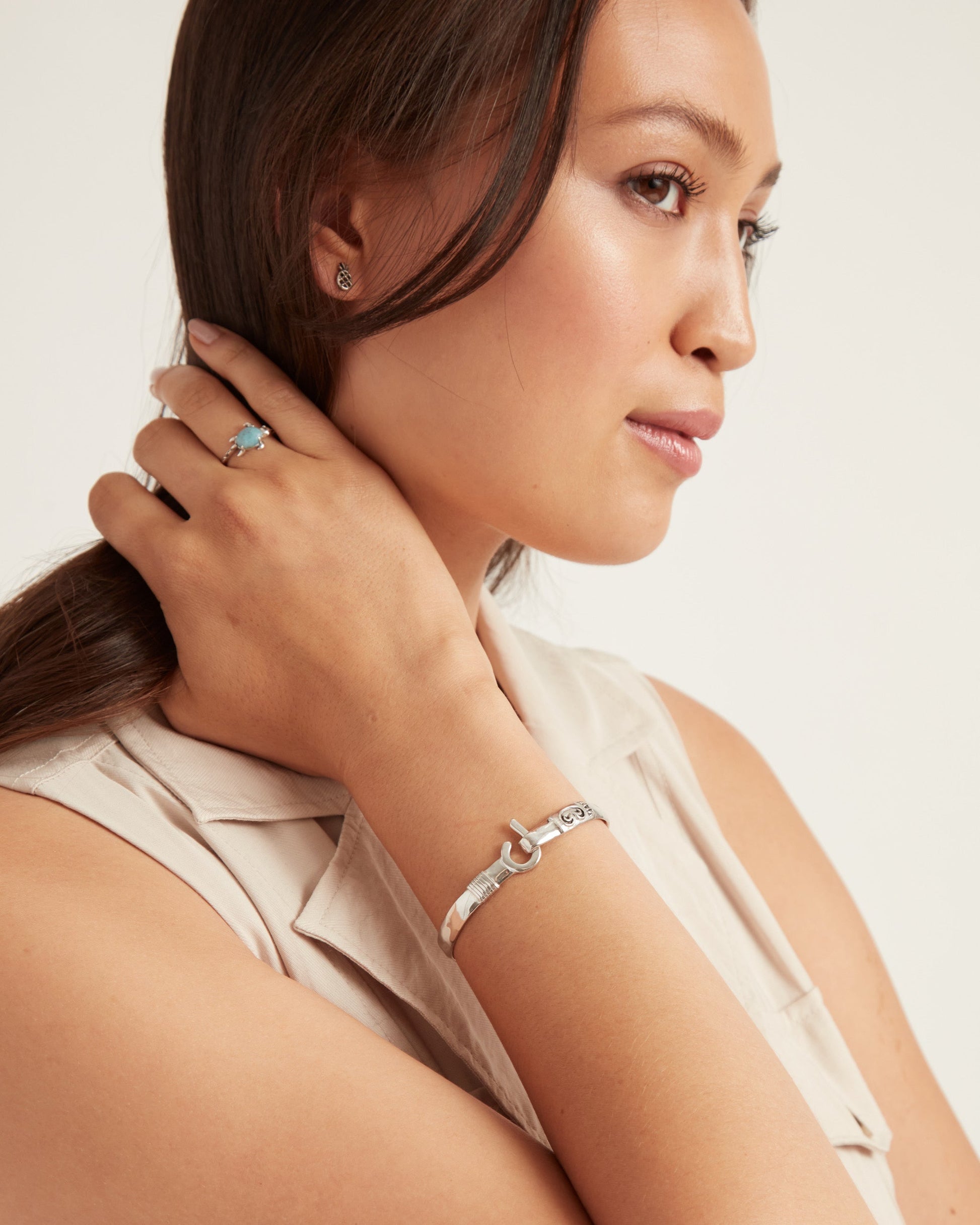 A Vibe signature, the St. John Hook Bracelet is fashioned in gently hammered sterling silver with a "J" hook clasp to honor the island of St. John. Featuring a replica of the St. John petroglyph and seven good luck wraps, solo or stacked, it is sure to be a favorite statement piece. Found in many of our designs, Vibe’s seven good luck wraps represent love, laughter, happiness, good fortune, health, unity, and peace. In the Caribbean tradition, wear your hook facing in to keep love close to your heart, and facing out if you are open to a new love in your life. Wear this piece on its own or stack it with other bracelets for a layered look. For added fun, embellish your new hook bracelet with one or more of Vibe's fun and unique charms!
