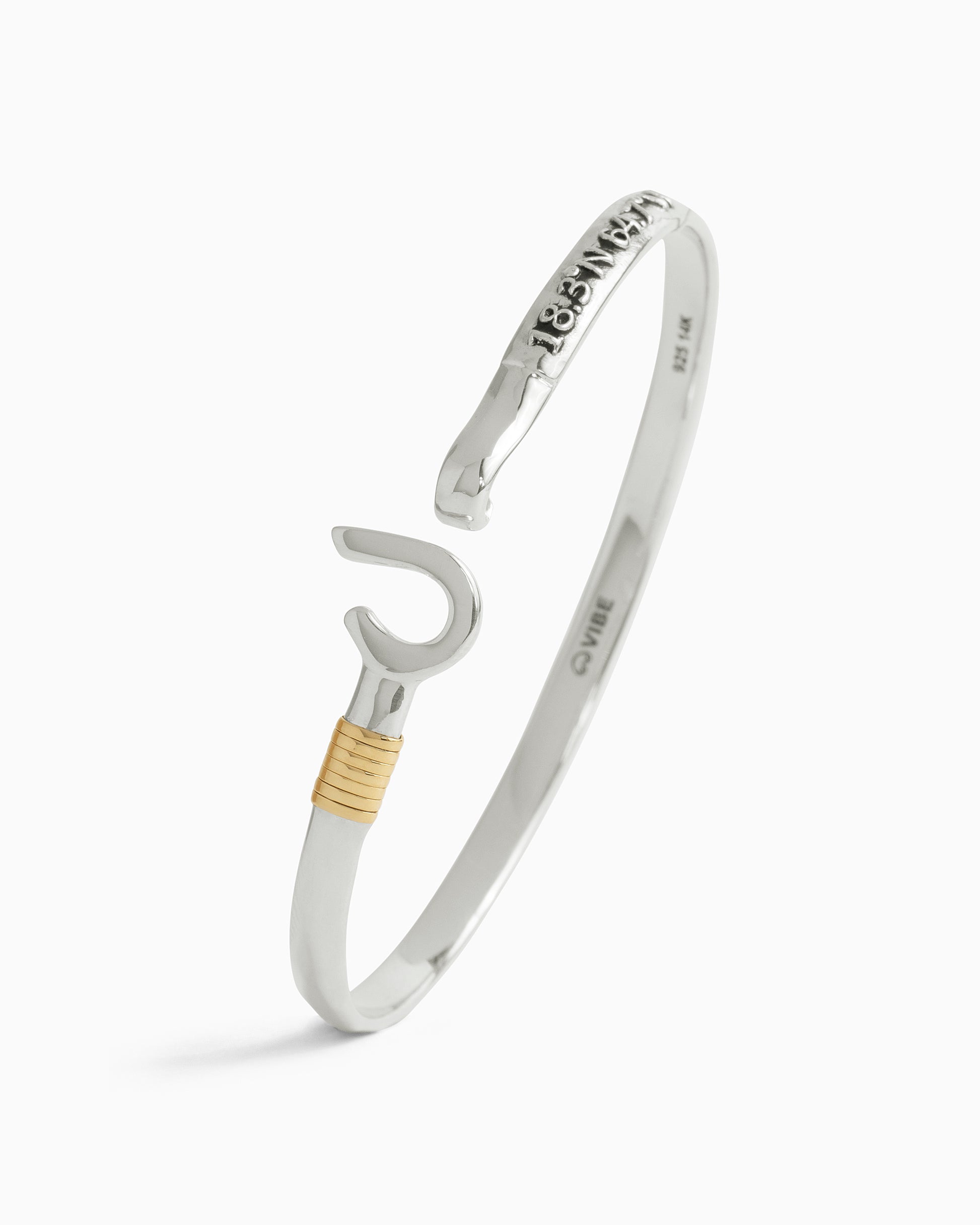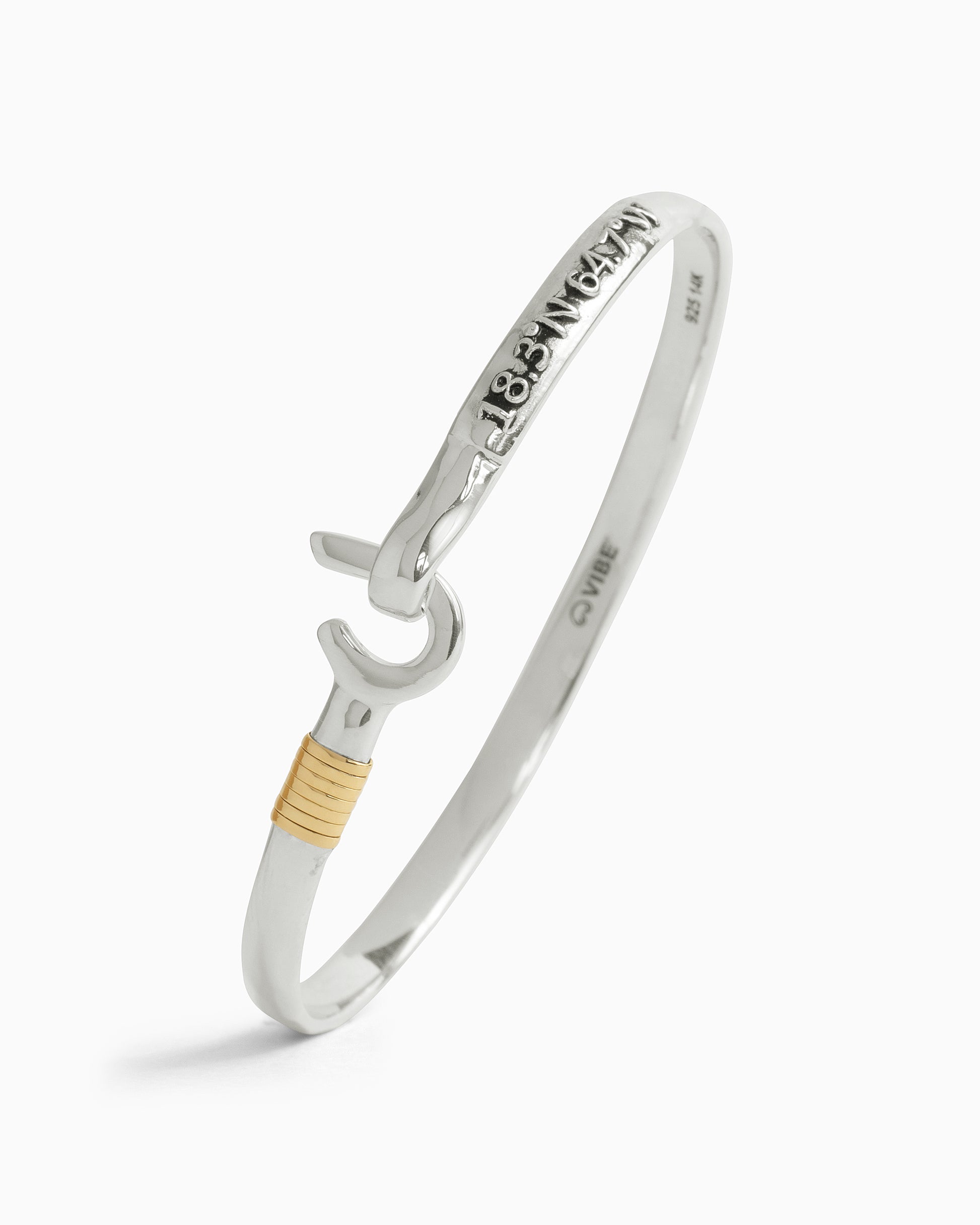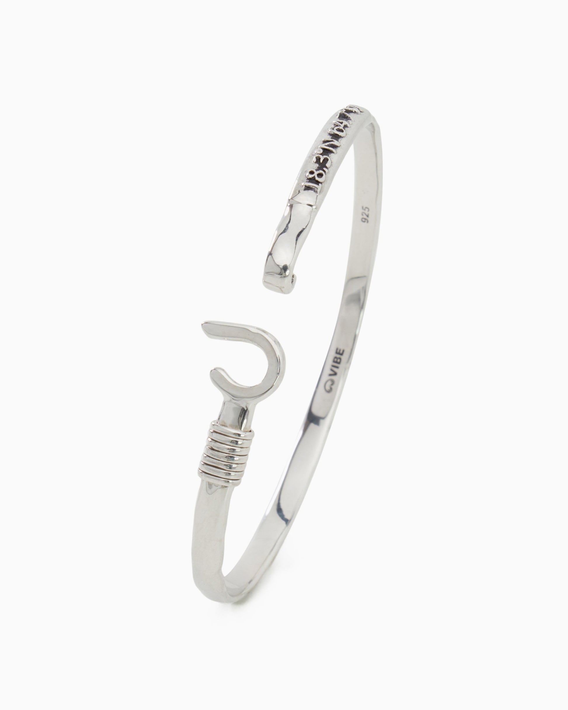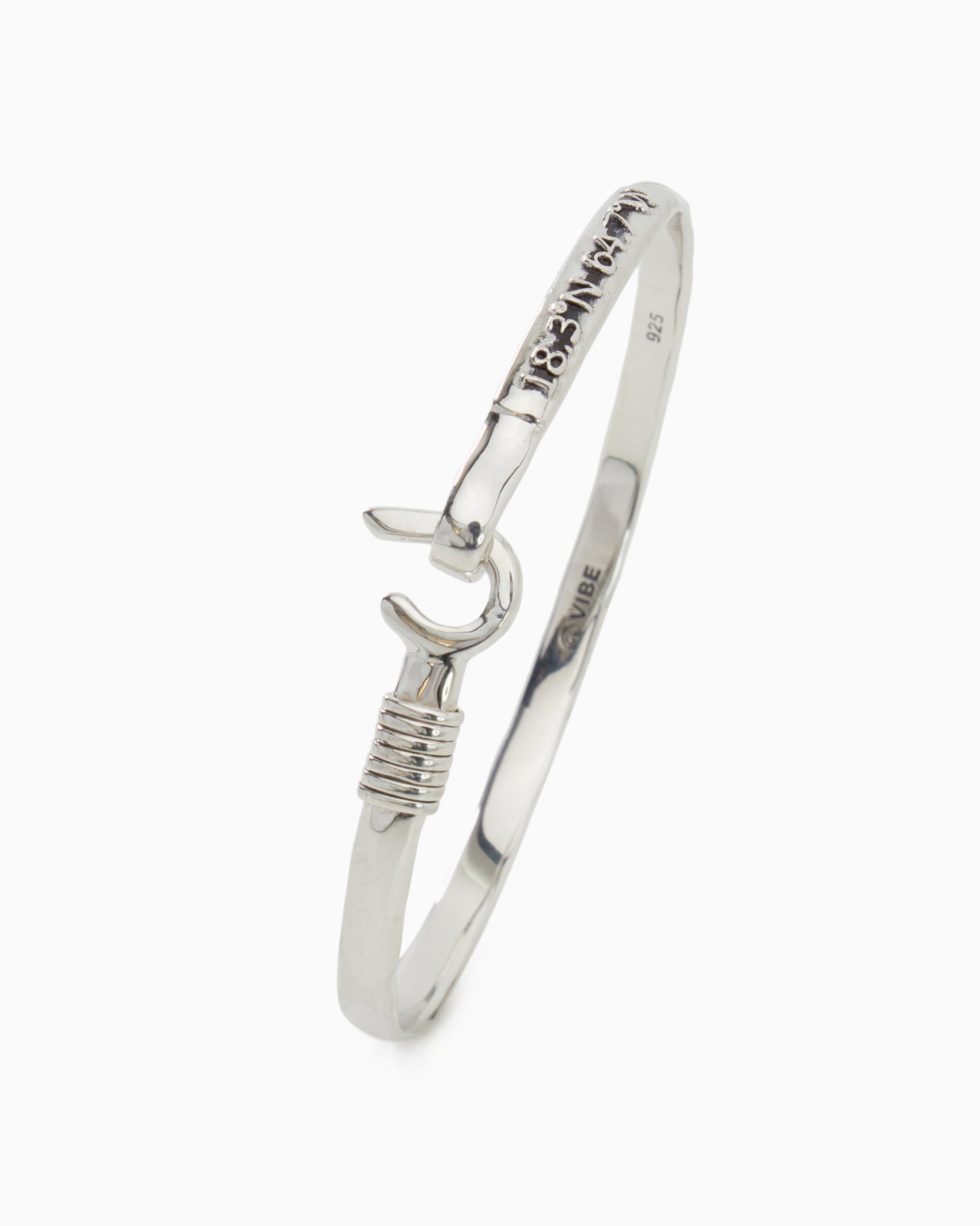 A Vibe signature, the St. John Hook Bracelet is fashioned in gently hammered sterling silver with a "J" hook clasp to honor the island of St. John. Featuring the St. John coordinates and seven good luck wraps, solo or stacked, it is sure to be a favorite statement piece. Found in many of our designs, Vibe’s seven good luck wraps represent love, laughter, happiness, good fortune, health, unity, and peace. In the Caribbean tradition, wear your hook facing in to keep love close to your heart, and facing out if you are open to a new love in your life. Wear this piece on its own or stack it with other bracelets for a layered look. For added fun, embellish your new hook bracelet with one or more of Vibe's fun and unique charms!