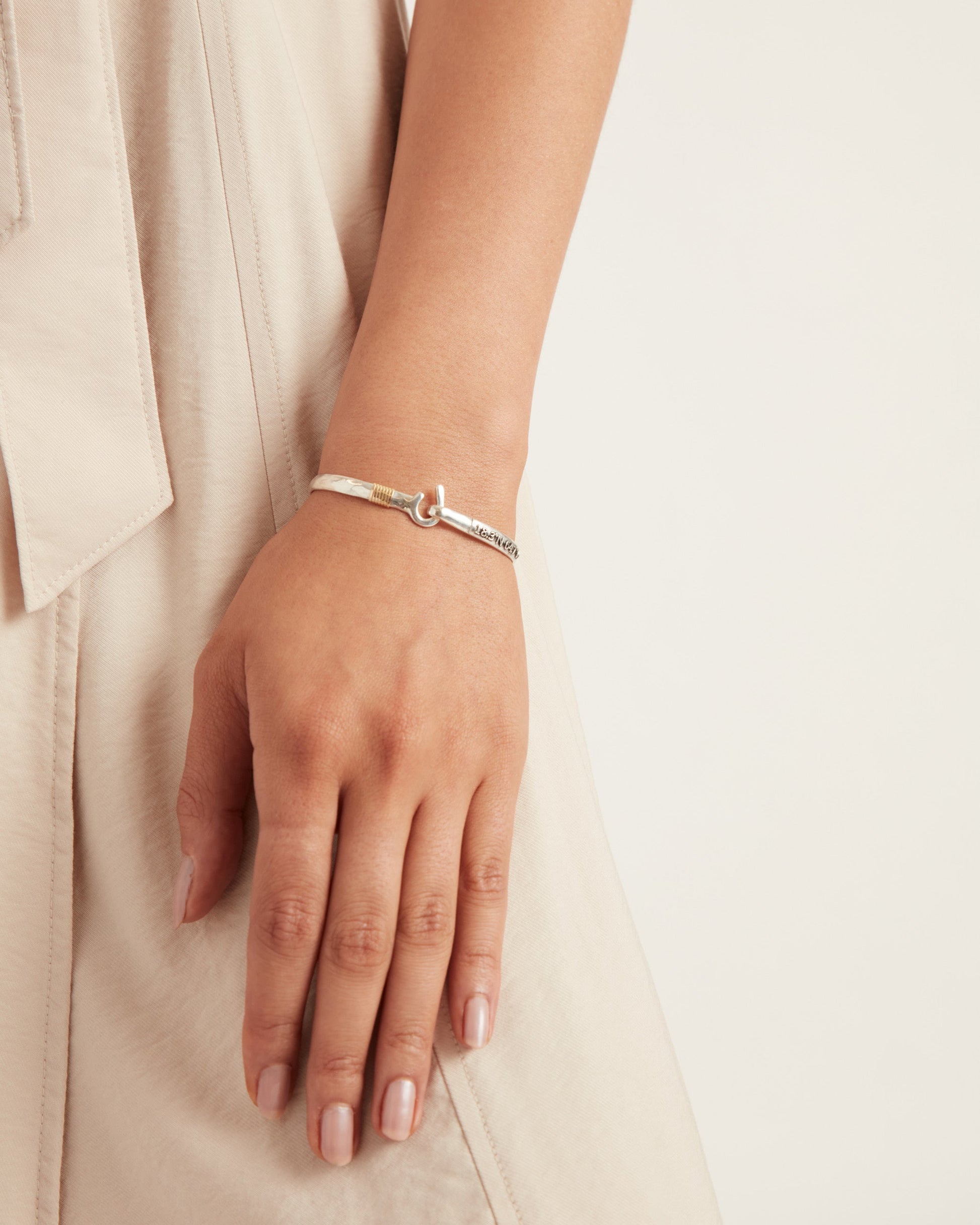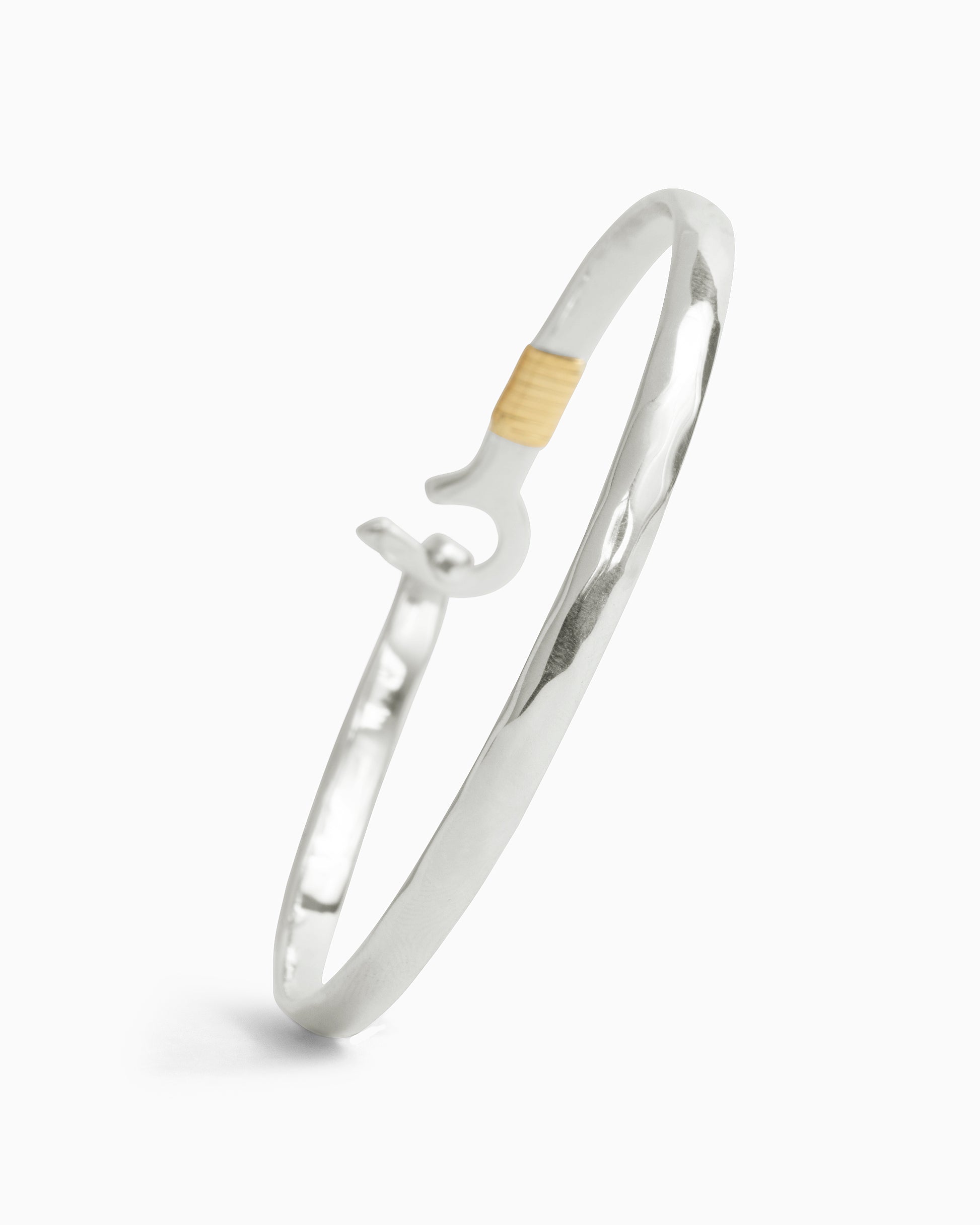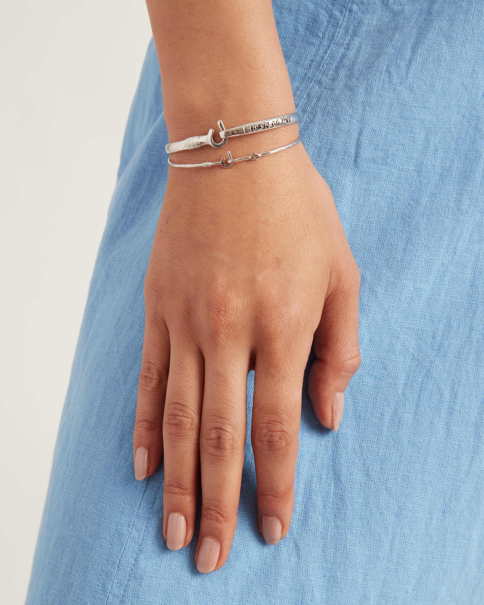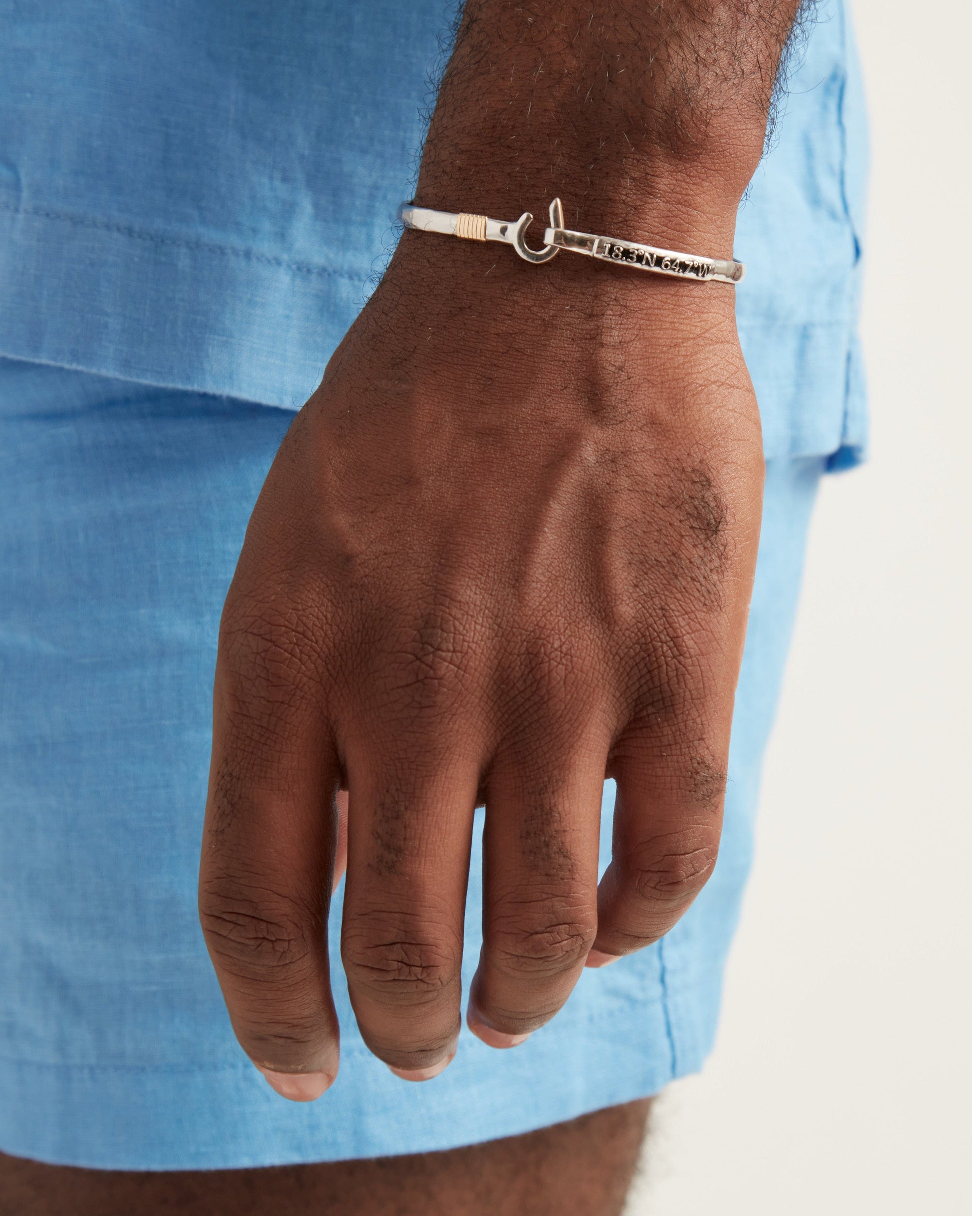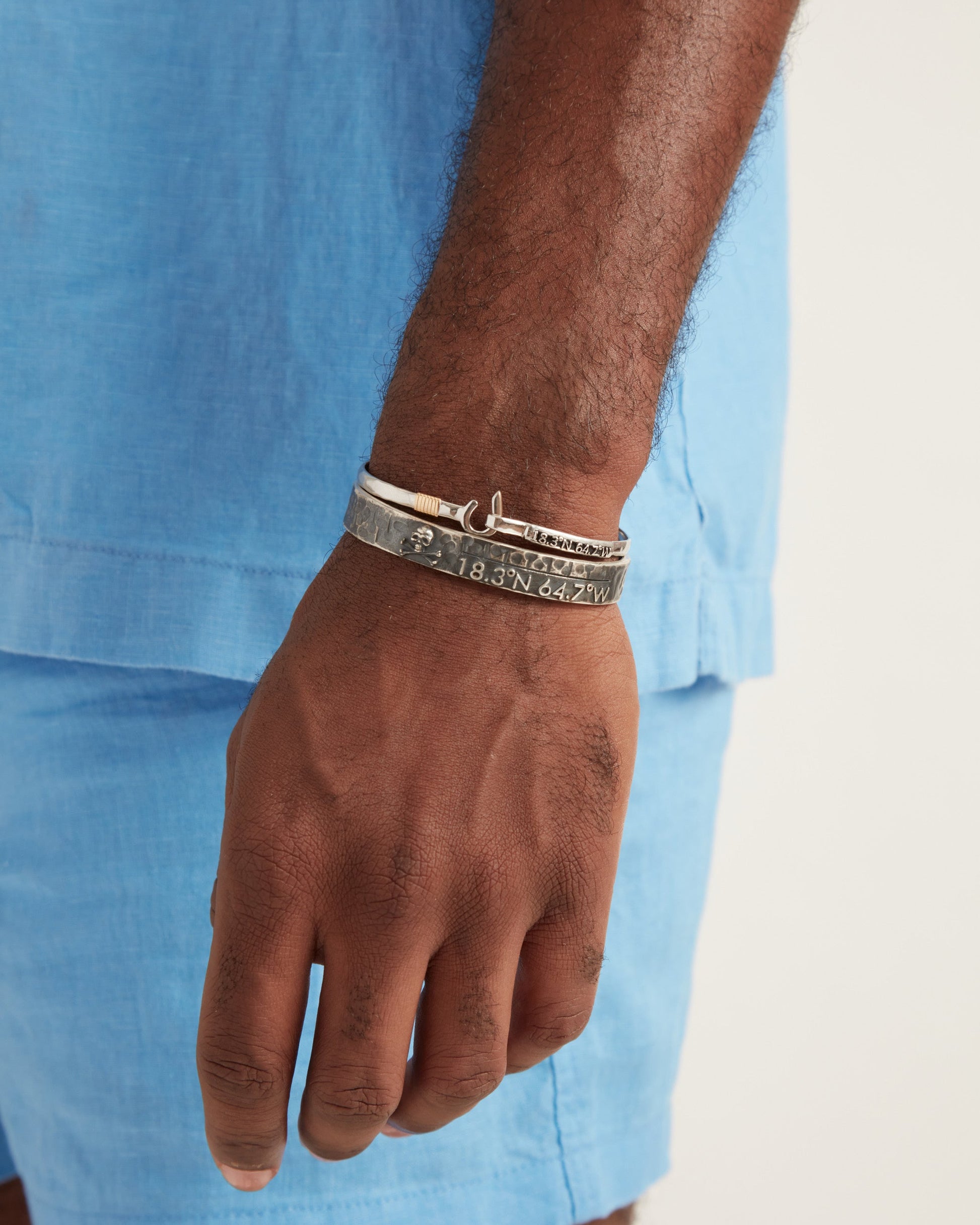 A Vibe signature, the St. John Hook Bracelet is fashioned in gently hammered sterling silver with a "J" hook clasp to honor the island of St. John. Featuring the St. John coordinates and seven good luck wraps, solo or stacked, it is sure to be a favorite statement piece. Found in many of our designs, Vibe’s seven good luck wraps represent love, laughter, happiness, good fortune, health, unity, and peace. In the Caribbean tradition, wear your hook facing in to keep love close to your heart, and facing out if you are open to a new love in your life. Wear this piece on its own or stack it with other bracelets for a layered look. For added fun, embellish your new hook bracelet with one or more of Vibe's fun and unique charms!