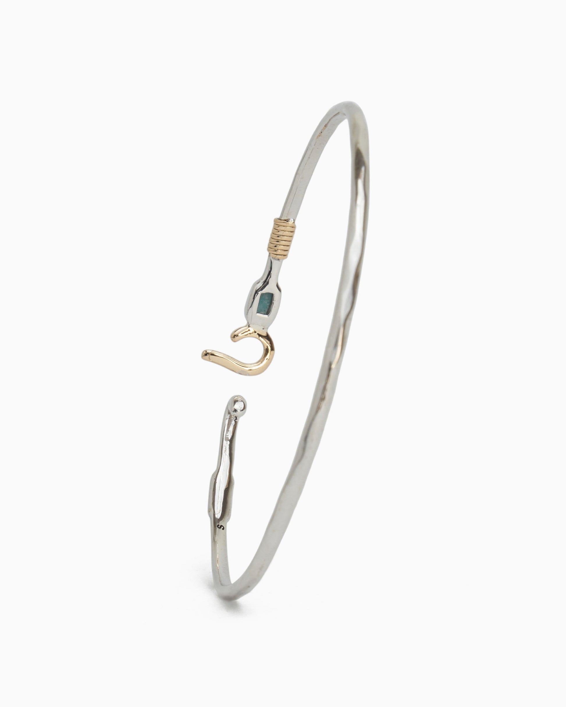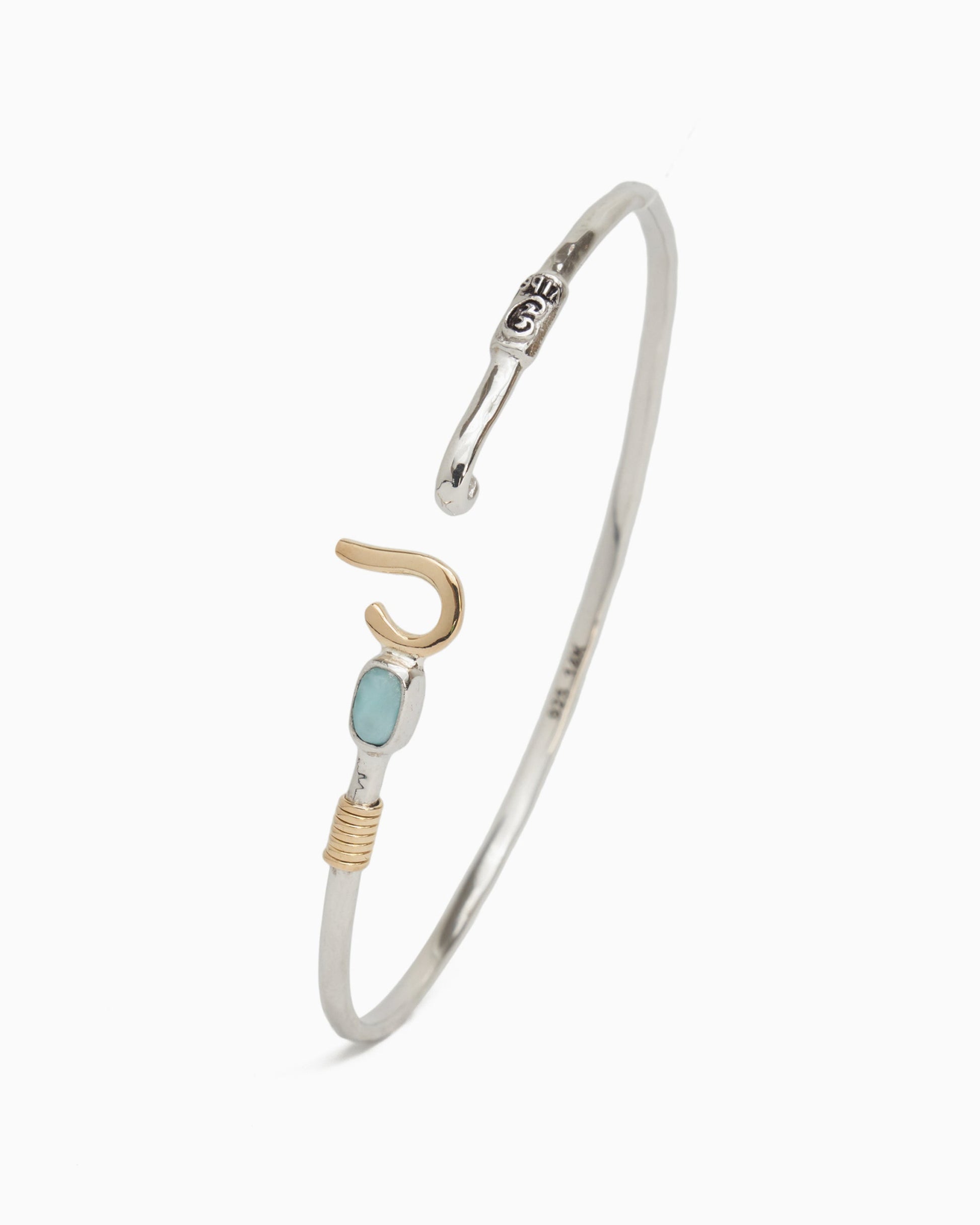 A Vibe signature, the St. John Hook Bracelet with Stone is fashioned in gently hammered sterling silver with a larimar cabochon and 14K gold "J" hook clasp. Featuring a replica of the St. John petroglyph and seven 14K gold good luck wraps, solo or stacked, it is sure to be a favorite piece. Found in many of our designs, Vibe’s seven good luck wraps represent love, laughter, happiness, good fortune, health, unity, and peace. In the Caribbean tradition, wear your hook facing in to keep love close to your heart, and facing out if you are open to a new love in your life. Wear this piece on its own or stack it with other bracelets for a layered look.