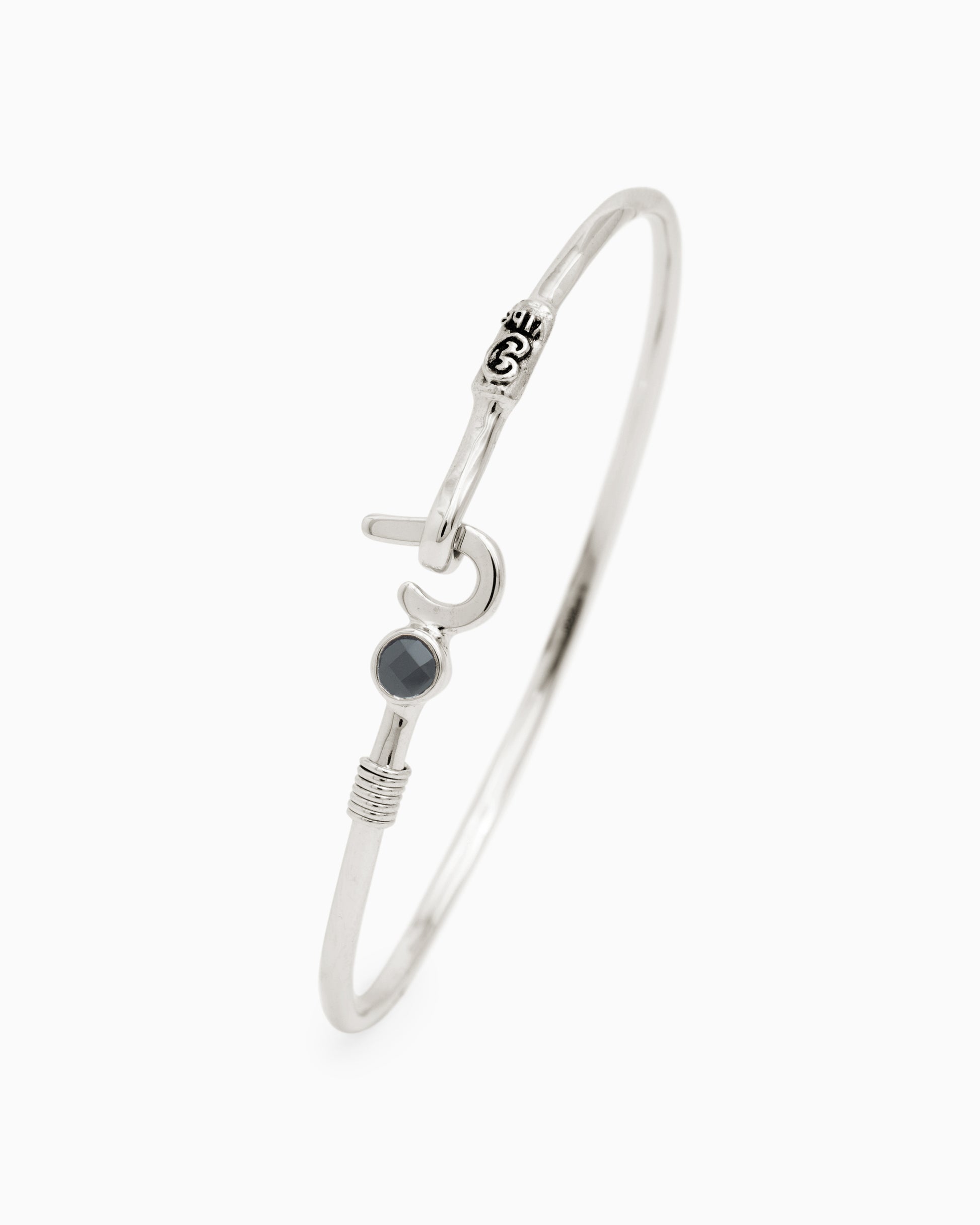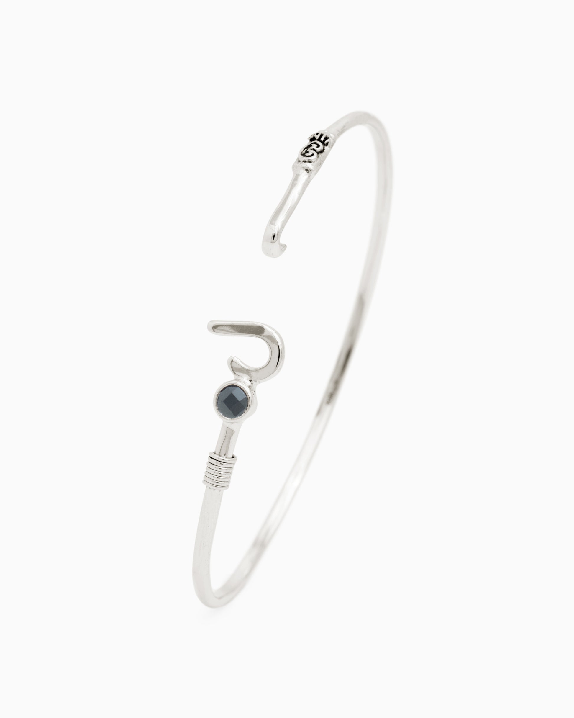 A Vibe signature, the St. John Hook Bracelet with Stone is fashioned in gently hammered sterling silver with a faceted black onyx stone and "J" hook clasp. Featuring a replica of the St. John petroglyph and seven good luck wraps, solo or stacked, it is sure to be a favorite piece. Found in many of our designs, Vibe’s seven good luck wraps represent love, laughter, happiness, good fortune, health, unity, and peace. In the Caribbean tradition, wear your hook facing in to keep love close to your heart, and facing out if you are open to a new love in your life. Wear this piece on its own or stack it with other bracelets for a layered look.