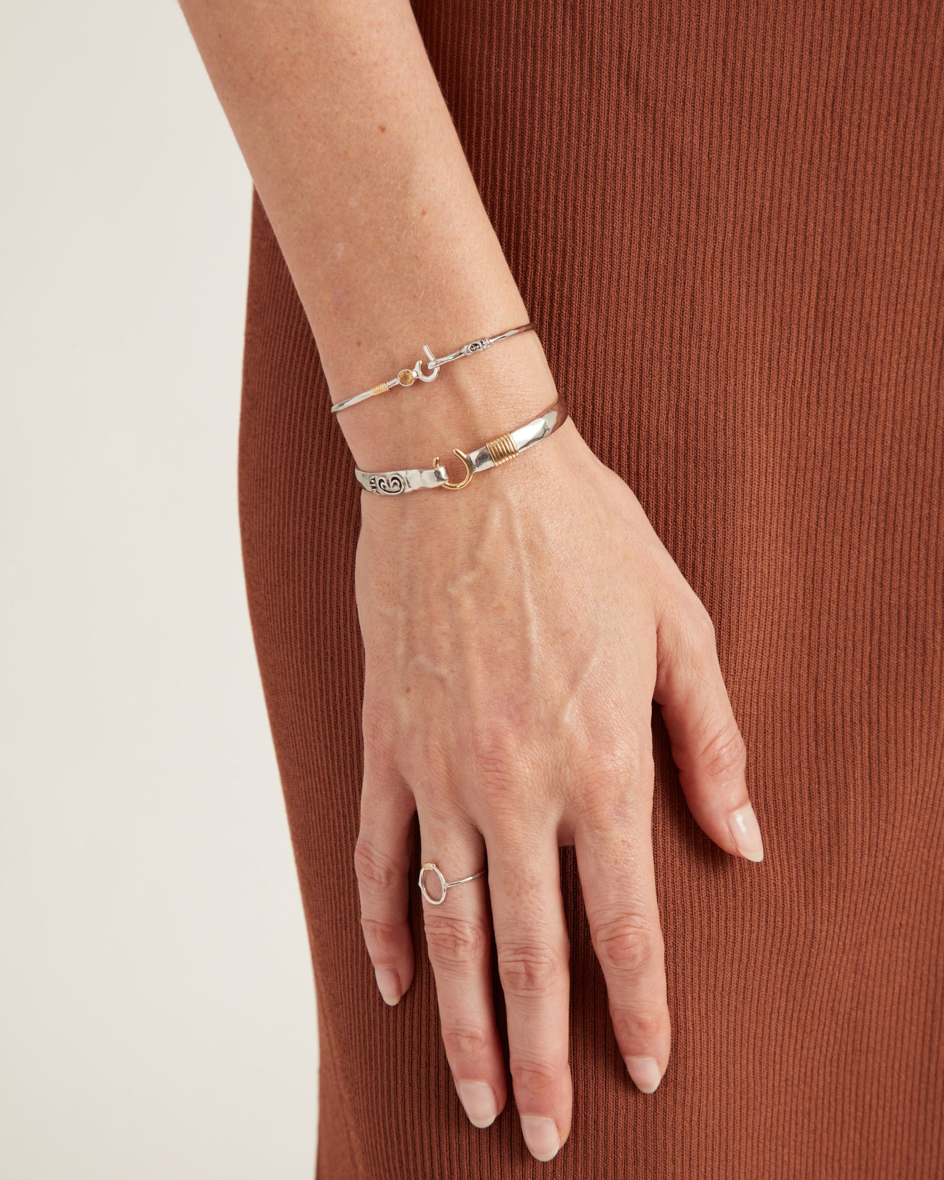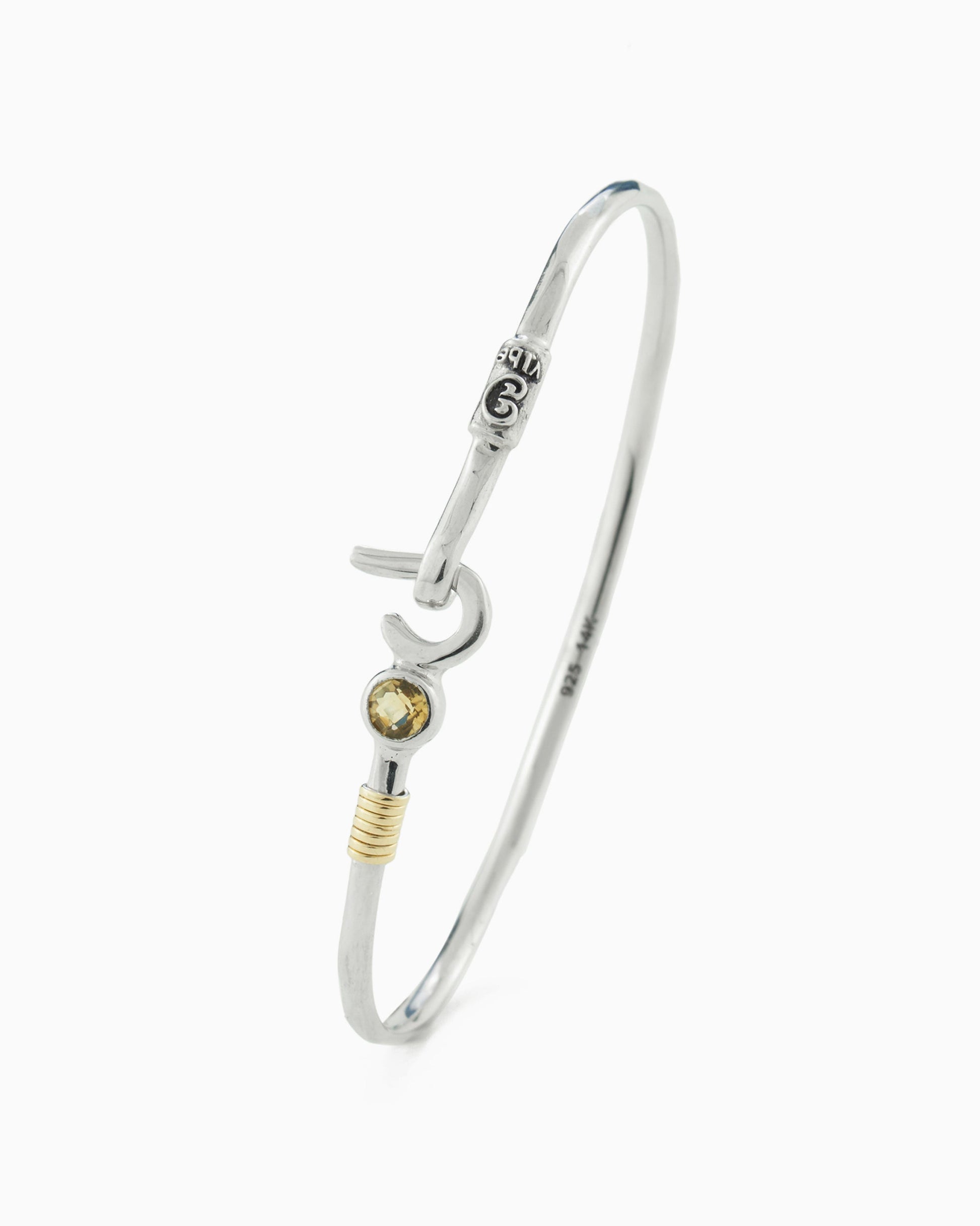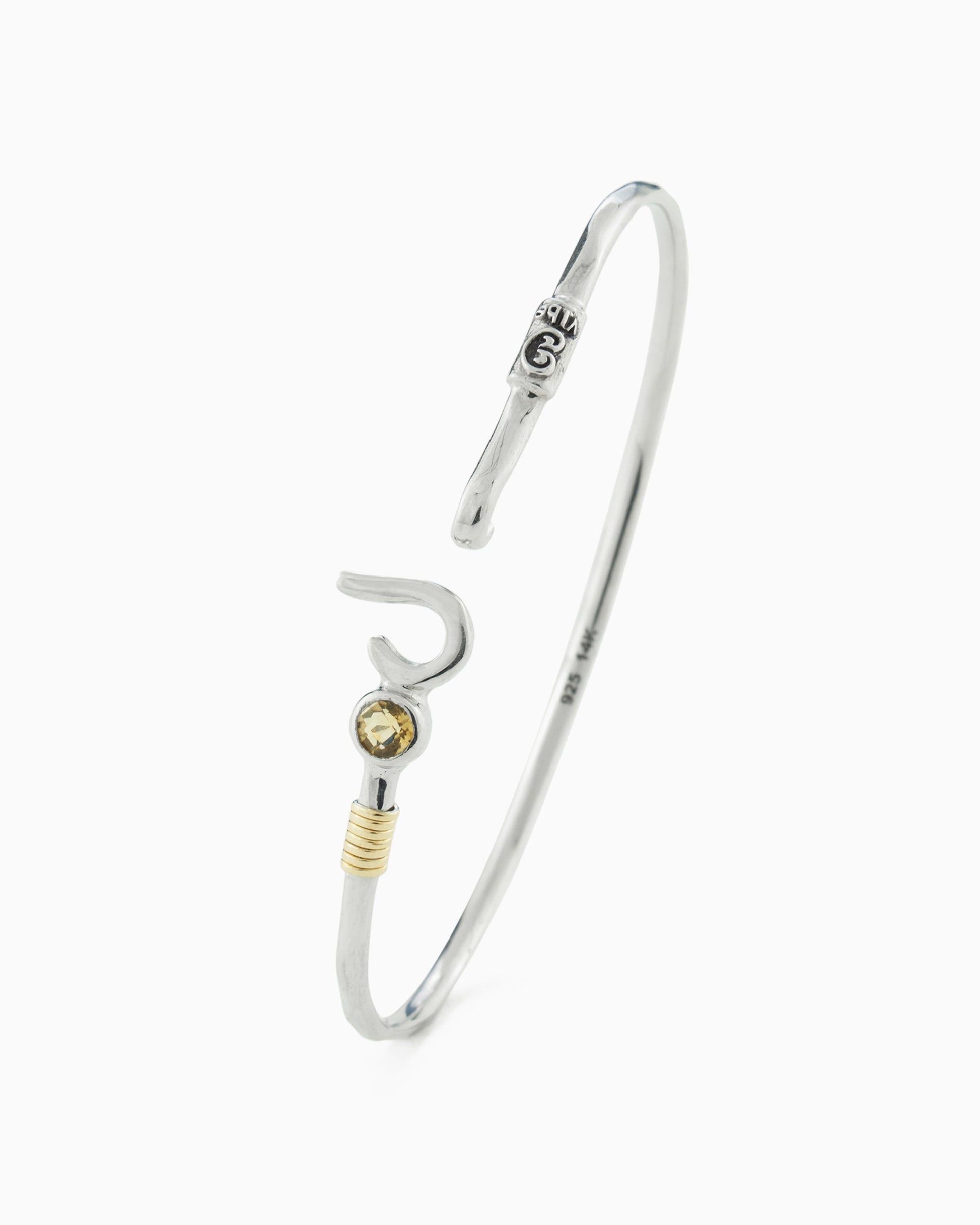 A Vibe signature, the St. John Hook Bracelet with Stone is fashioned in gently hammered sterling silver with a faceted citrine stone and "J" hook clasp. Featuring a replica of the St. John petroglyph and seven 14K gold good luck wraps, solo or stacked, it is sure to be a favorite piece. Found in many of our designs, Vibe’s seven good luck wraps represent love, laughter, happiness, good fortune, health, unity, and peace. In the Caribbean tradition, wear your hook facing in to keep love close to your heart, and facing out if you are open to a new love in your life. Wear this piece on its own or stack it with other bracelets for a layered look.