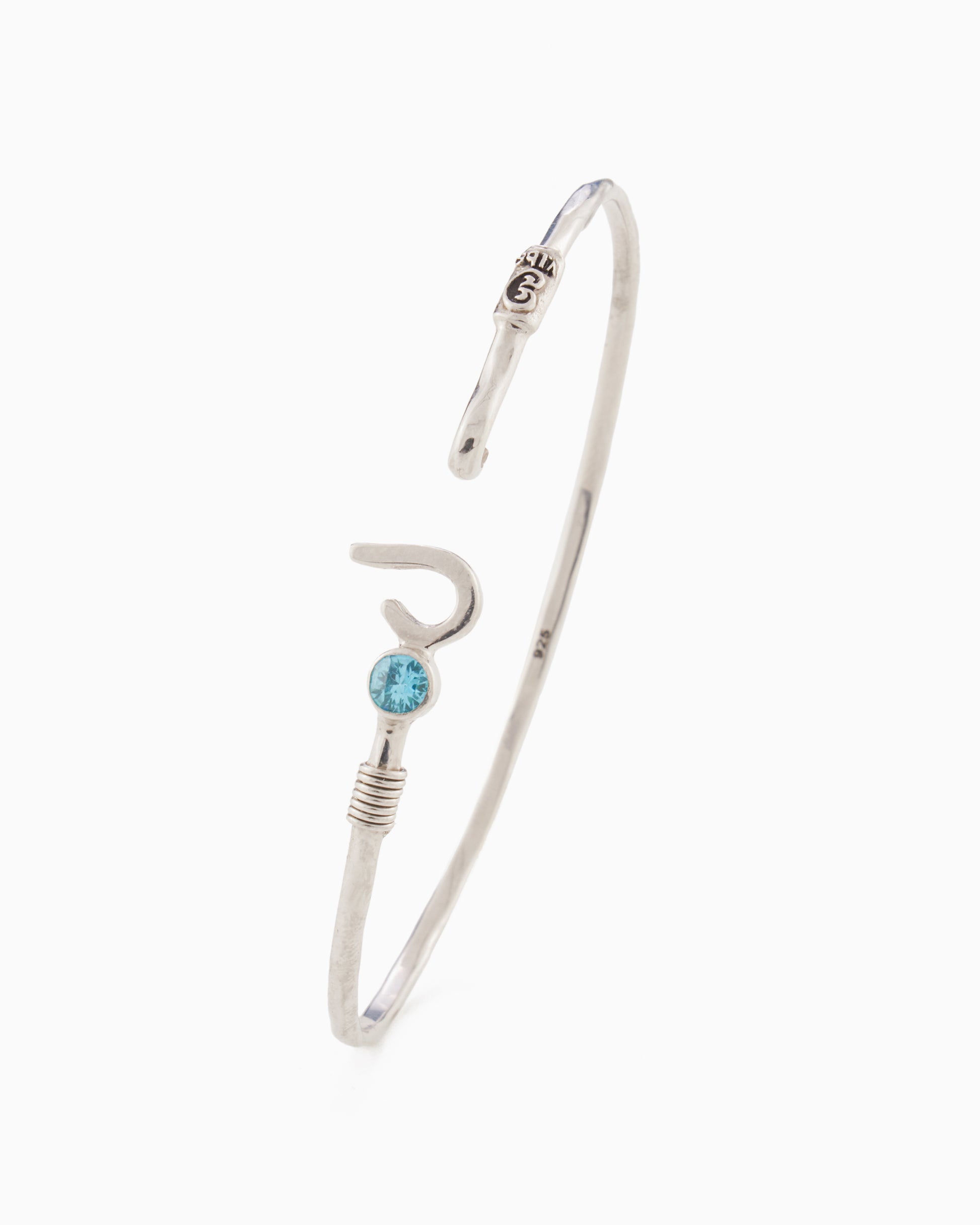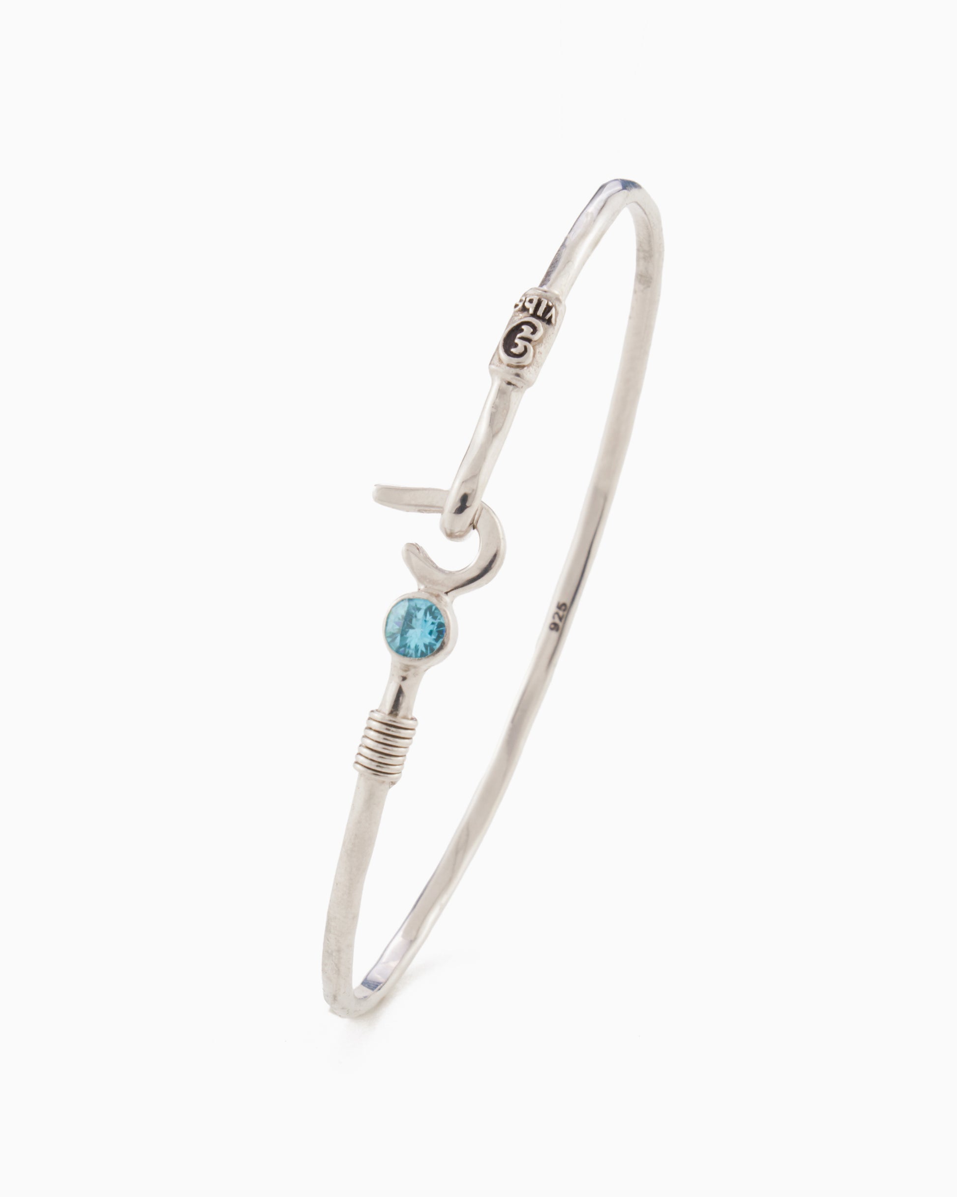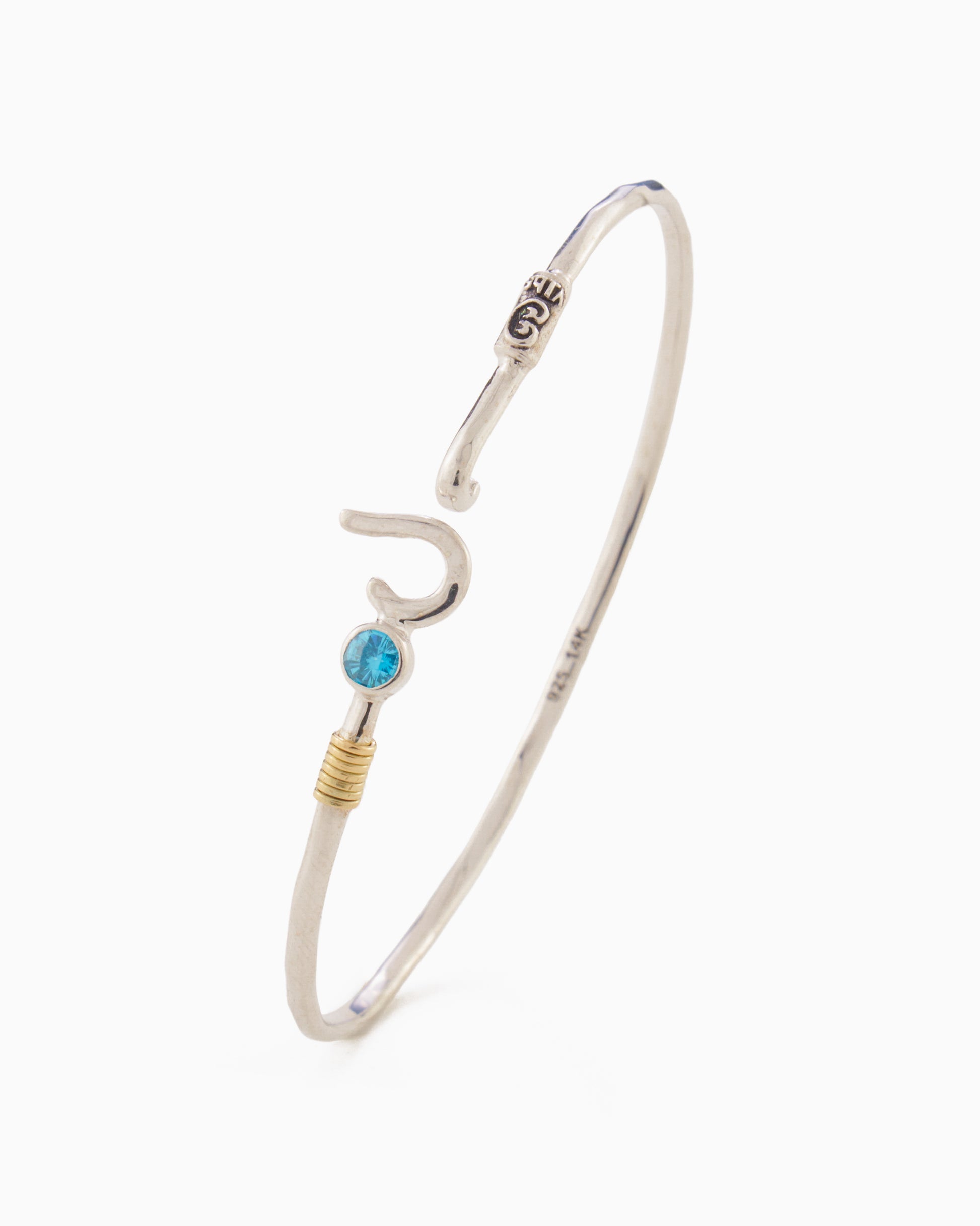 A Vibe signature, the St. John Hook Bracelet with Stone is fashioned in gently hammered sterling silver with a faceted Hampton blue topaz stone and "J" hook clasp. Featuring a replica of the St. John petroglyph and seven good luck wraps, solo or stacked, it is sure to be a favorite piece. Found in many of our designs, Vibe’s seven good luck wraps represent love, laughter, happiness, good fortune, health, unity, and peace. In the Caribbean tradition, wear your hook facing in to keep love close to your heart, and facing out if you are open to a new love in your life. Wear this piece on its own or stack it with other bracelets for a layered look.