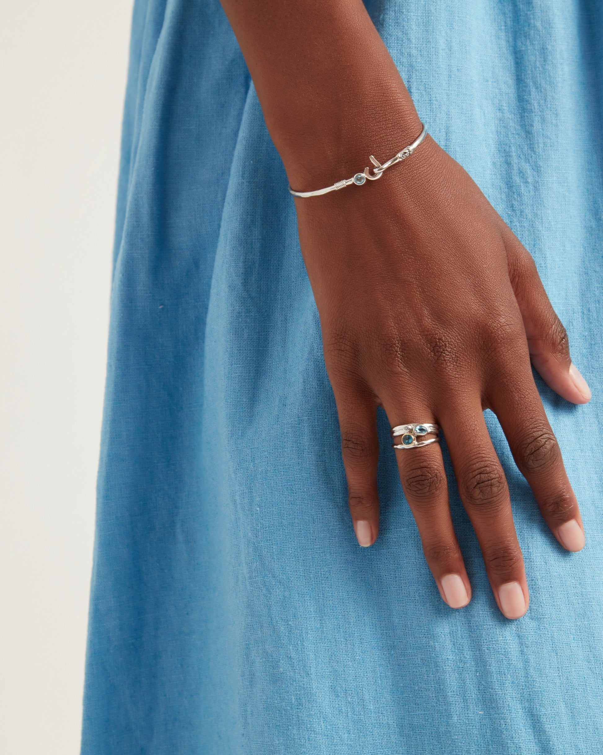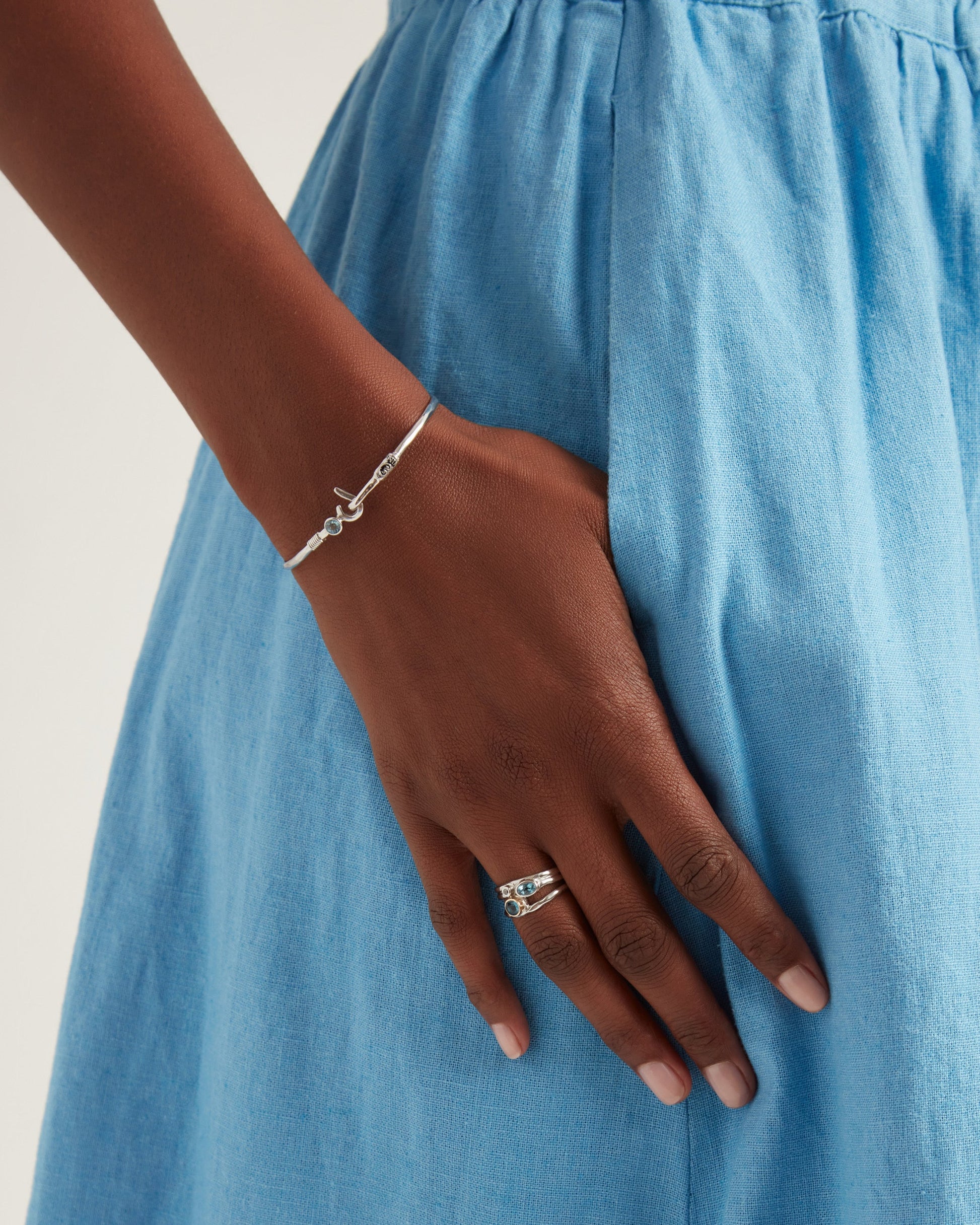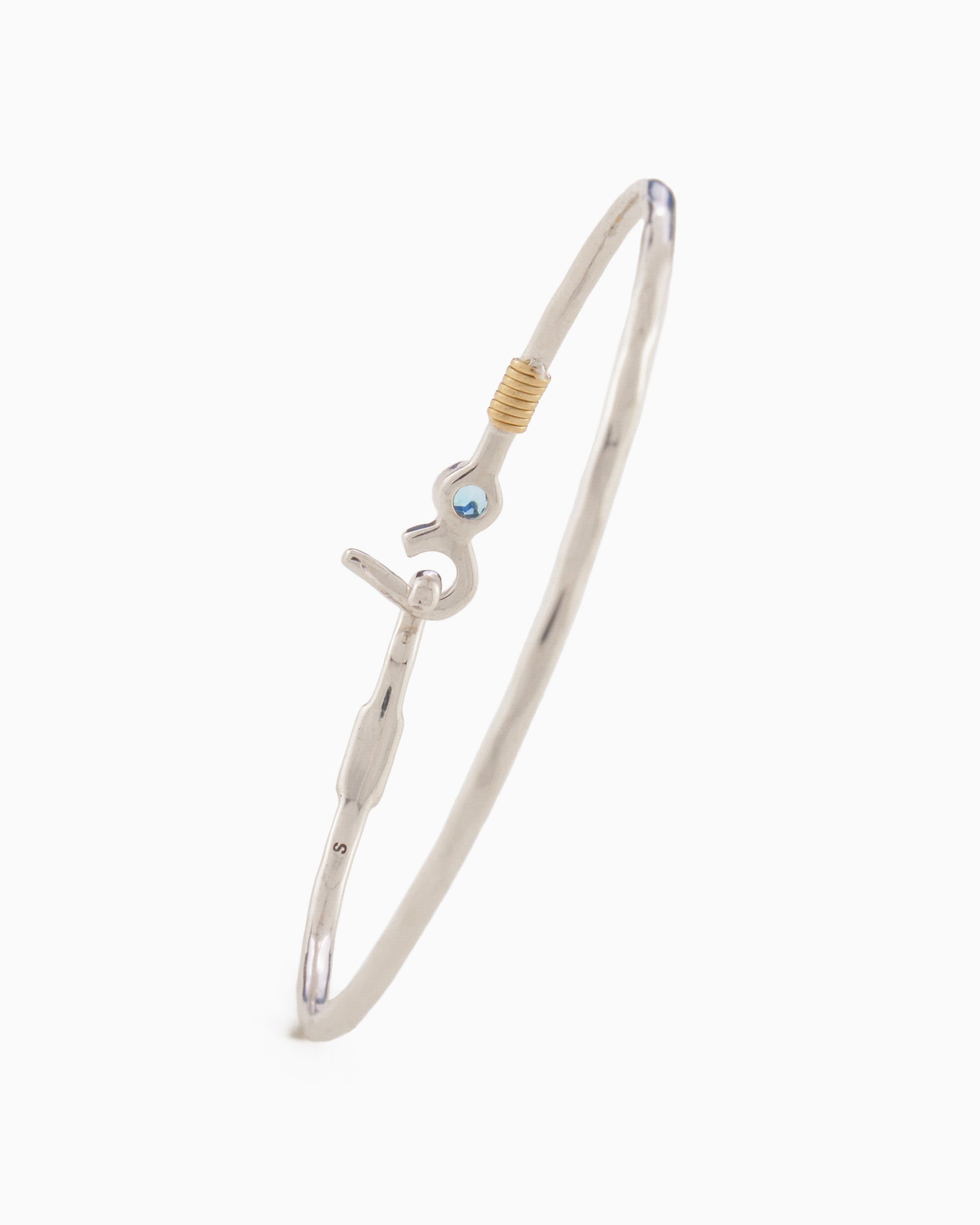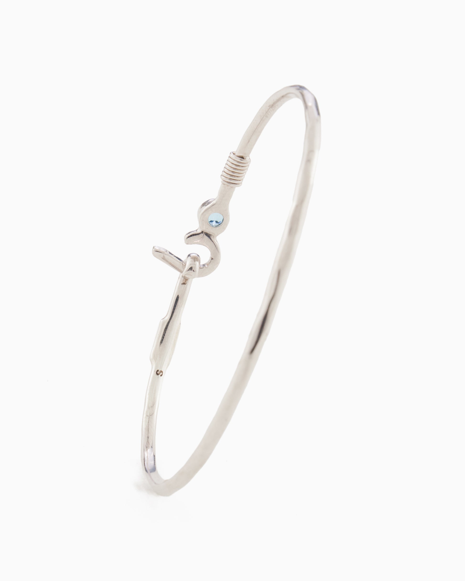A Vibe signature, the St. John Hook Bracelet with Stone is fashioned in gently hammered sterling silver with a faceted Hampton blue topaz stone and "J" hook clasp. Featuring a replica of the St. John petroglyph and seven good luck wraps, solo or stacked, it is sure to be a favorite piece. Found in many of our designs, Vibe’s seven good luck wraps represent love, laughter, happiness, good fortune, health, unity, and peace. In the Caribbean tradition, wear your hook facing in to keep love close to your heart, and facing out if you are open to a new love in your life. Wear this piece on its own or stack it with other bracelets for a layered look.