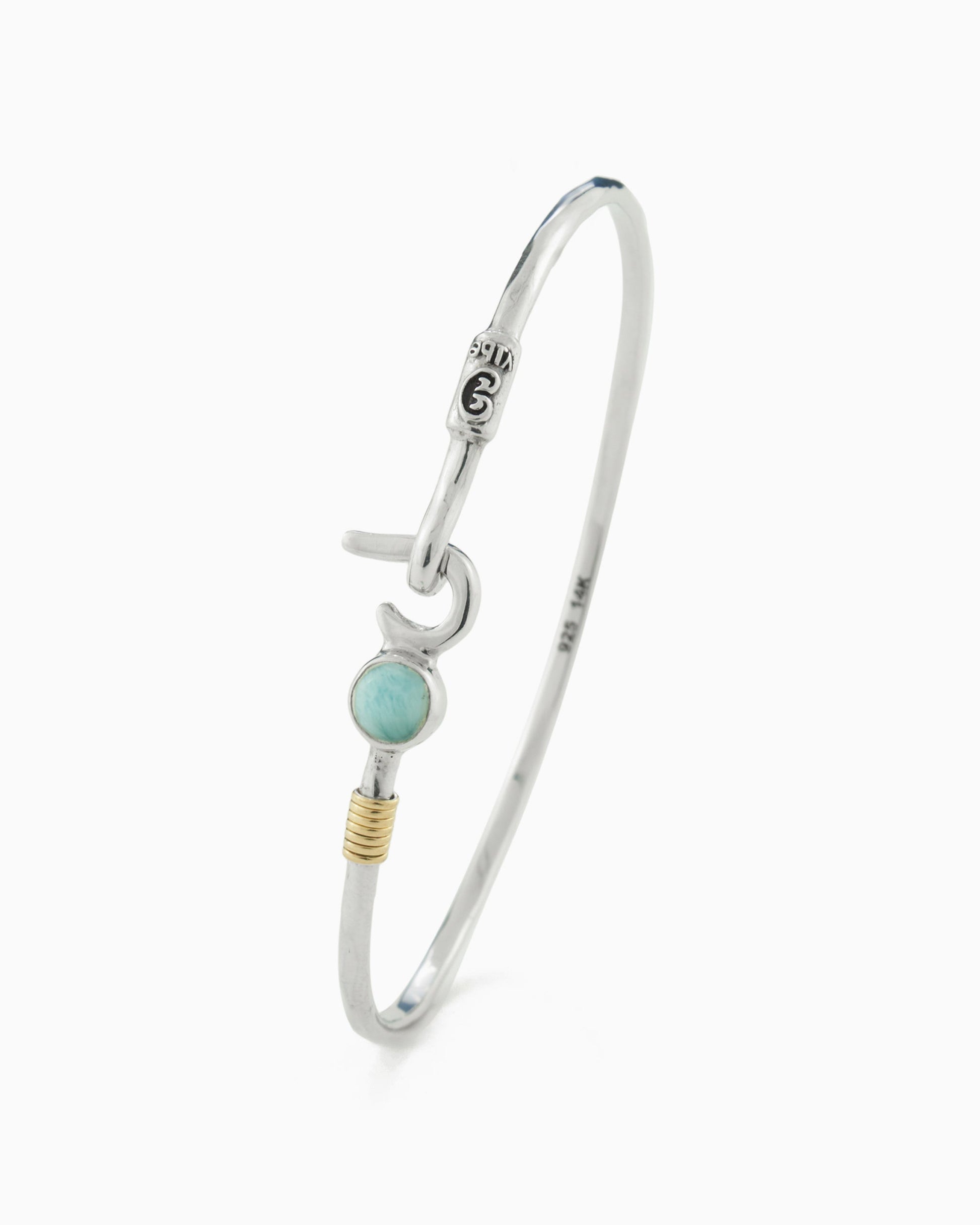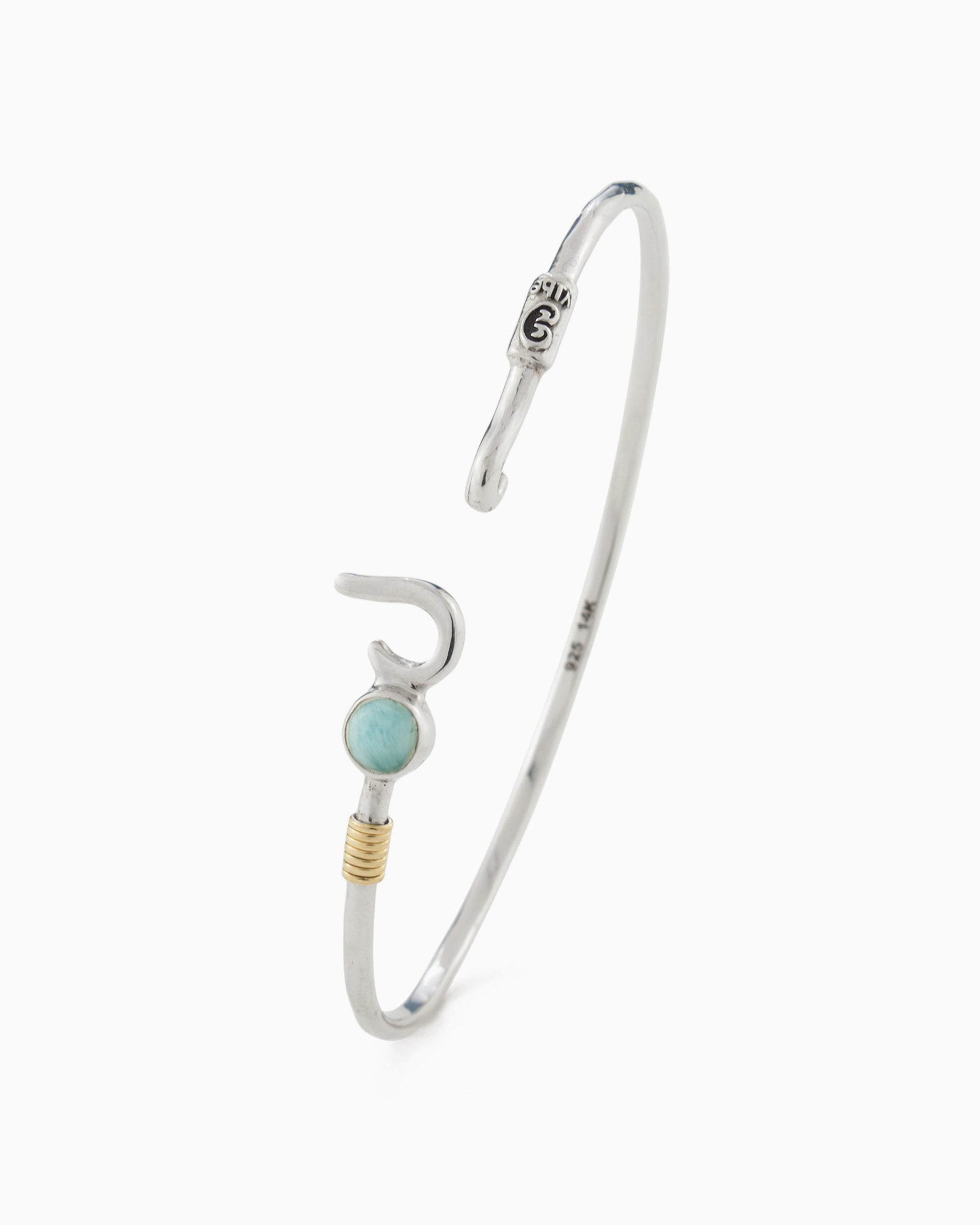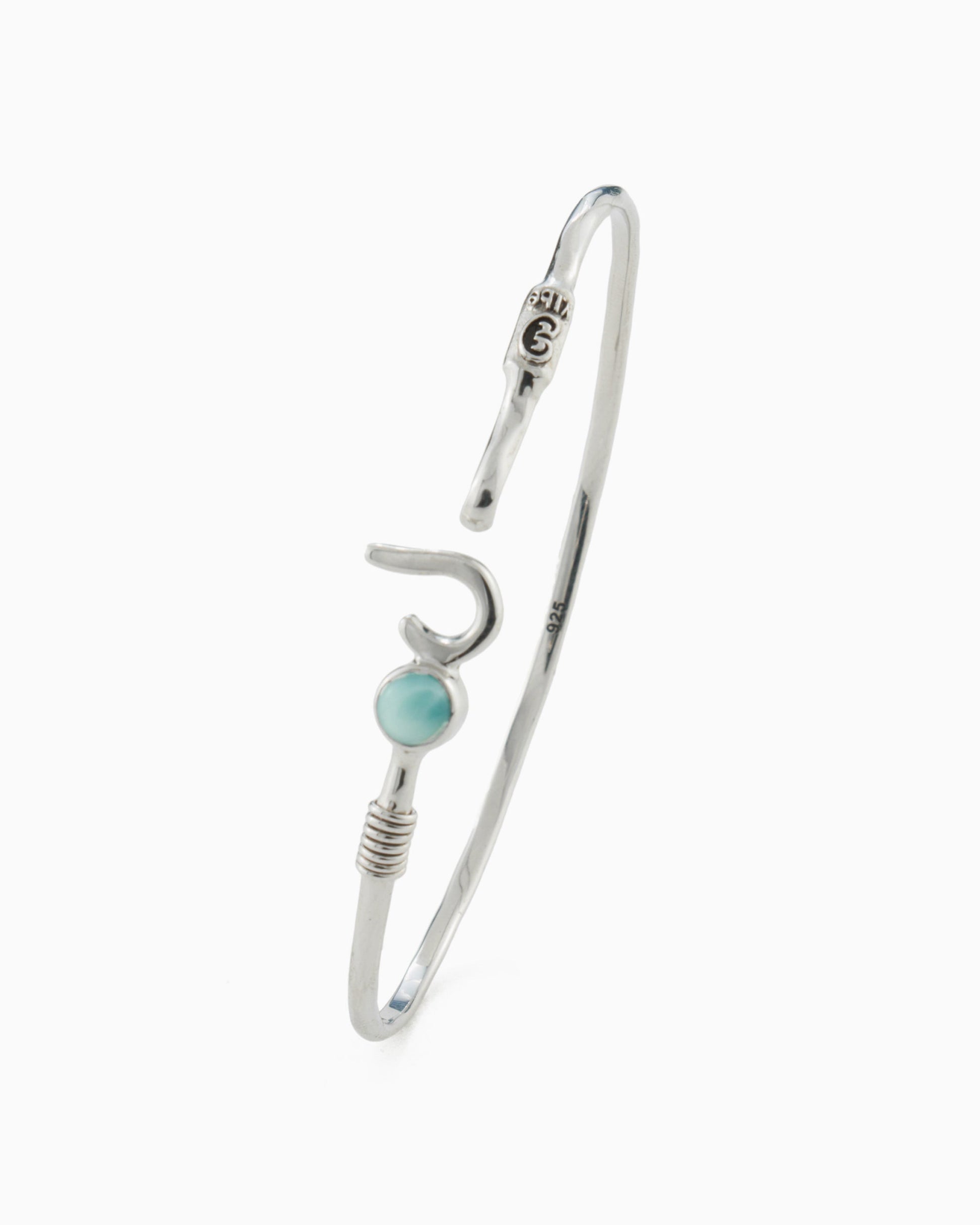 A Vibe signature, the St. John Hook Bracelet with Stone is fashioned in gently hammered sterling silver with a larimar cabochon and "J" hook clasp. Featuring a replica of the St. John petroglyph and seven good luck wraps, solo or stacked, it is sure to be a favorite piece. Found in many of our designs, Vibe’s seven good luck wraps represent love, laughter, happiness, good fortune, health, unity, and peace. In the Caribbean tradition, wear your hook facing in to keep love close to your heart, and facing out if you are open to a new love in your life. Wear this piece on its own or stack it with other bracelets for a layered look.