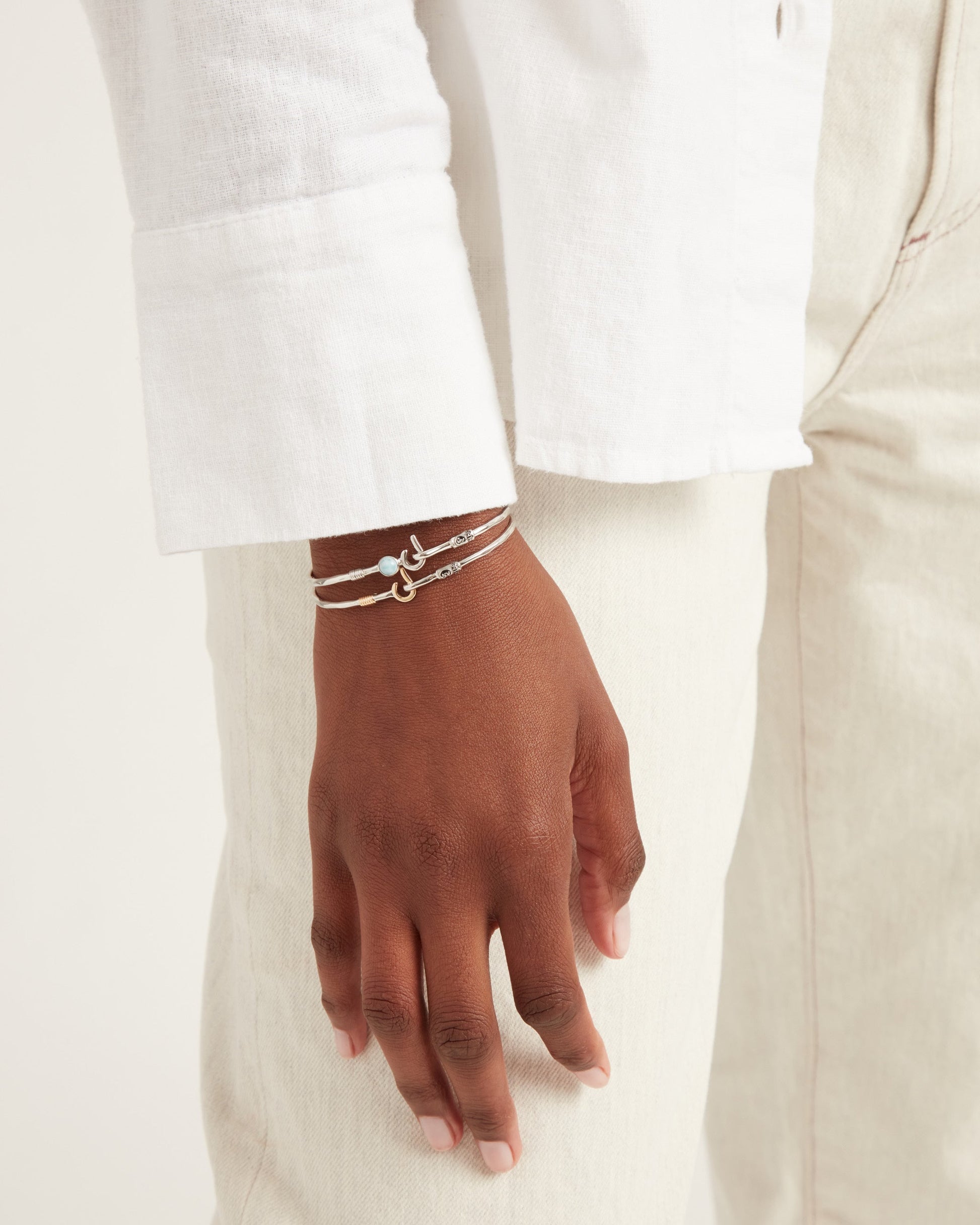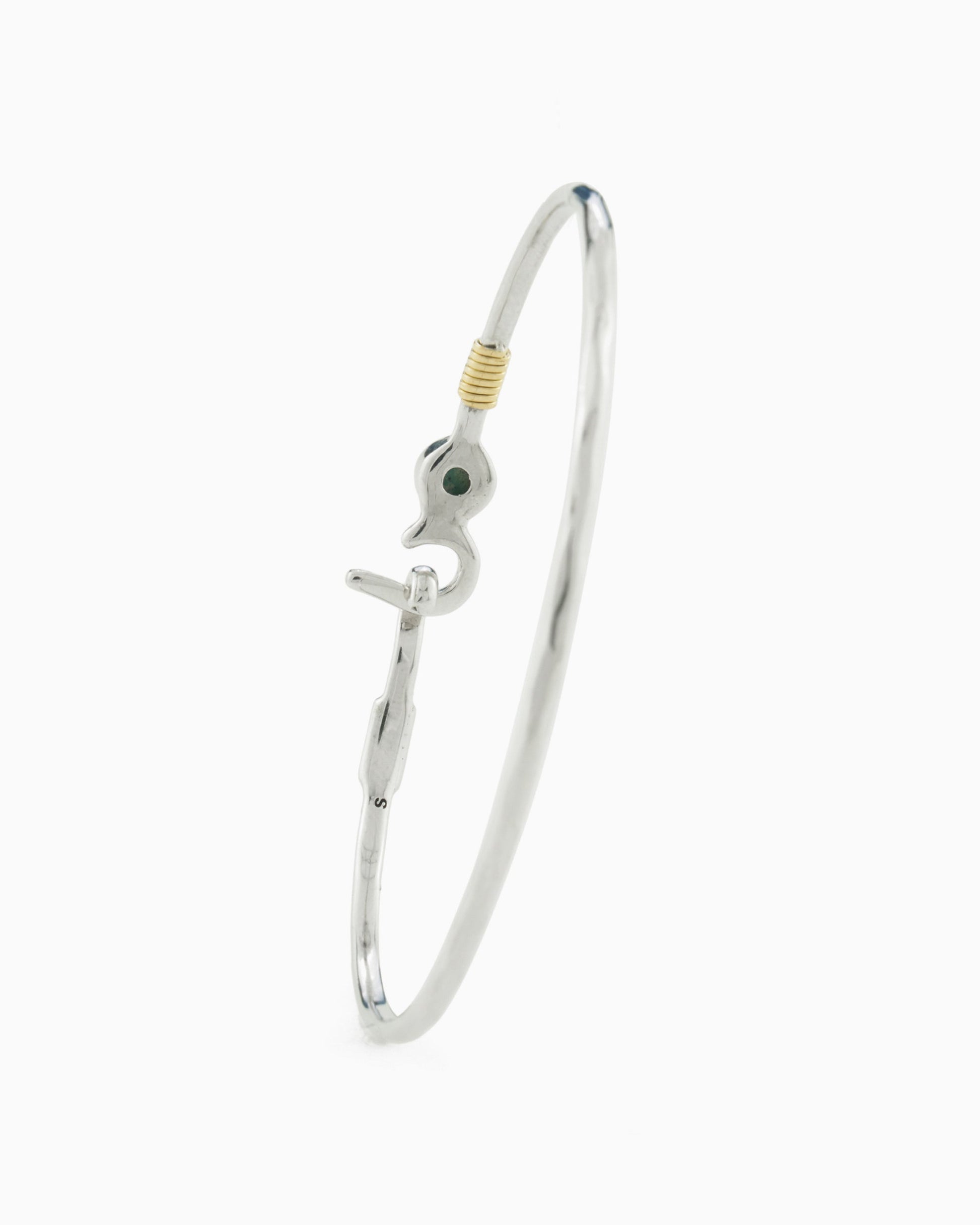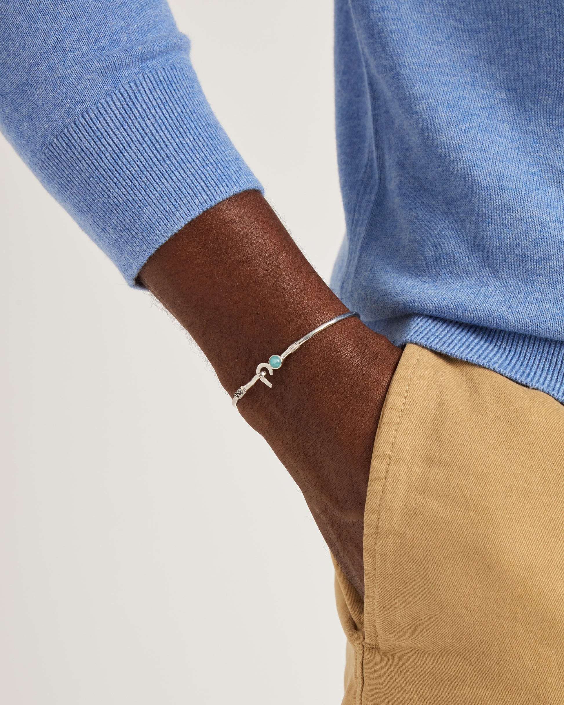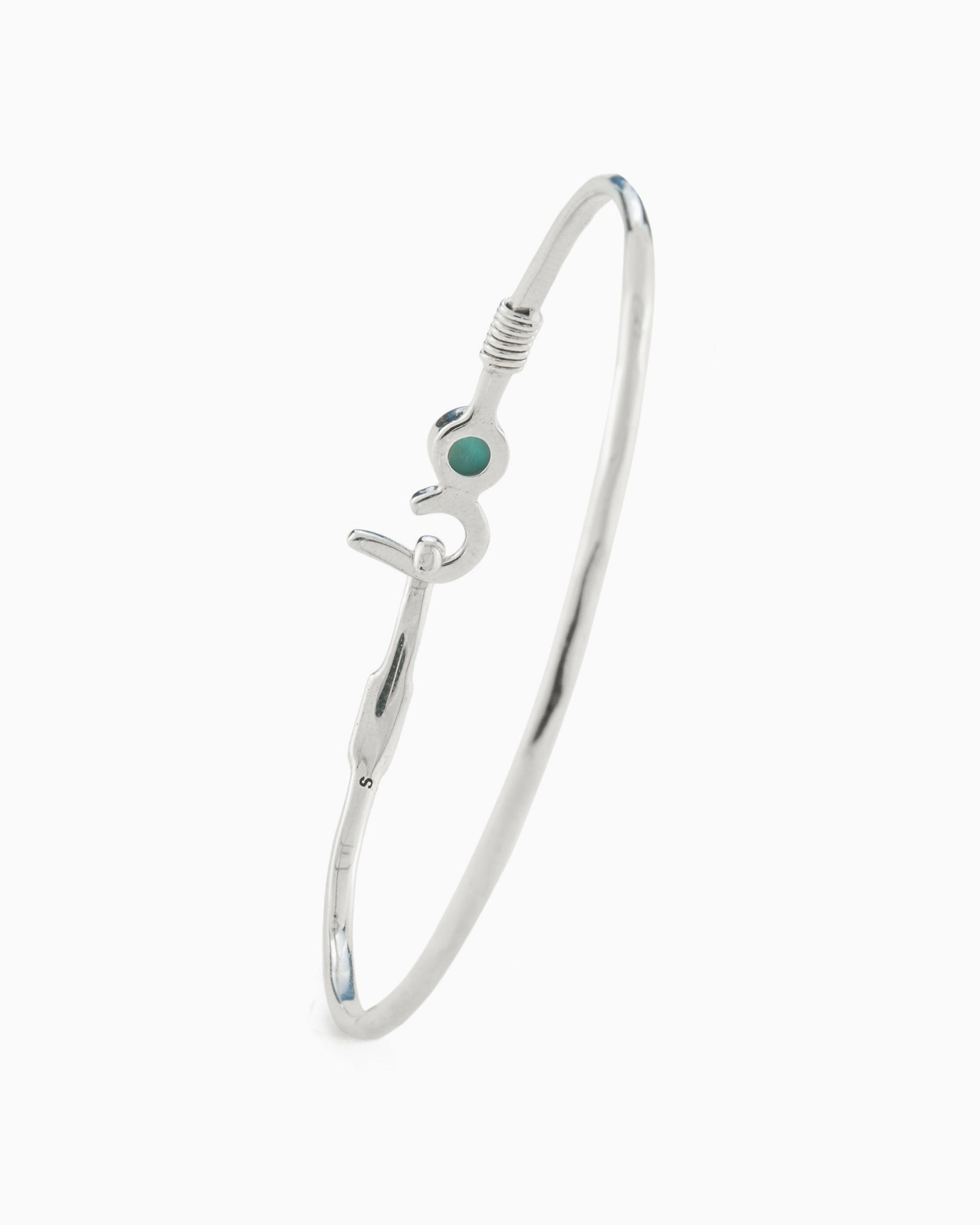 A Vibe signature, the St. John Hook Bracelet with Stone is fashioned in gently hammered sterling silver with a larimar cabochon and "J" hook clasp. Featuring a replica of the St. John petroglyph and seven good luck wraps, solo or stacked, it is sure to be a favorite piece. Found in many of our designs, Vibe’s seven good luck wraps represent love, laughter, happiness, good fortune, health, unity, and peace. In the Caribbean tradition, wear your hook facing in to keep love close to your heart, and facing out if you are open to a new love in your life. Wear this piece on its own or stack it with other bracelets for a layered look.