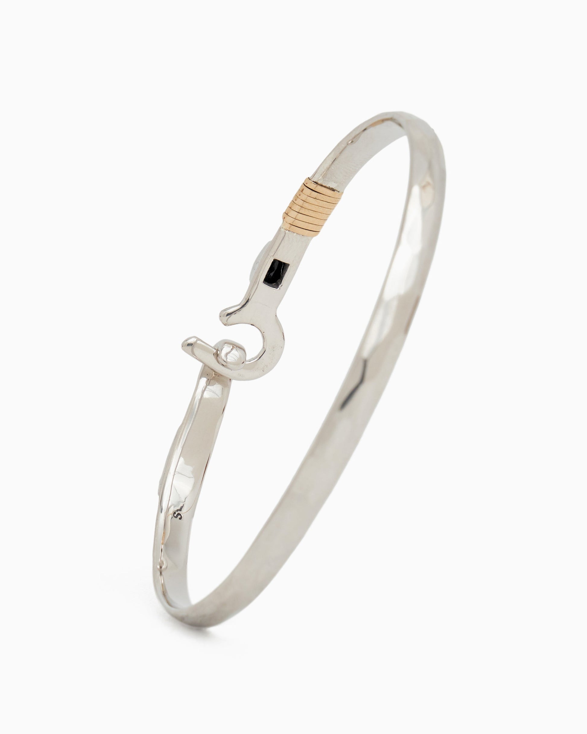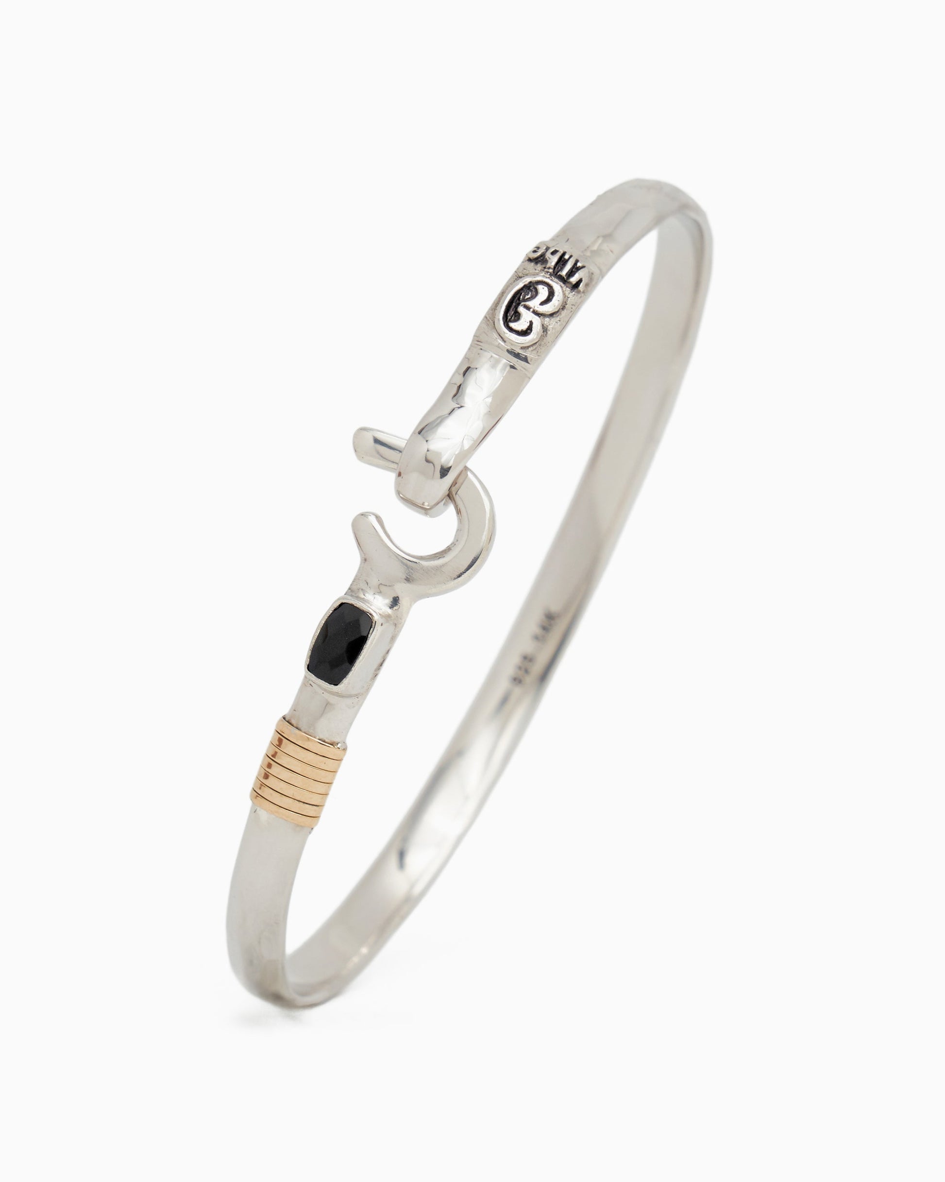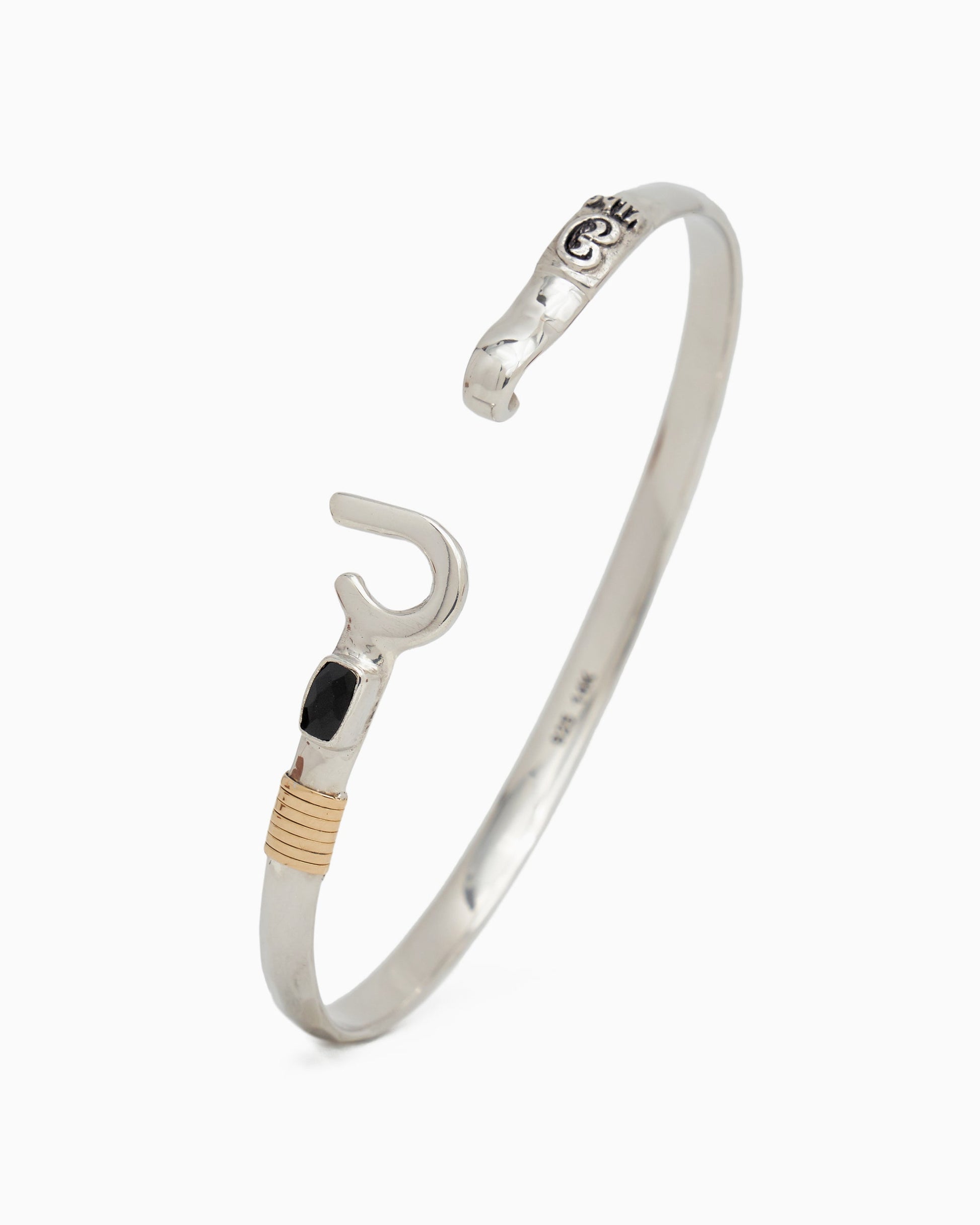 A Vibe signature, the St. John Hook Bracelet with Stone is fashioned in gently hammered sterling silver with a faceted black onyx stone and "J" hook clasp. Featuring a replica of the St. John petroglyph and seven 14K gold good luck wraps, solo or stacked, it is sure to be a favorite statement piece. Found in many of our designs, Vibe’s seven good luck wraps represent love, laughter, happiness, good fortune, health, unity, and peace. In the Caribbean tradition, wear your hook facing in to keep love close to your heart, and facing out if you are open to a new love in your life. Wear this piece on its own or stack it with other bracelets for a layered look. For added fun, embellish your new hook bracelet with one or more of Vibe's fun and unique charms!