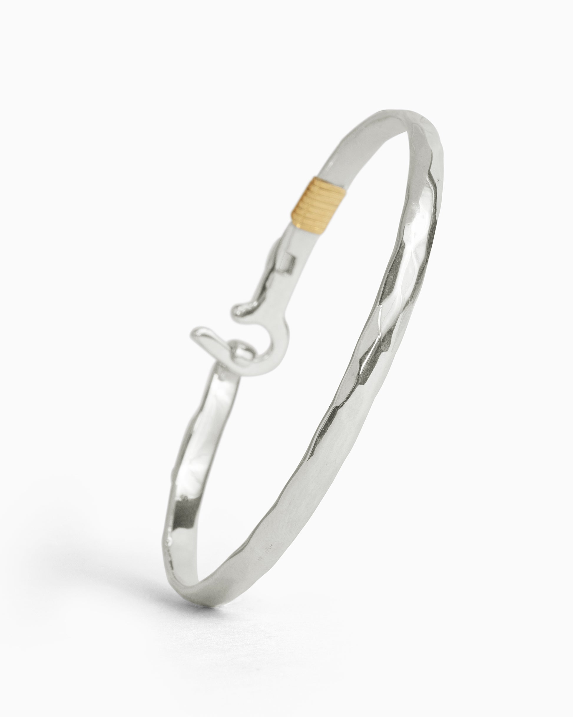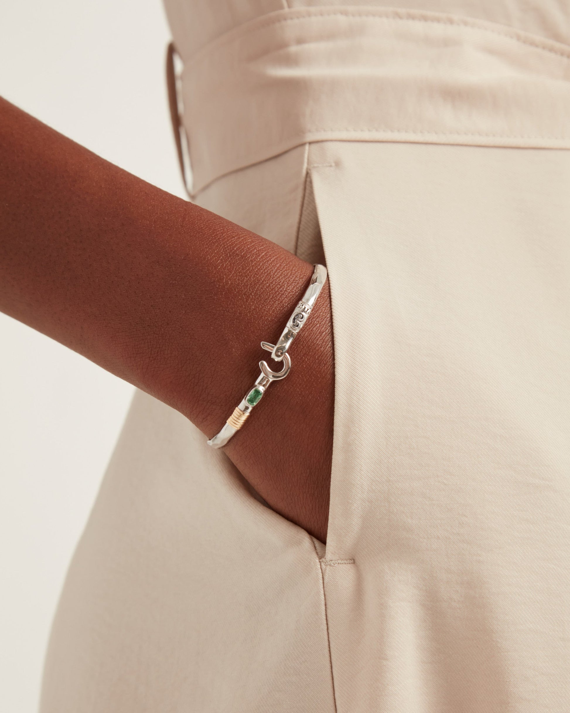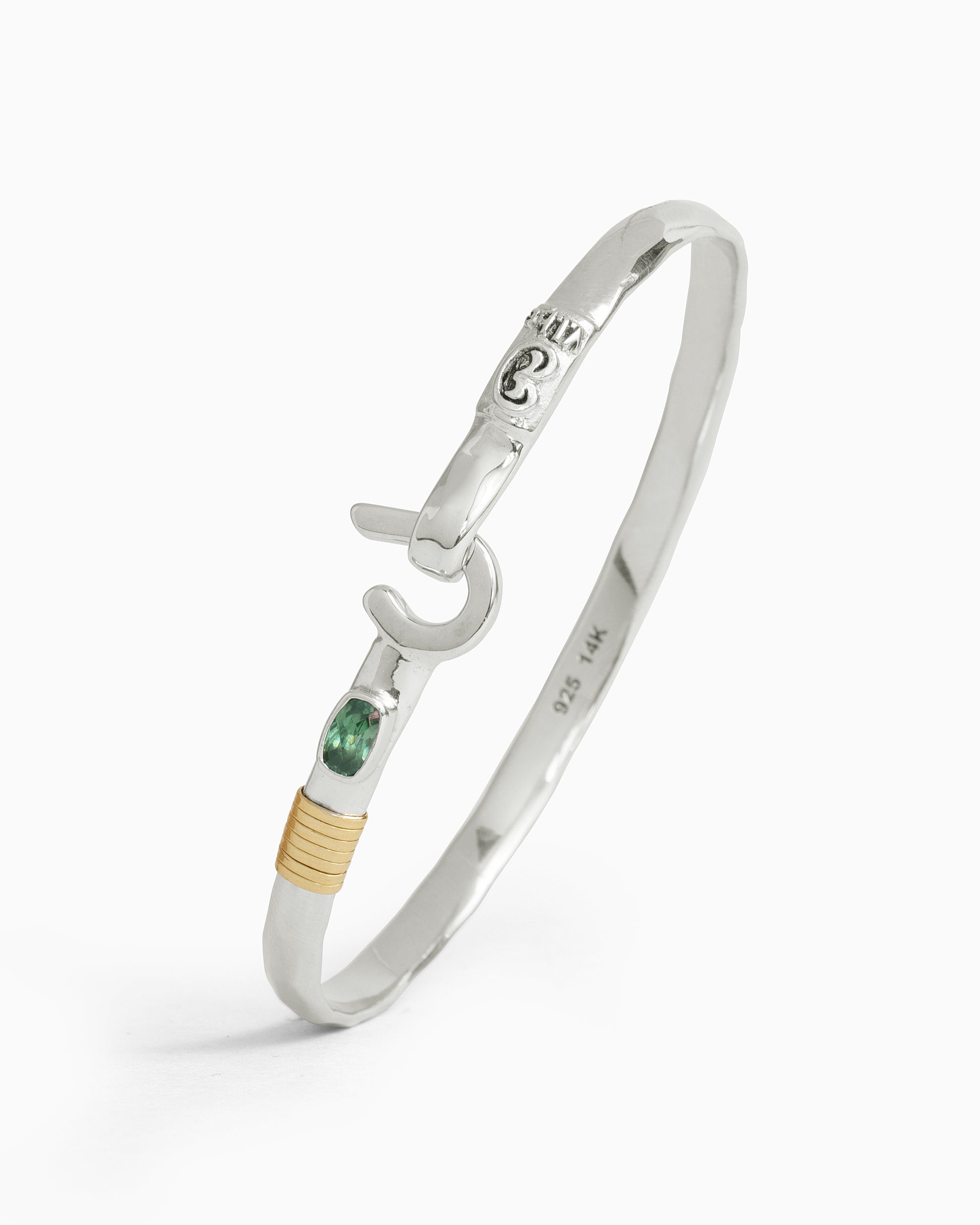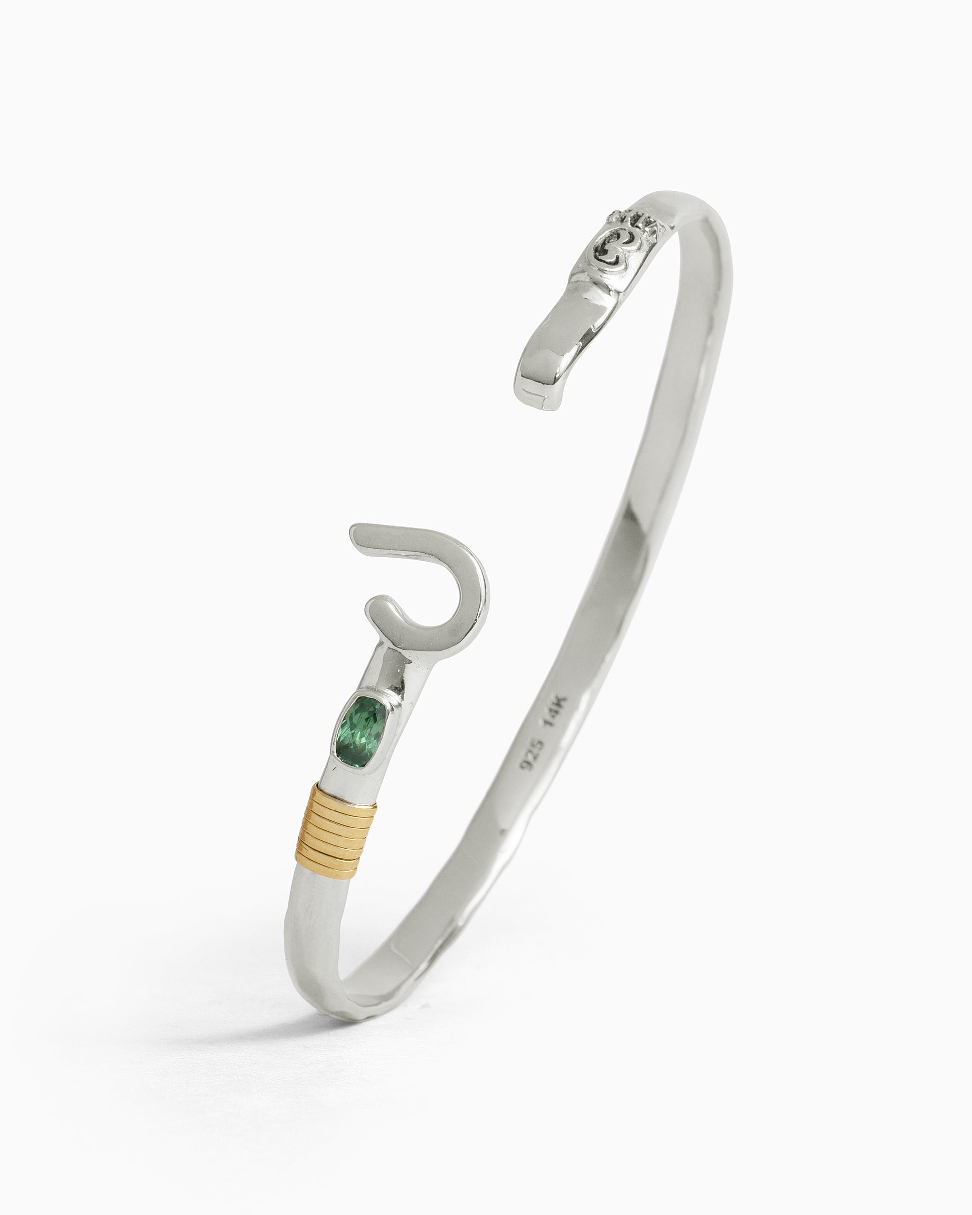 A Vibe signature, the St. John Hook Bracelet with Stone is fashioned in gently hammered sterling silver with a faceted green zircon stone and "J" hook clasp. Featuring a replica of the St. John petroglyph and seven 14K gold good luck wraps, solo or stacked, it is sure to be a favorite statement piece. Found in many of our designs, Vibe’s seven good luck wraps represent love, laughter, happiness, good fortune, health, unity, and peace. In the Caribbean tradition, wear your hook facing in to keep love close to your heart, and facing out if you are open to a new love in your life. Wear this piece on its own or stack it with other bracelets for a layered look. For added fun, embellish your new hook bracelet with one or more of Vibe's fun and unique charms!