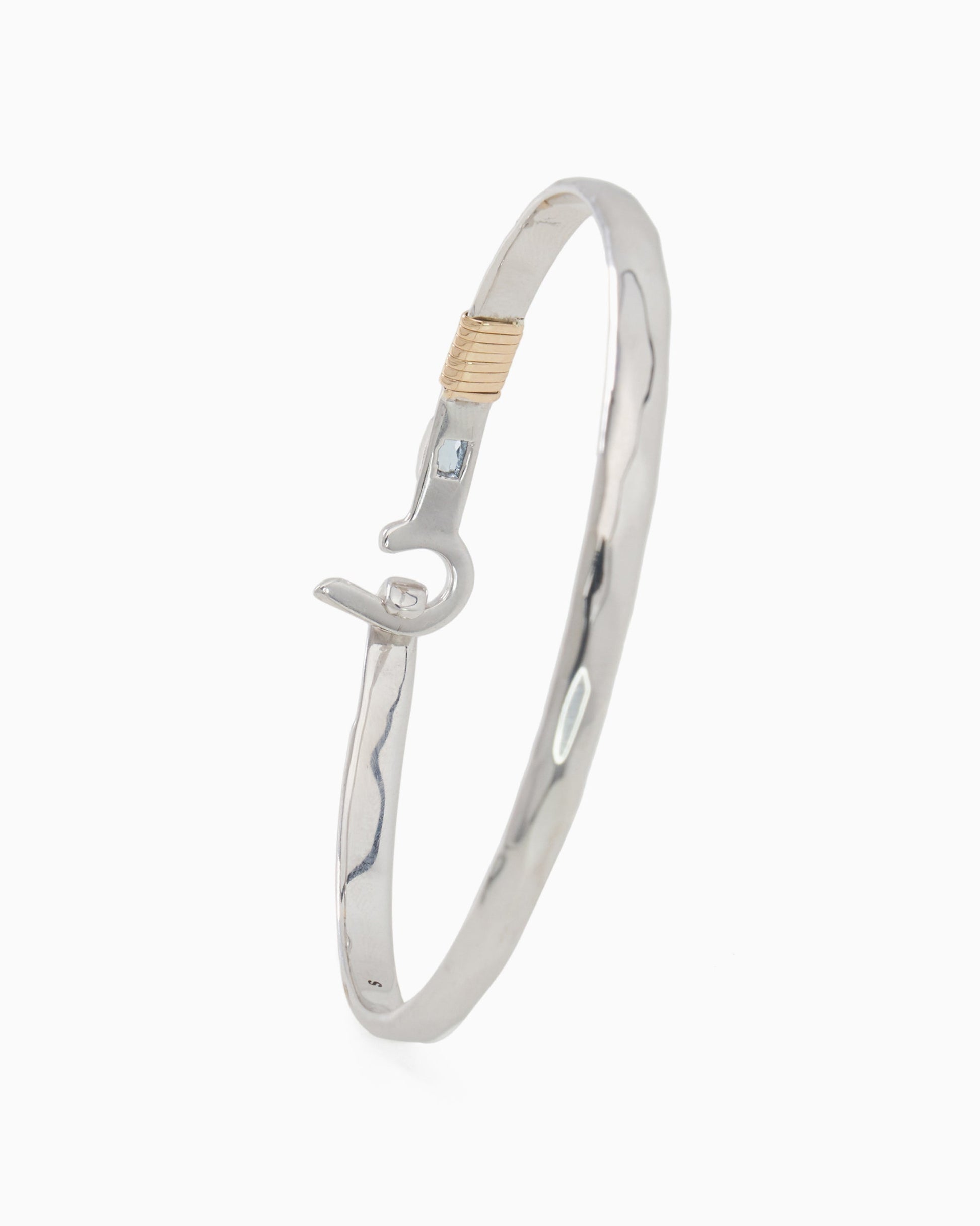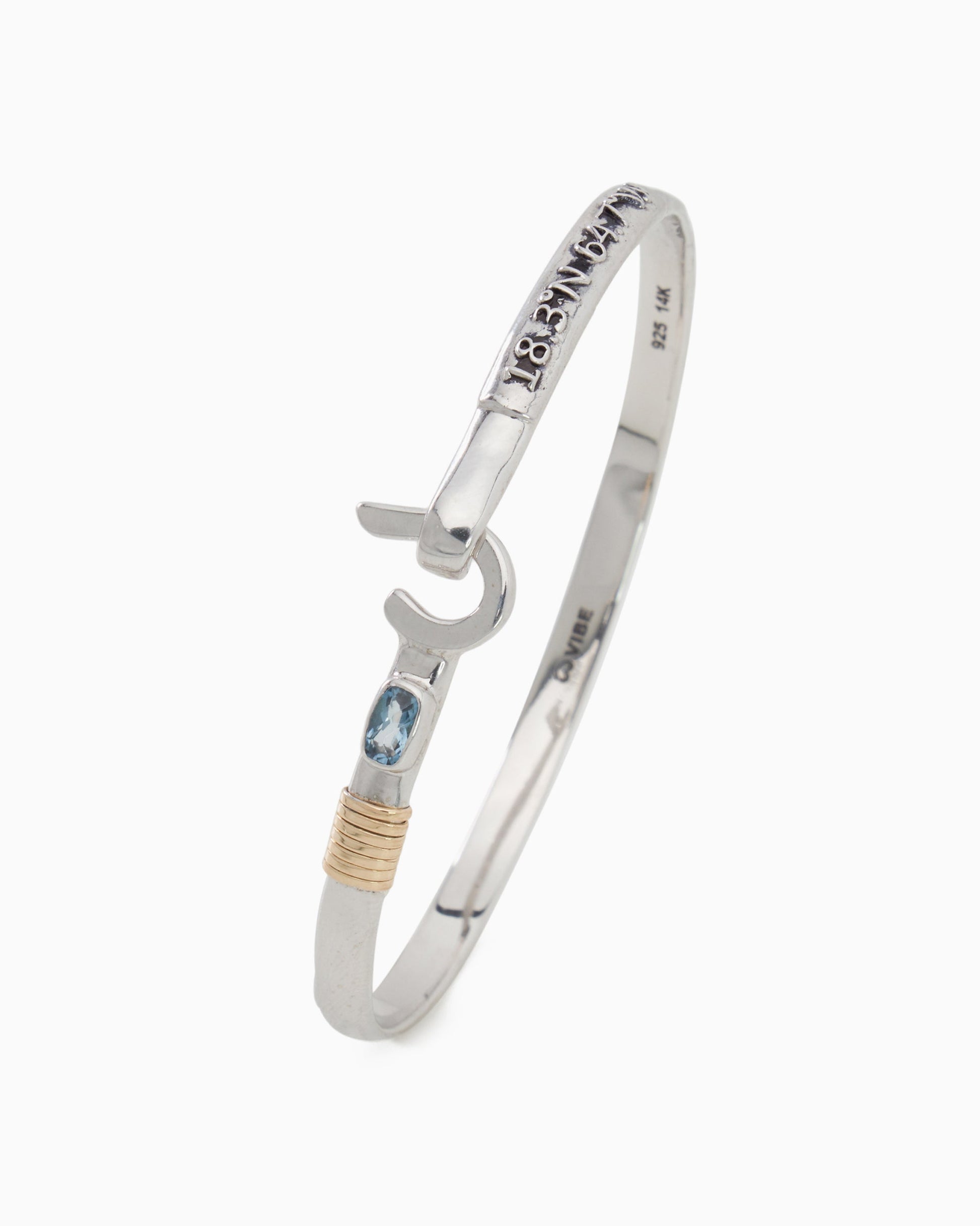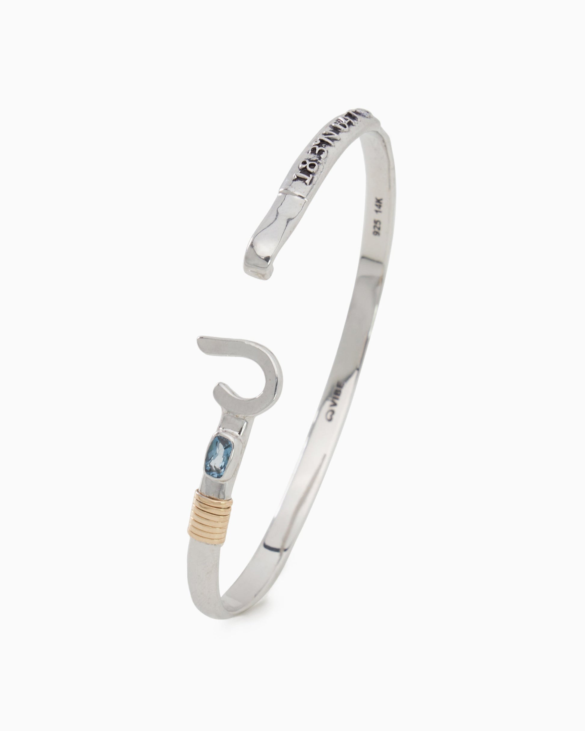 A Vibe signature, the St. John Hook Bracelet with Stone & Coordinates is fashioned in gently hammered sterling silver with a faceted London blue topaz stone and "J" hook clasp. Featuring the St. John coordinates and seven 14K gold good luck wraps, solo or stacked, it is sure to be a favorite statement piece. Found in many of our designs, Vibe’s seven good luck wraps represent love, laughter, happiness, good fortune, health, unity, and peace. In the Caribbean tradition, wear your hook facing in to keep love close to your heart, and facing out if you are open to a new love in your life. Wear this piece on its own or stack it with other bracelets for a layered look. For added fun, embellish your new hook bracelet with one or more of Vibe's fun and unique charms!
