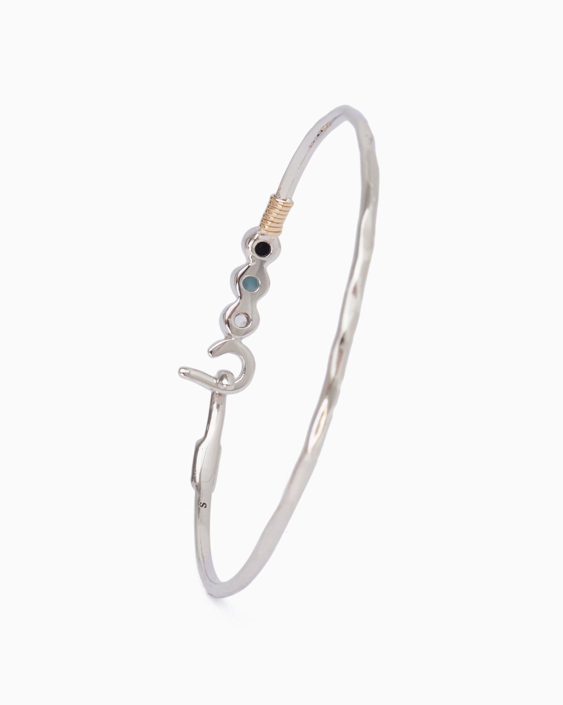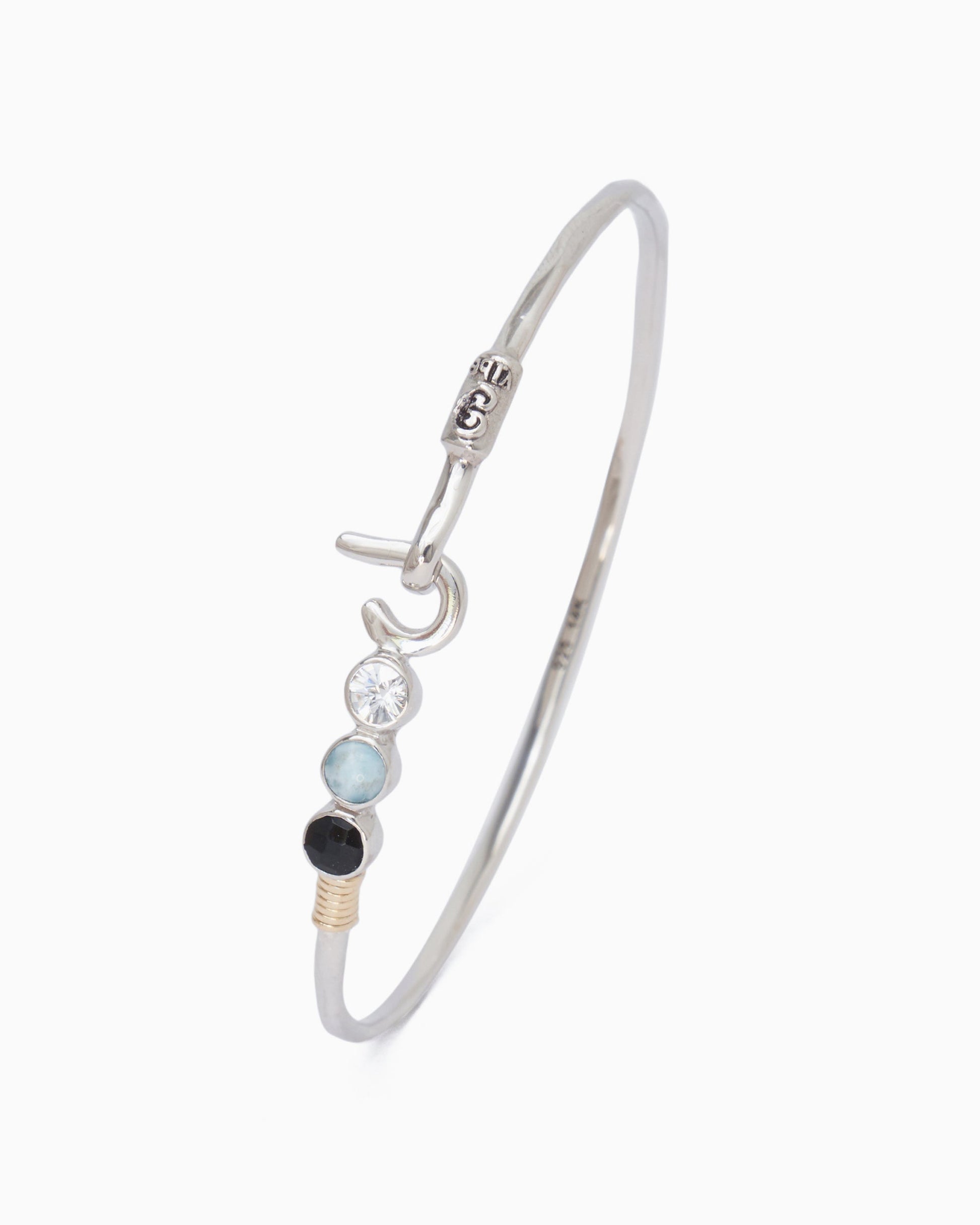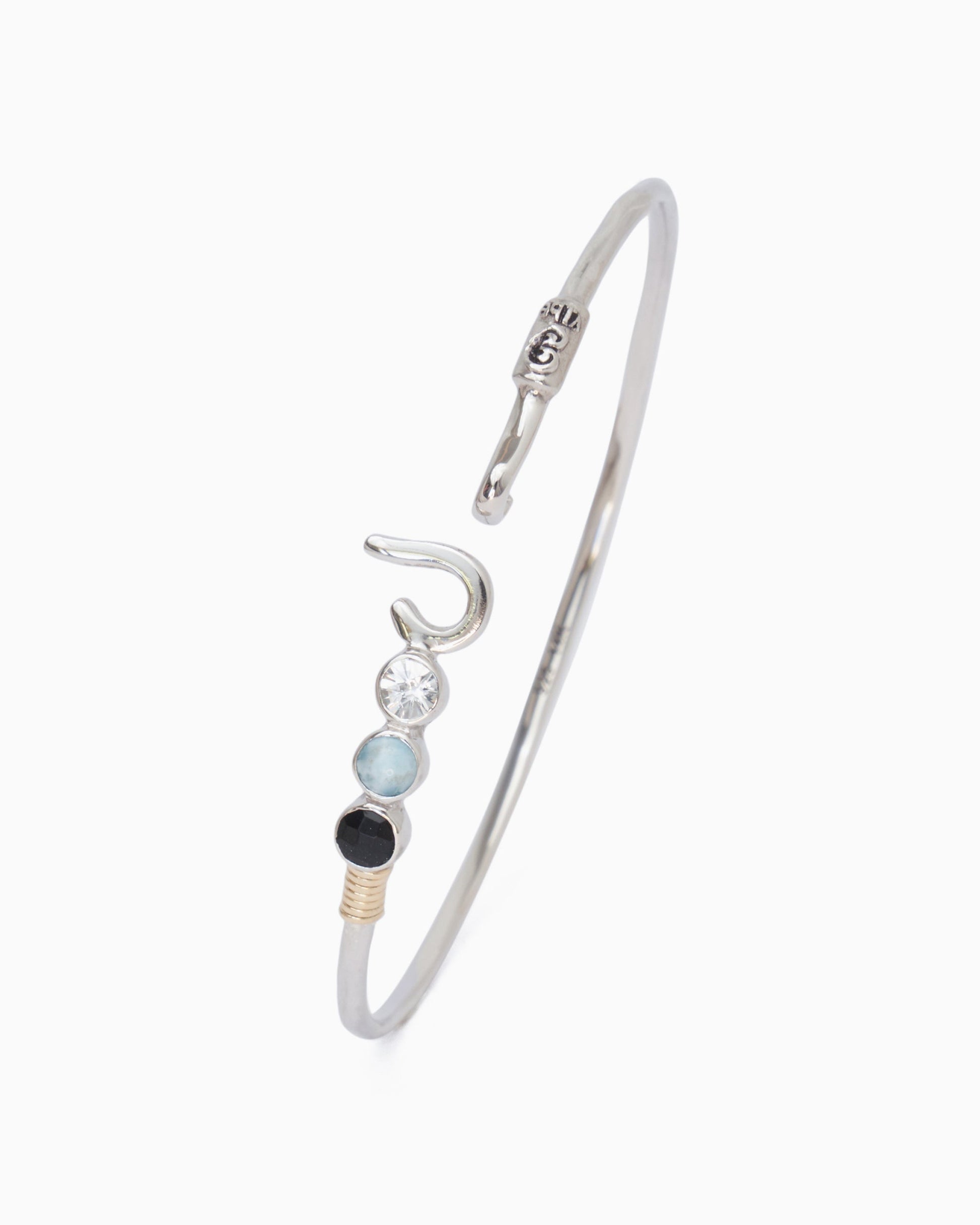 A Vibe signature, the St. John Hook Bracelet with Triple Stones is fashioned in gently hammered sterling silver with three stones and a "J" hook clasp to honor the island of St. John. Each stone is a tribute to one of the three iconic U.S. Virgin Islands: St. John, St. Thomas, and St. Croix. Featuring a replica of the St. John petroglyph and seven 14K gold good luck wraps, solo or stacked, it is sure to be a favorite piece. Found in many of our designs, Vibe’s seven good luck wraps represent love, laughter, happiness, good fortune, health, unity, and peace. In the Caribbean tradition, wear your hook facing in to keep love close to your heart, and facing out if you are open to a new love in your life. Wear this piece on its own or stack it with other bracelets for a layered look.
