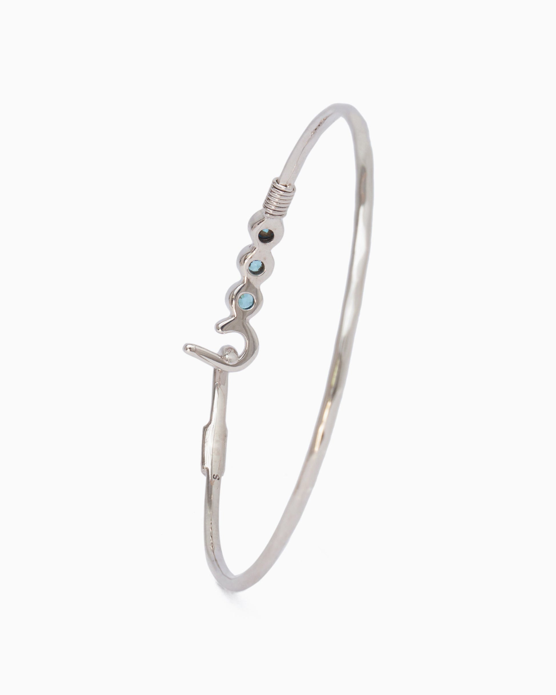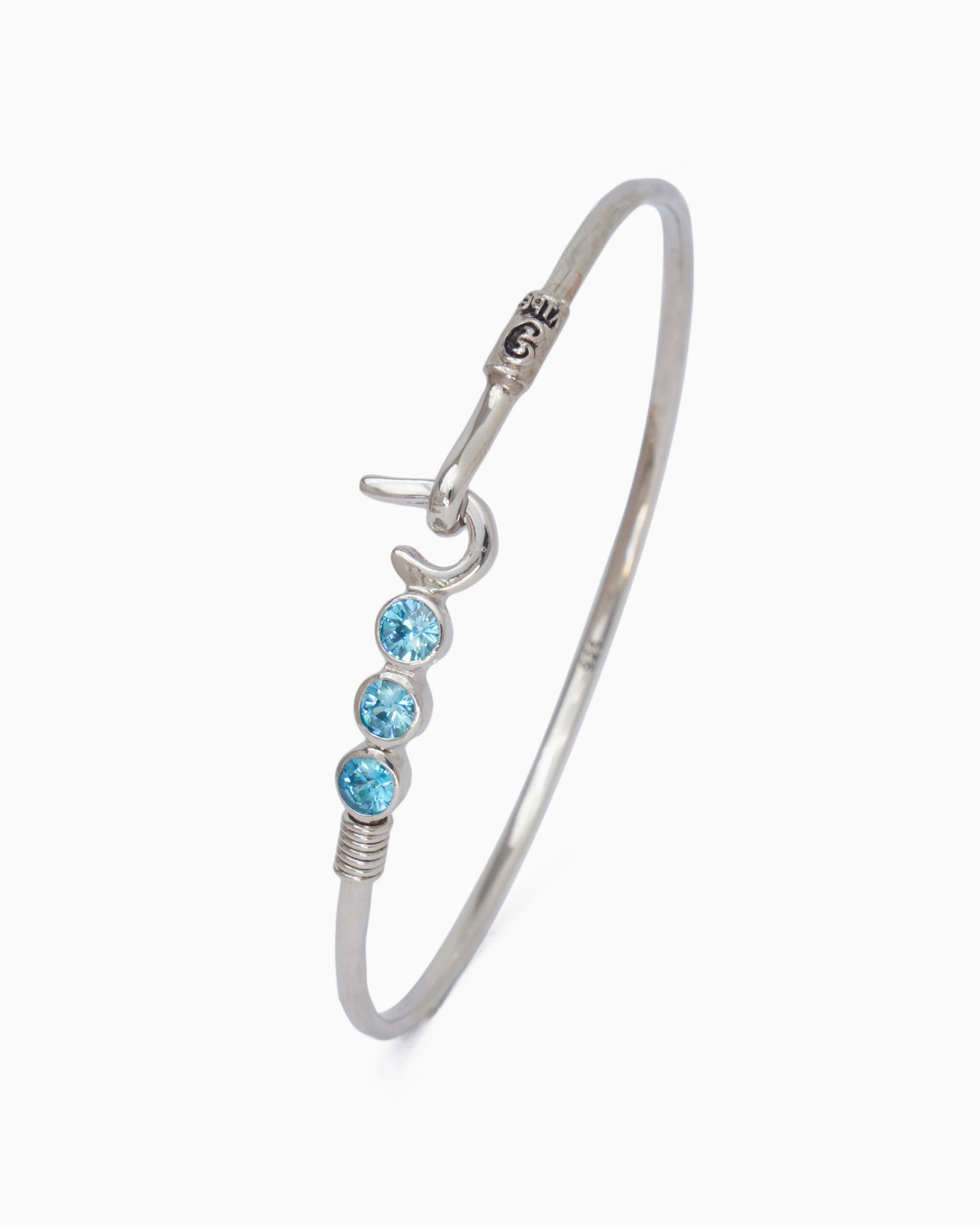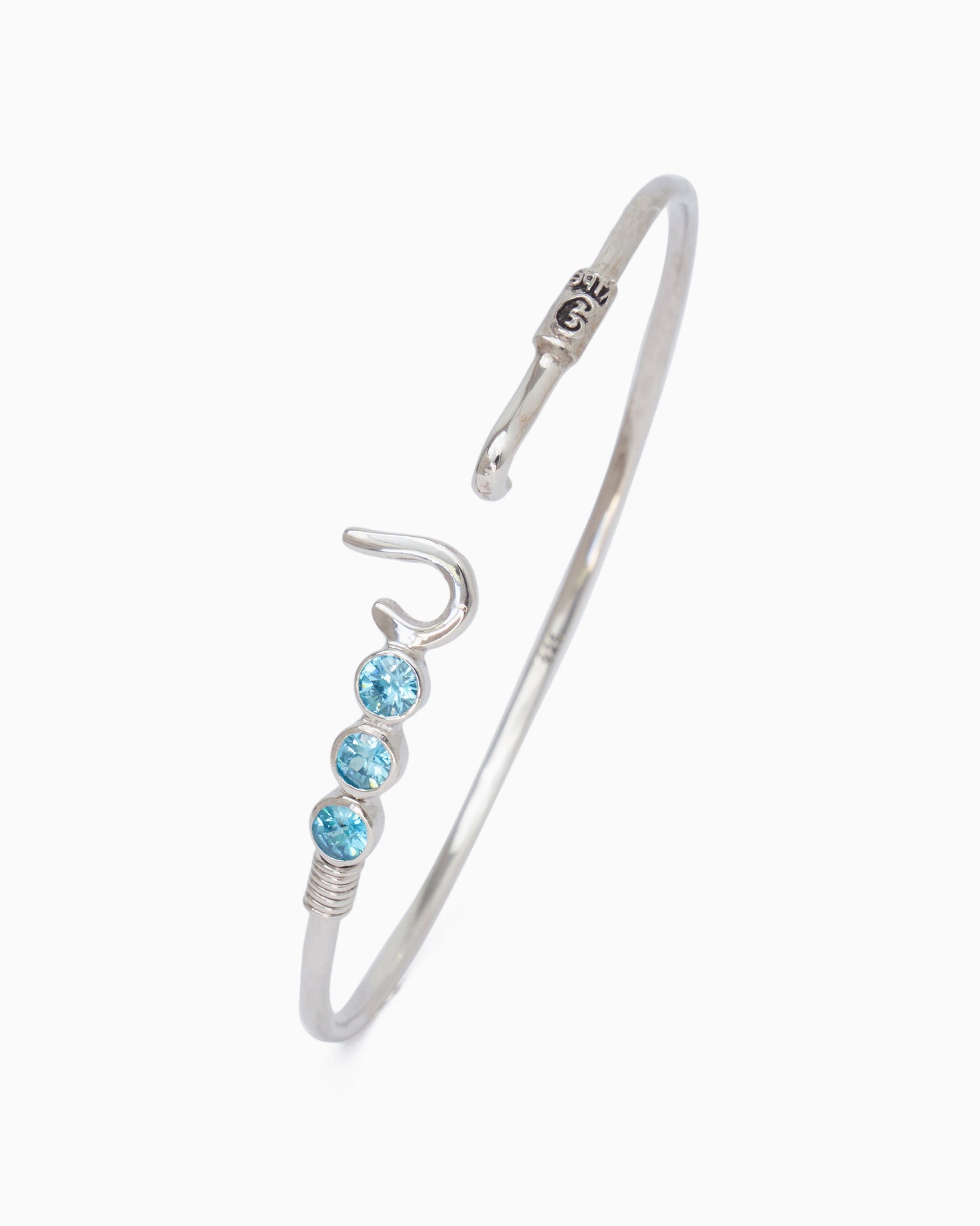 A Vibe signature, the St. John Hook Bracelet with Triple Stones is fashioned in gently hammered sterling silver with three faceted blue zircon stones and a "J" hook clasp to honor the island of St. John. Each stone is a tribute to one of the three iconic U.S. Virgin Islands: St. John, St. Thomas, and St. Croix. Featuring a replica of the St. John petroglyph and seven good luck wraps, solo or stacked, it is sure to be a favorite piece. Found in many of our designs, Vibe’s seven good luck wraps represent love, laughter, happiness, good fortune, health, unity, and peace. In the Caribbean tradition, wear your hook facing in to keep love close to your heart, and facing out if you are open to a new love in your life. Wear this piece on its own or stack it with other bracelets for a layered look.