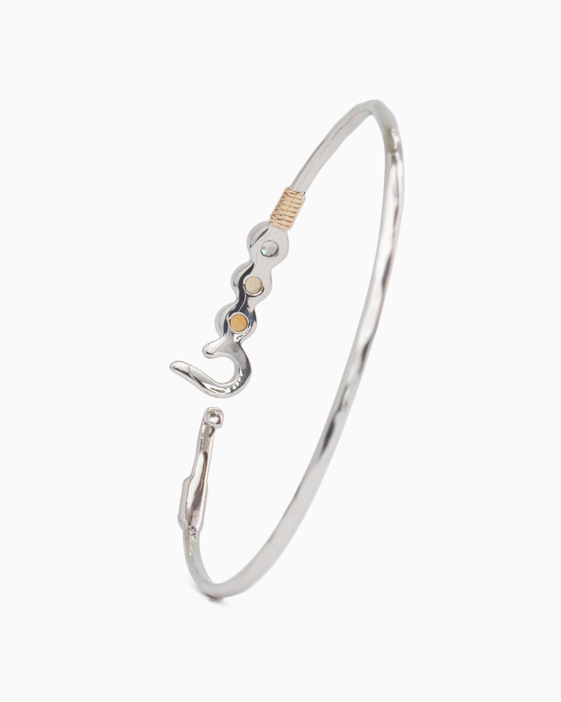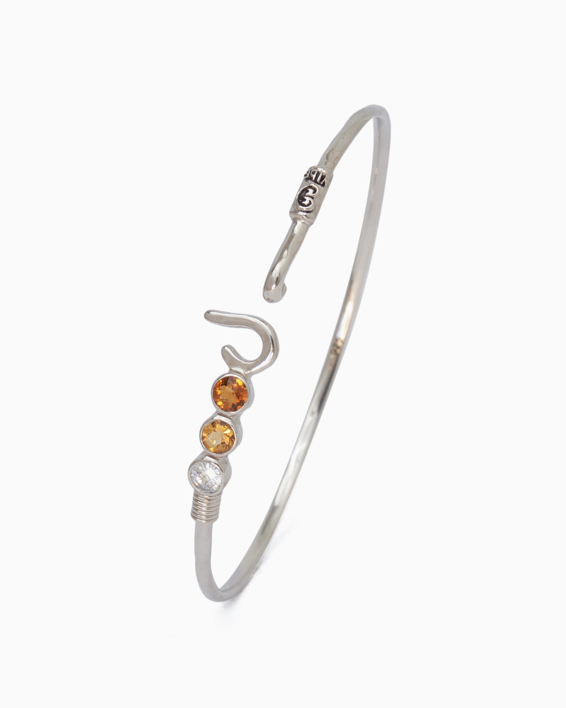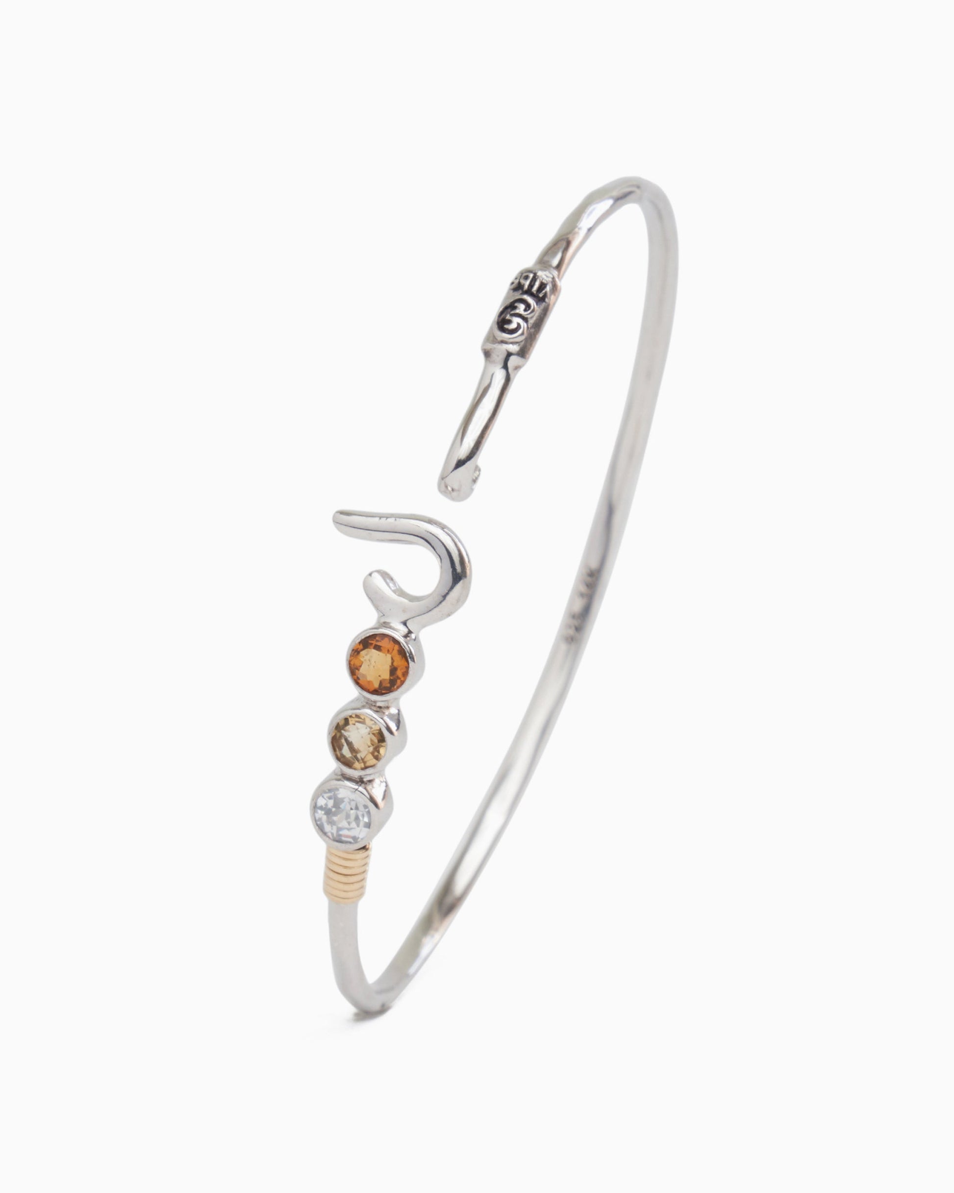 A Vibe signature, the St. John Hook Bracelet with Triple Stones is fashioned in gently hammered sterling silver with three faceted stones and a "J" hook clasp to honor the island of St. John. Each stone is a tribute to one of the three iconic U.S. Virgin Islands: St. John, St. Thomas, and St. Croix. Featuring a replica of the St. John petroglyph and seven good luck wraps, solo or stacked, it is sure to be a favorite piece. Found in many of our designs, Vibe’s seven good luck wraps represent love, laughter, happiness, good fortune, health, unity, and peace. In the Caribbean tradition, wear your hook facing in to keep love close to your heart, and facing out if you are open to a new love in your life. Wear this piece on its own or stack it with other bracelets for a layered look.