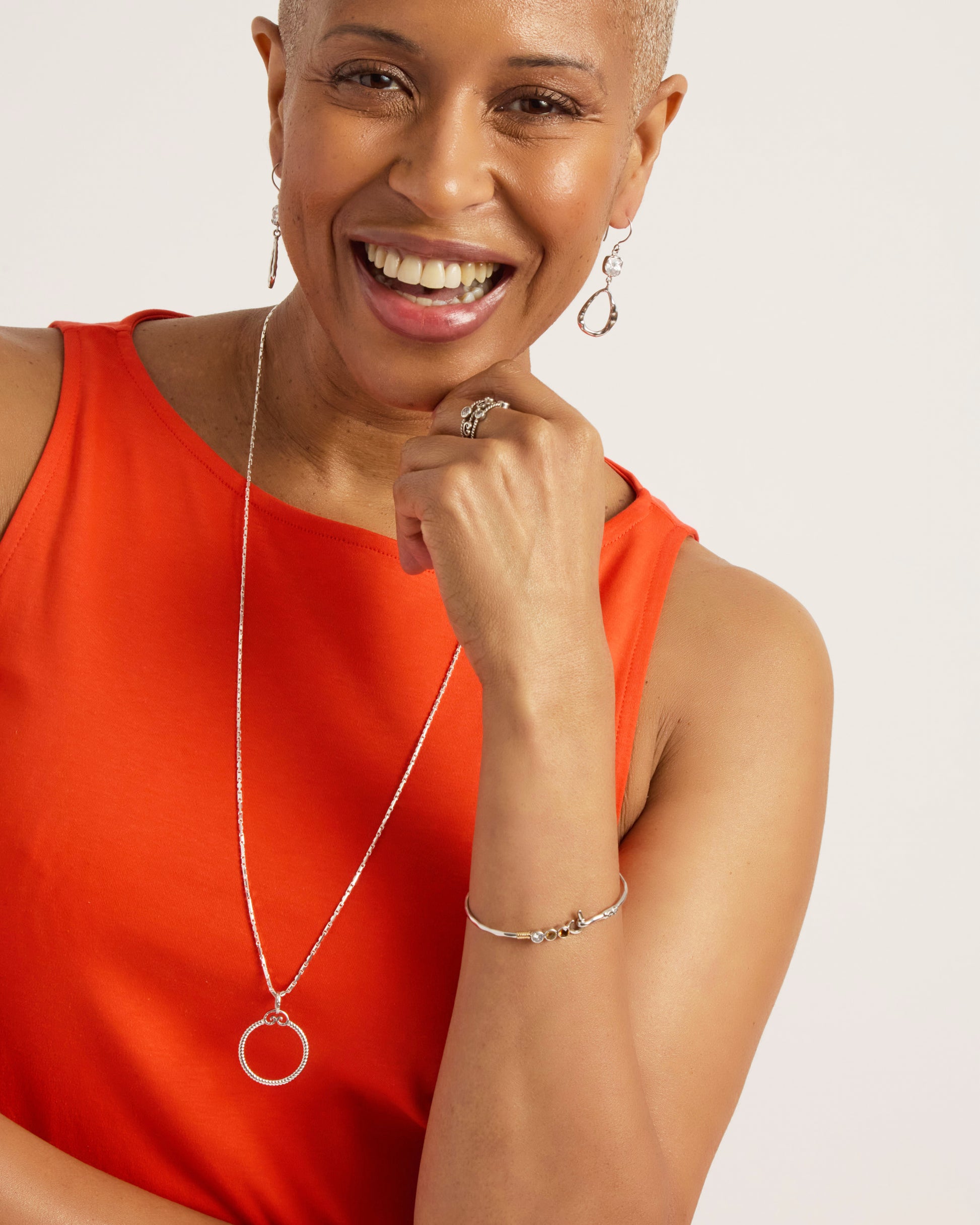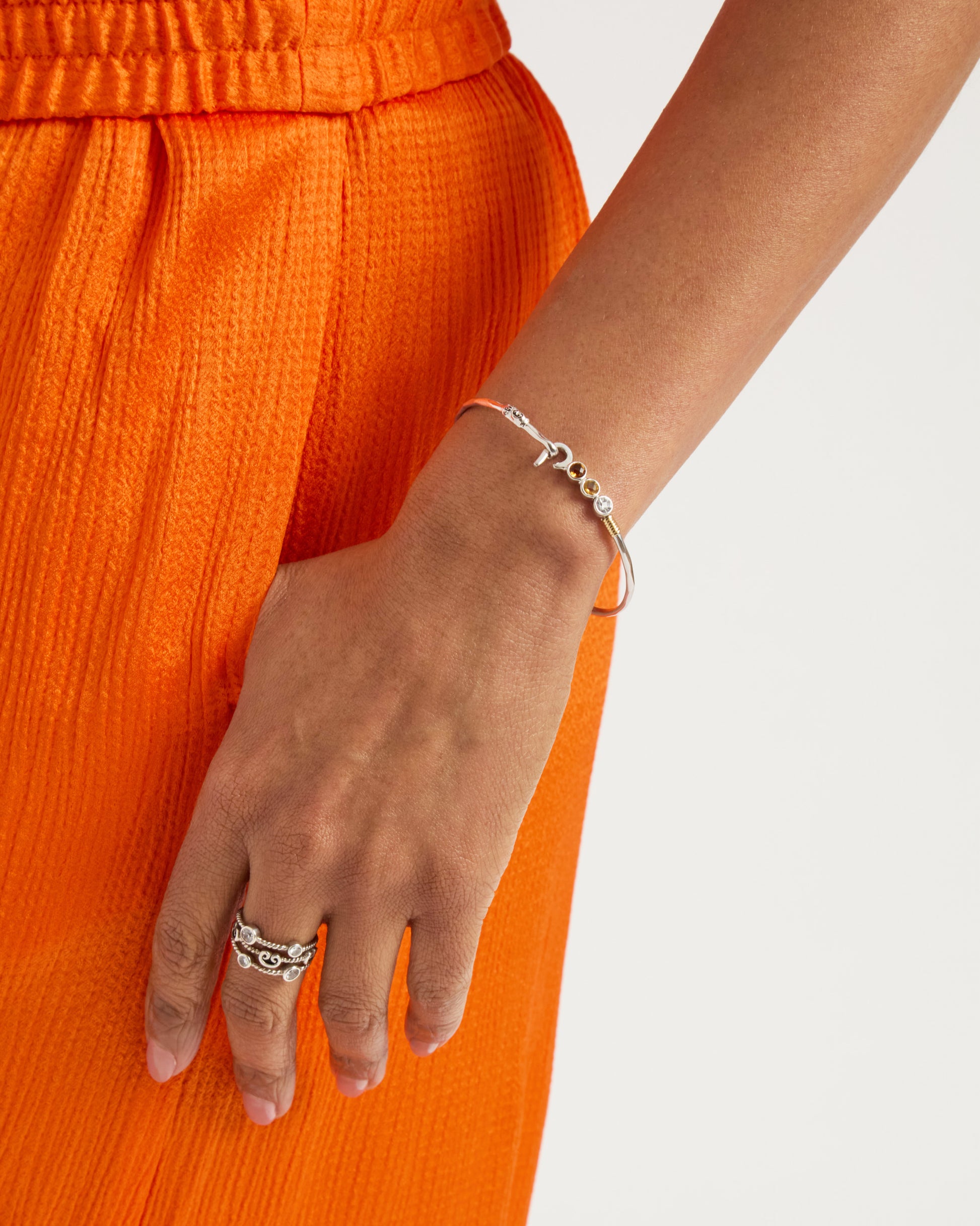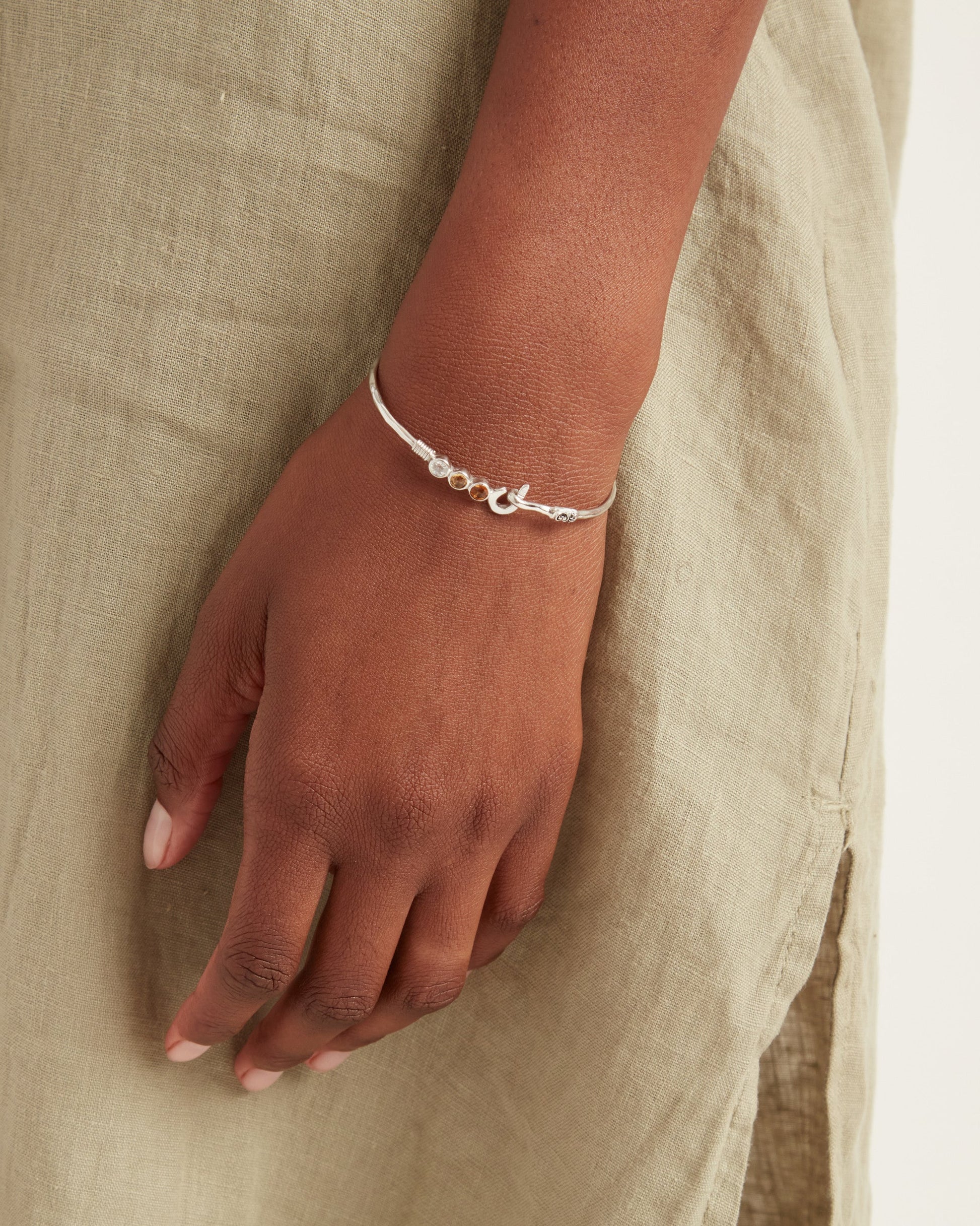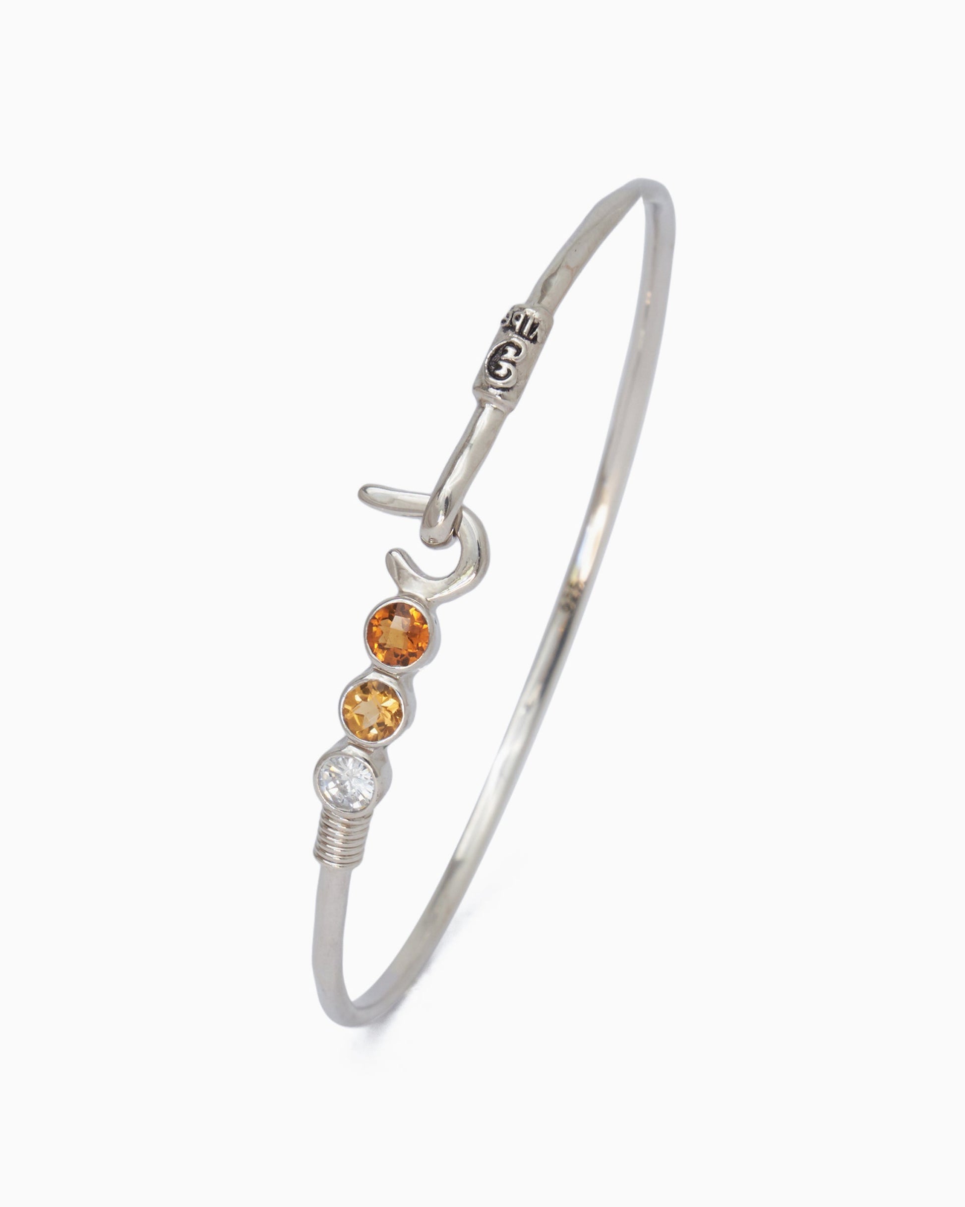 A Vibe signature, the St. John Hook Bracelet with Triple Stones is fashioned in gently hammered sterling silver with three faceted stones and a "J" hook clasp to honor the island of St. John. Each stone is a tribute to one of the three iconic U.S. Virgin Islands: St. John, St. Thomas, and St. Croix. Featuring a replica of the St. John petroglyph and seven good luck wraps, solo or stacked, it is sure to be a favorite piece. Found in many of our designs, Vibe’s seven good luck wraps represent love, laughter, happiness, good fortune, health, unity, and peace. In the Caribbean tradition, wear your hook facing in to keep love close to your heart, and facing out if you are open to a new love in your life. Wear this piece on its own or stack it with other bracelets for a layered look.