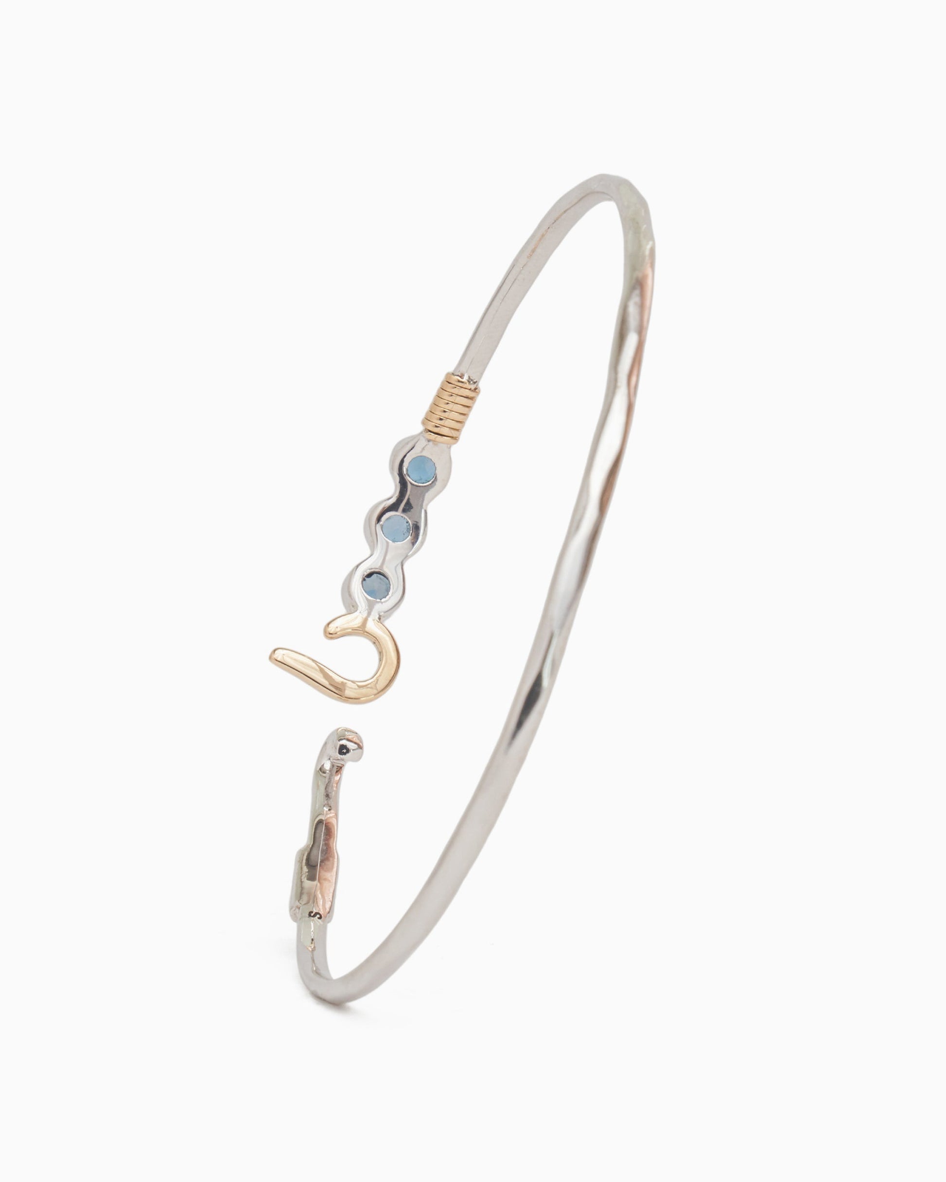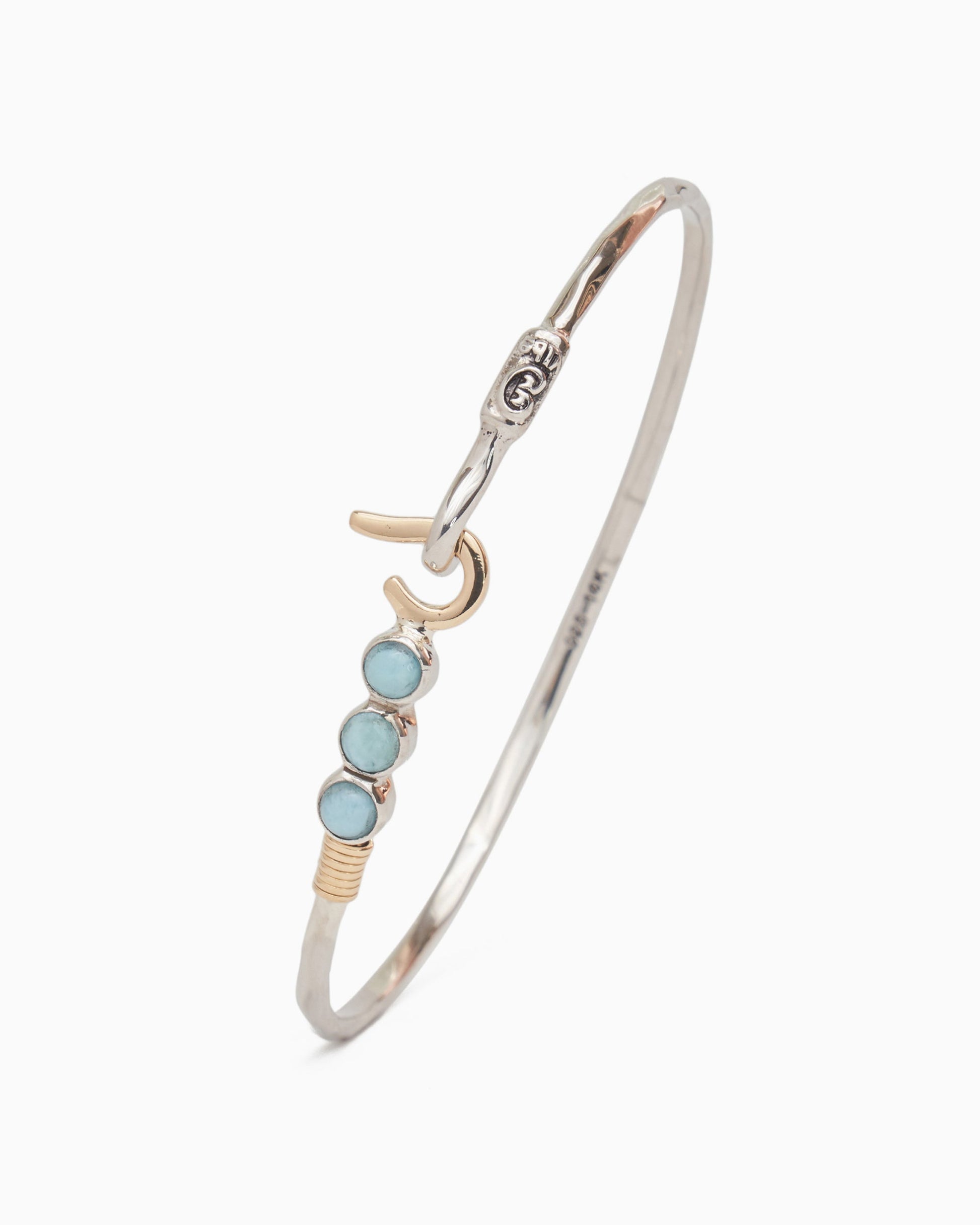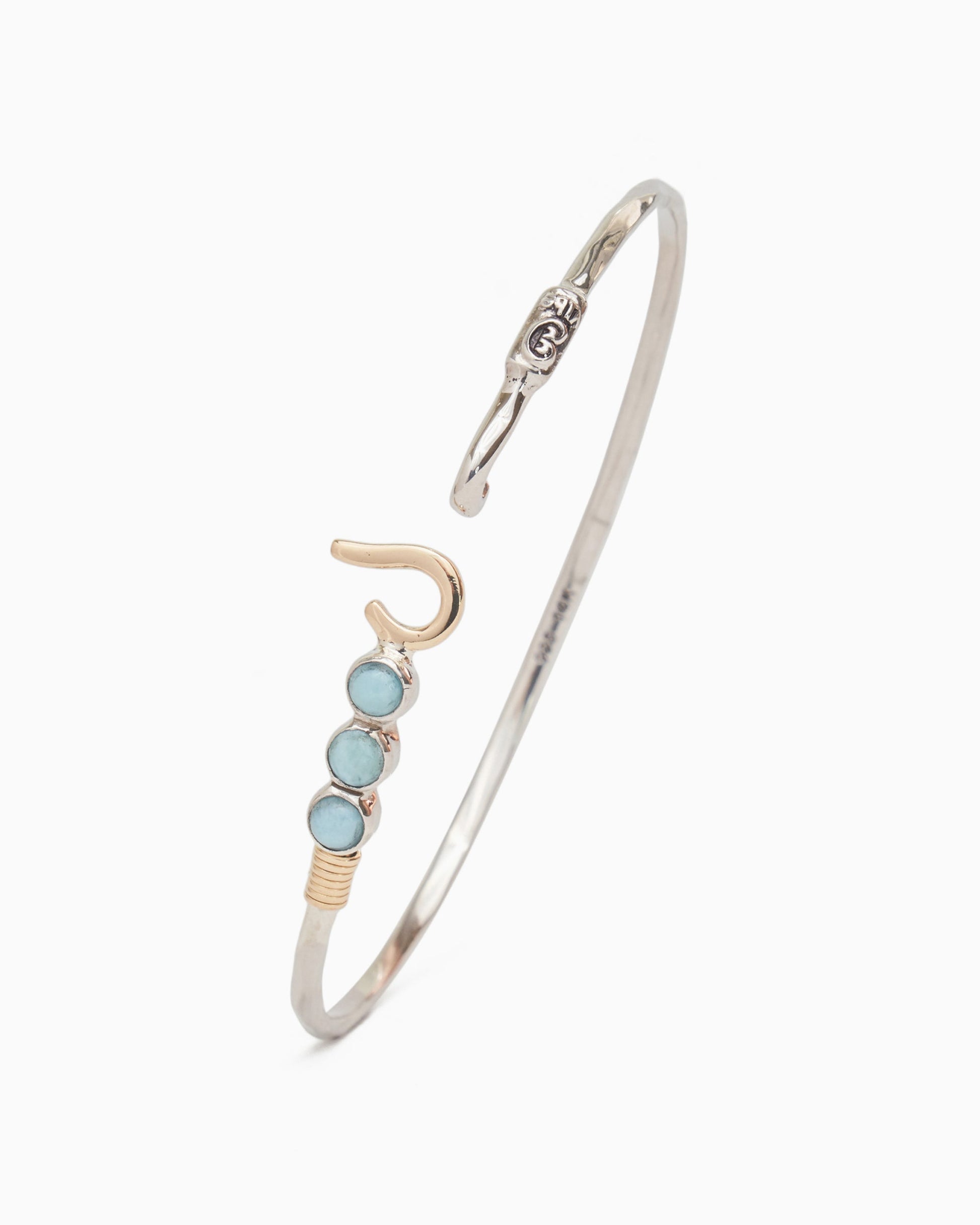 A Vibe signature, the St. John Hook Bracelet with Triple Stones is fashioned in gently hammered sterling silver with three larimar cabochons and a 14K gold "J" hook clasp to honor the island of St. John. Each stone is a tribute to one of the three iconic U.S. Virgin Islands: St. John, St. Thomas, and St. Croix. Featuring a replica of the St. John petroglyph and seven 14K gold good luck wraps, solo or stacked, it is sure to be a favorite piece. Found in many of our designs, Vibe’s seven good luck wraps represent love, laughter, happiness, good fortune, health, unity, and peace. In the Caribbean tradition, wear your hook facing in to keep love close to your heart, and facing out if you are open to a new love in your life. Wear this piece on its own or stack it with other bracelets for a layered look.