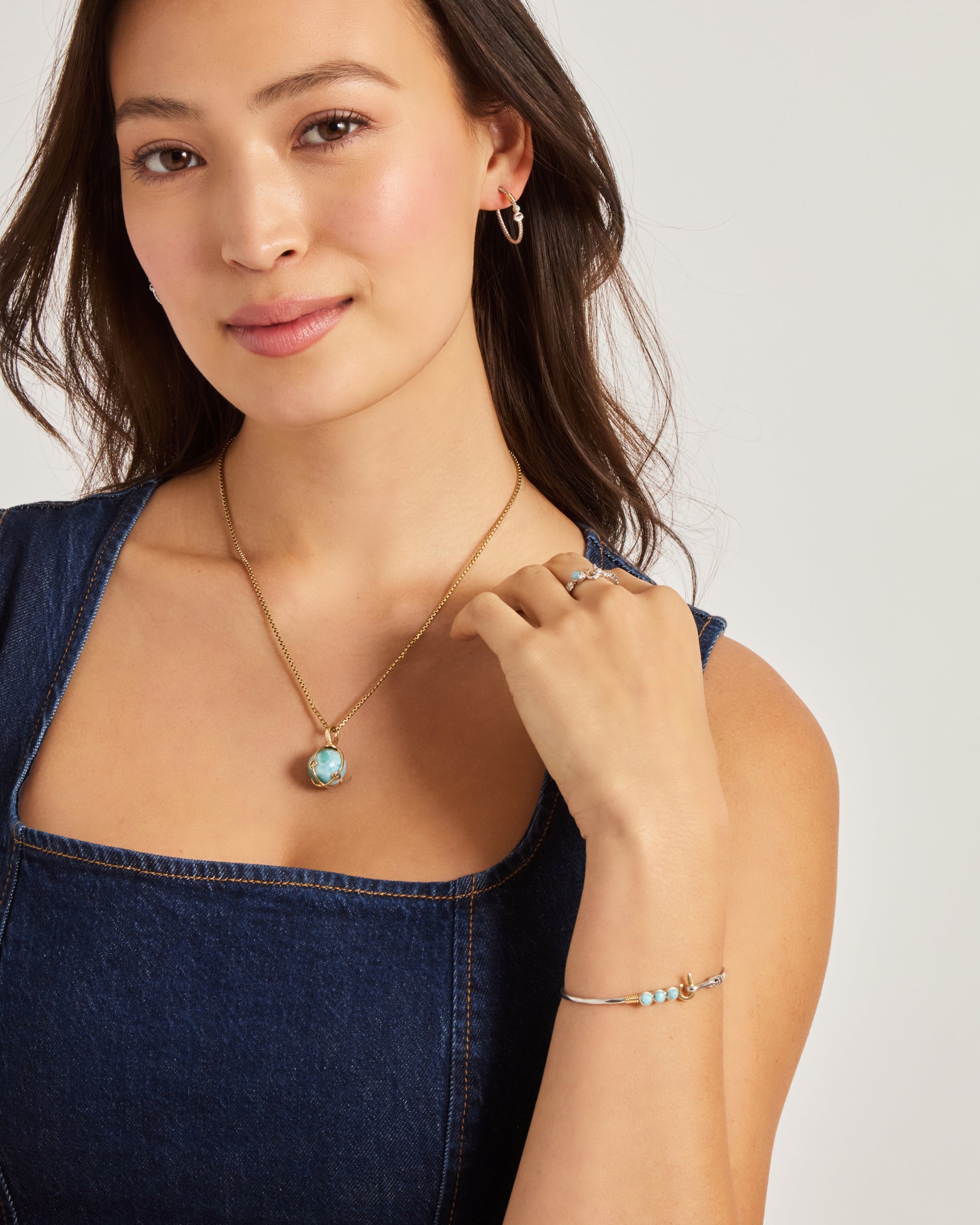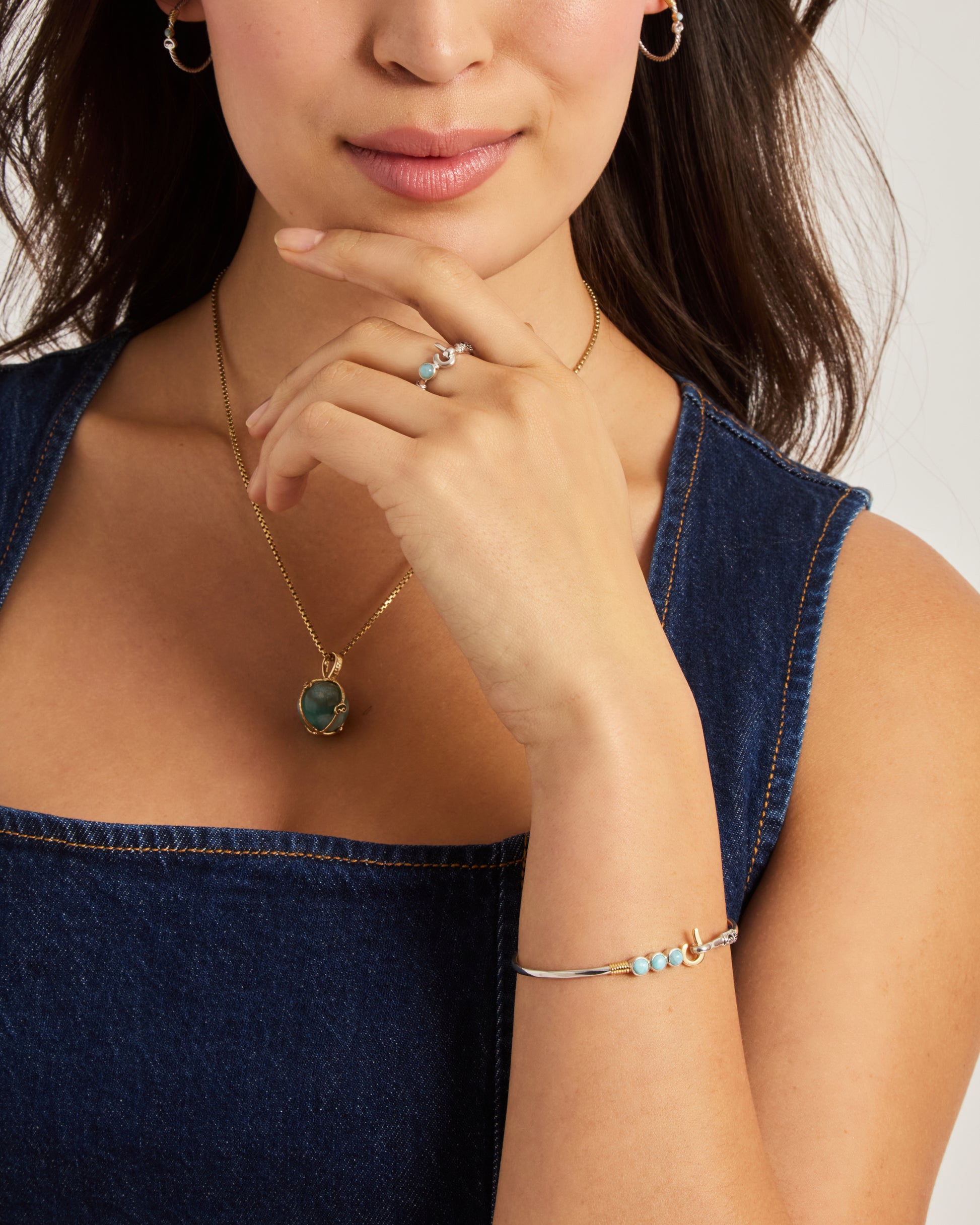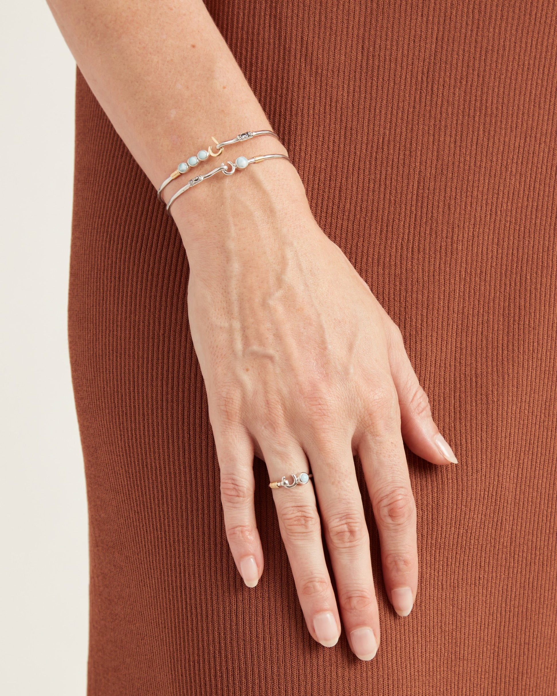 A Vibe signature, the St. John Hook Bracelet with Triple Stones is fashioned in gently hammered sterling silver with three larimar cabochons and a 14K gold "J" hook clasp to honor the island of St. John. Each stone is a tribute to one of the three iconic U.S. Virgin Islands: St. John, St. Thomas, and St. Croix. Featuring a replica of the St. John petroglyph and seven 14K gold good luck wraps, solo or stacked, it is sure to be a favorite piece. Found in many of our designs, Vibe’s seven good luck wraps represent love, laughter, happiness, good fortune, health, unity, and peace. In the Caribbean tradition, wear your hook facing in to keep love close to your heart, and facing out if you are open to a new love in your life. Wear this piece on its own or stack it with other bracelets for a layered look.