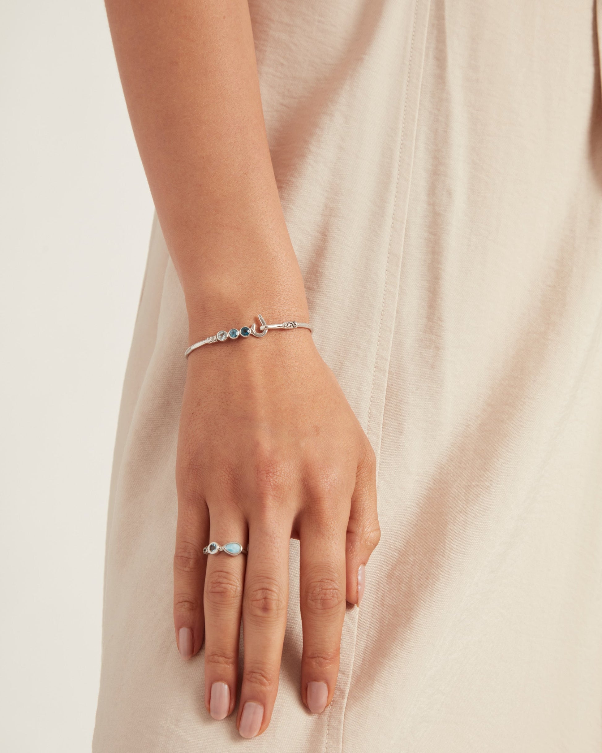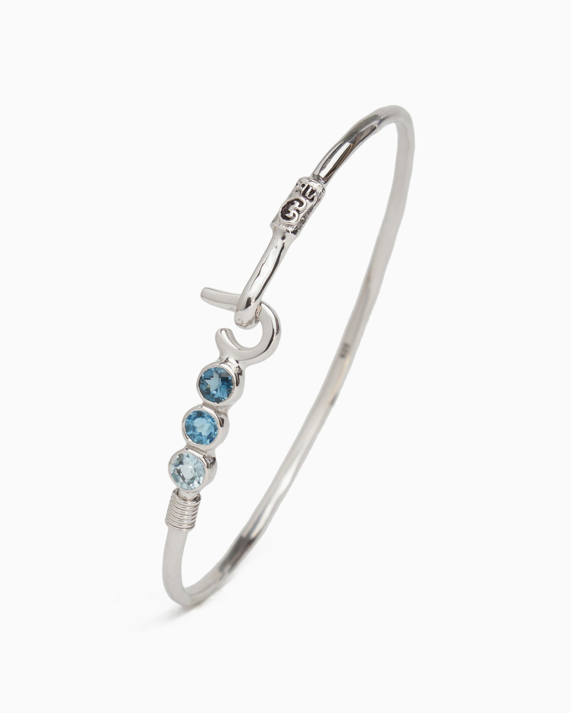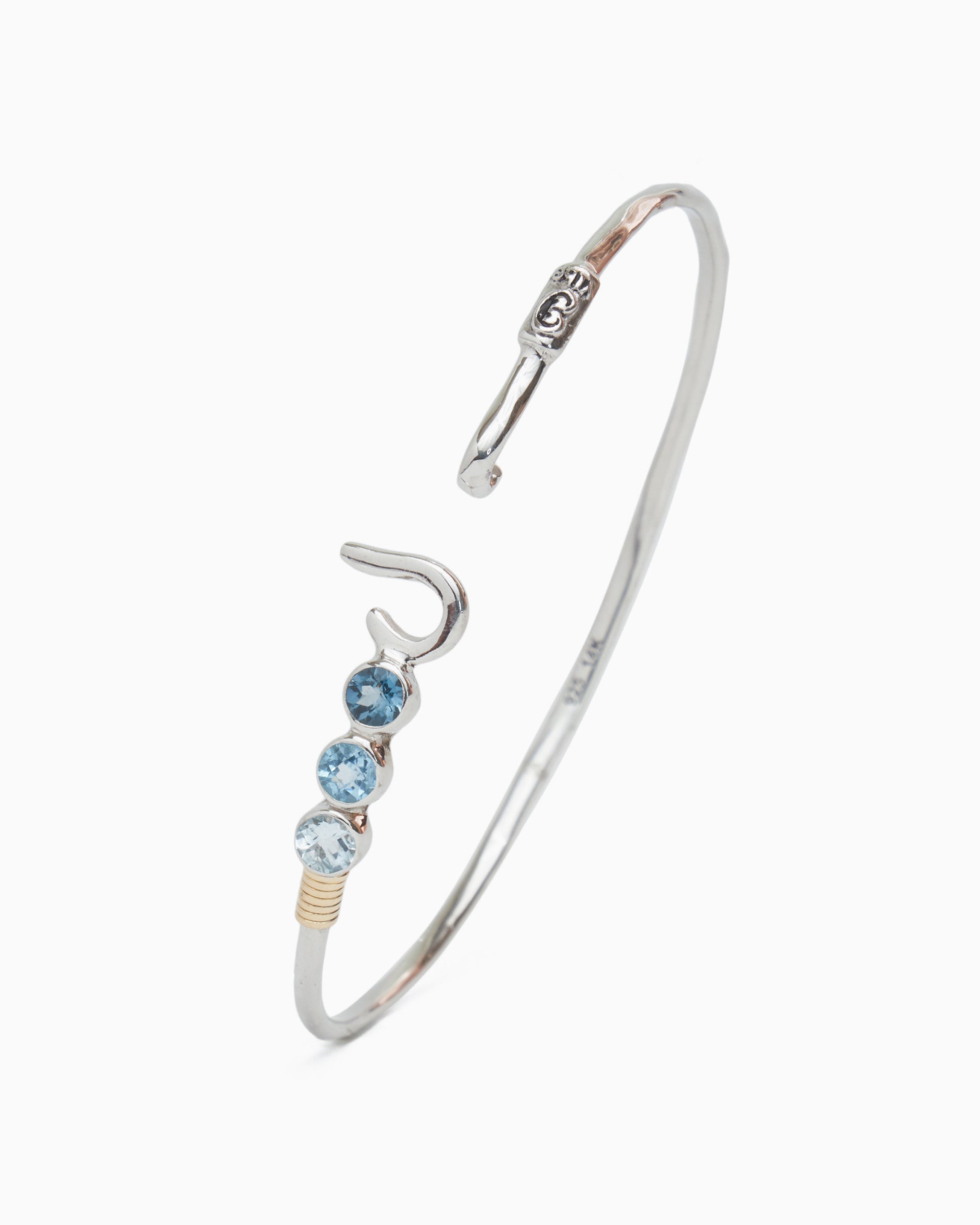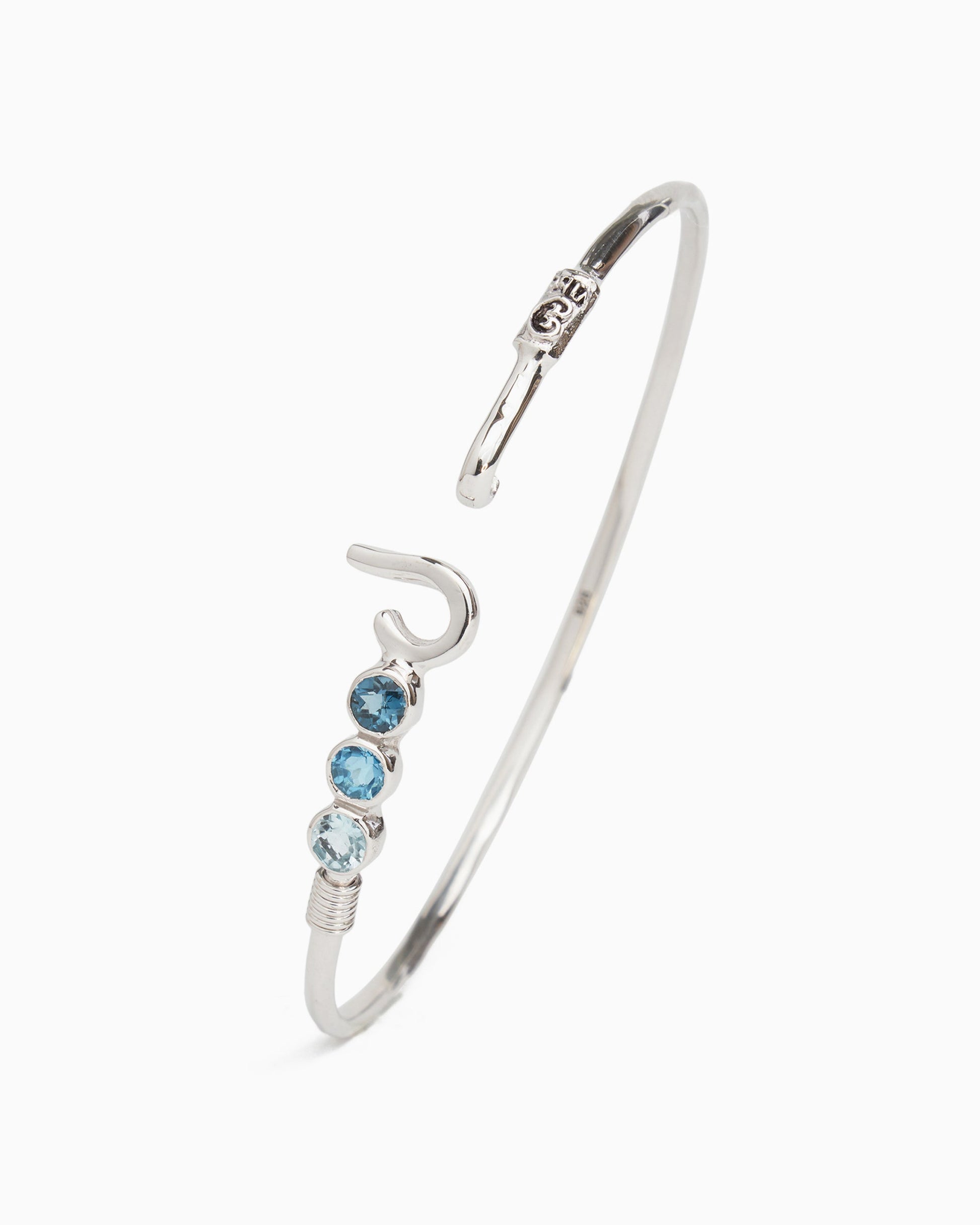 A Vibe signature, the St. John Hook Bracelet with Triple Stones is fashioned in gently hammered sterling silver with three faceted stones and a "J" hook clasp to honor the island of St. John. Each stone is a tribute to one of the three iconic U.S. Virgin Islands: St. John, St. Thomas, and St. Croix. Featuring a replica of the St. John petroglyph and seven good luck wraps, solo or stacked, it is sure to be a favorite piece. Found in many of our designs, Vibe’s seven good luck wraps represent love, laughter, happiness, good fortune, health, unity, and peace. In the Caribbean tradition, wear your hook facing in to keep love close to your heart, and facing out if you are open to a new love in your life. Wear this piece on its own or stack it with other bracelets for a layered look.