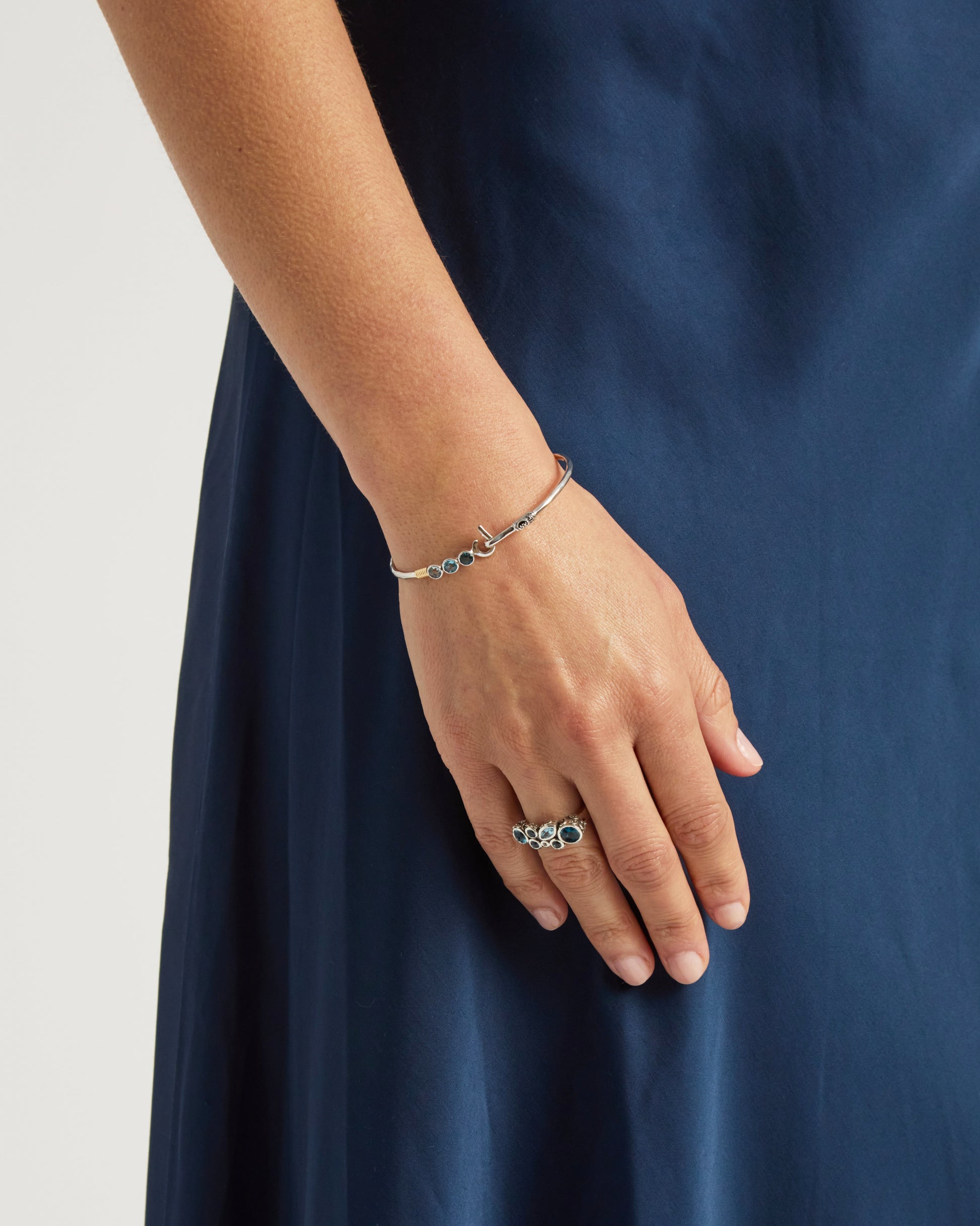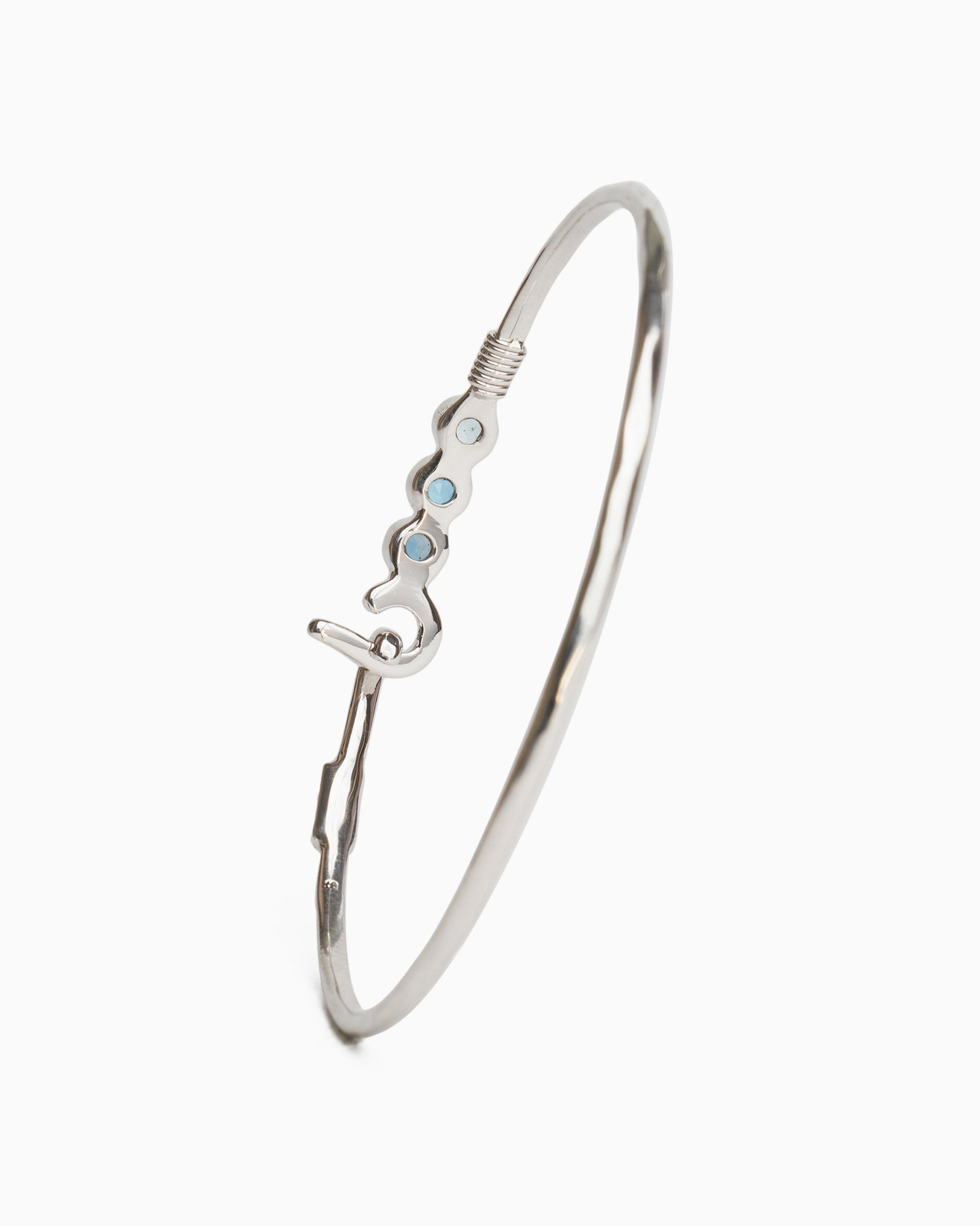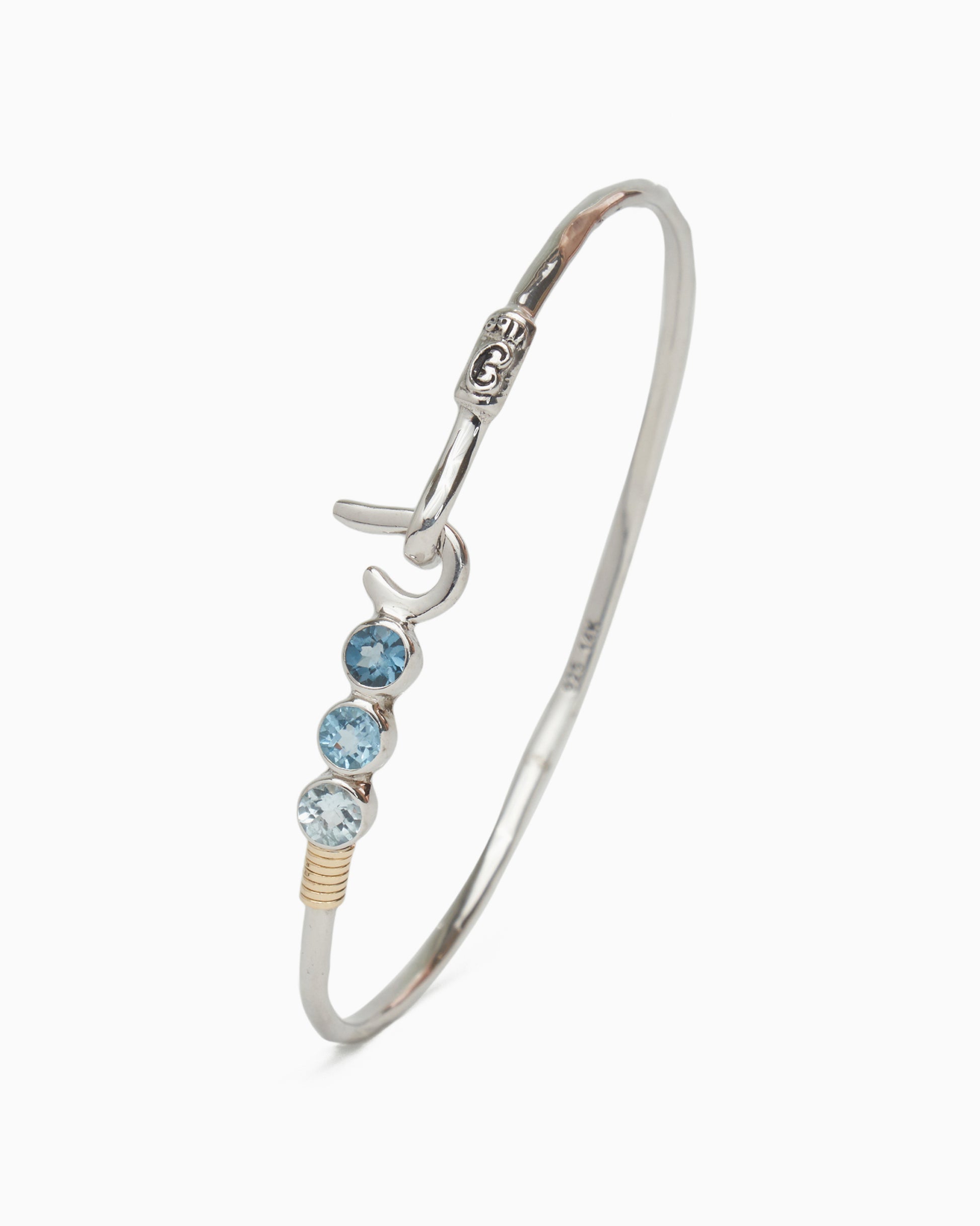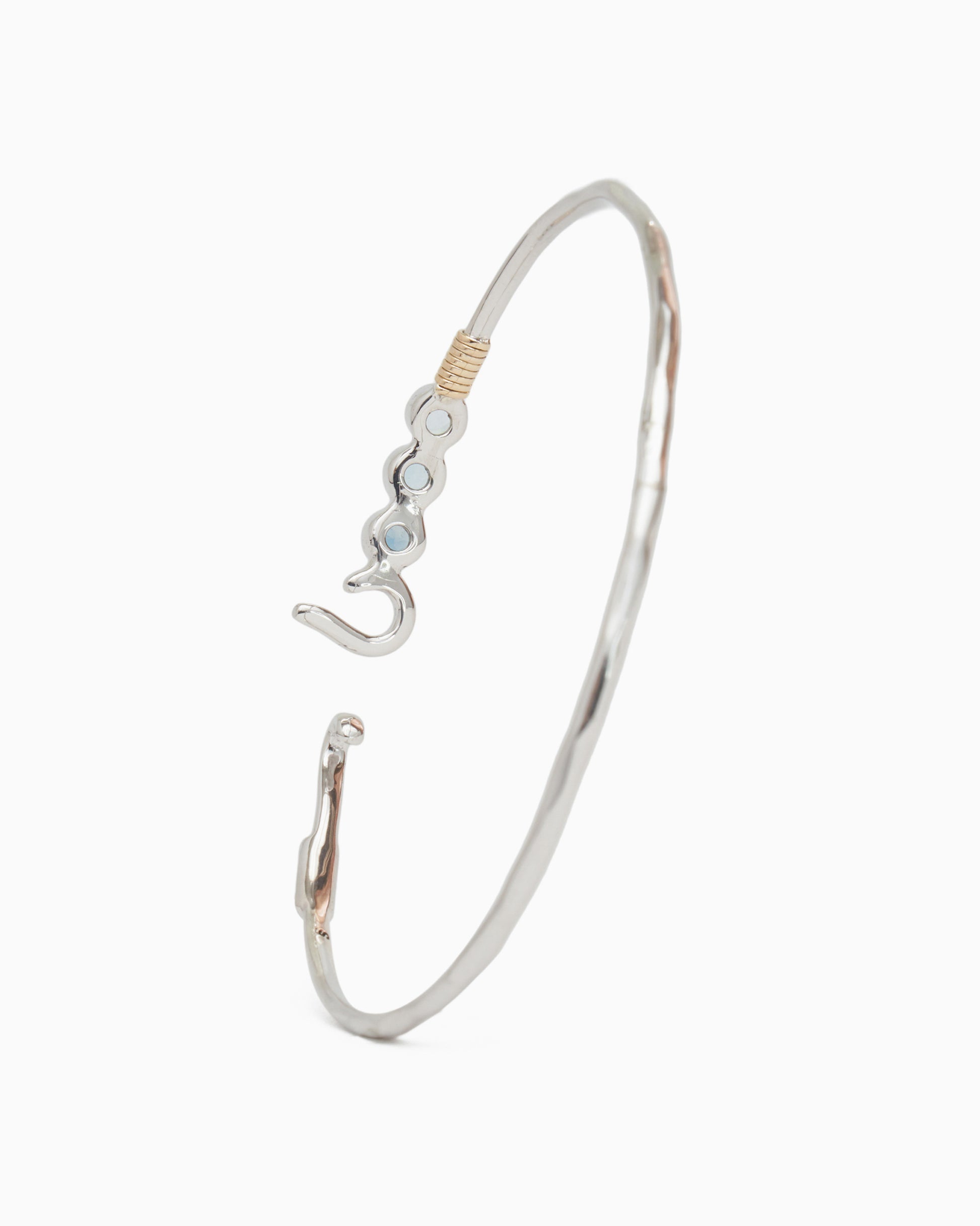 A Vibe signature, the St. John Hook Bracelet with Triple Stones is fashioned in gently hammered sterling silver with three faceted stones and a "J" hook clasp to honor the island of St. John. Each stone is a tribute to one of the three iconic U.S. Virgin Islands: St. John, St. Thomas, and St. Croix. Featuring a replica of the St. John petroglyph and seven good luck wraps, solo or stacked, it is sure to be a favorite piece. Found in many of our designs, Vibe’s seven good luck wraps represent love, laughter, happiness, good fortune, health, unity, and peace. In the Caribbean tradition, wear your hook facing in to keep love close to your heart, and facing out if you are open to a new love in your life. Wear this piece on its own or stack it with other bracelets for a layered look.