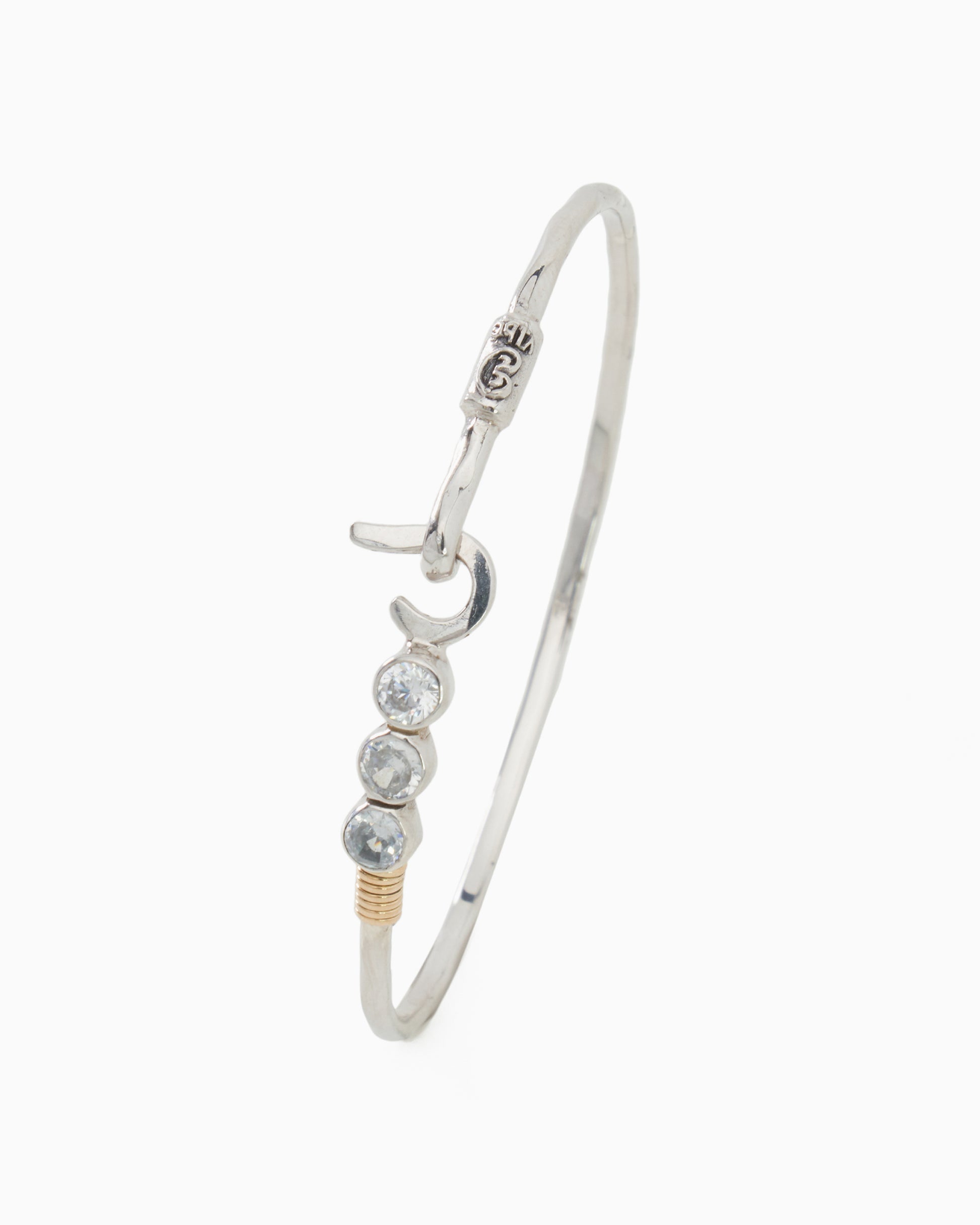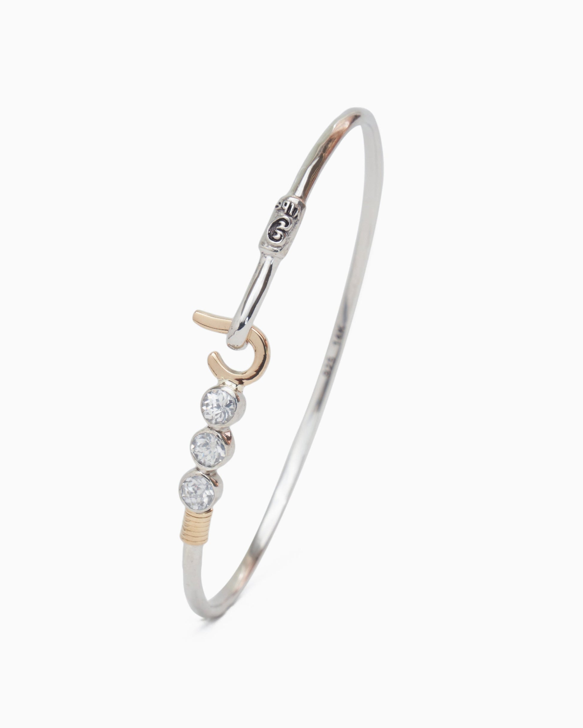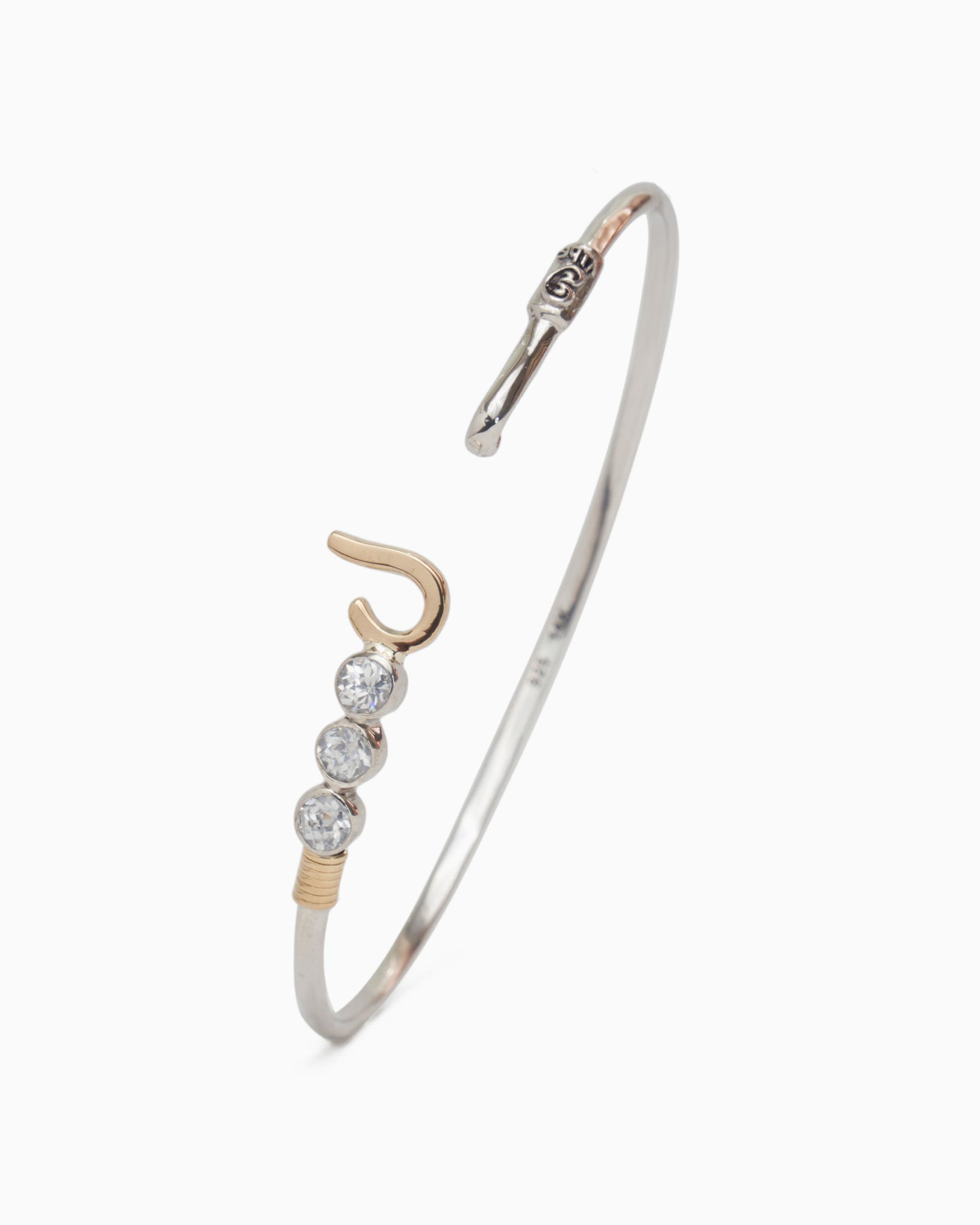 A Vibe signature, the St. John Hook Bracelet with Triple Stones is fashioned in gently hammered sterling silver with three faceted white zircon stones and a 14K gold "J" hook clasp to honor the island of St. John. Each stone is a tribute to one of the three iconic U.S. Virgin Islands: St. John, St. Thomas, and St. Croix. Featuring a replica of the St. John petroglyph and seven 14K gold good luck wraps, solo or stacked, it is sure to be a favorite piece. Found in many of our designs, Vibe’s seven good luck wraps represent love, laughter, happiness, good fortune, health, unity, and peace. In the Caribbean tradition, wear your hook facing in to keep love close to your heart, and facing out if you are open to a new love in your life. Wear this piece on its own or stack it with other bracelets for a layered look.