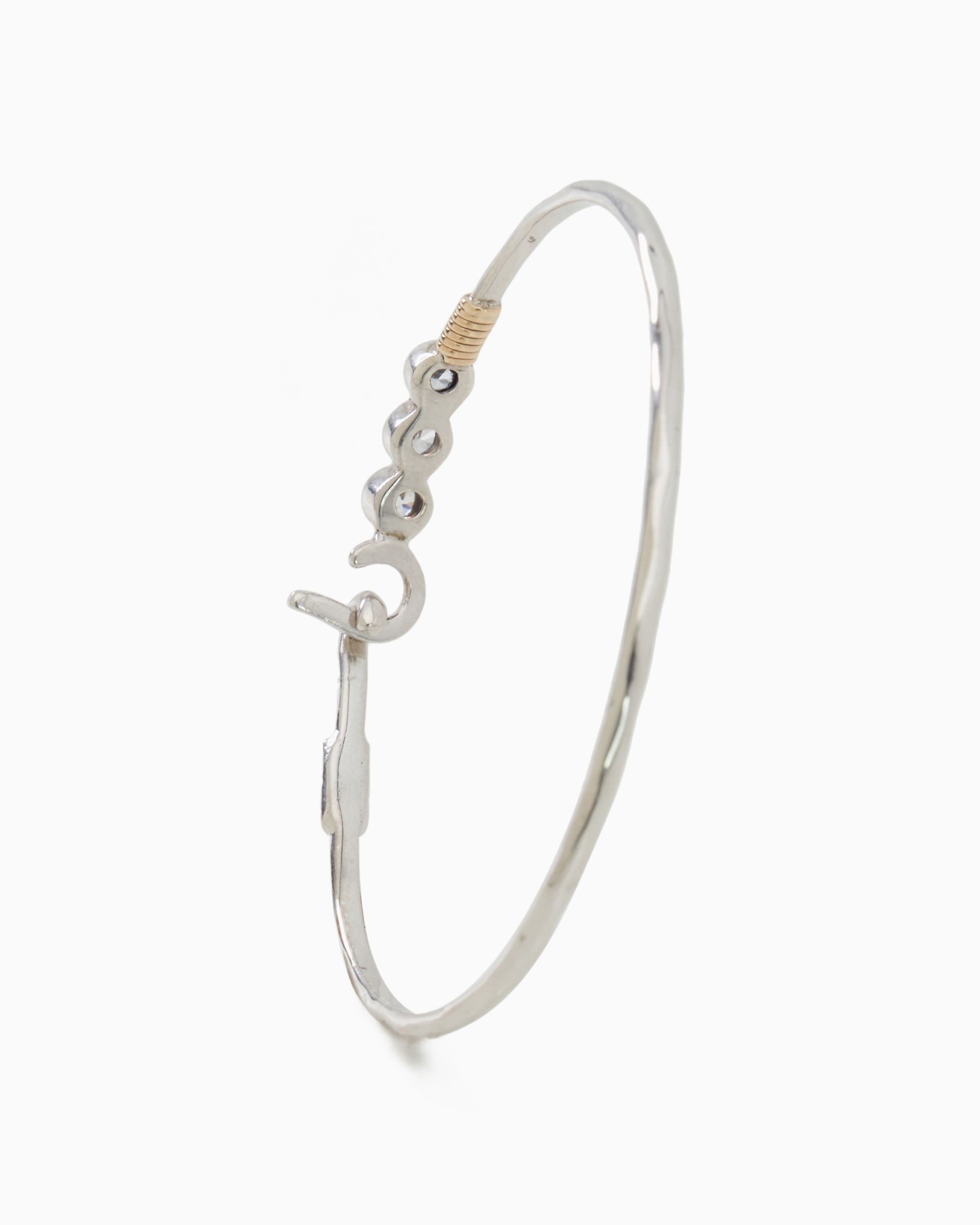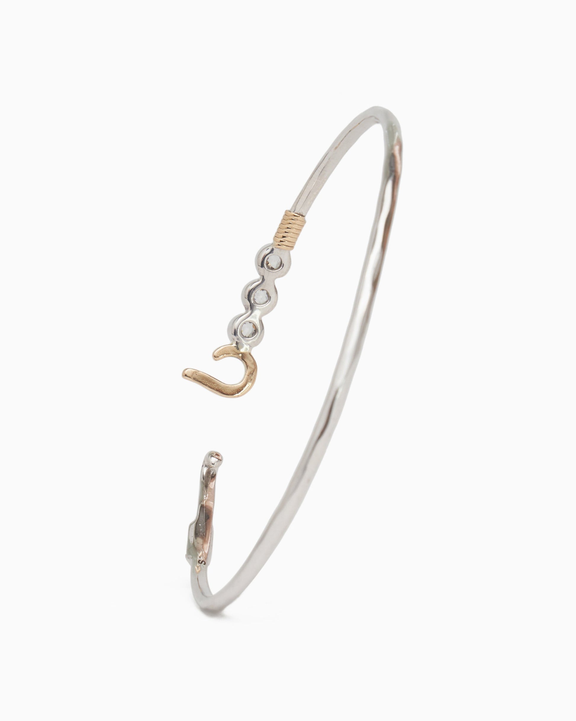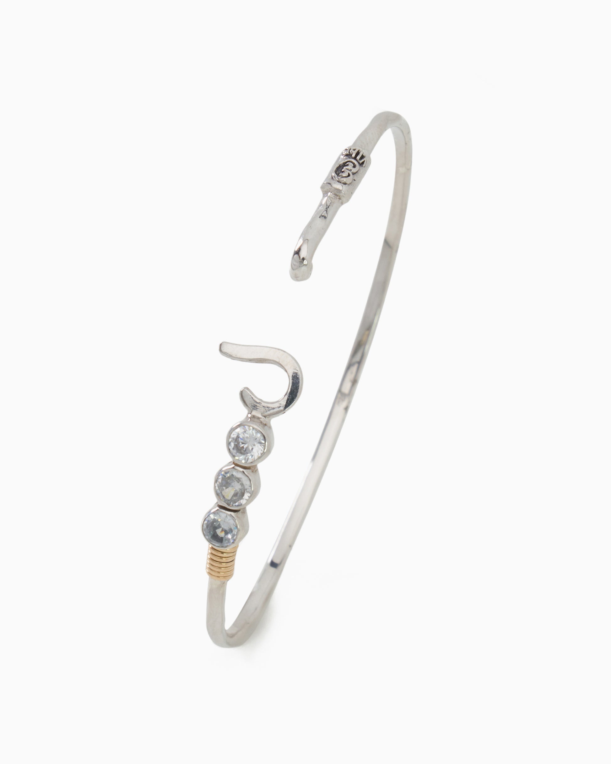 A Vibe signature, the St. John Hook Bracelet with Triple Stones is fashioned in gently hammered sterling silver with three faceted white zircon stones and a 14K gold "J" hook clasp to honor the island of St. John. Each stone is a tribute to one of the three iconic U.S. Virgin Islands: St. John, St. Thomas, and St. Croix. Featuring a replica of the St. John petroglyph and seven 14K gold good luck wraps, solo or stacked, it is sure to be a favorite piece. Found in many of our designs, Vibe’s seven good luck wraps represent love, laughter, happiness, good fortune, health, unity, and peace. In the Caribbean tradition, wear your hook facing in to keep love close to your heart, and facing out if you are open to a new love in your life. Wear this piece on its own or stack it with other bracelets for a layered look.