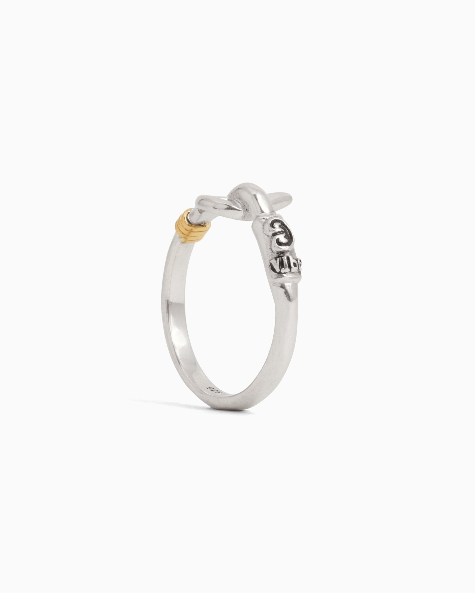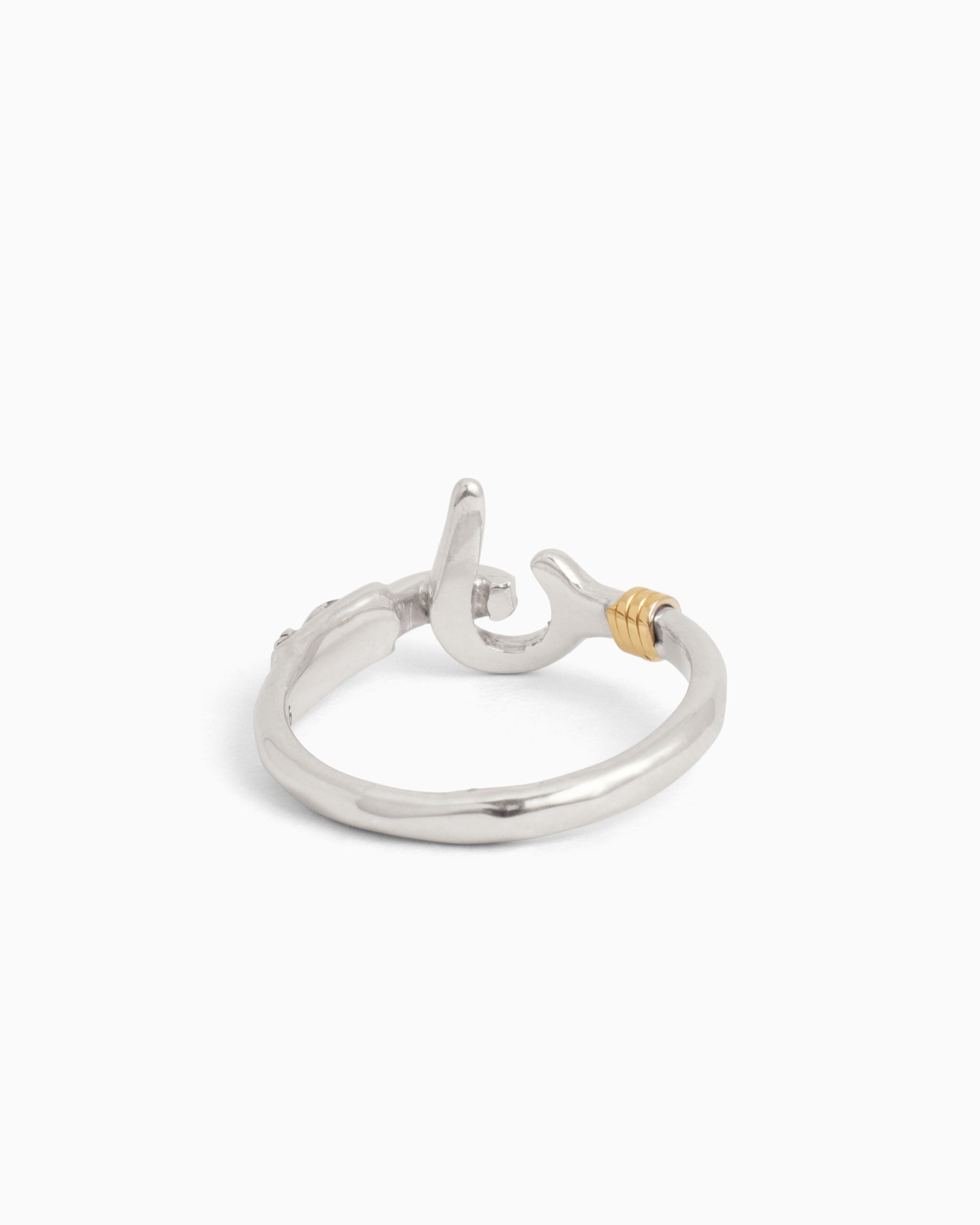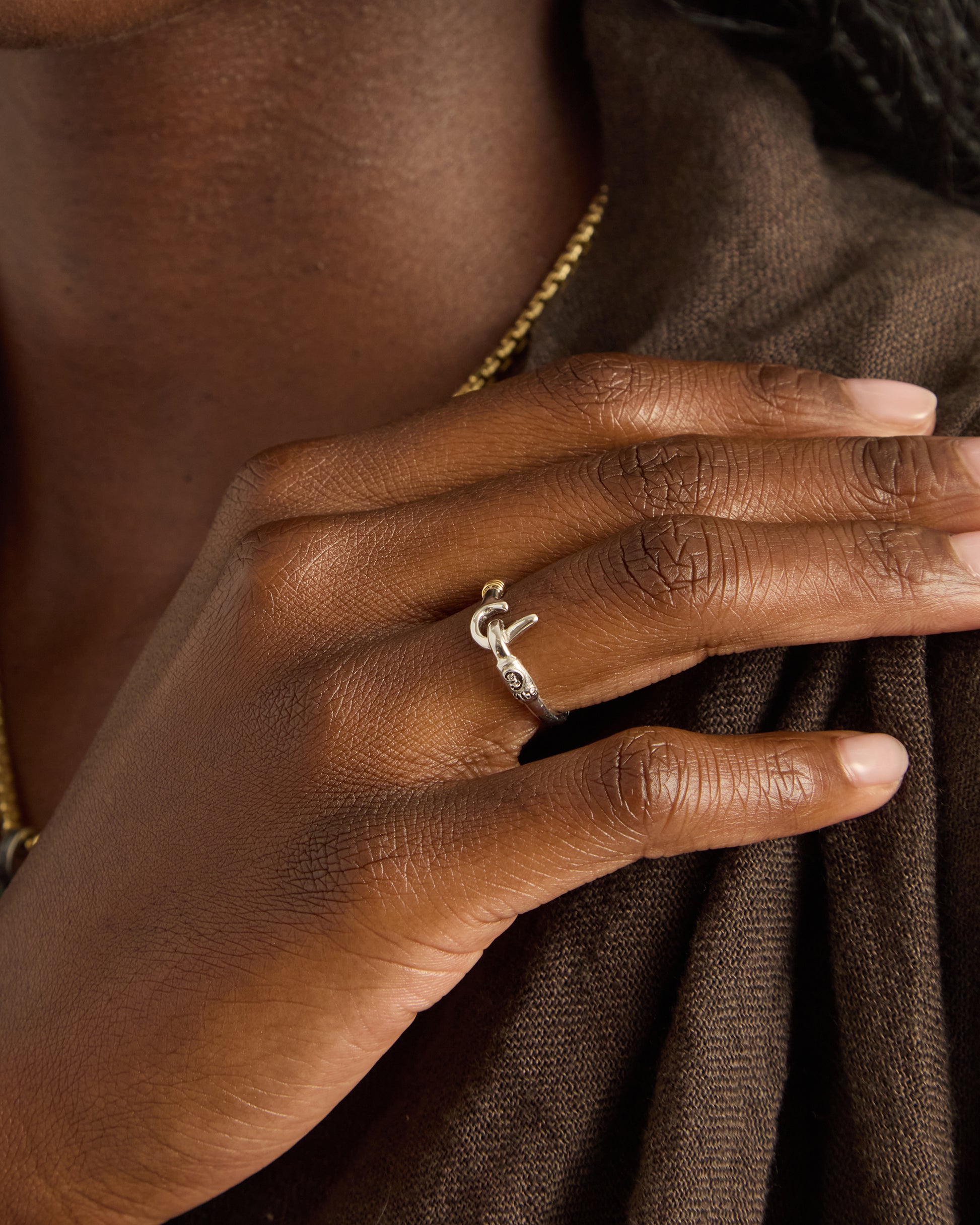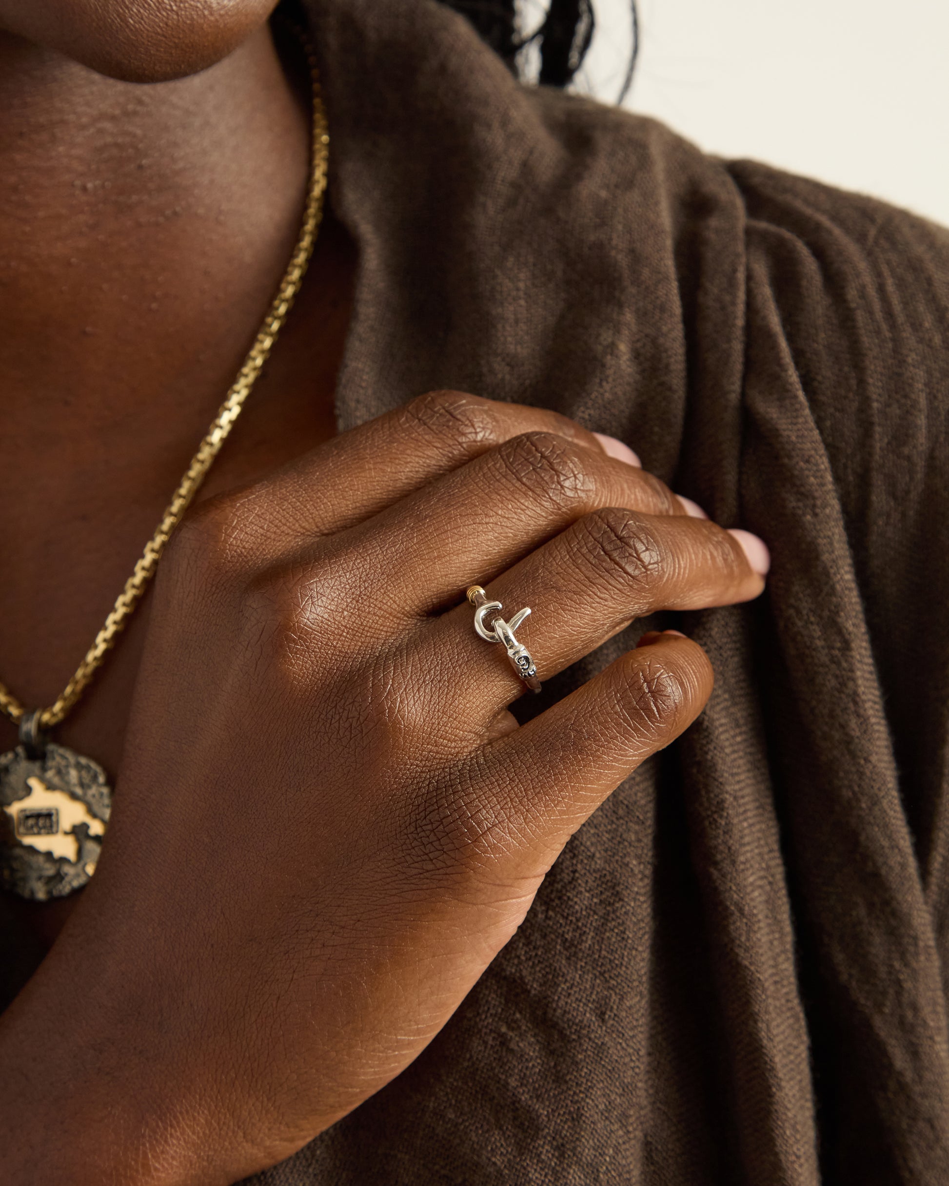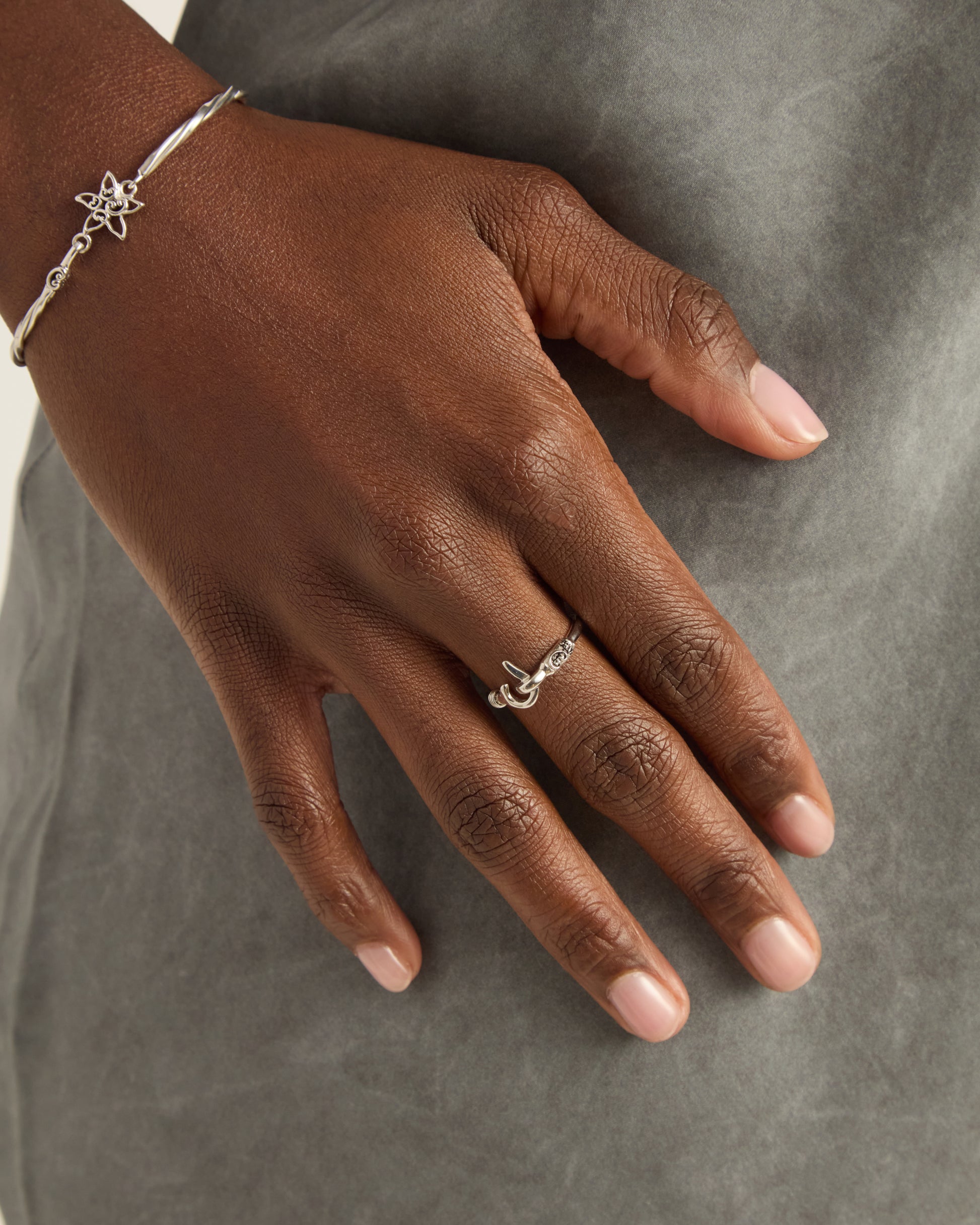 A Vibe signature, the St. John Hook Ring is handcrafted in gently hammered sterling silver and showcases a captivating larimar cabochon, a distinctive "J" hook, and a replica of the St. John petroglyph. Its three good luck wraps serve as positive affirmations to draw into your life, such as health, happiness, and prosperity. In Caribbean tradition, wear the hook inward to keep love close, or outward to attract new love.