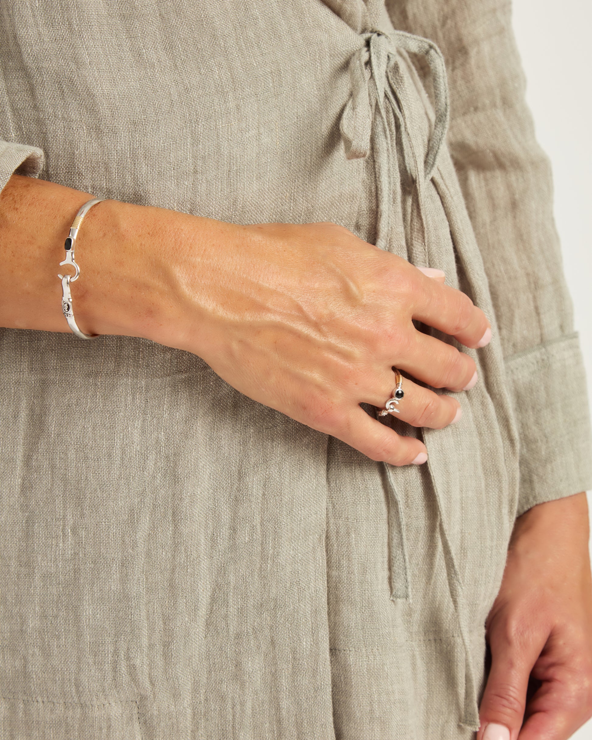 A Vibe signature, the St. John Hook Ring is fashioned in gently hammered sterling silver with a black onyx stone and a "J" hook. Featuring a replica of the St. John petroglyph, and seven 14K gold good luck wraps, it is sure to be a favorite piece. Found in many of our designs, Vibe’s seven good luck wraps represent love, laughter, happiness, good fortune, health, unity, and peace. In the Caribbean tradition, wear your hook facing in to keep love close to your heart, and facing out if you are open to a new love in your life.