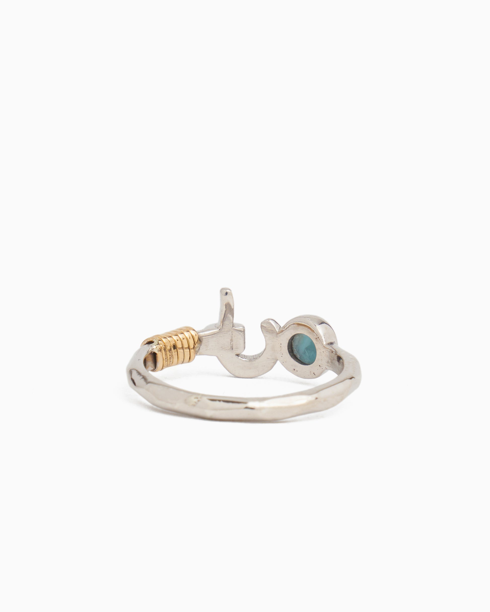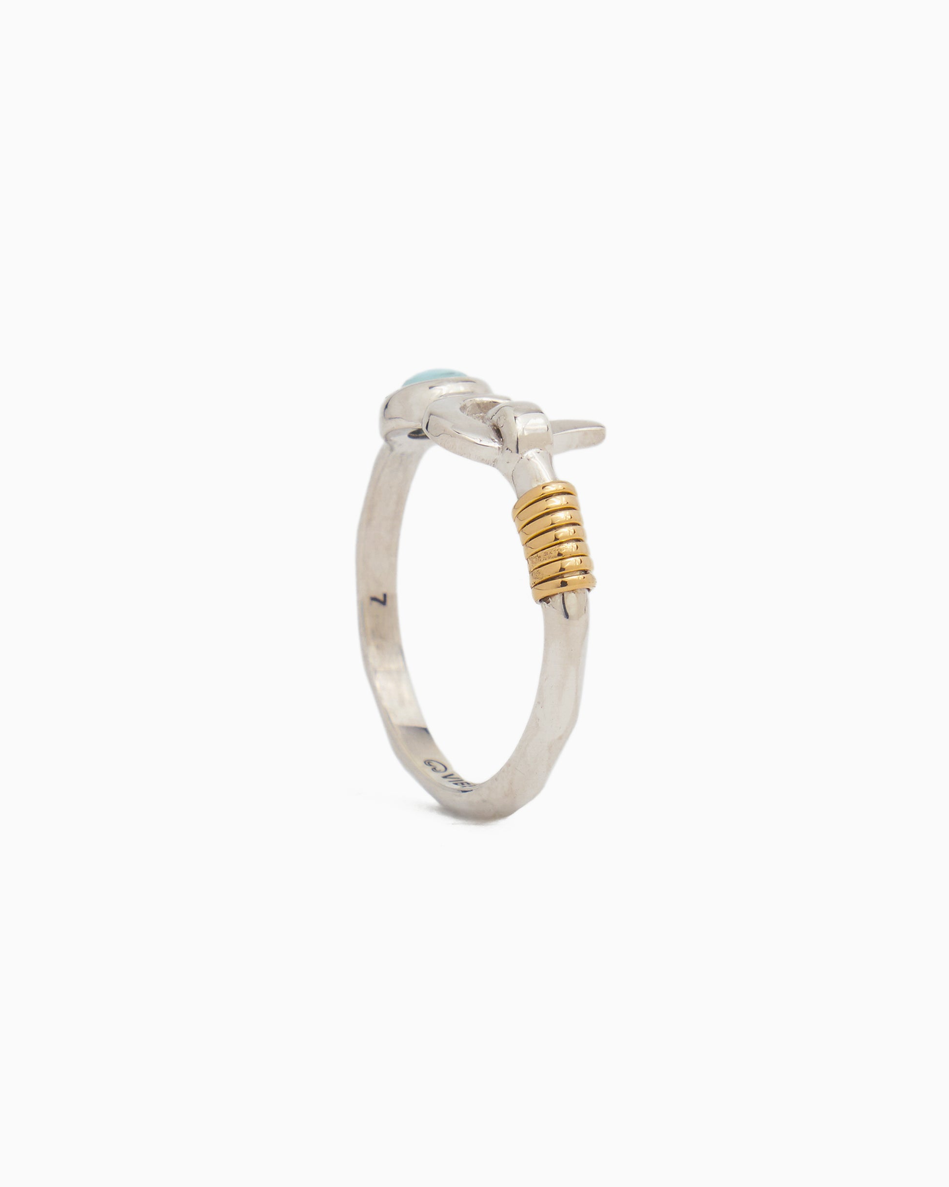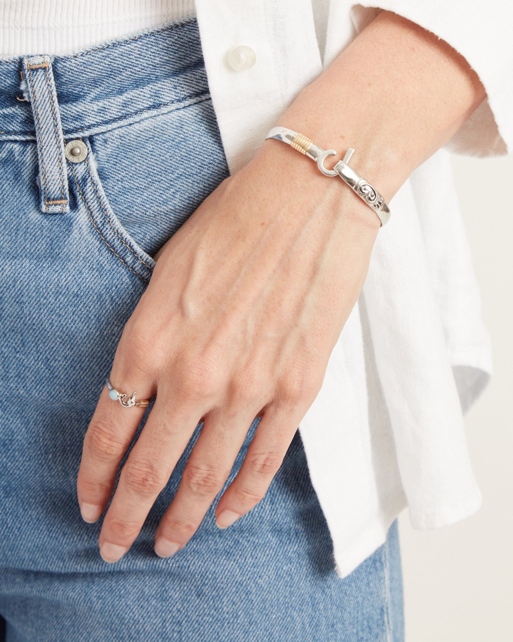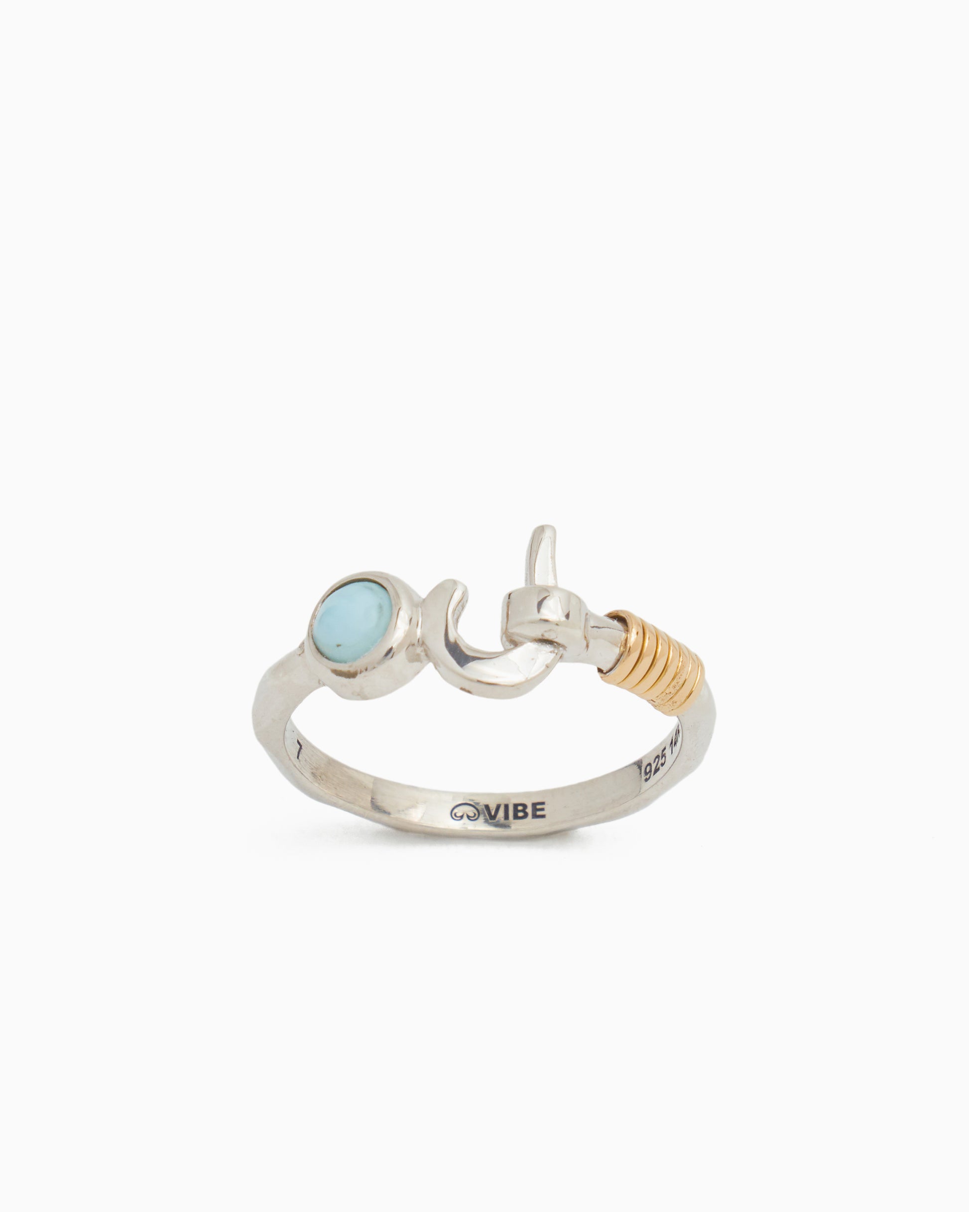 A Vibe signature, the St. John Hook Ring is fashioned in gently hammered sterling silver with a larimar cabochon and a "J" hook. Featuring a replica of the St. John petroglyph, and seven 14K gold good luck wraps, it is sure to be a favorite piece. Found in many of our designs, Vibe’s seven good luck wraps represent love, laughter, happiness, good fortune, health, unity, and peace. In the Caribbean tradition, wear your hook facing in to keep love close to your heart, and facing out if you are open to a new love in your life.
