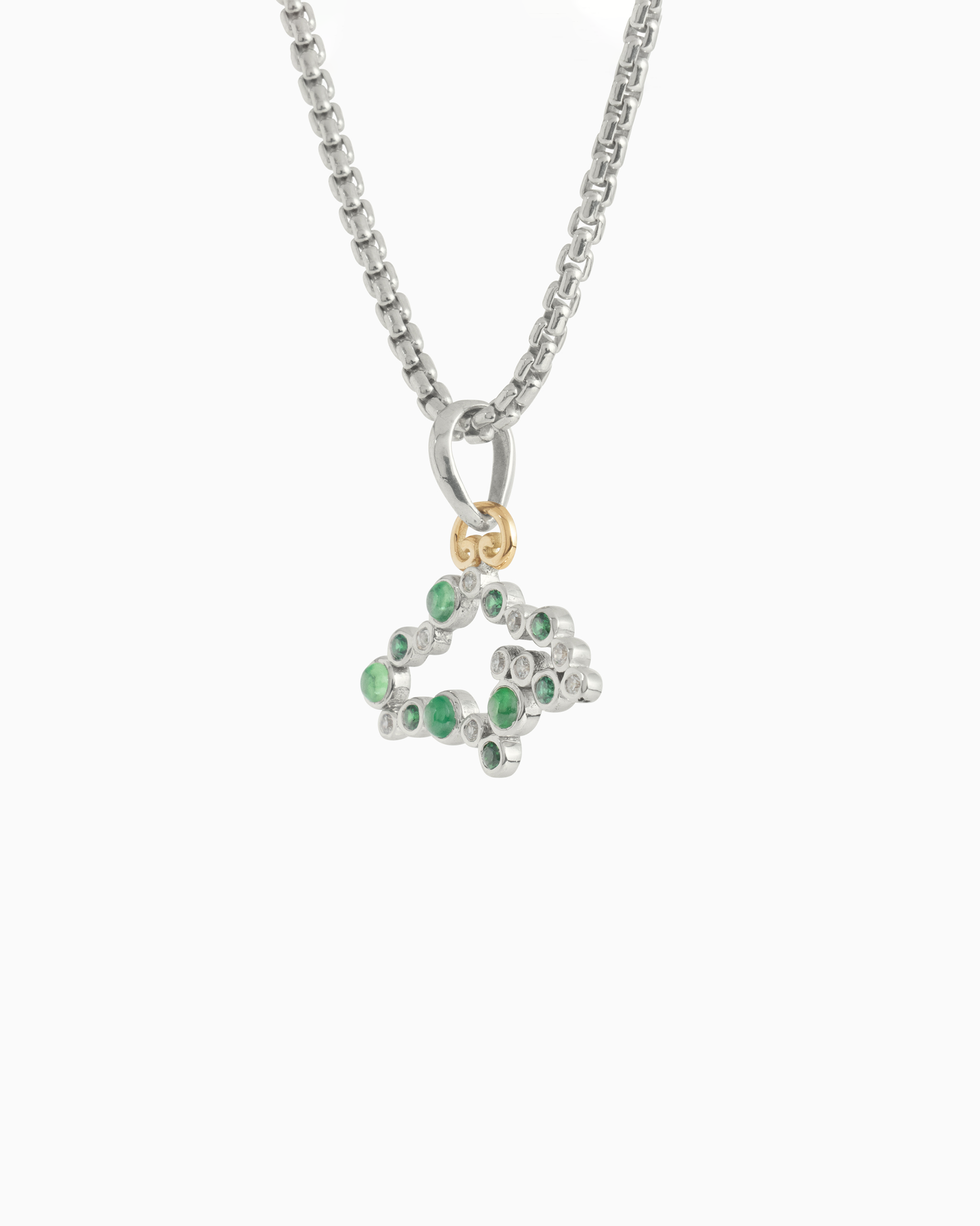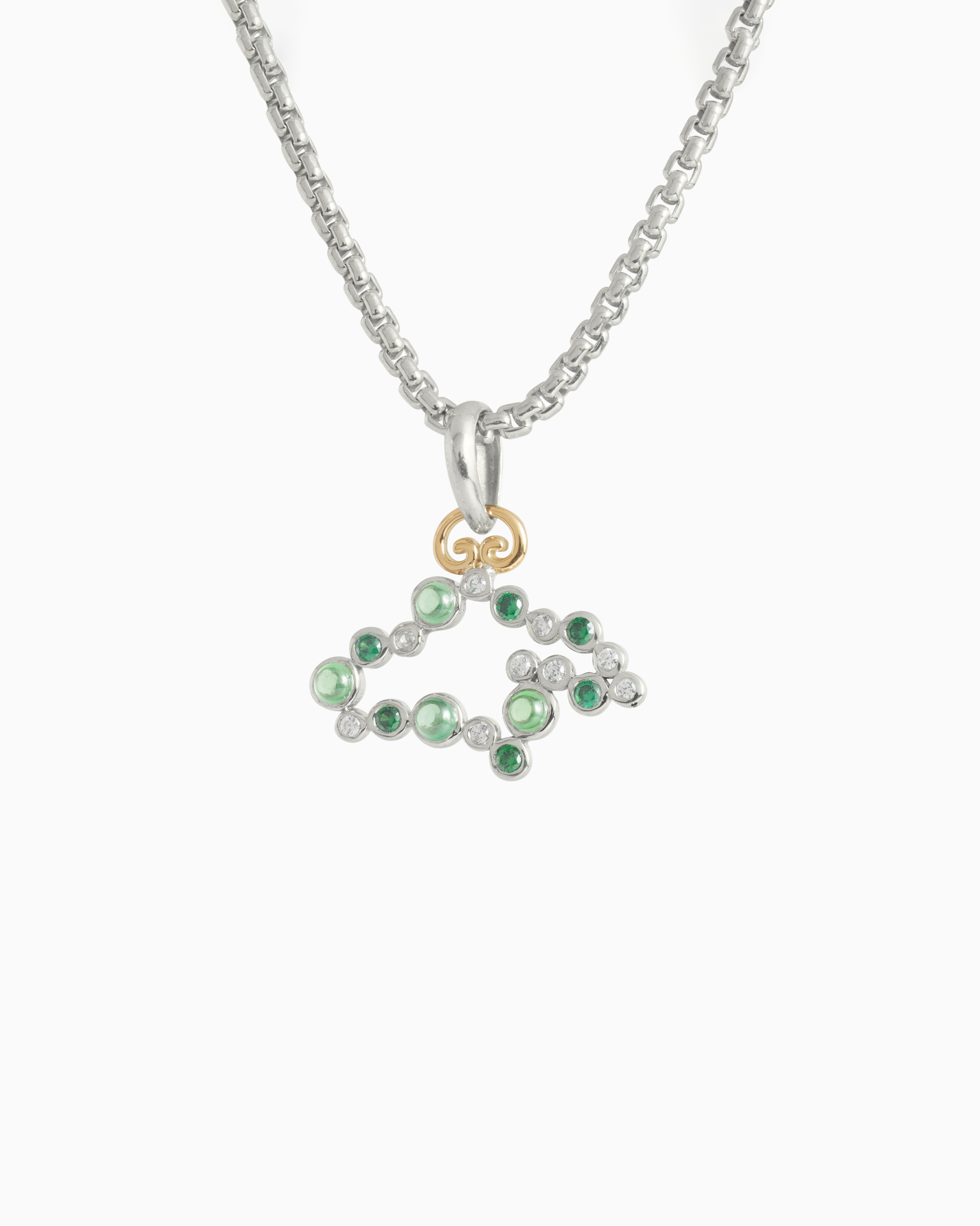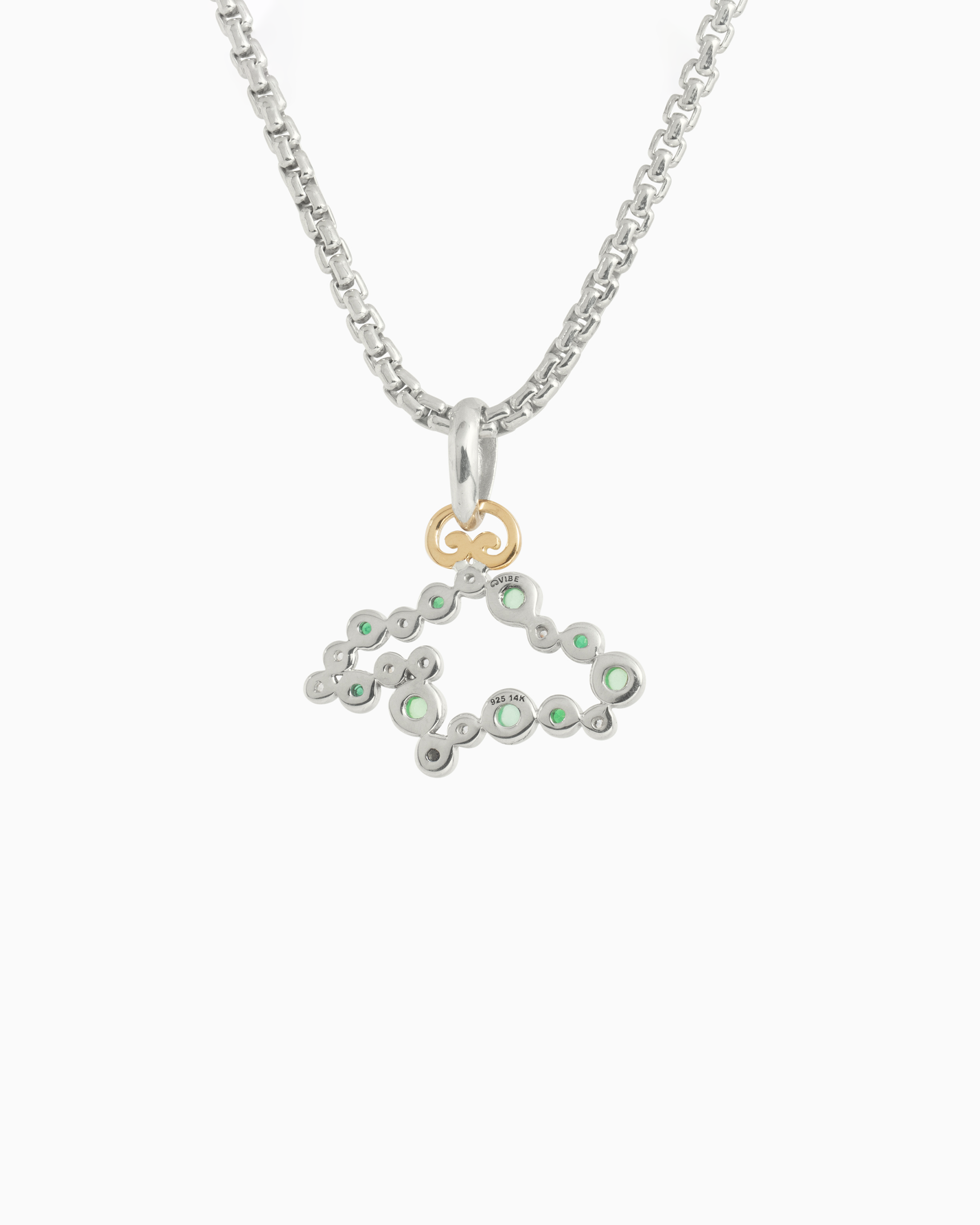 The St. John Map Pendant captures the beauty of St. John with a vibrant mix of green zircon cabochons, faceted green zircon, and white zircon stones tracing its outline. Handcrafted in sterling silver, this unique design is accented with a 14K gold petroglyph, seamlessly connecting the map to the bail. A perfect reminder of your island adventures, this two-tone pendant adds a meaningful touch to any collection. Pair with more pieces from our Bubble Collection for a cohesive look!