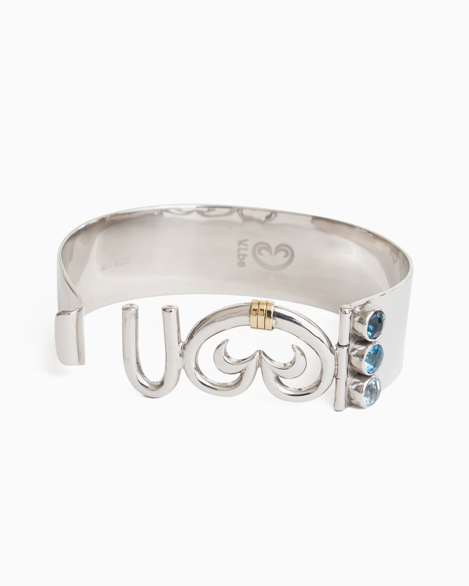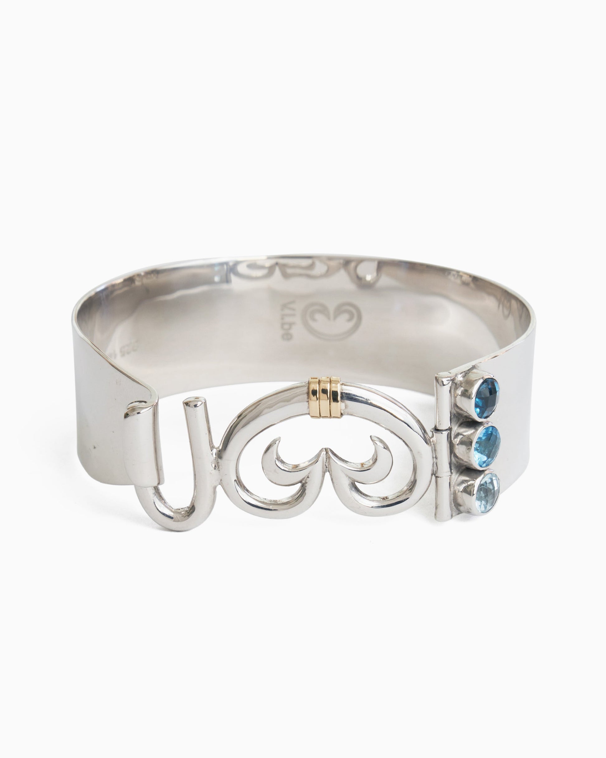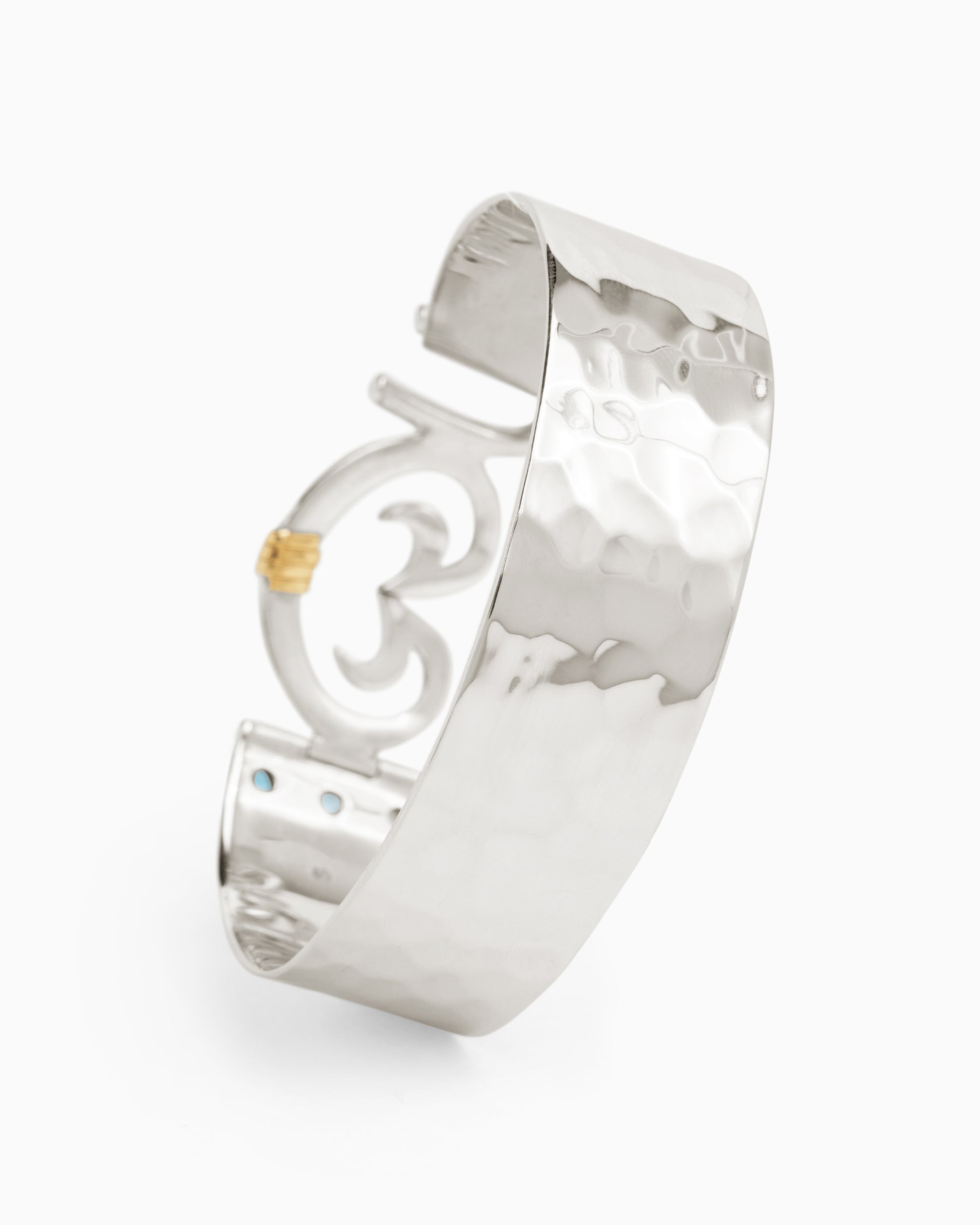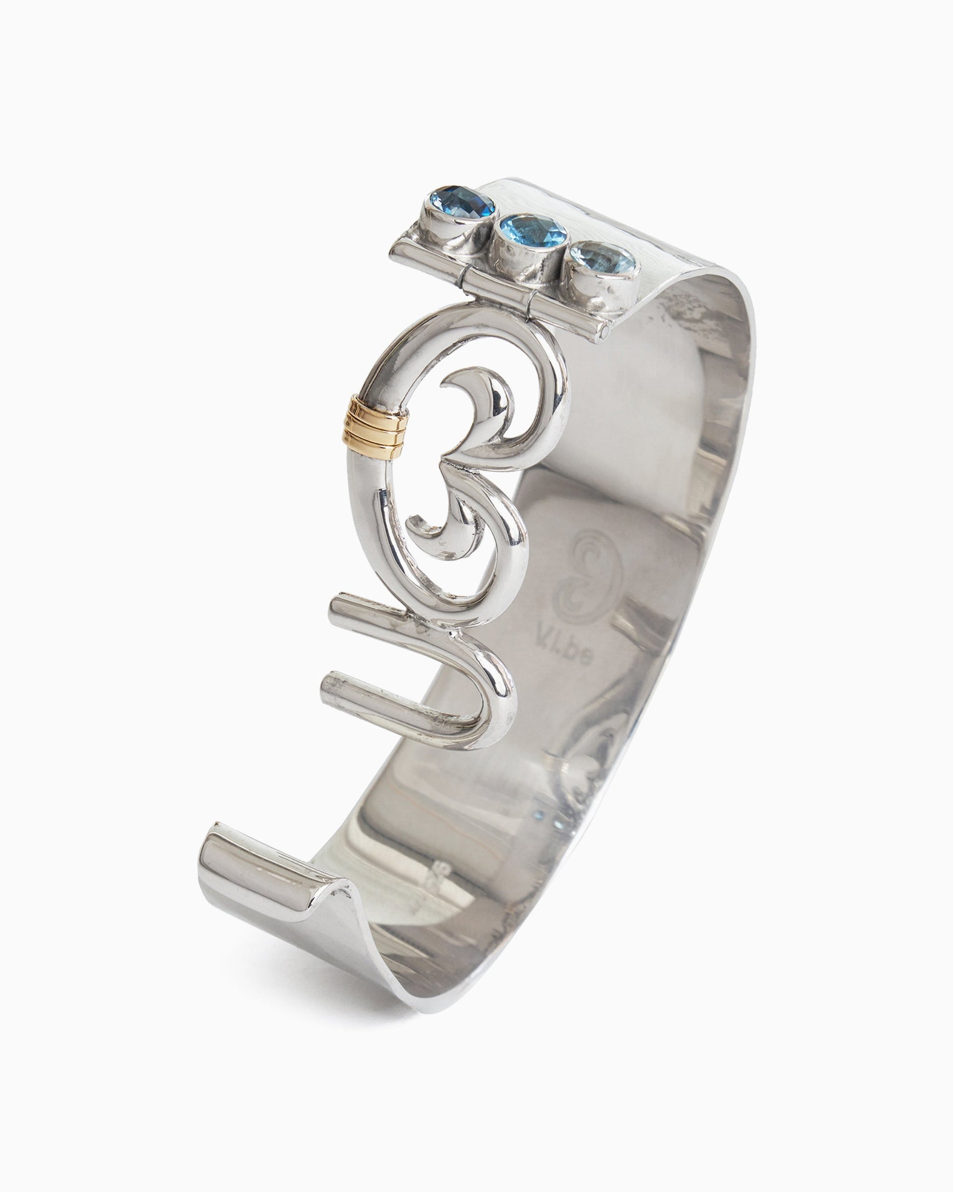 The Statement Petroglyph Hook Bracelet is fashioned in gently hammered sterling silver, and features a hook closure for easy wear. Its centerpiece showcases a replica of the iconic St. John petroglyph, adorned with three 14K gold good luck wraps. A row of three round faceted stones, including a Hampton blue topaz, London blue topaz, and sky blue topaz, elegantly adorns the bracelet's face.