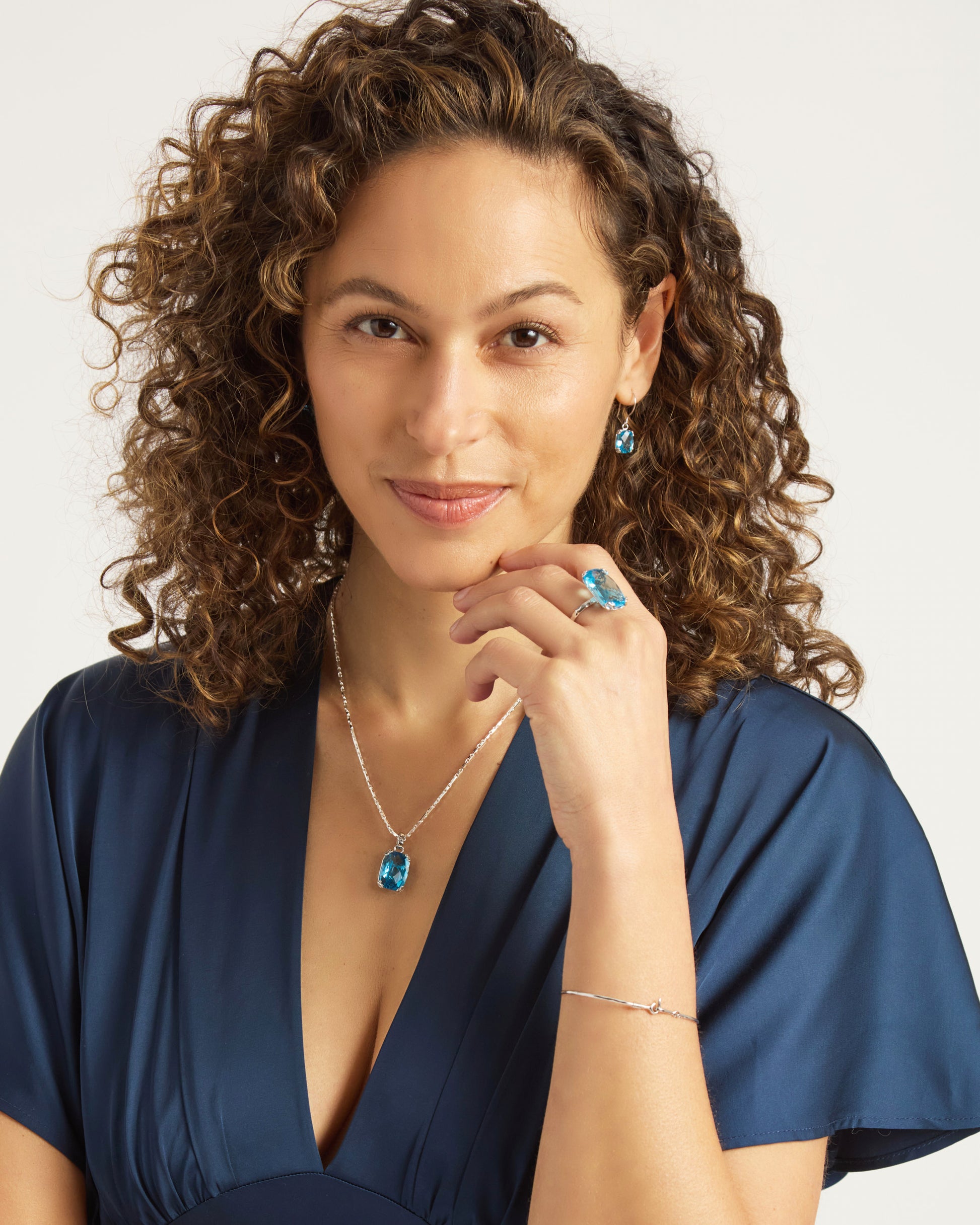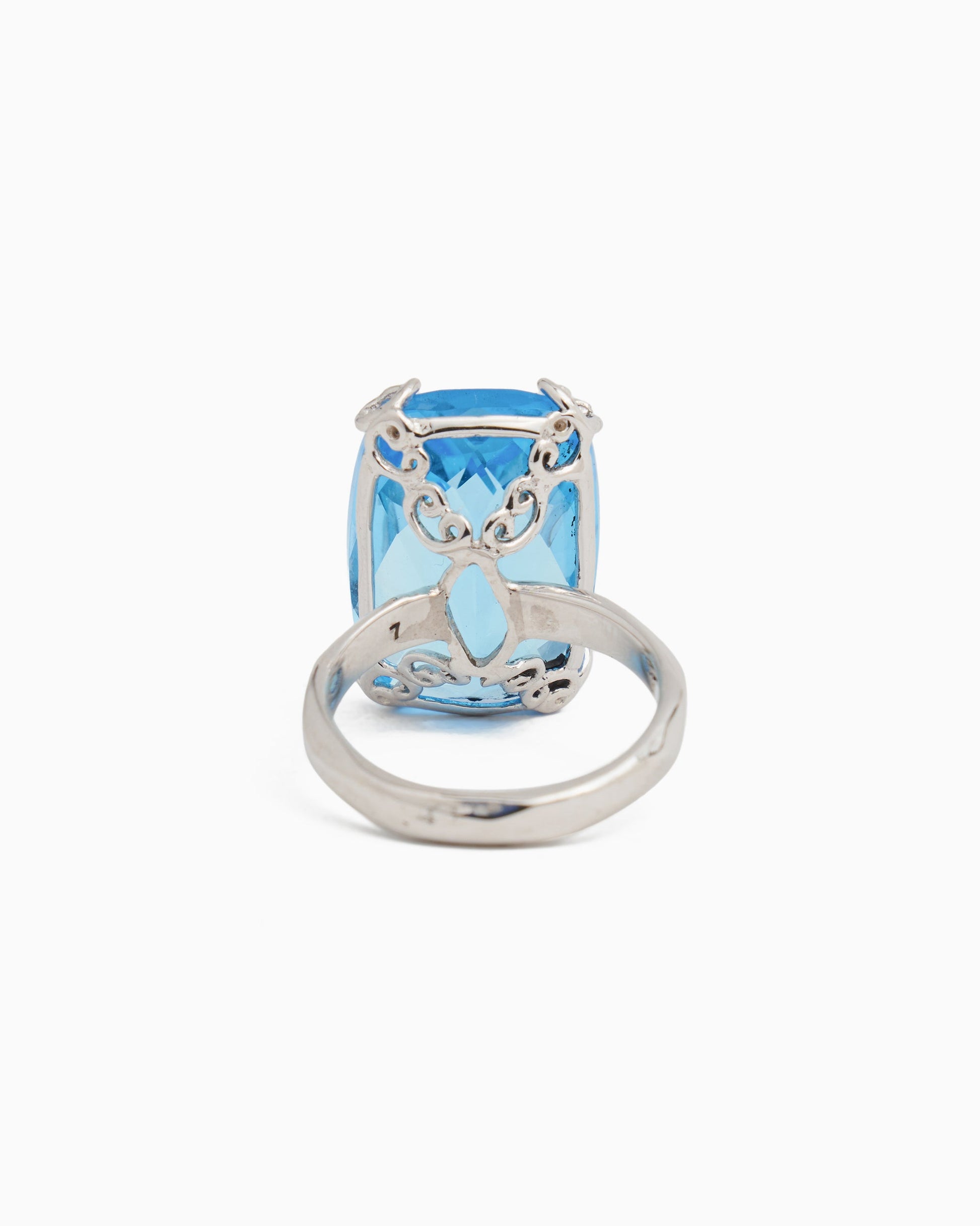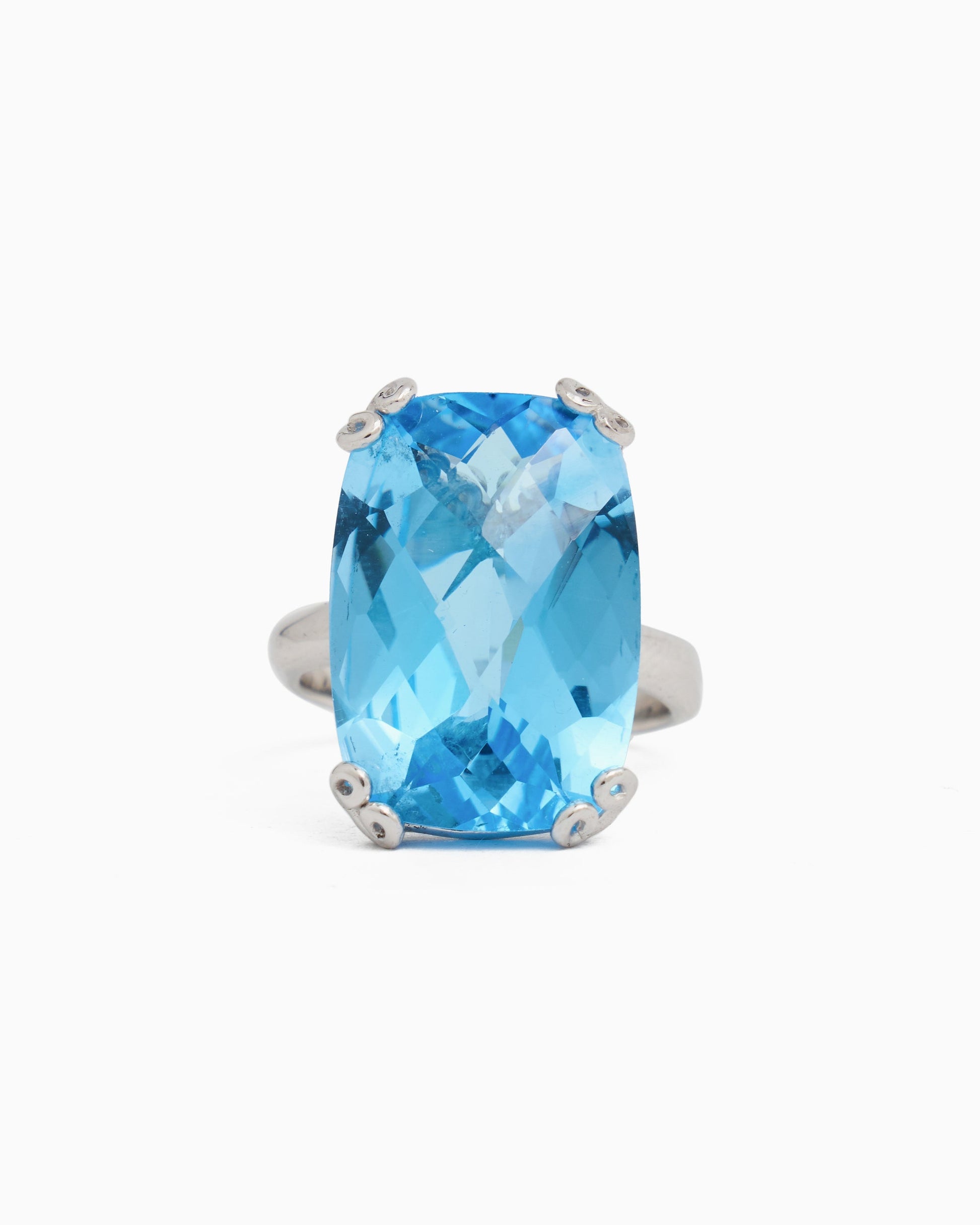 The Statement Stone Ring commands attention with its captivating faceted Hampton blue topaz stone at its center. Tiny replicas of the iconic St. John petroglyph in each corner cradle the stunning stone.