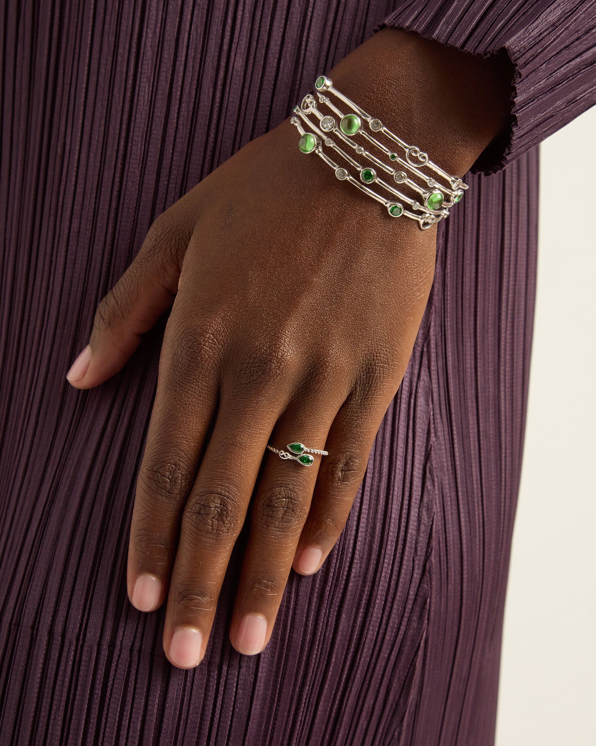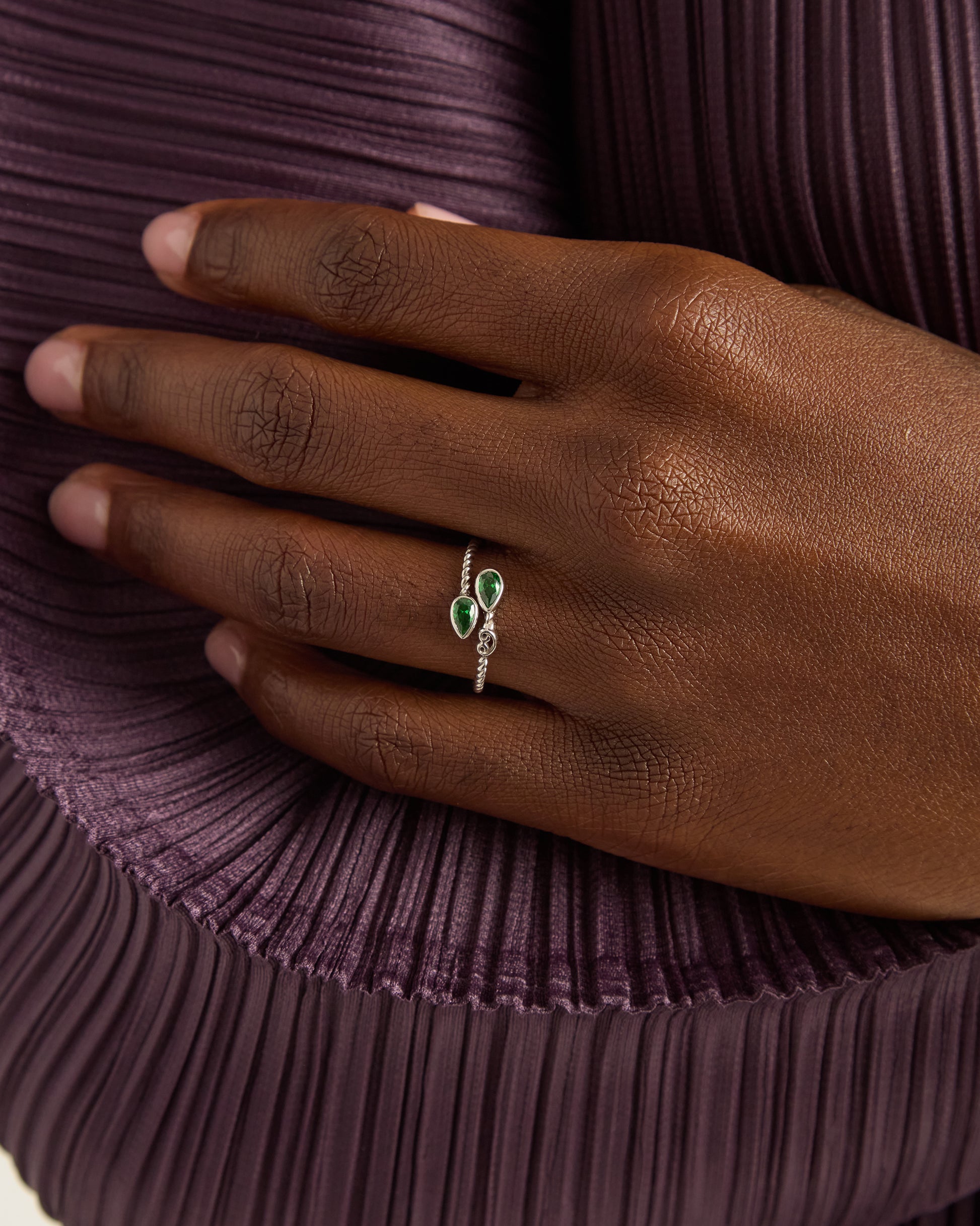The Twisted Wrap Ring features a twisted 14K solid gold band adorned with two faceted pear-shaped green zircon stones. With its flexible fit, this ring can be worn solo for a minimalist look or stacked with others from your collection.