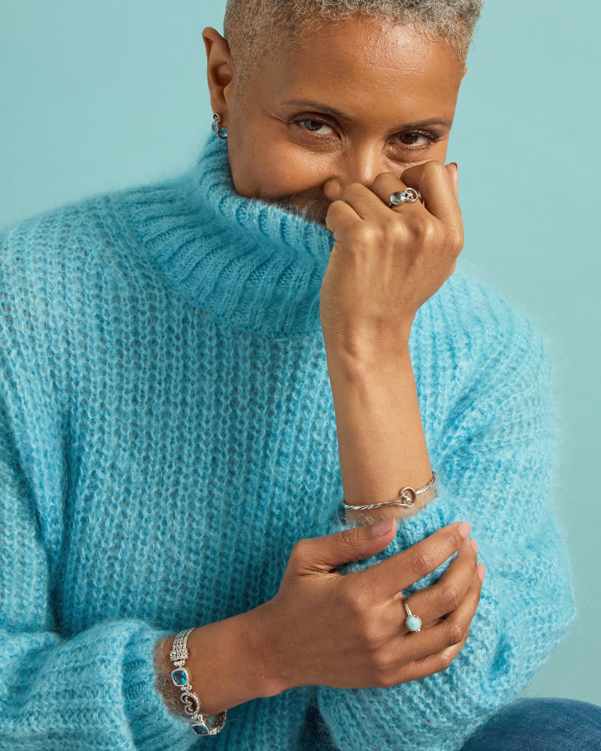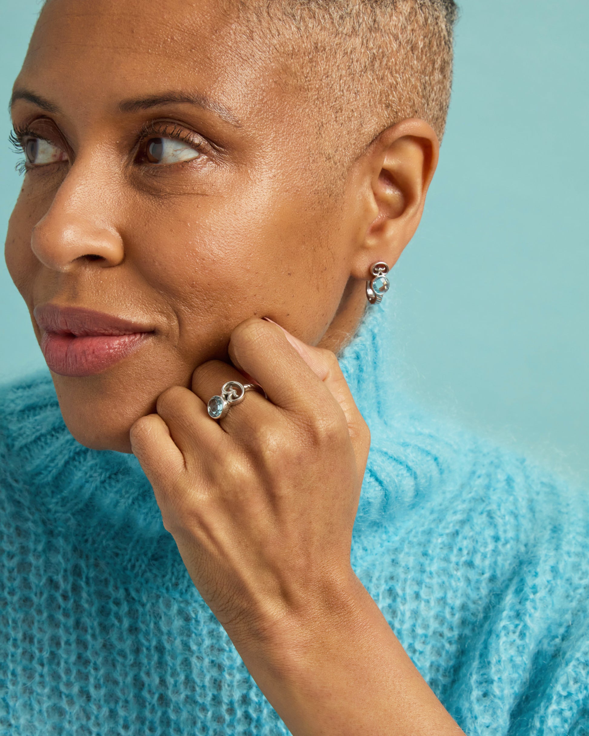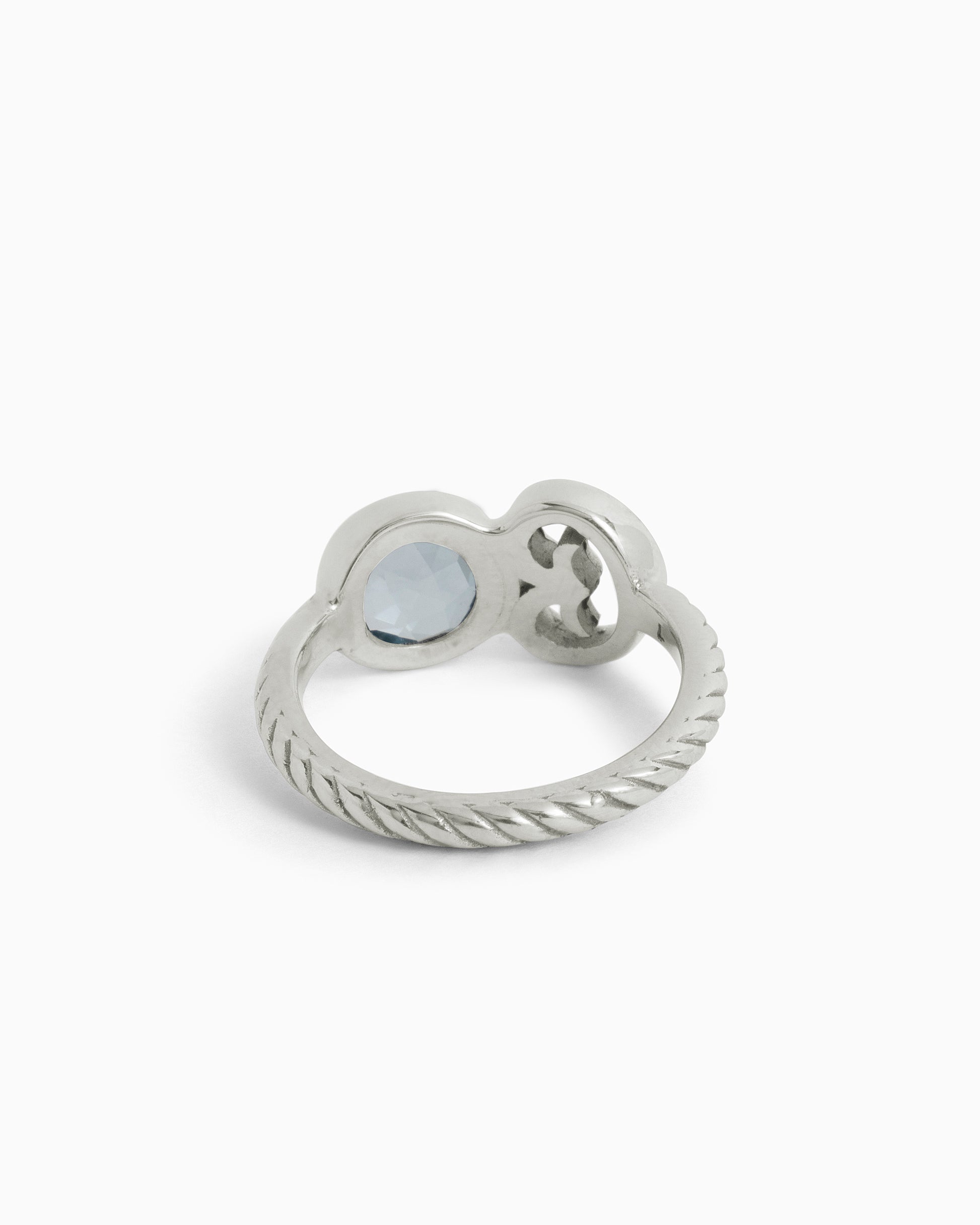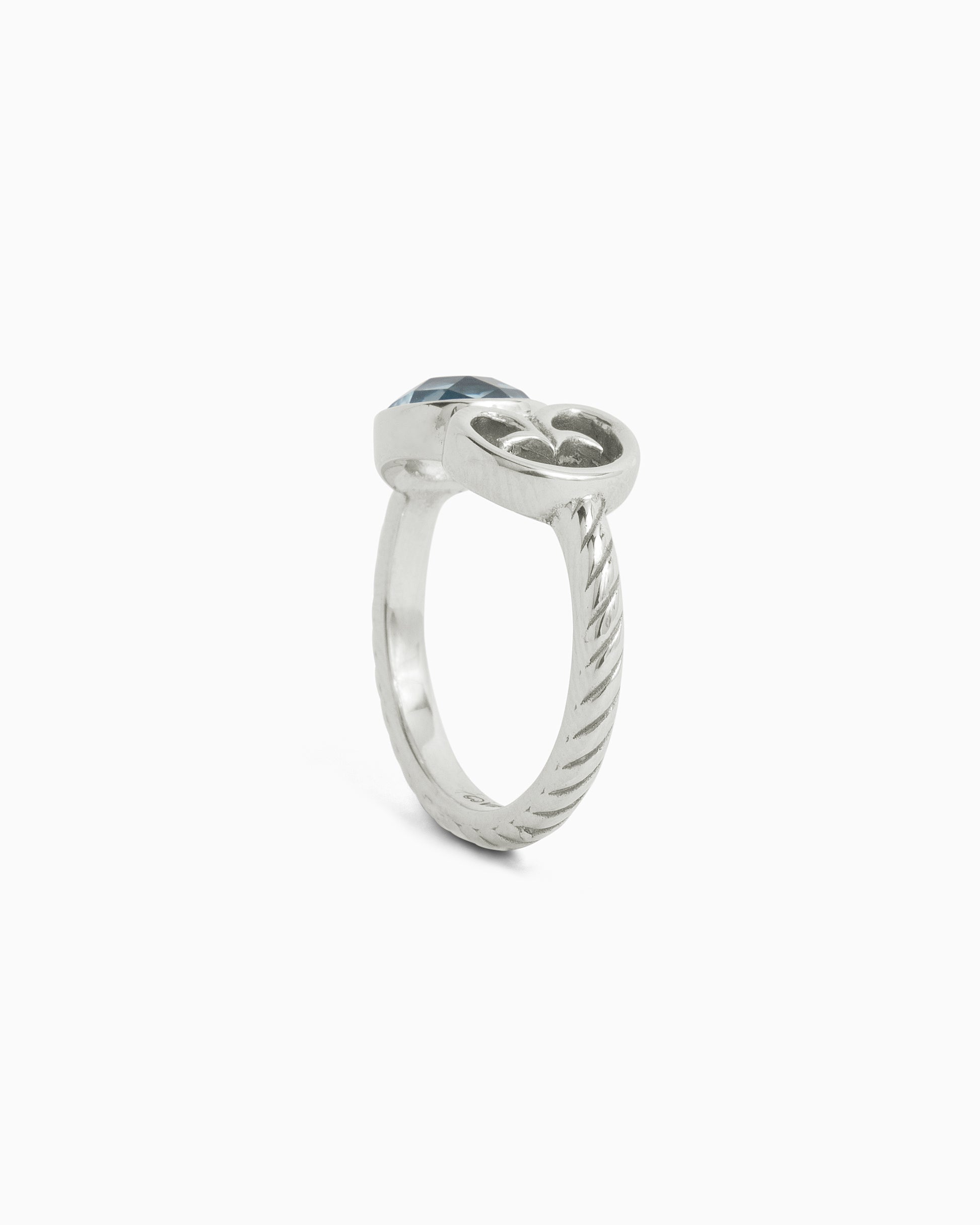 Handcrafted with a twisted sterling silver band, this ring has a faceted sky blue topaz stone and a replica of the St. John petroglyph. The Twisted Ring offers a perfect balance of versatility and boldness. Wear it alone for a subtle statement or stack it with other rings for a personalized and stylish look.