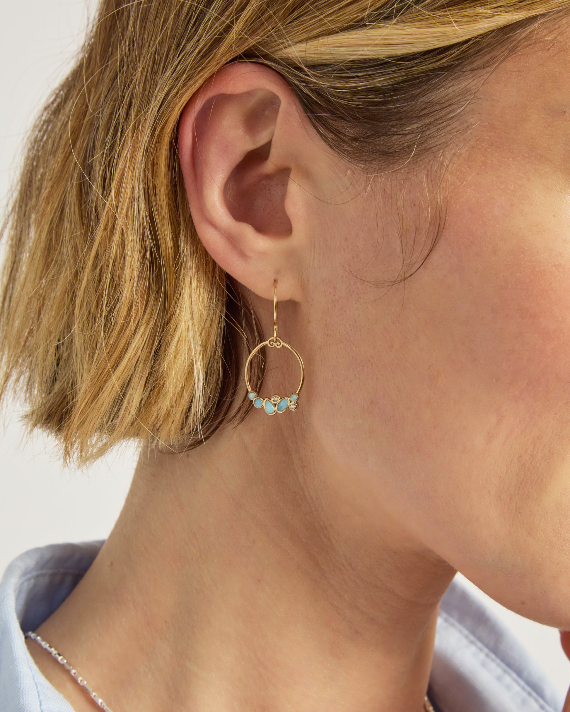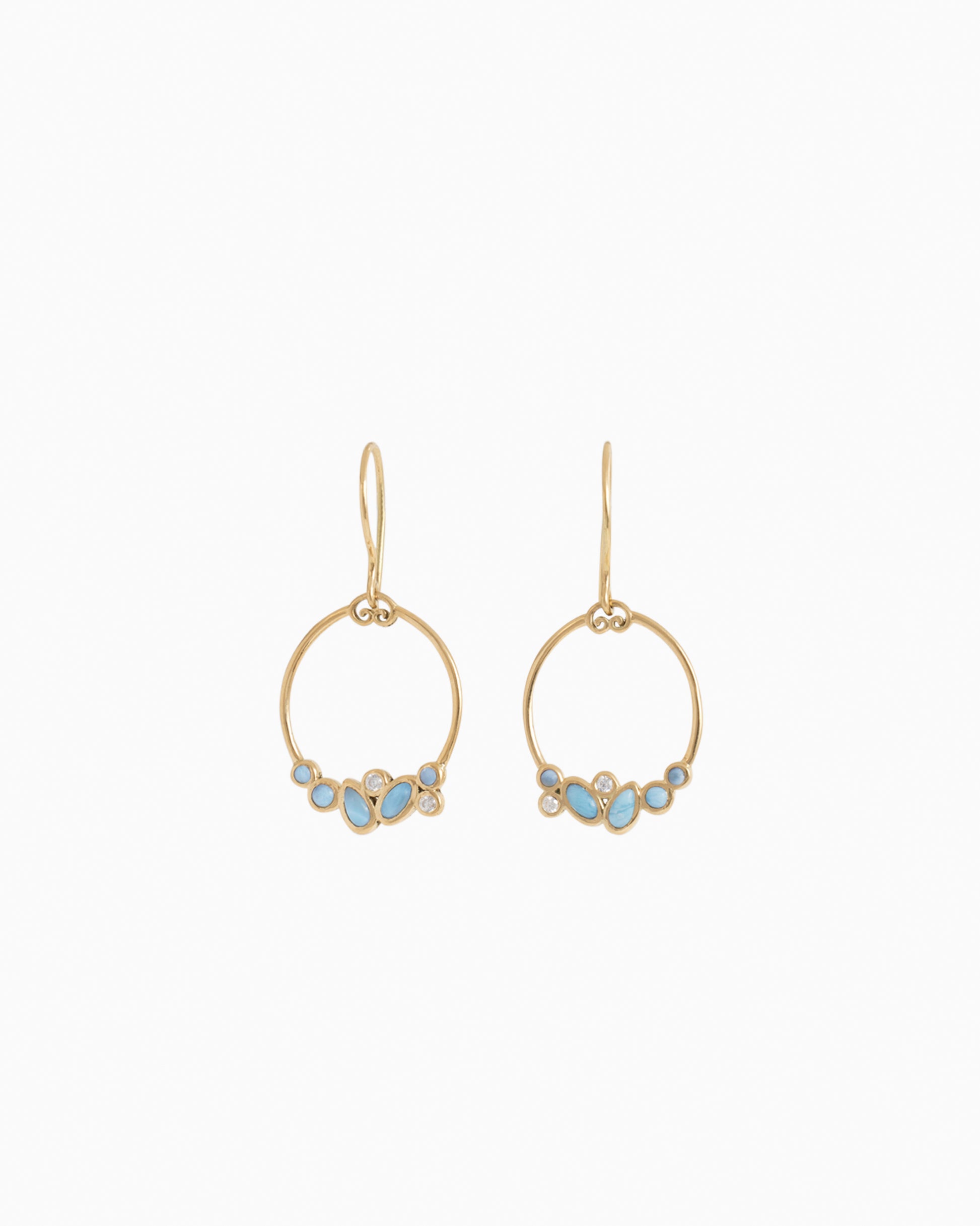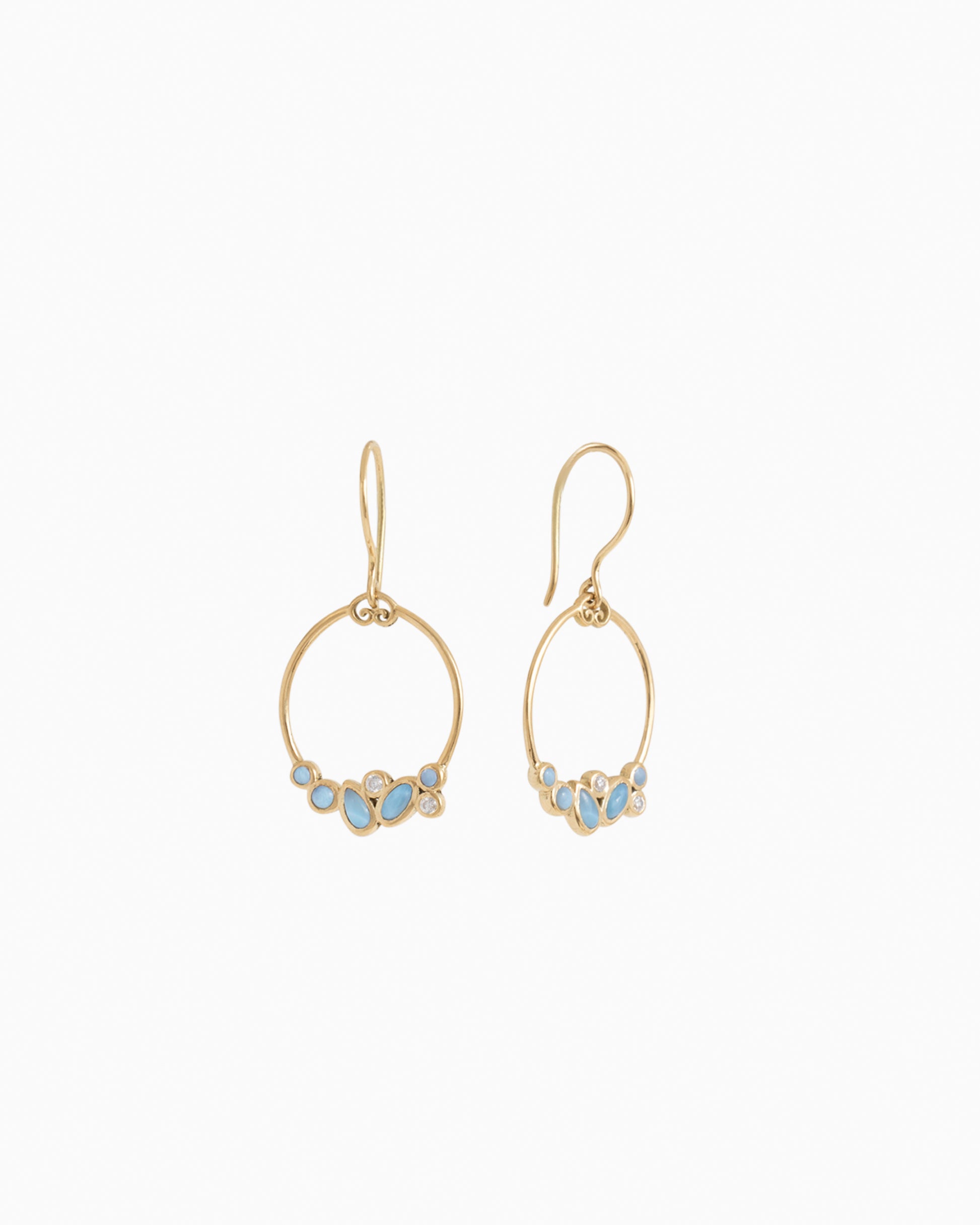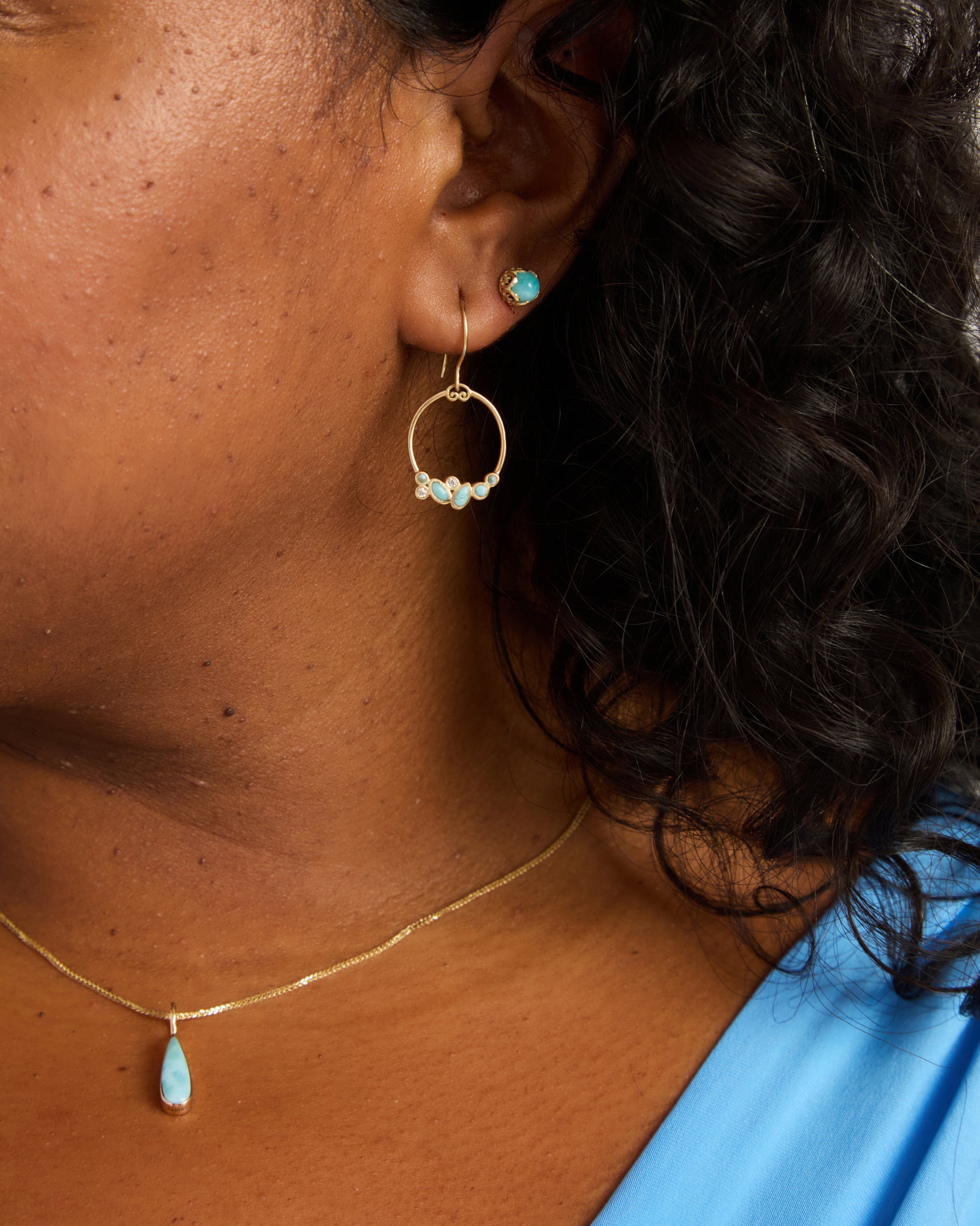 The Stone Cluster Drop Earrings feature a 14K solid gold loop shape adorned with a cluster of larimar cabochon stones and faceted white zircon stones. This elegant yet whimsical design will complement any jewelry collection.