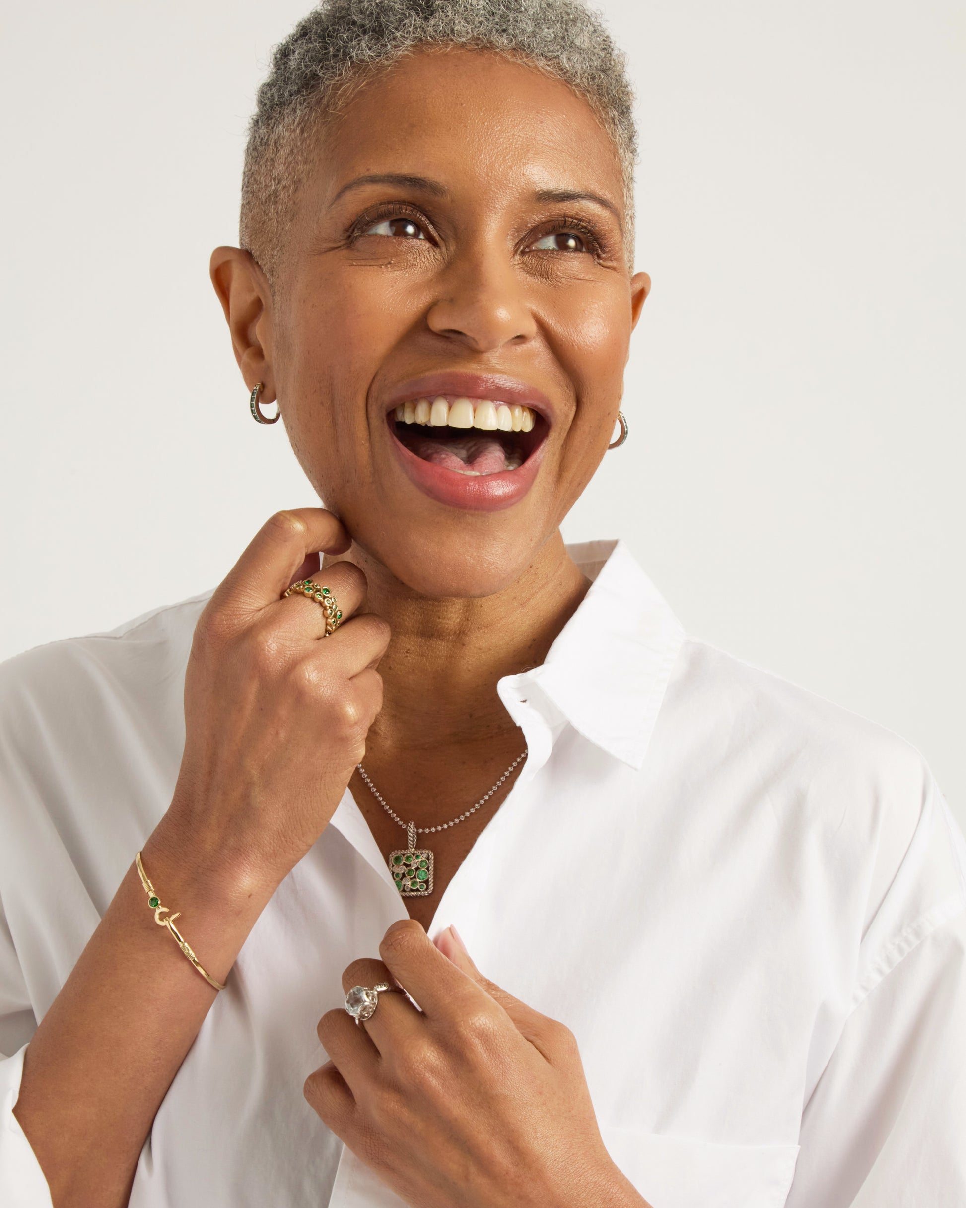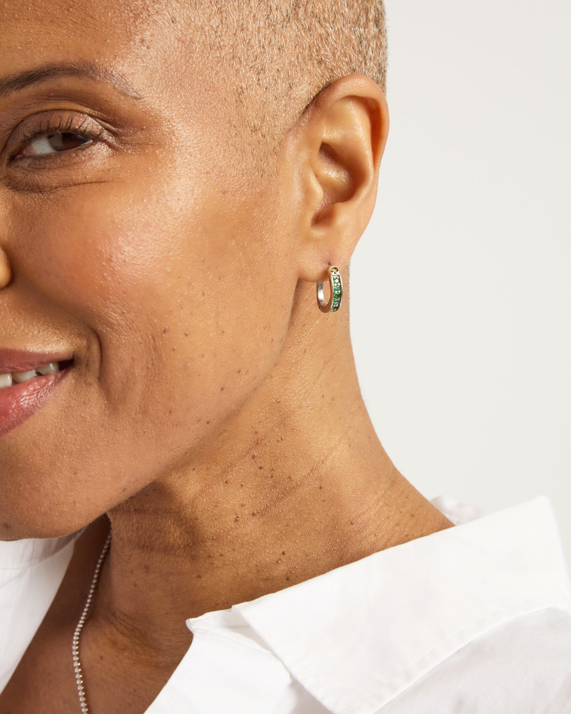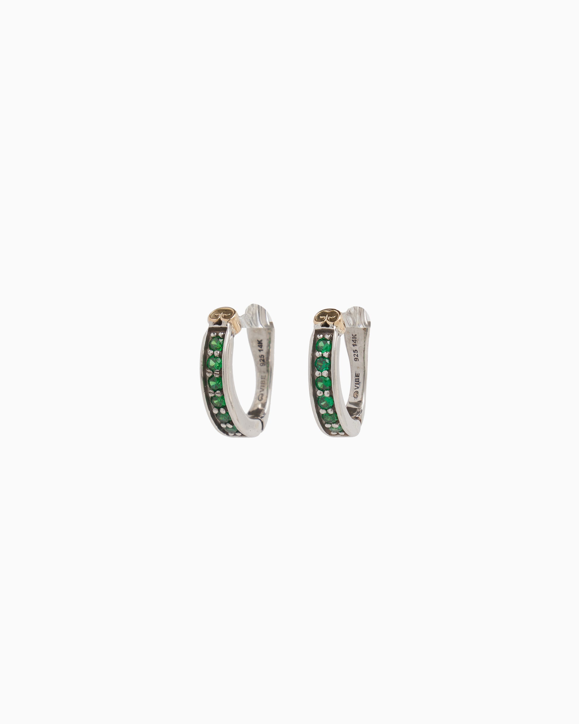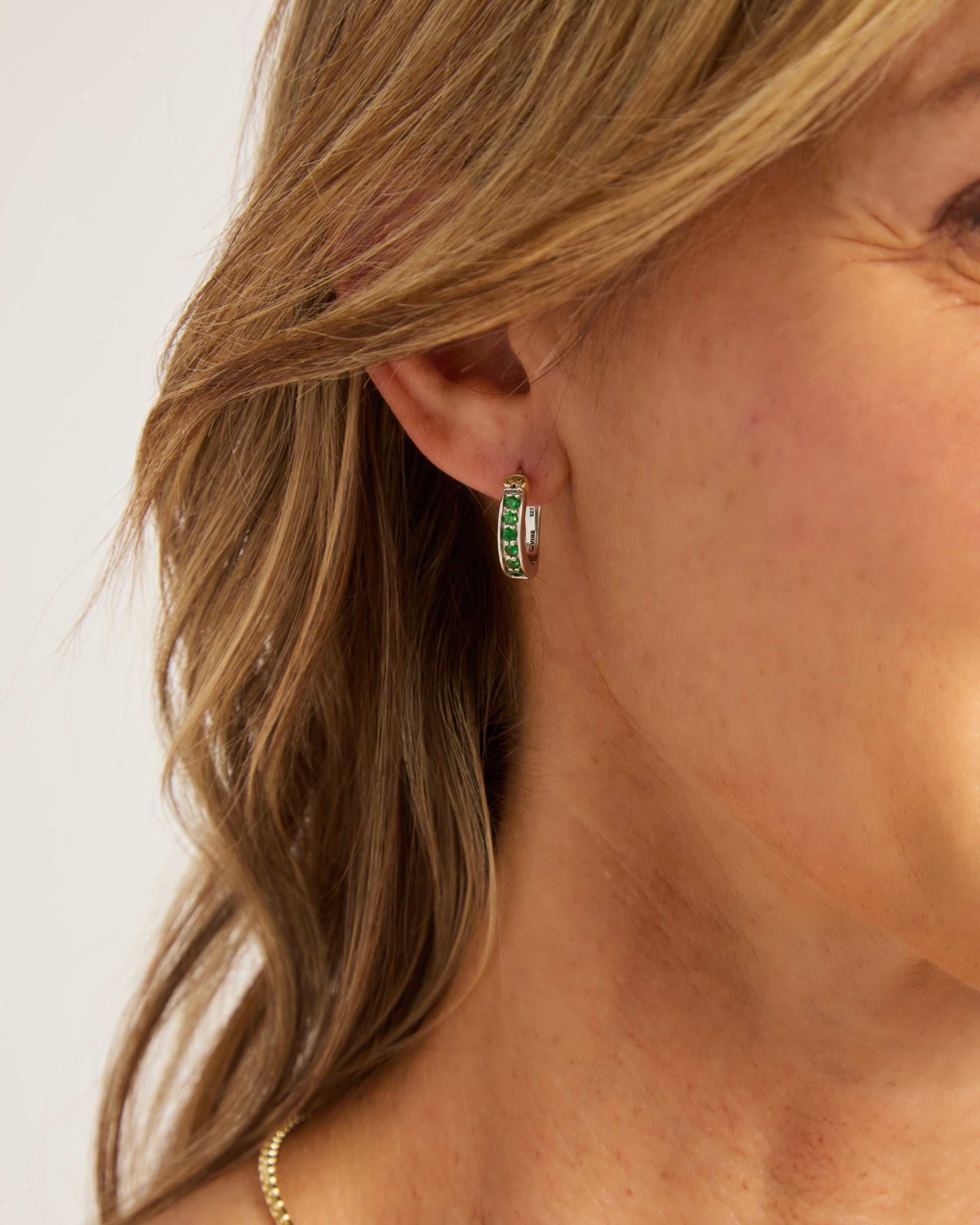 Our Stone Embellished Hoops feature a classic hoop shape decorated with green zircon stones and a signature 14K gold petroglyph. This style is perfect for everyday wear or formal occasions.