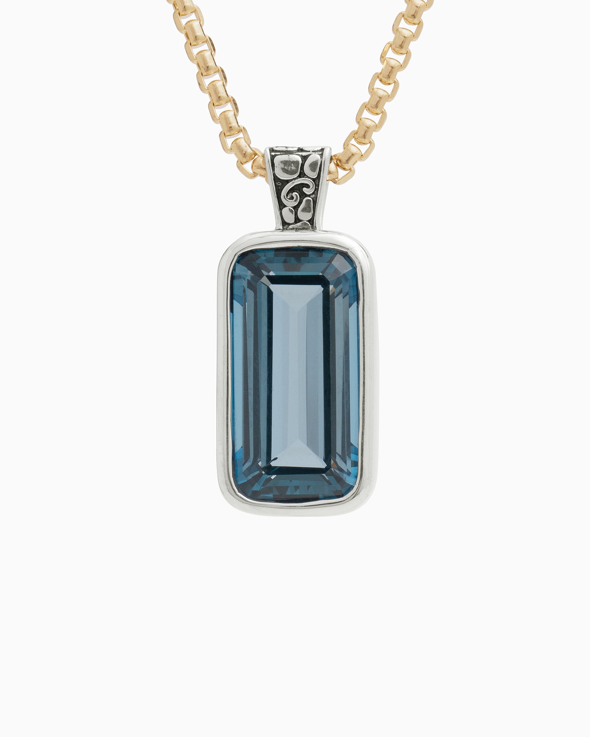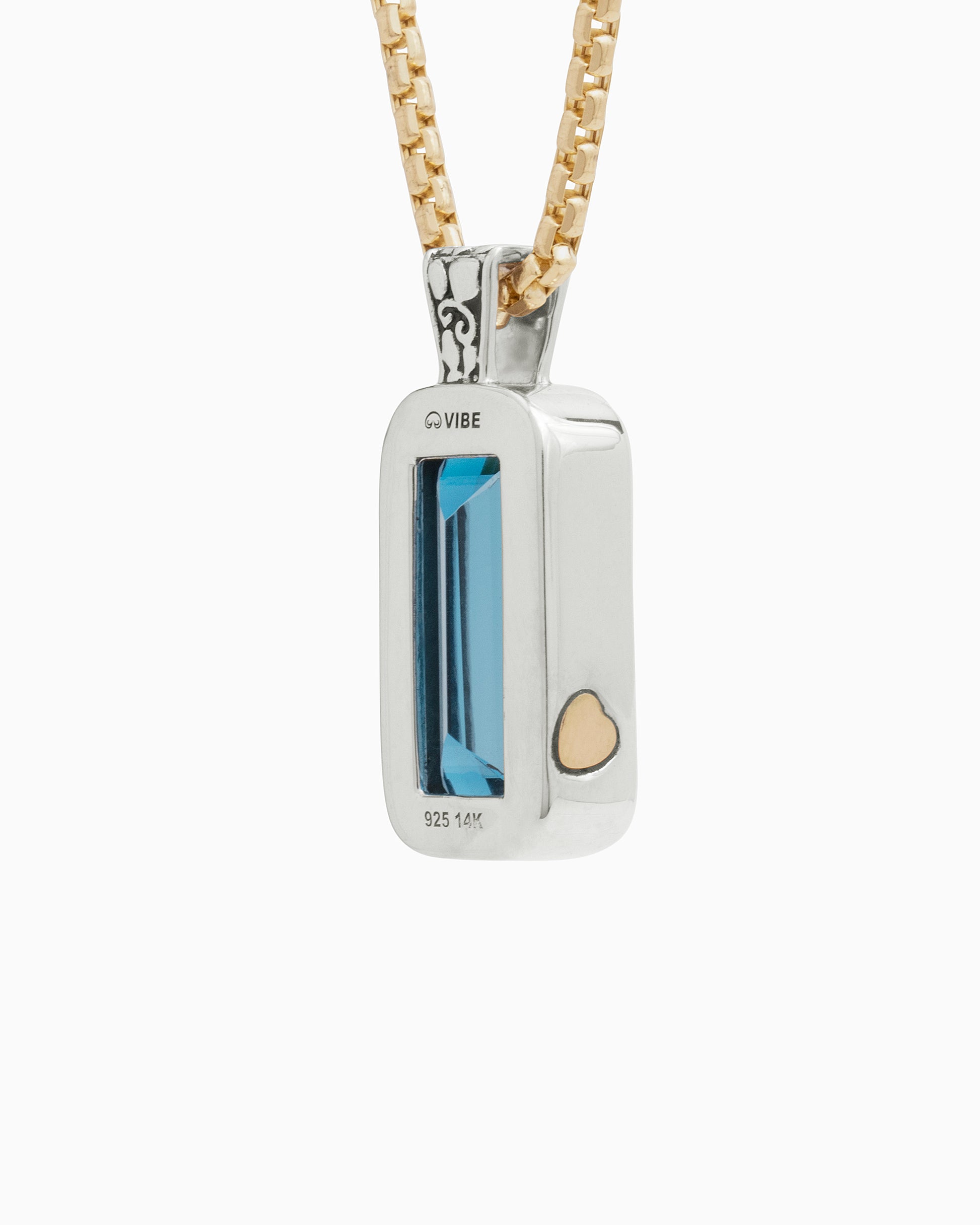 The Stone Pendant is a striking statement piece designed to elevate any outfit. Handcrafted from sterling silver, it features a 14K solid gold heart detail and is adorned with a captivating faceted London blue topaz stone. Take note of the distinctive turtle texture with petroglyphs on the bail, adding an extra layer of charm.