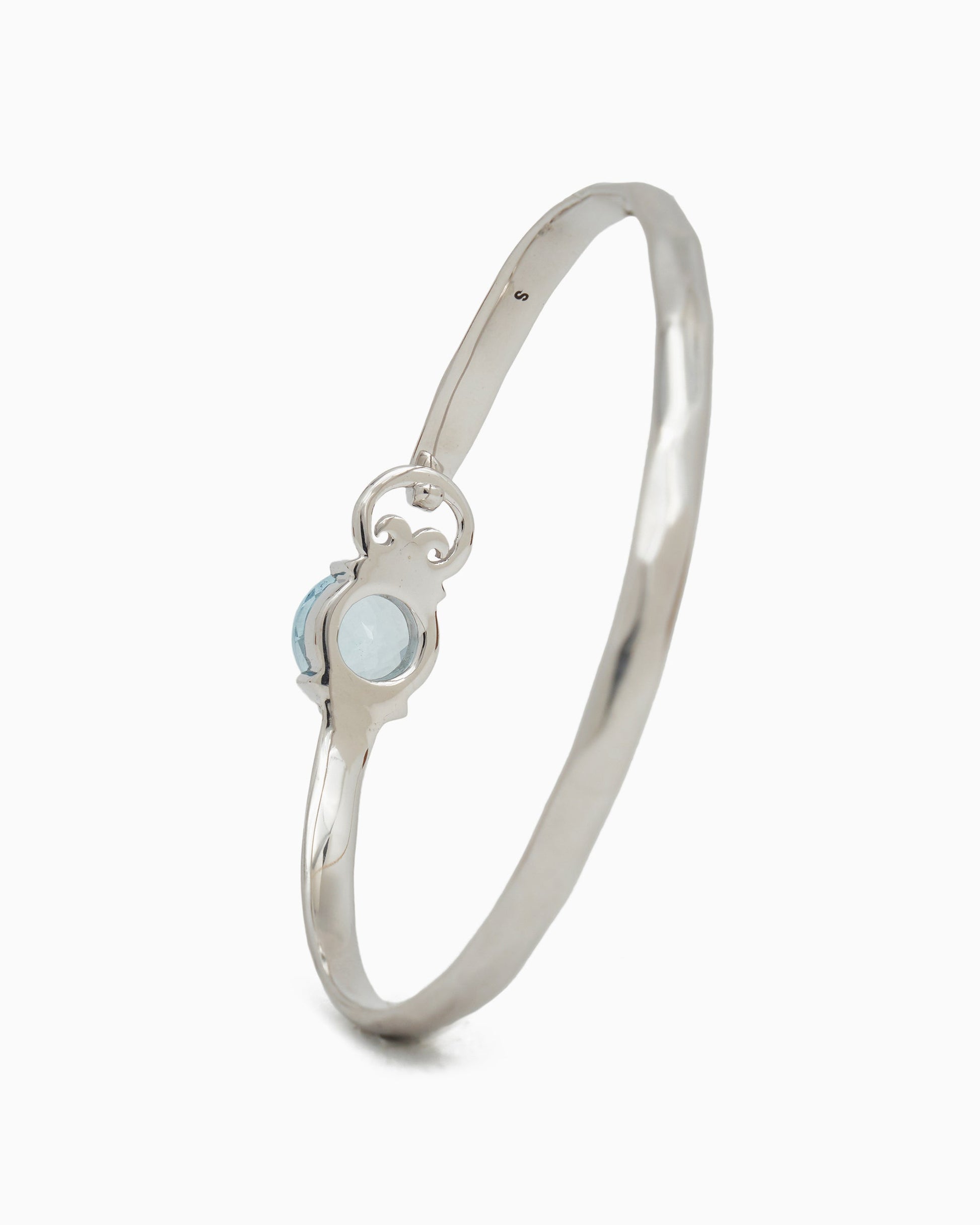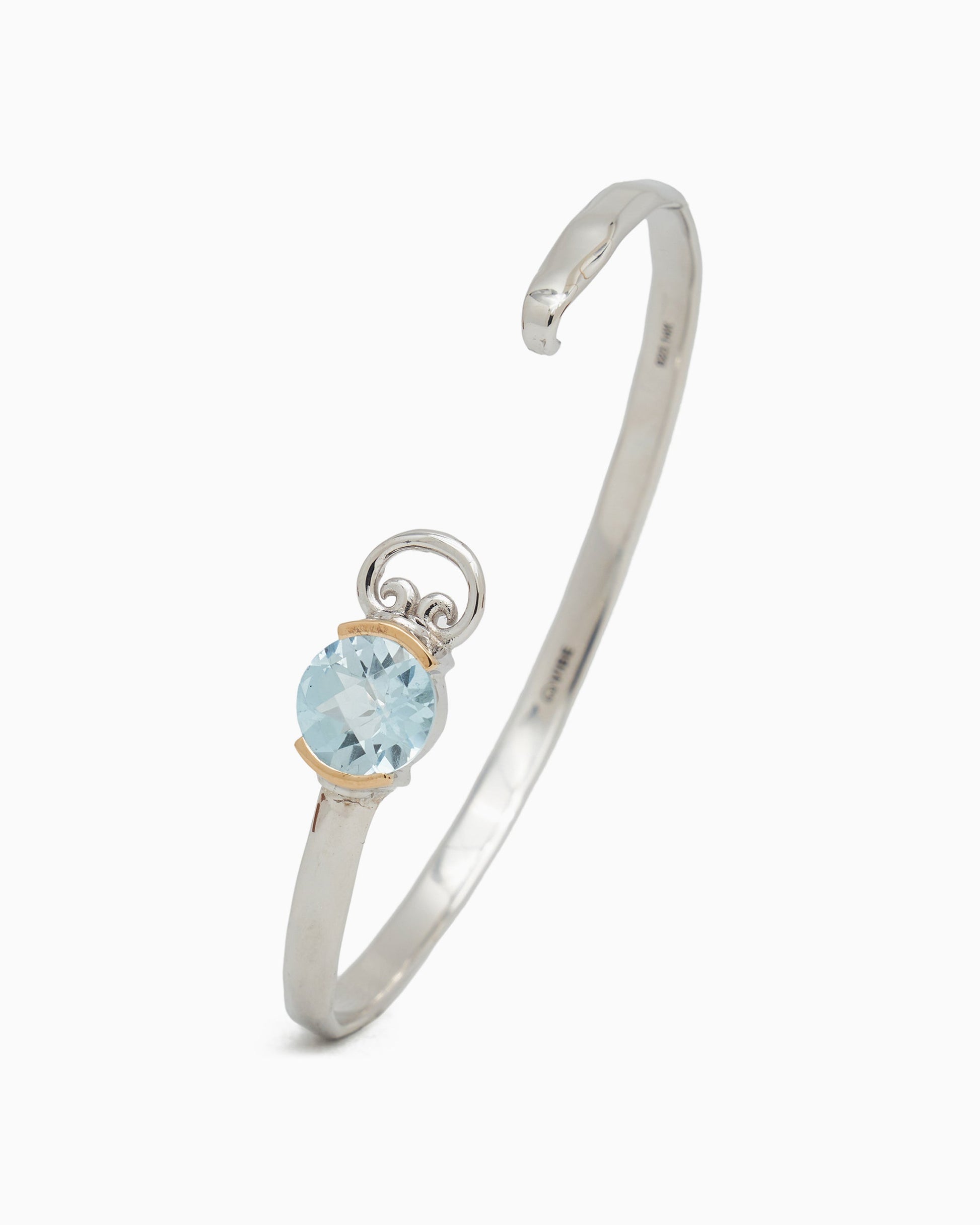 The Gemstone & Petroglyph Bangle is handcrafted in gently hammered sterling silver. Featuring the signature petroglyph and a statement faceted blue topaz stone set in 14K solid gold. This unique design is sure to become a staple in your everyday jewelry collection. Complete the set with our matching Gemstone Studs.