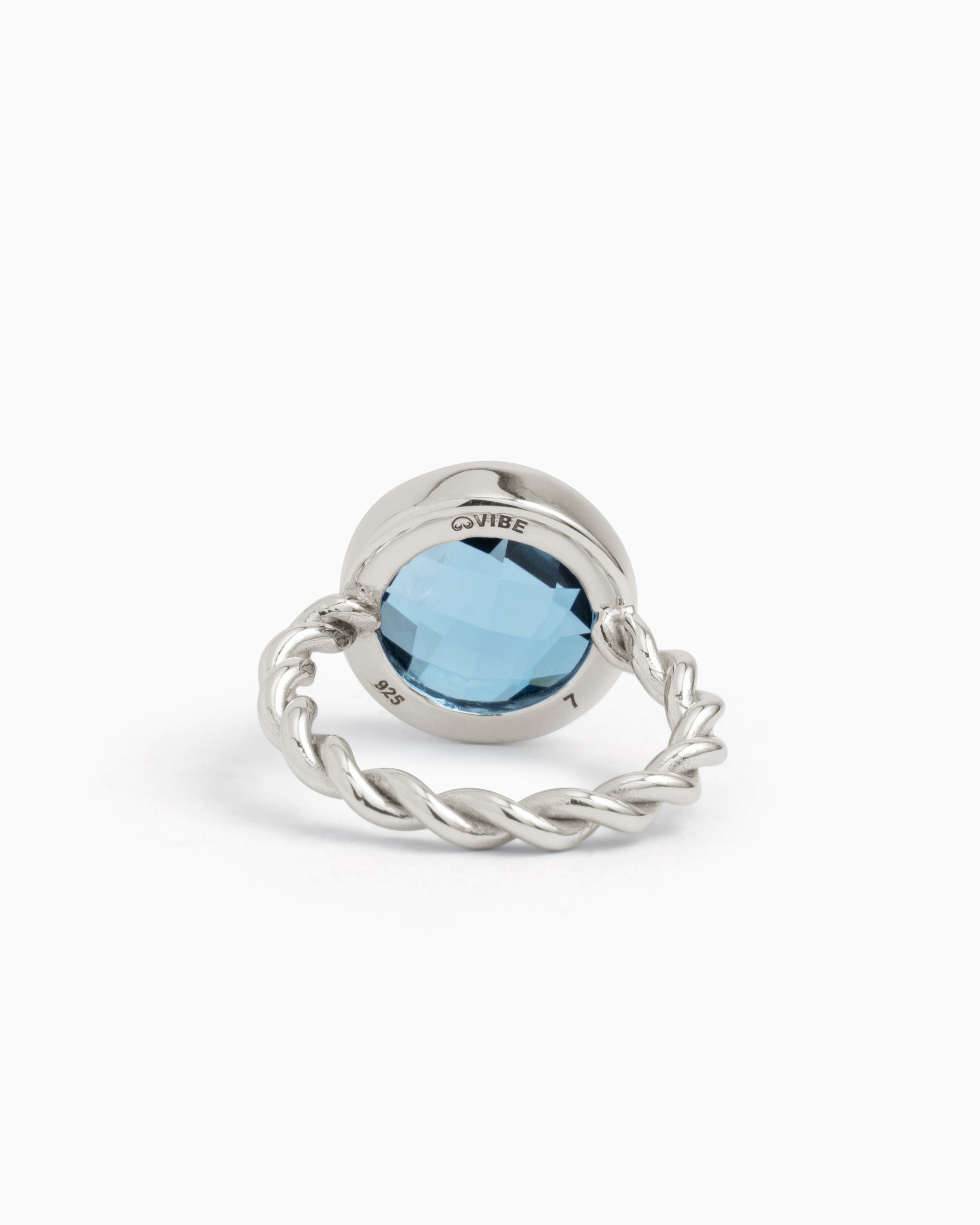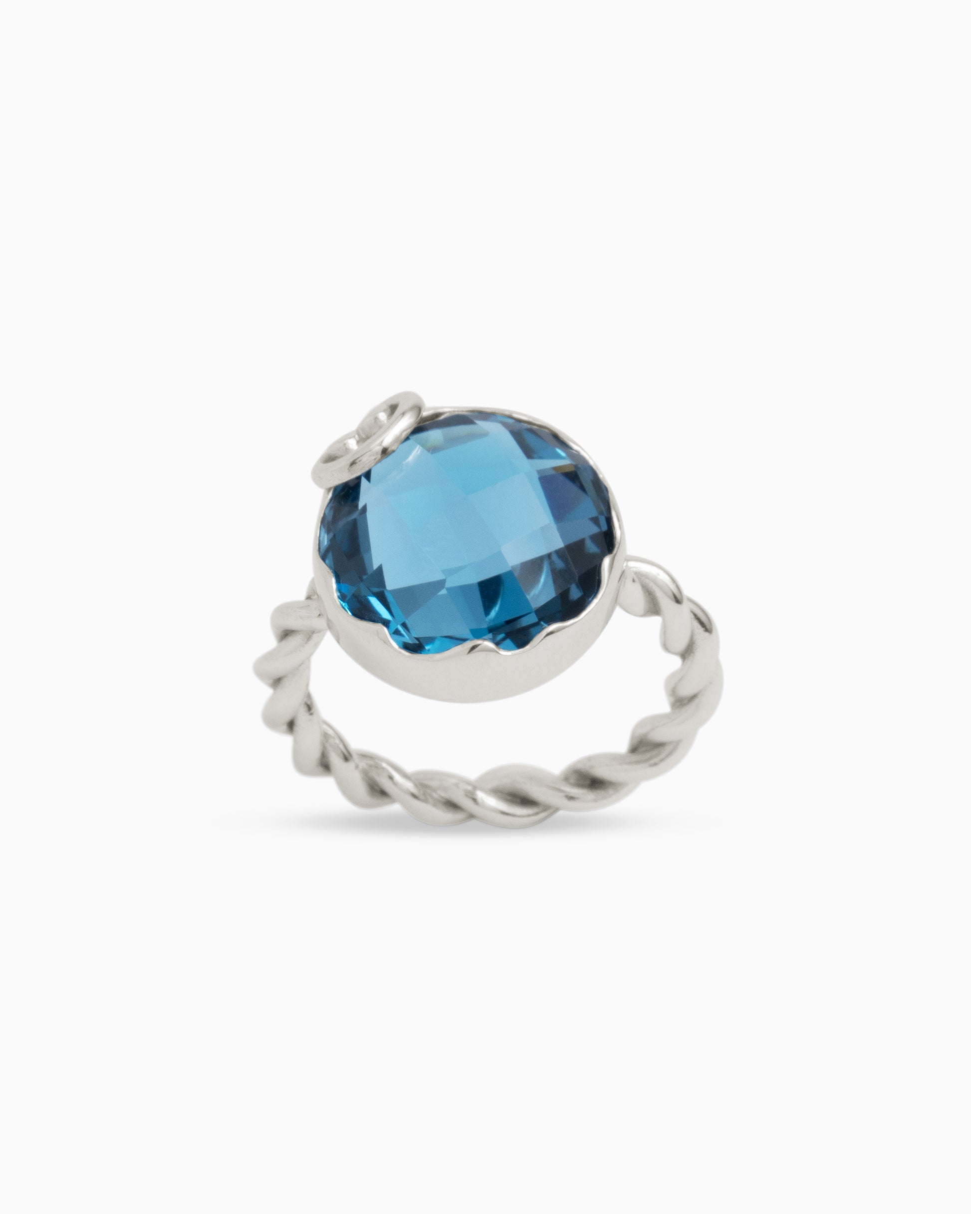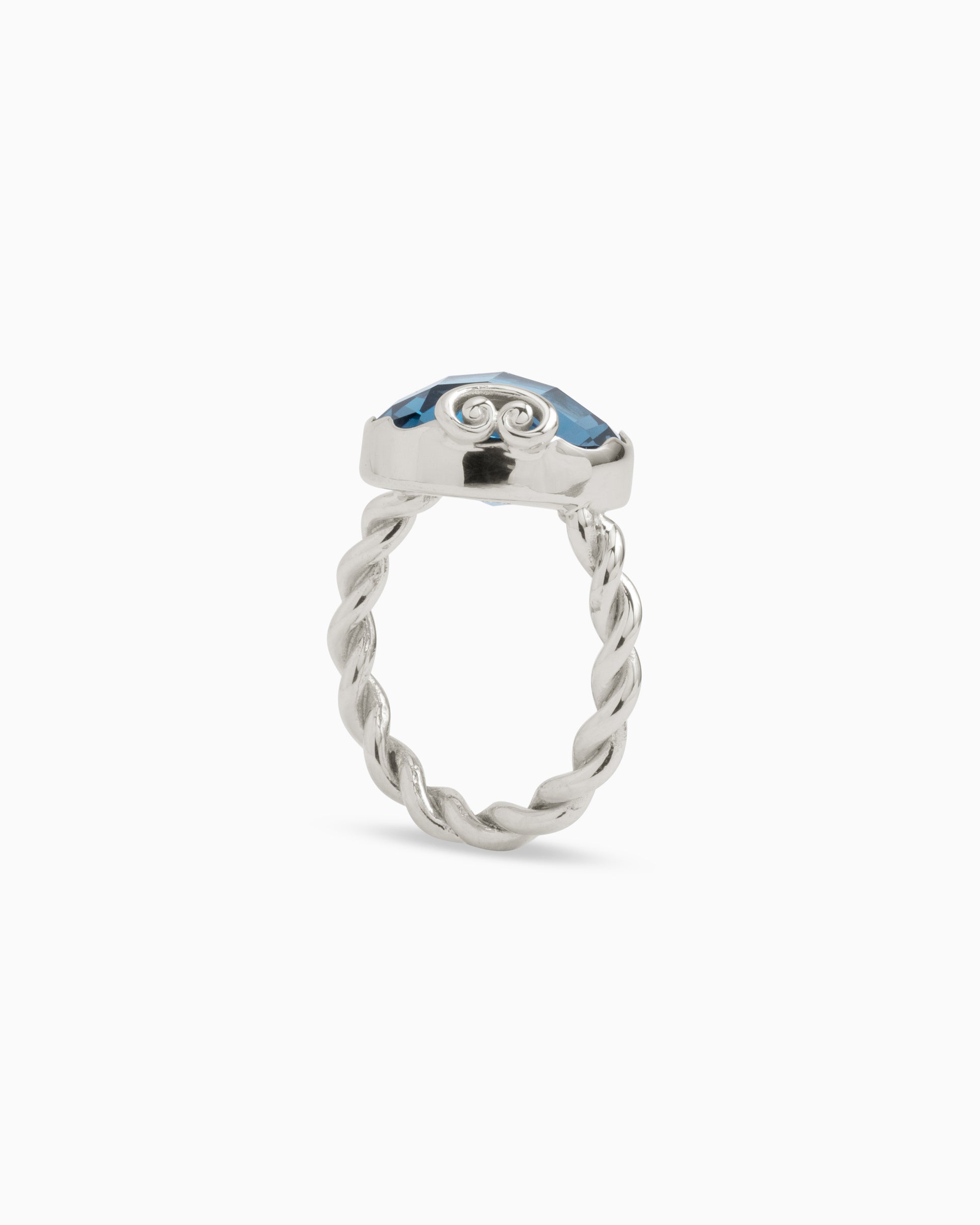 The Stone and Petroglyph Twisted Ring is a statement style handcrafted in sterling silver and featuring a bold London blue topaz stone at the center. This piece includes an assortment of unique details like a twisted band, and a petroglyph adorning the top of the stone placed in a wave-like setting.