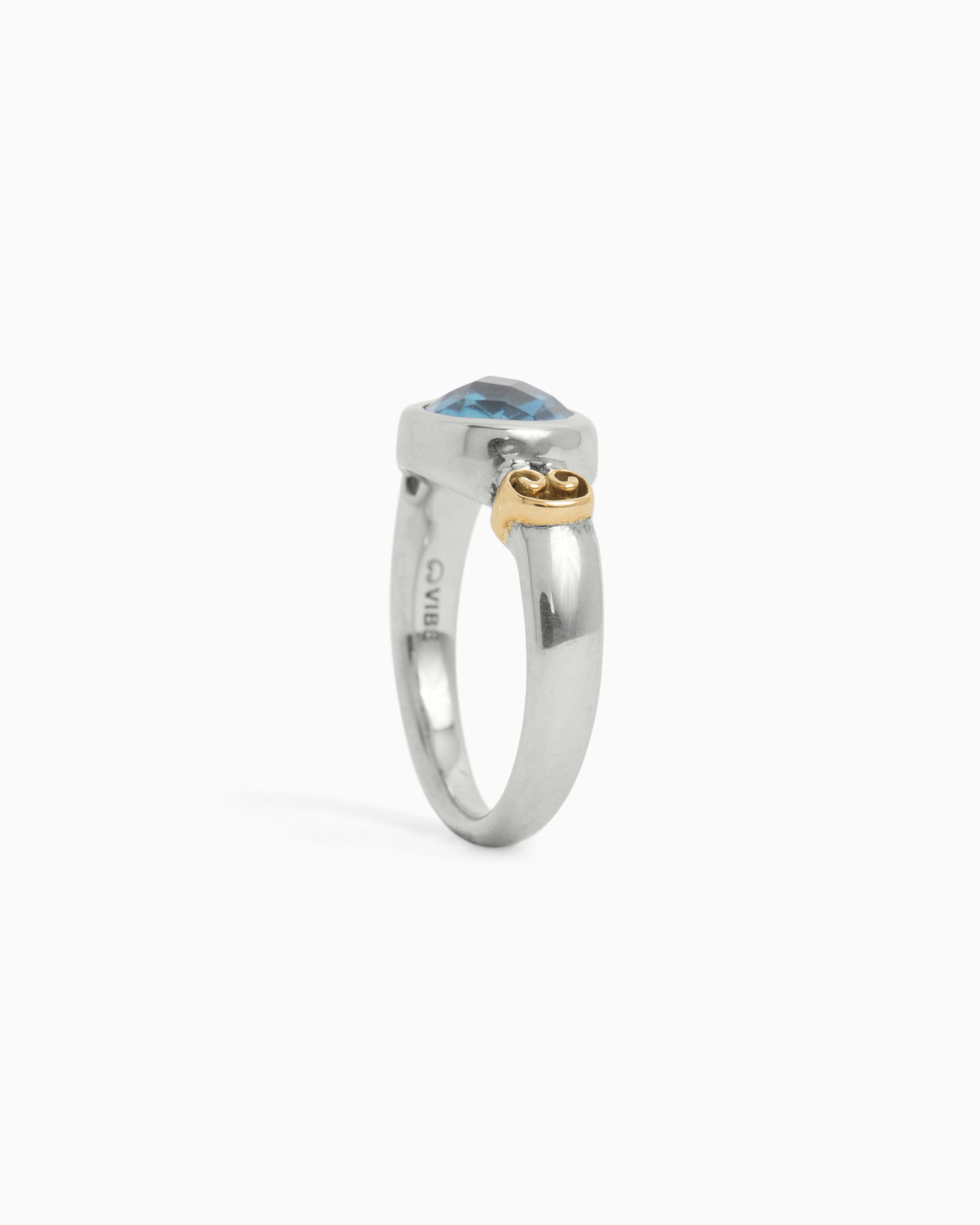 Handcrafted in sterling silver, the Stone Ring features a faceted London blue topaz stone, a 14K gold petroglyph, and three gold dots. Paying homage to the beautiful island, each dot is meant to represent each island, St. John, St. Thomas, and St. Croix.