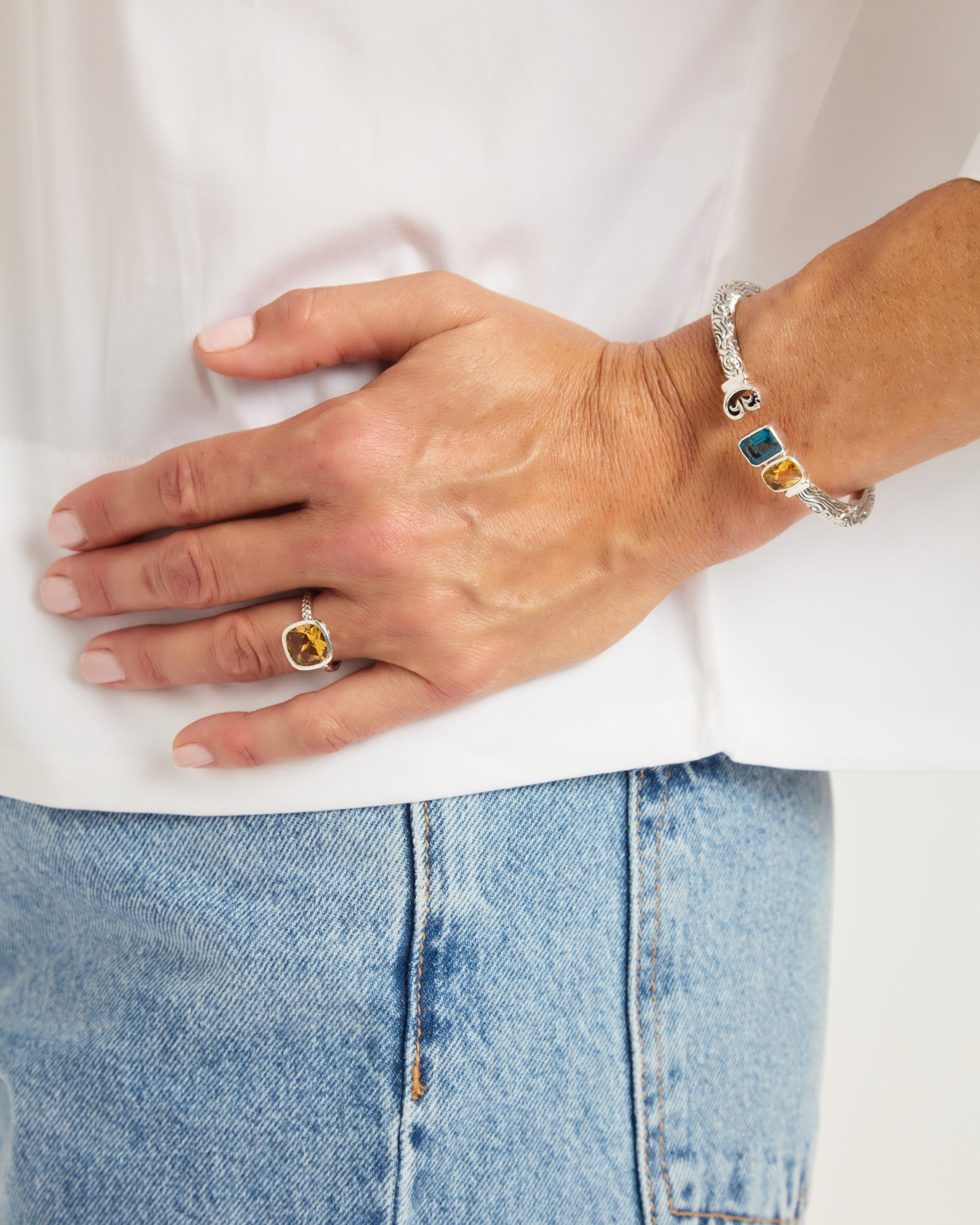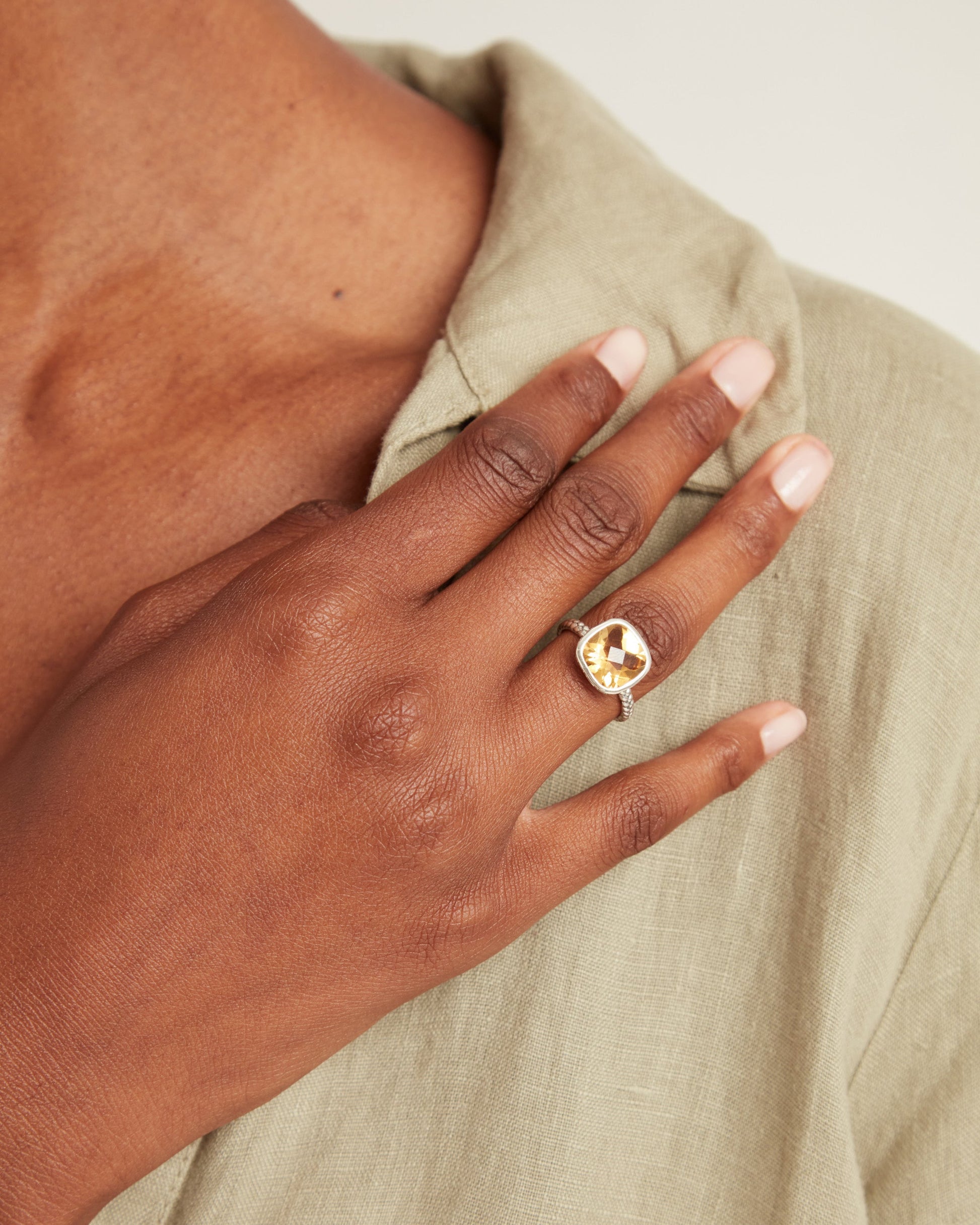 The Stone Ring embodies timeless elegance, showcasing a square faceted citrine stone nestled in sterling silver with an intricate petroglyph texture. Appreciate the subtle twisted detailing along the band, enhancing its charm. Whether worn solo for a classic statement or stacked with other rings for a bolder appearance, this piece adds a touch of sophistication to any ensemble.