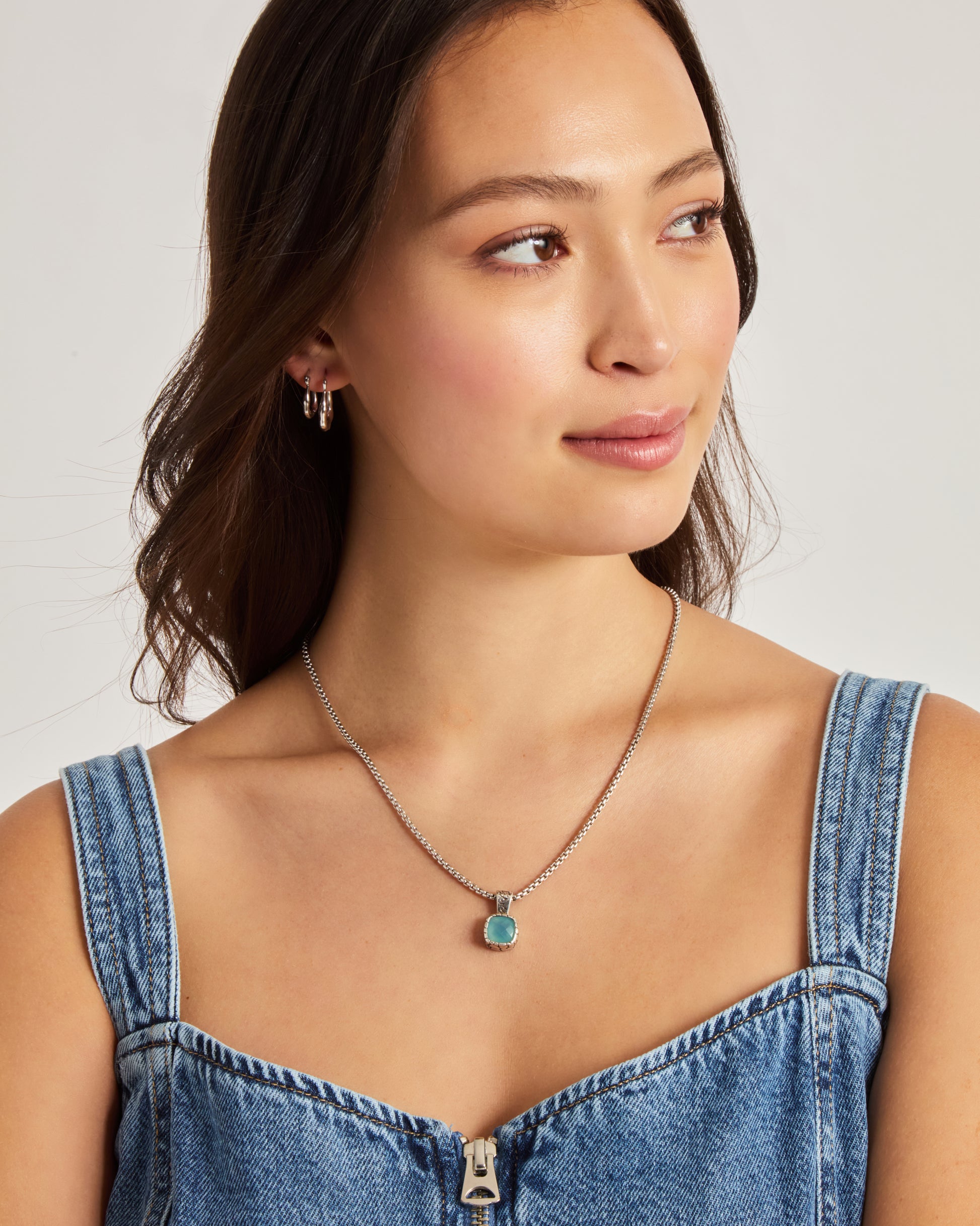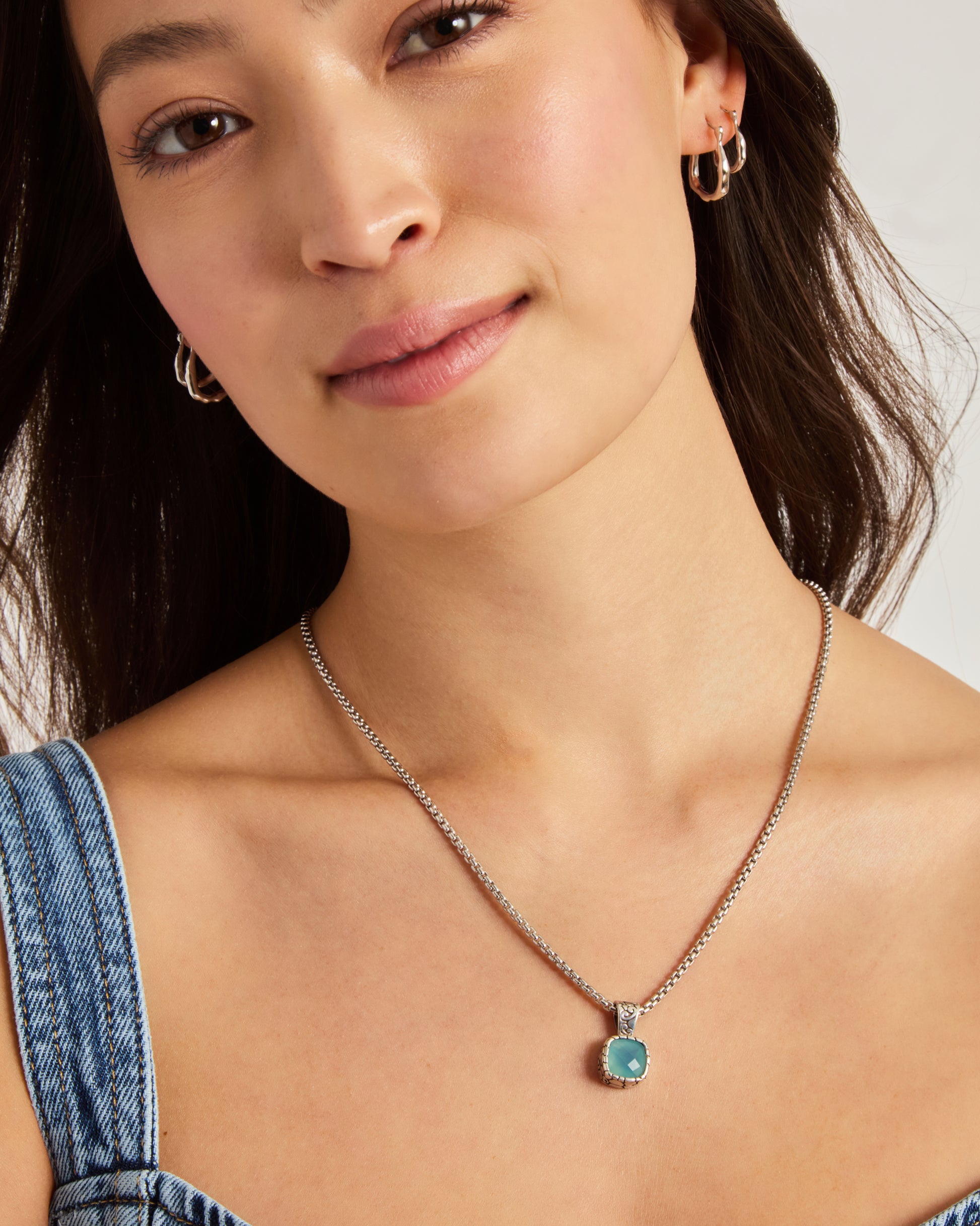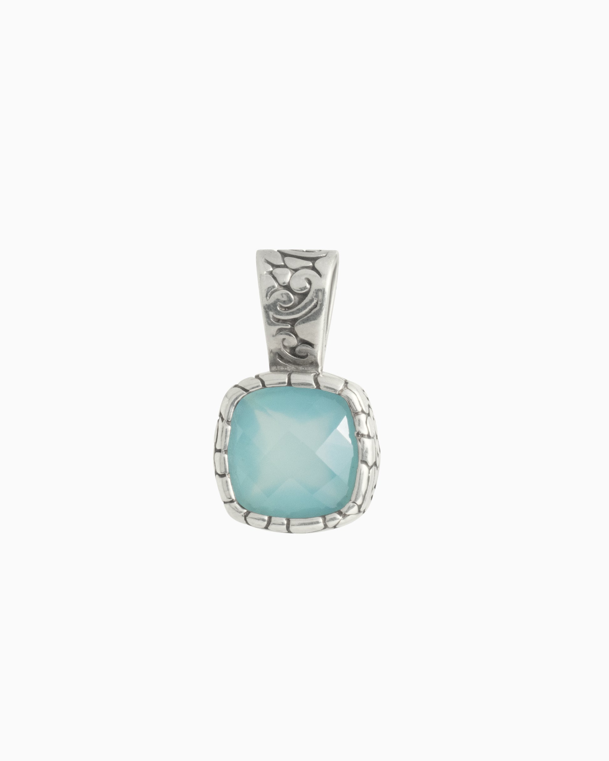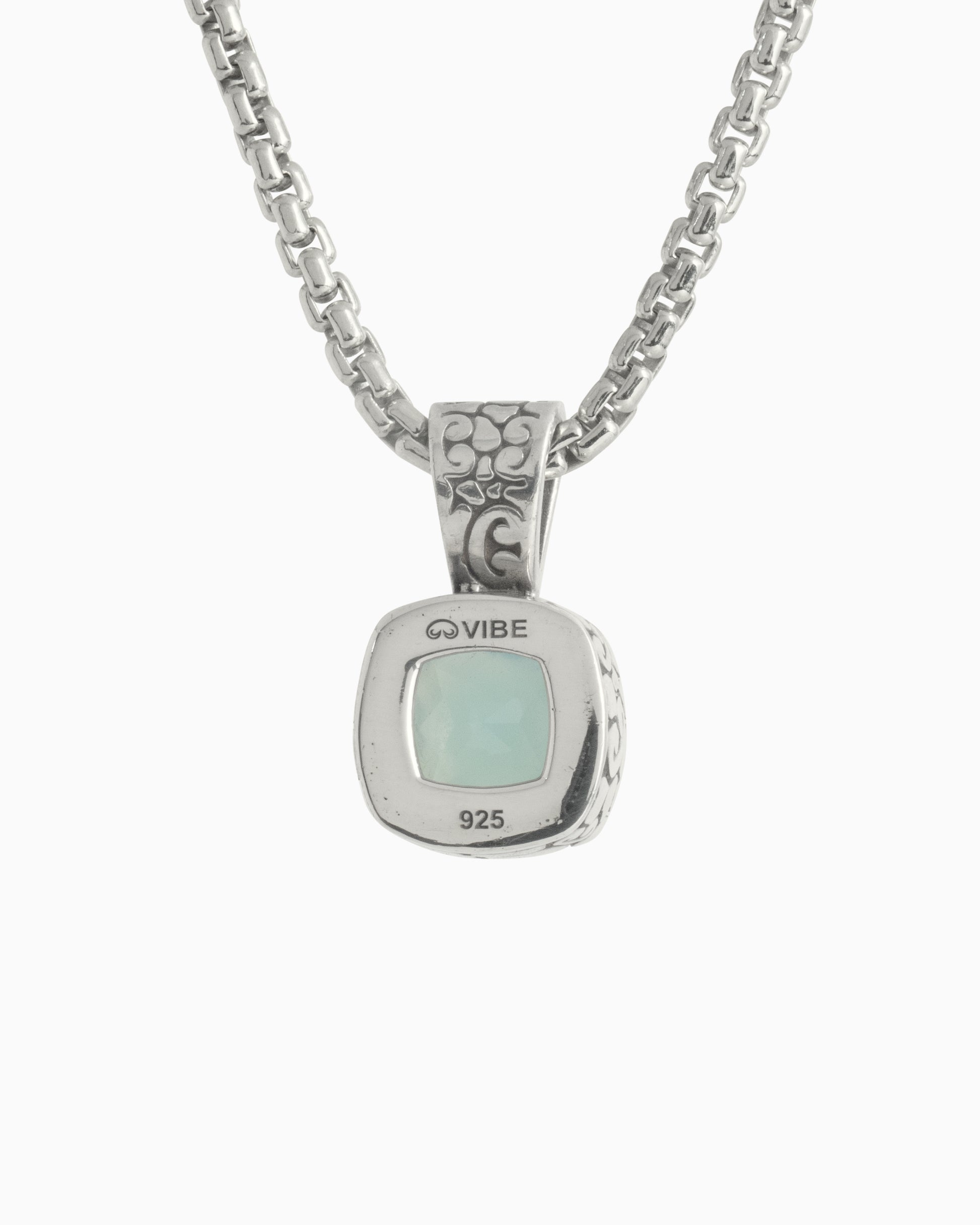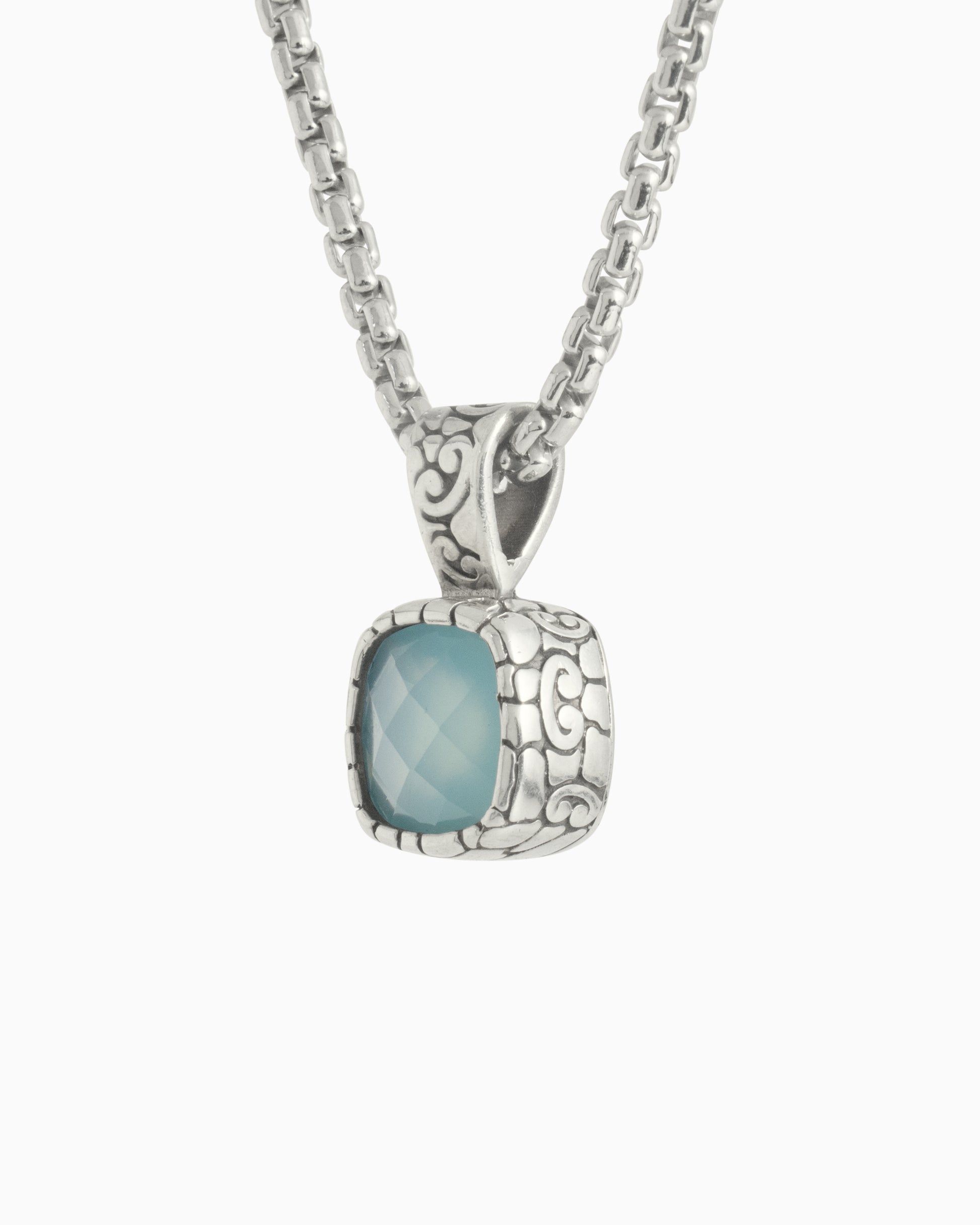 The Supreme Stone Pendant is handcrafted from sterling silver and the signature turtle texture with petroglyphs on the setting and bail. Featuring a square faceted blue chalcedony stone, this is the perfect piece to add to your collection. Pair with your favorite chain, sold separately.