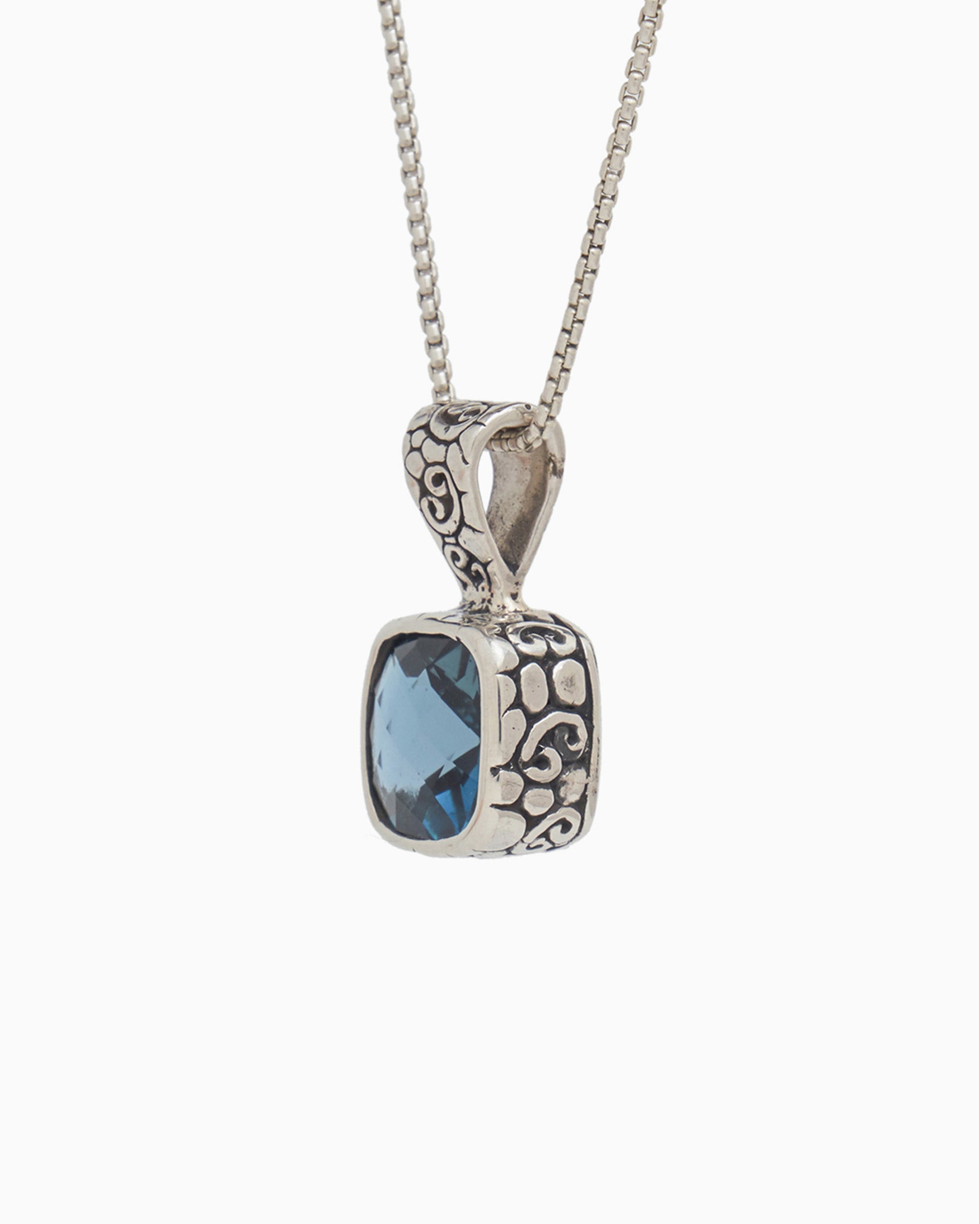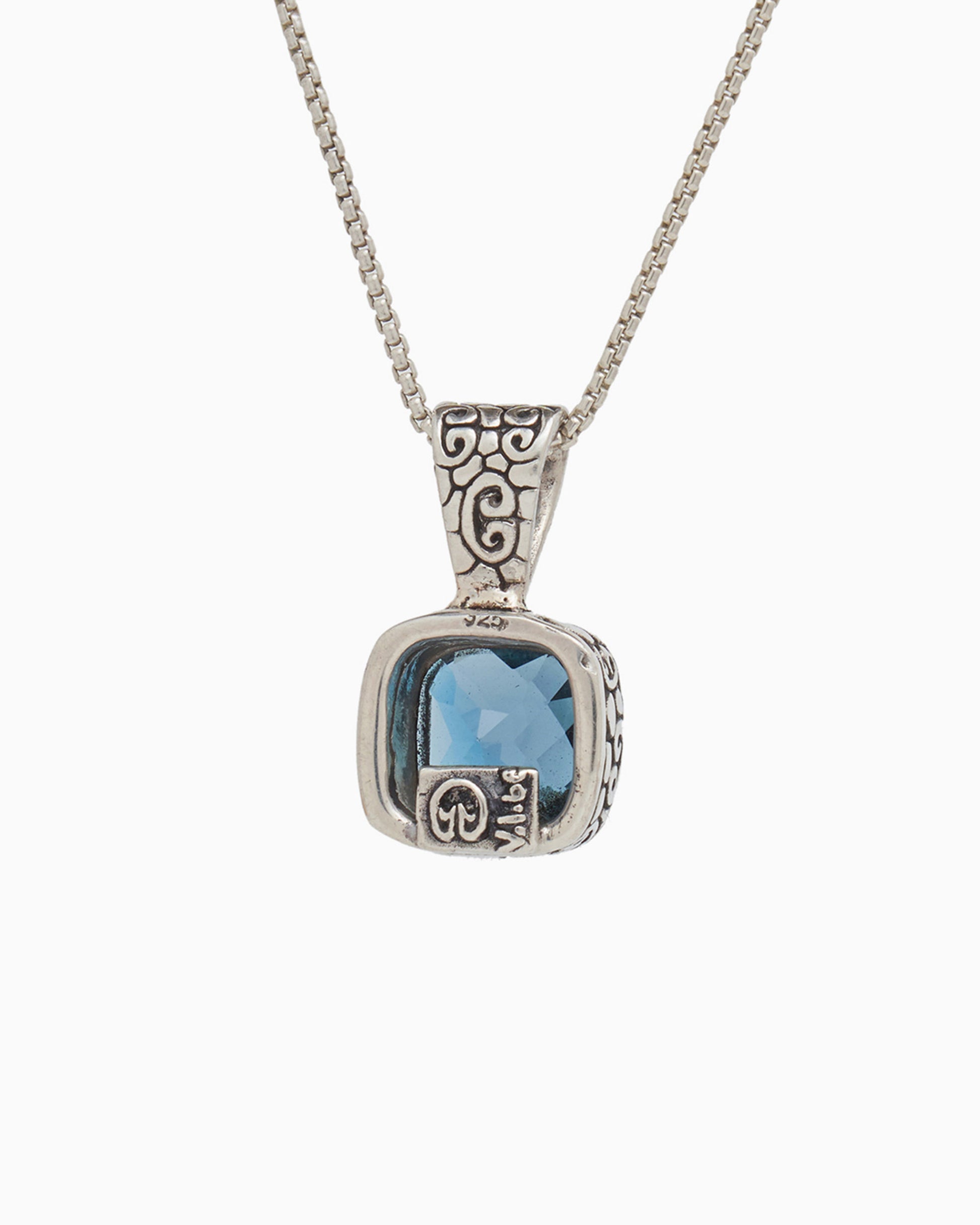 The Supreme Stone Pendant is handcrafted from sterling silver and the signature turtle texture with petroglyphs on the setting and bail. Featuring a square faceted London blue topaz stone, this is the perfect piece to add to your collection. Pair with your favorite chain, sold separately.