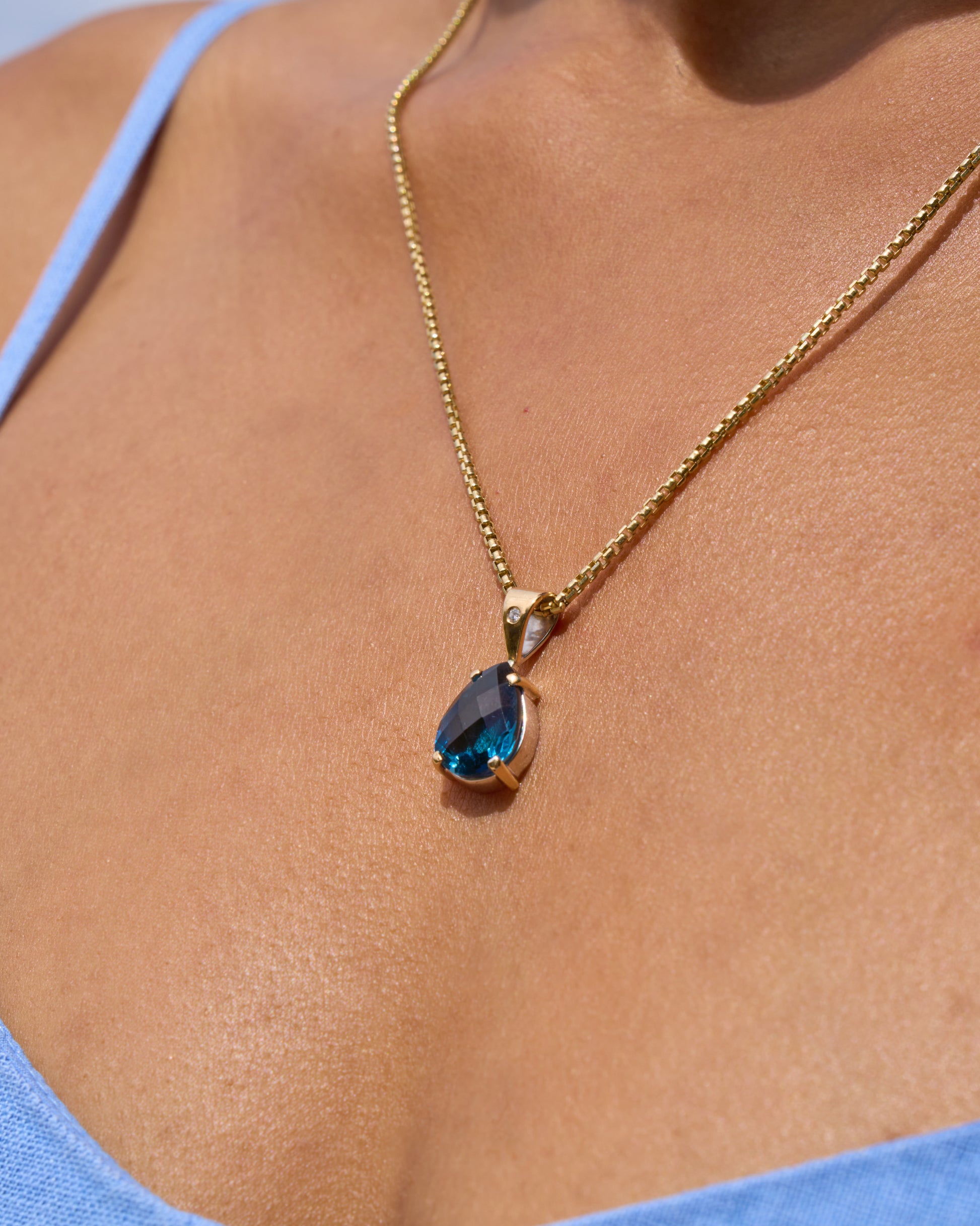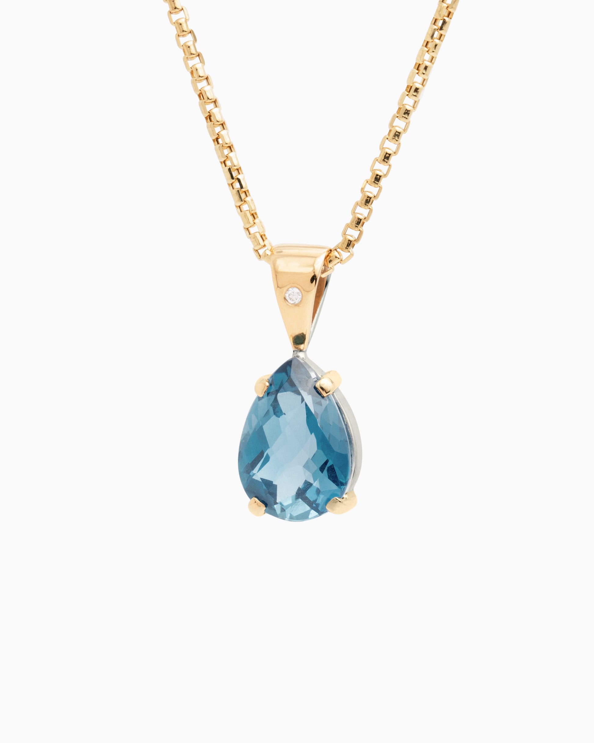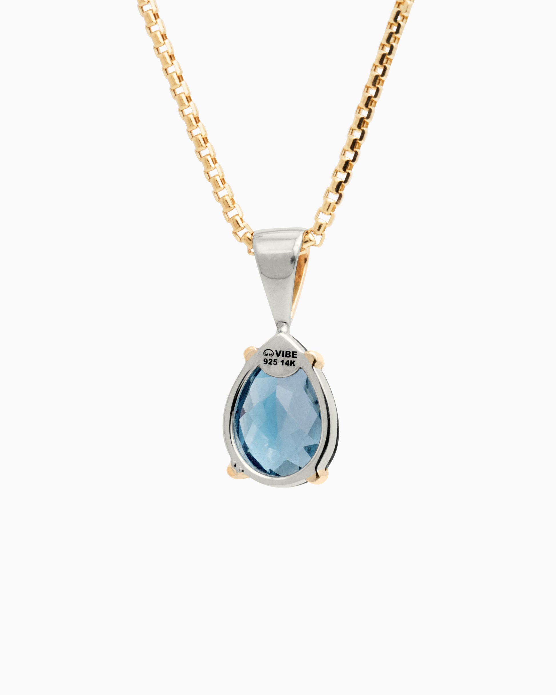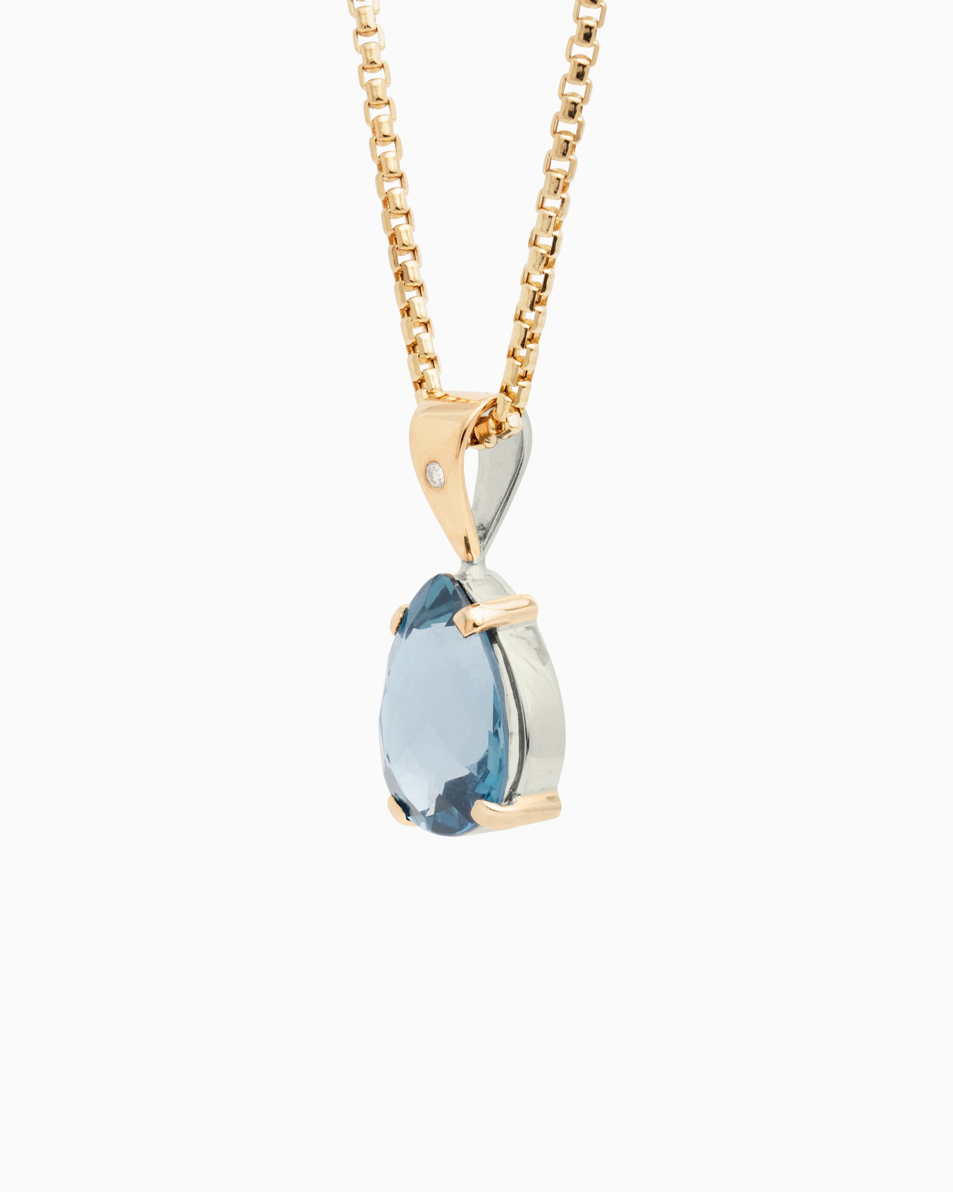 The Teardrop Pendant is a stunning day-to-night piece, handcrafted in sterling silver and 14K solid gold. It features a teardrop-shaped London blue topaz stone and a diamond set in the center of the bail for an elegant finishing touch. Pair with your favorite chain, sold separately.