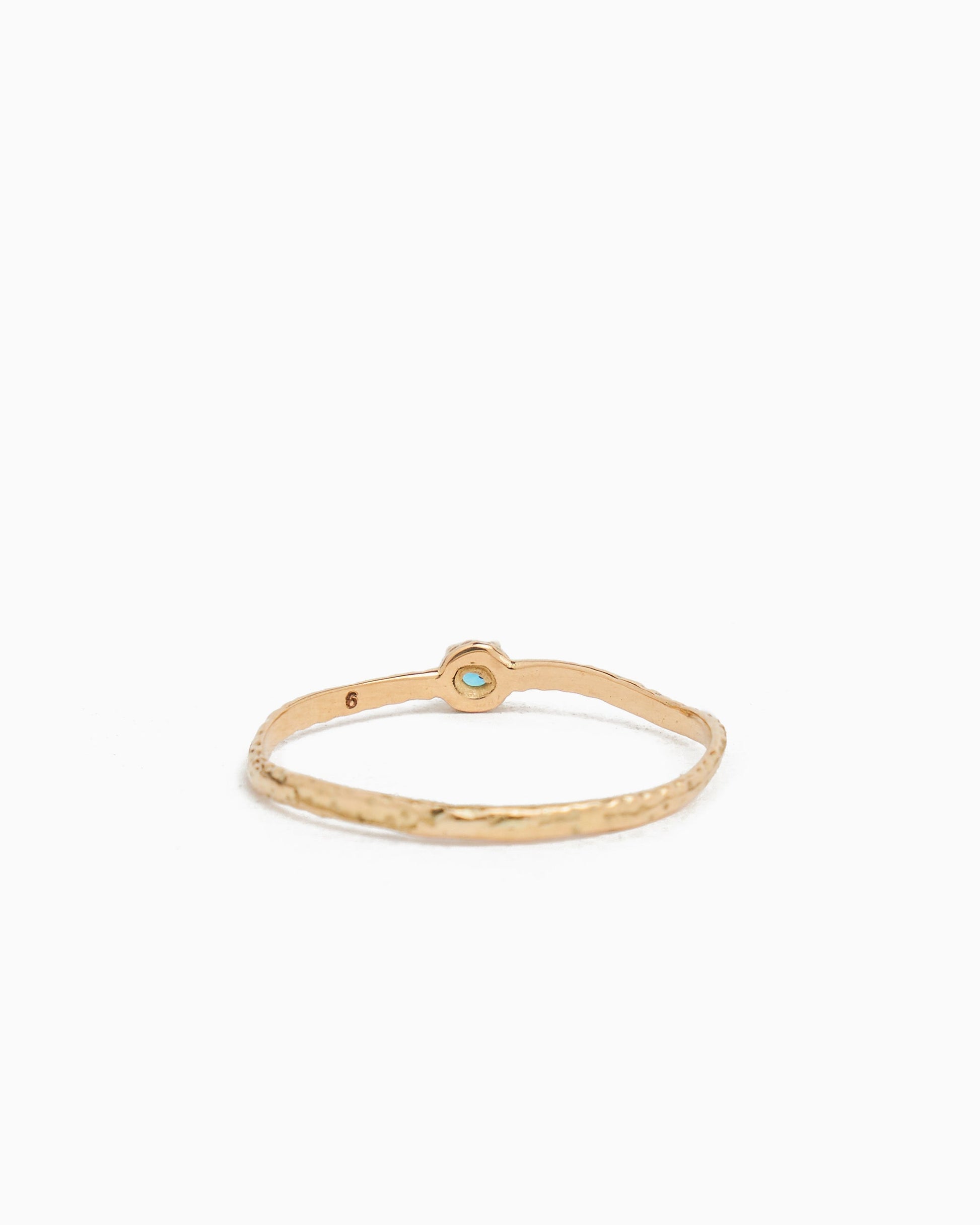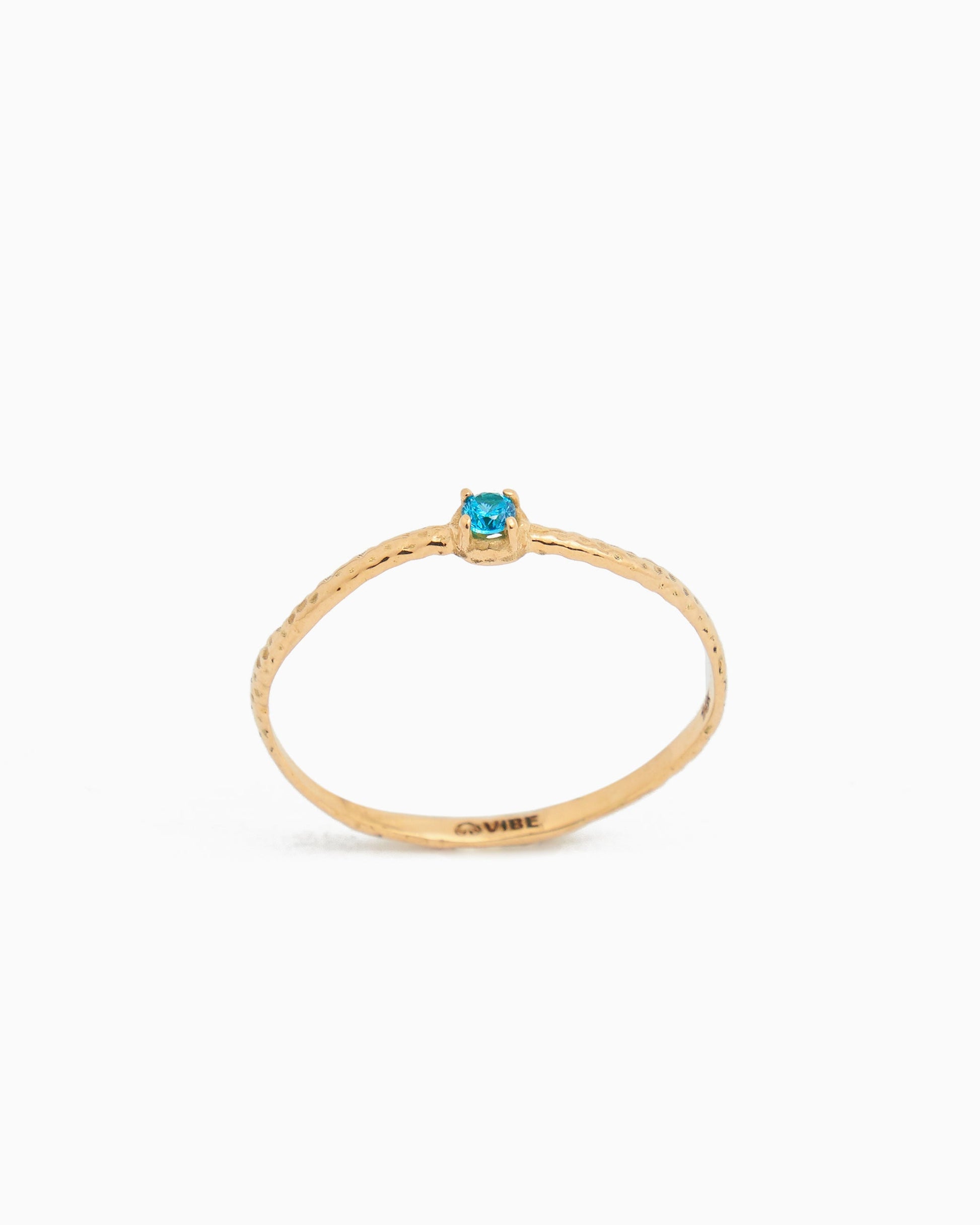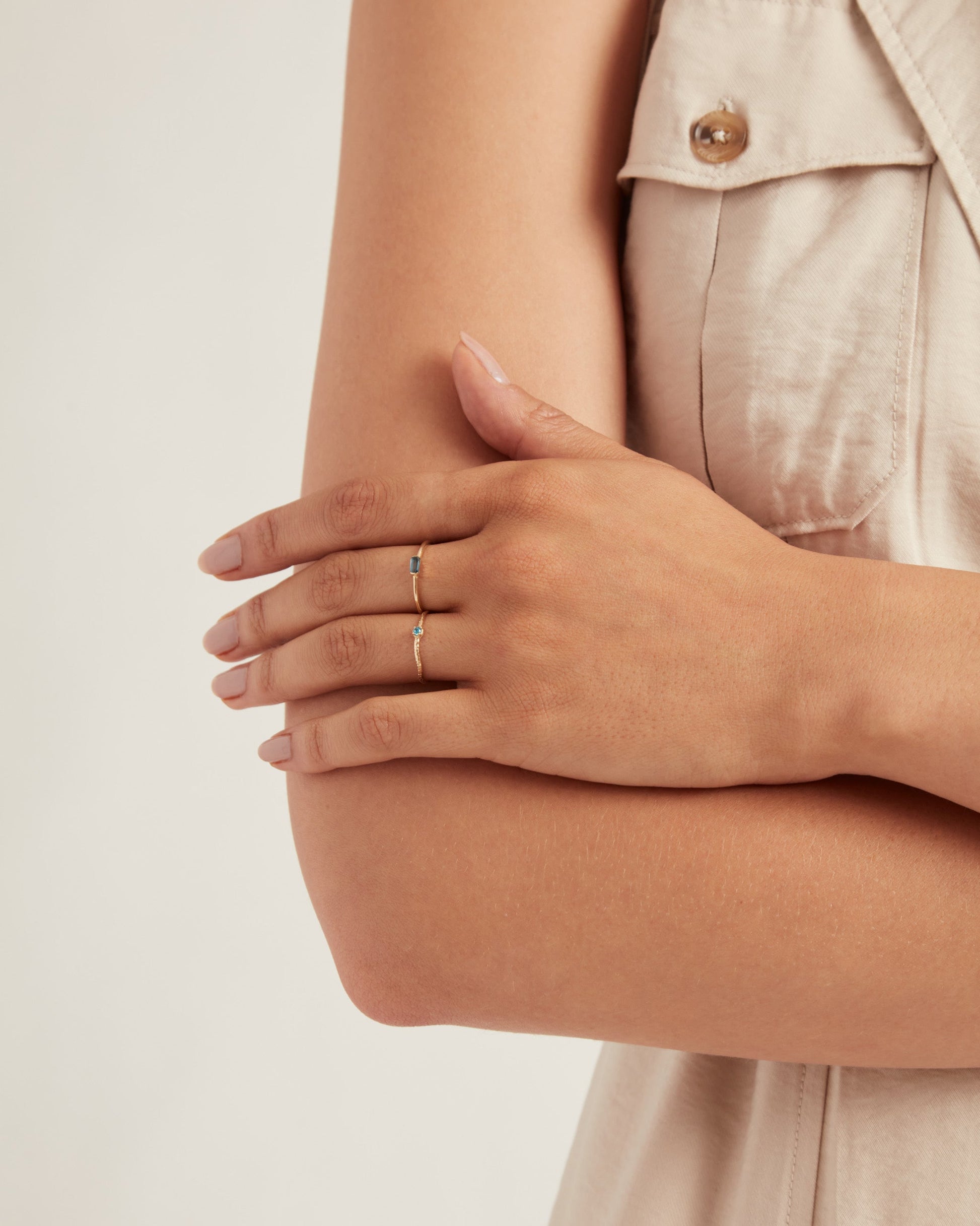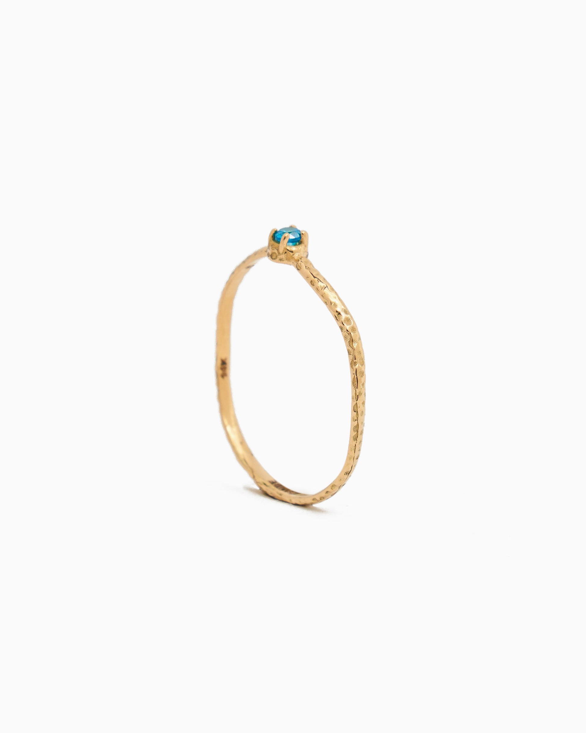 A must-have in your collection, the Textured Stacker Ring is handcrafted in 14K solid gold and designed for effortless stacking. This dainty ring features a soft, wavy texture that enhances its shine and sparkle, beautifully showcasing a faceted blue zircon stone. Whether worn solo or stacked with other favorites, this ring is sure to become a cherished piece.