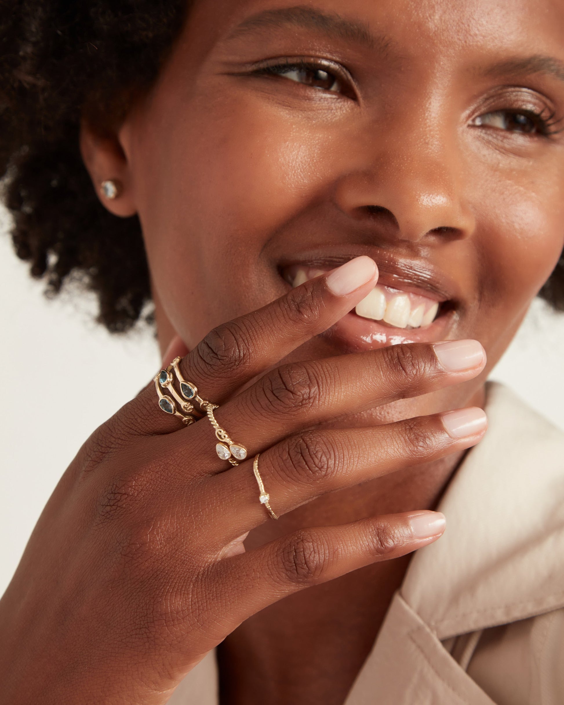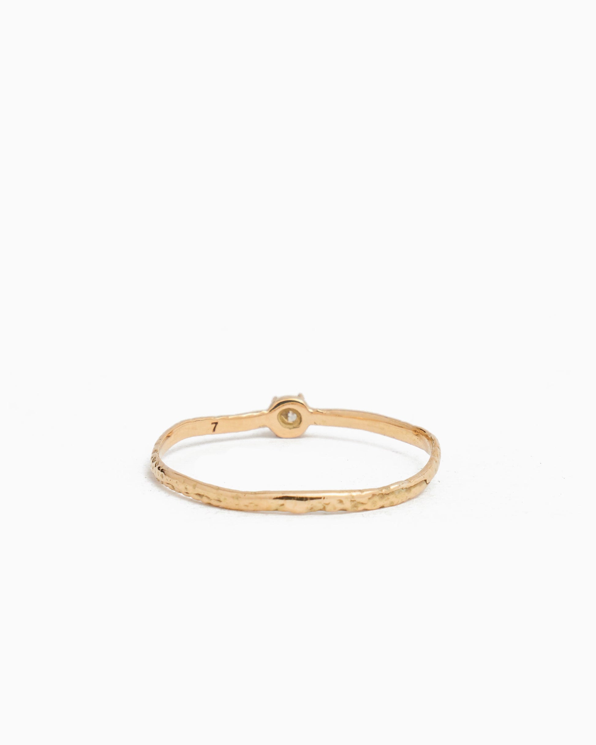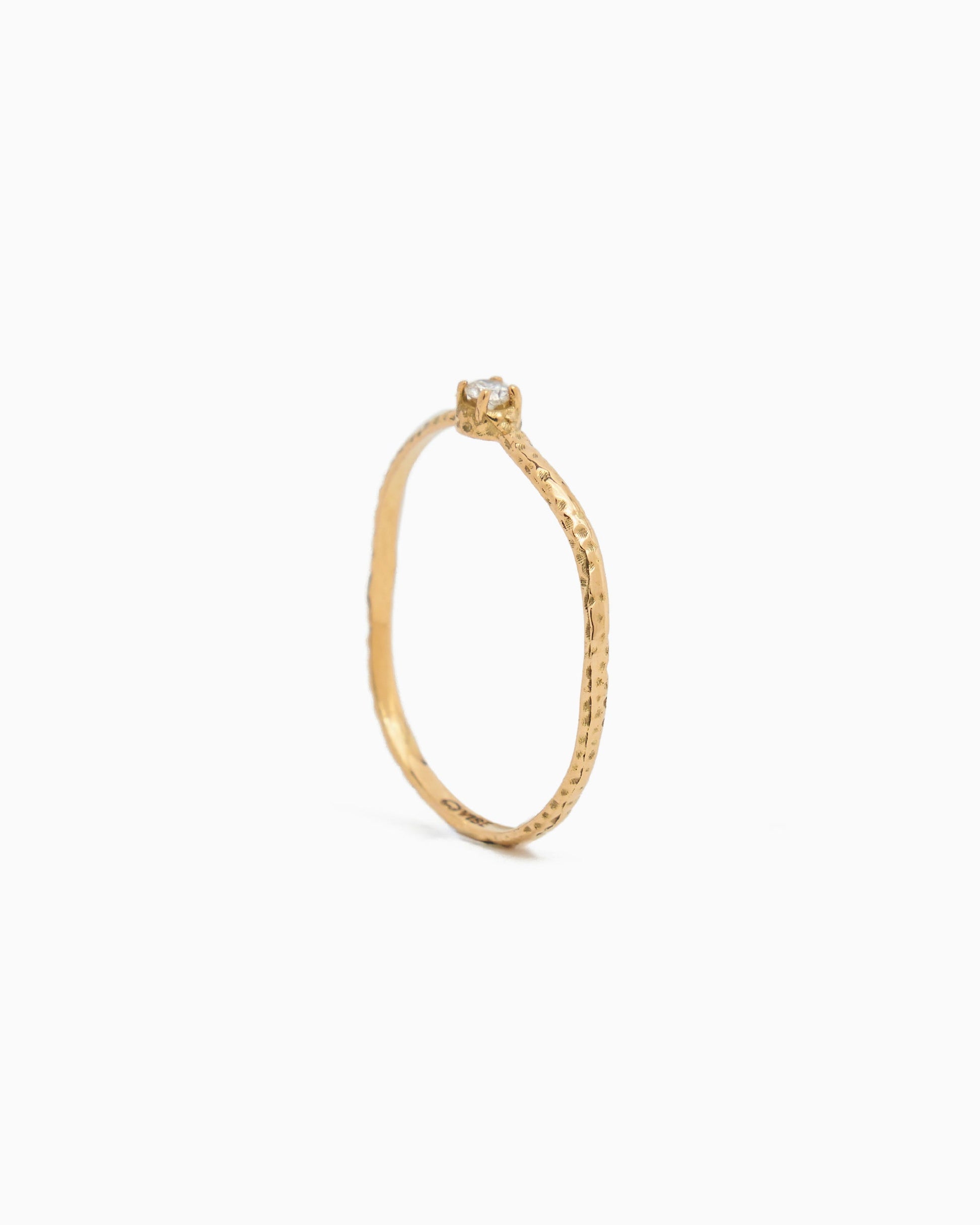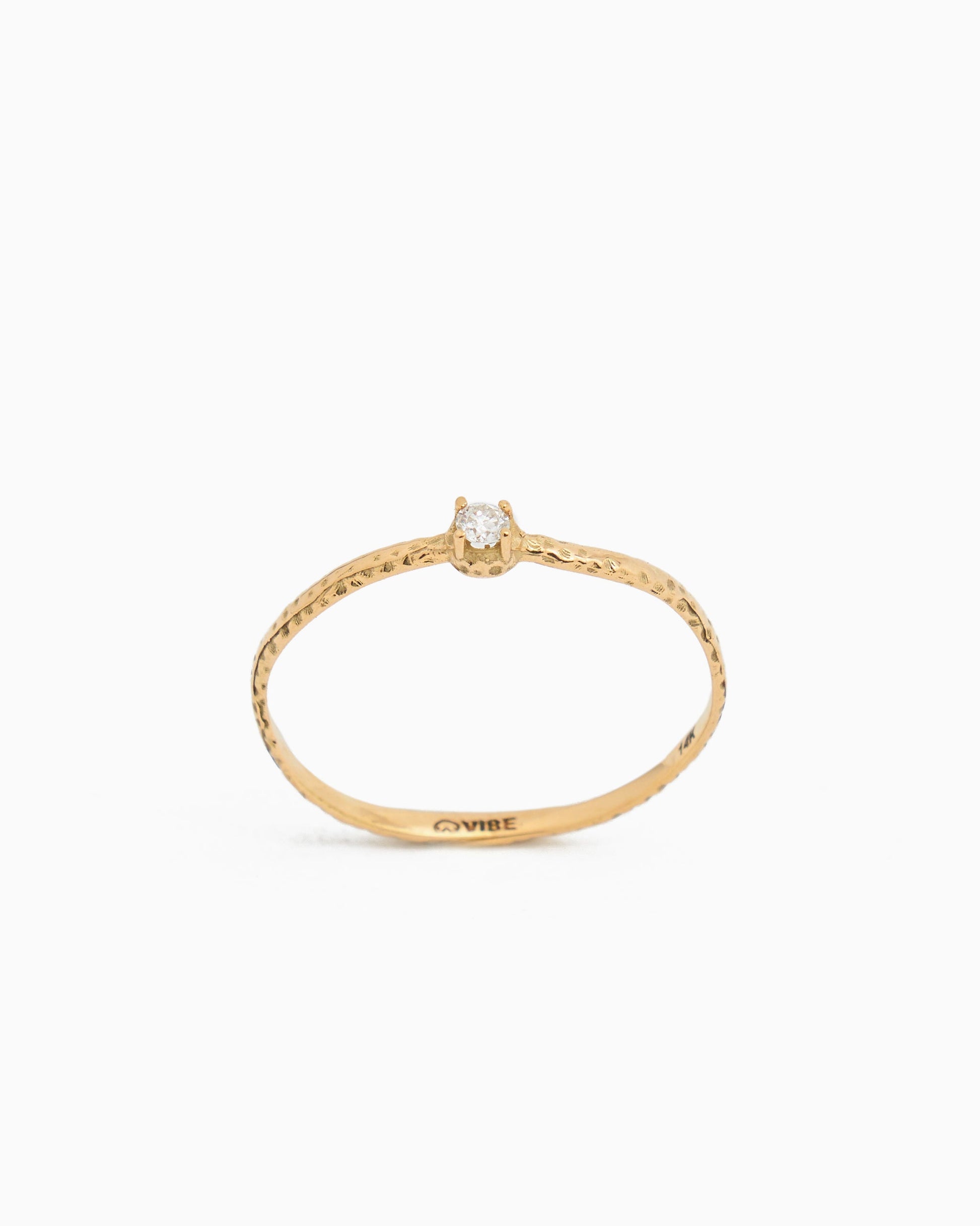 A must-have in your collection, the Textured Stacker Ring is handcrafted in 14K solid gold and designed for effortless stacking. This dainty ring features a soft, wavy texture that enhances its shine and sparkle, beautifully showcasing a faceted diamond. Whether worn solo or stacked with other favorites, this ring is sure to become a cherished piece.