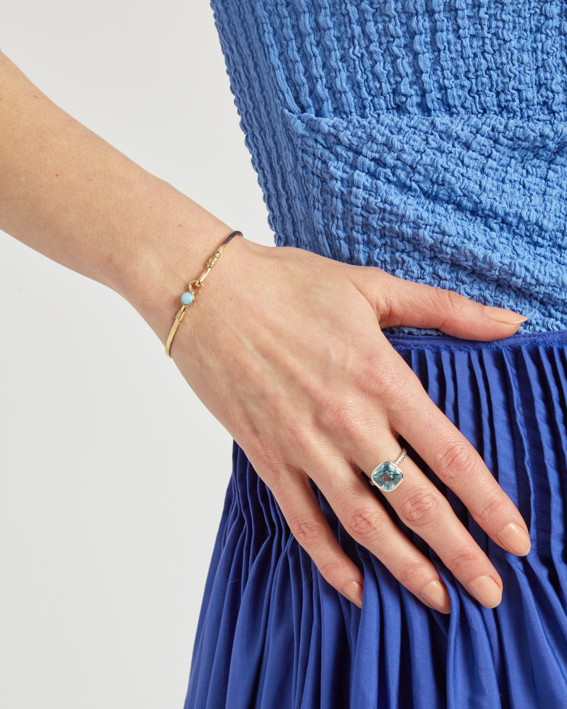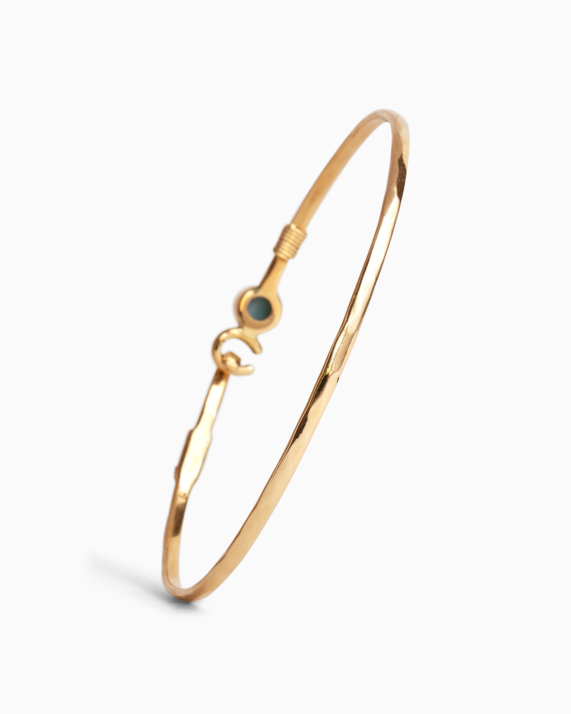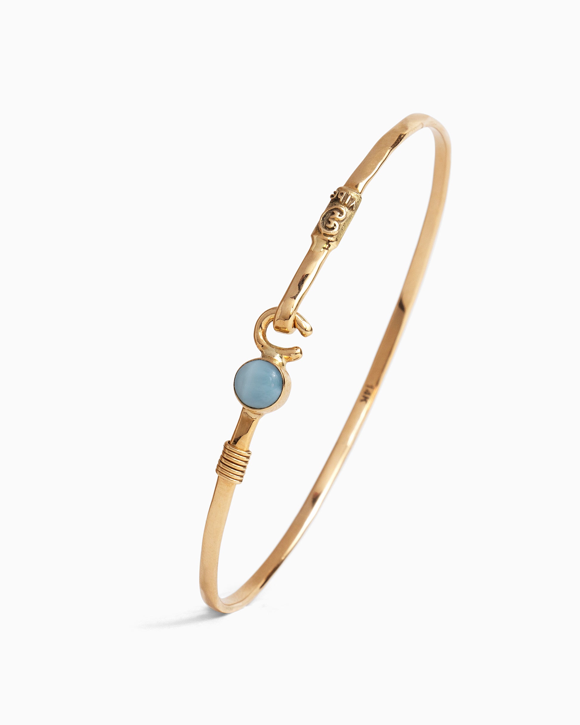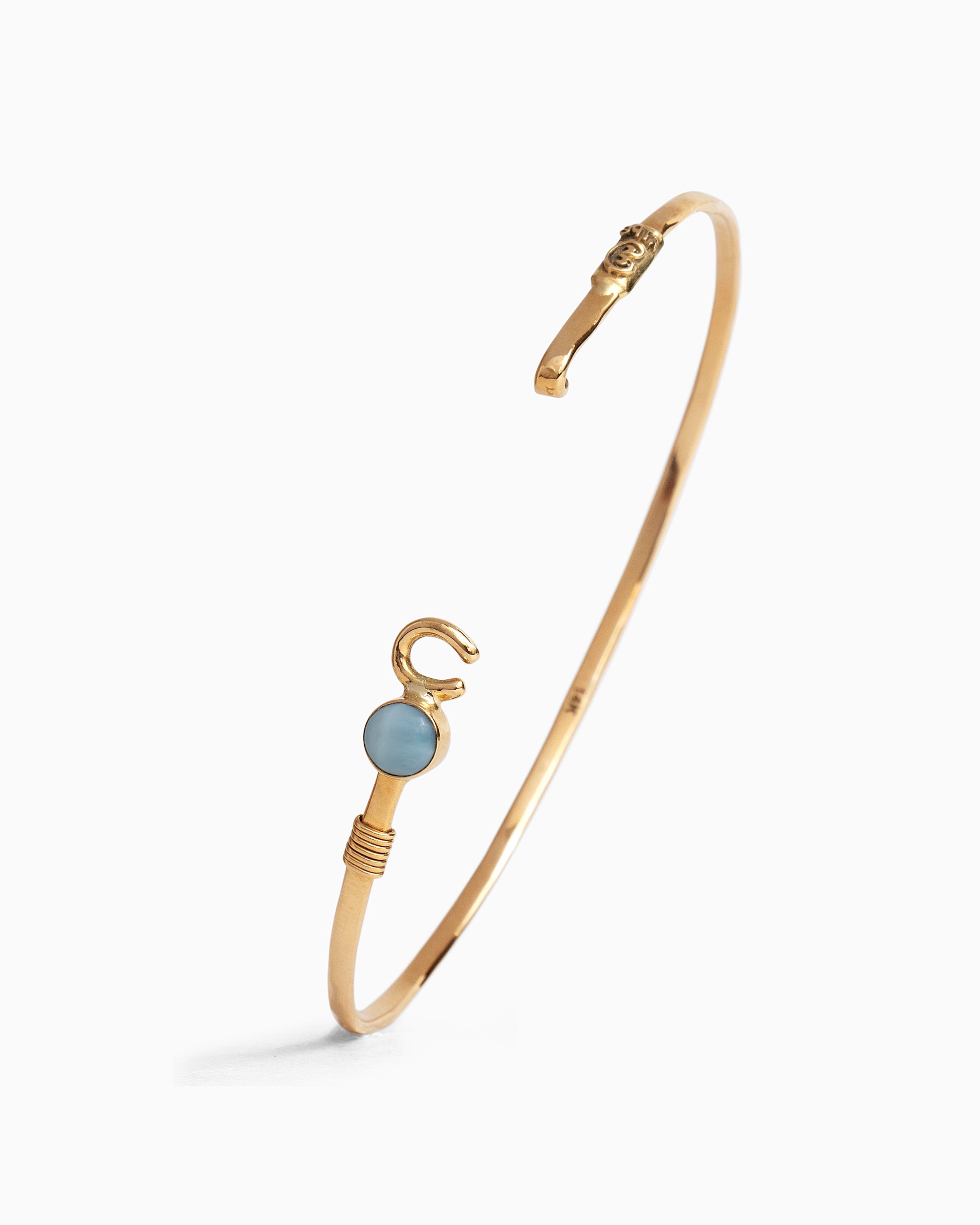 A Vibe signature, The Hook Bracelet with Stone is fashioned in gently hammered 14K solid gold with a larimar cabochon and "C" hook clasp. Featuring a replica of the St. John petroglyph and seven 14K gold good luck wraps, solo or stacked, it is sure to be a favorite piece. Found in many of our designs, Vibe’s seven good luck wraps represent love, laughter, happiness, good fortune, health, unity, and peace. In the Caribbean tradition, wear your hook facing in to keep love close to your heart, and facing out if you are open to a new love in your life. Wear this piece on its own or stack it with other bracelets for a layered look.