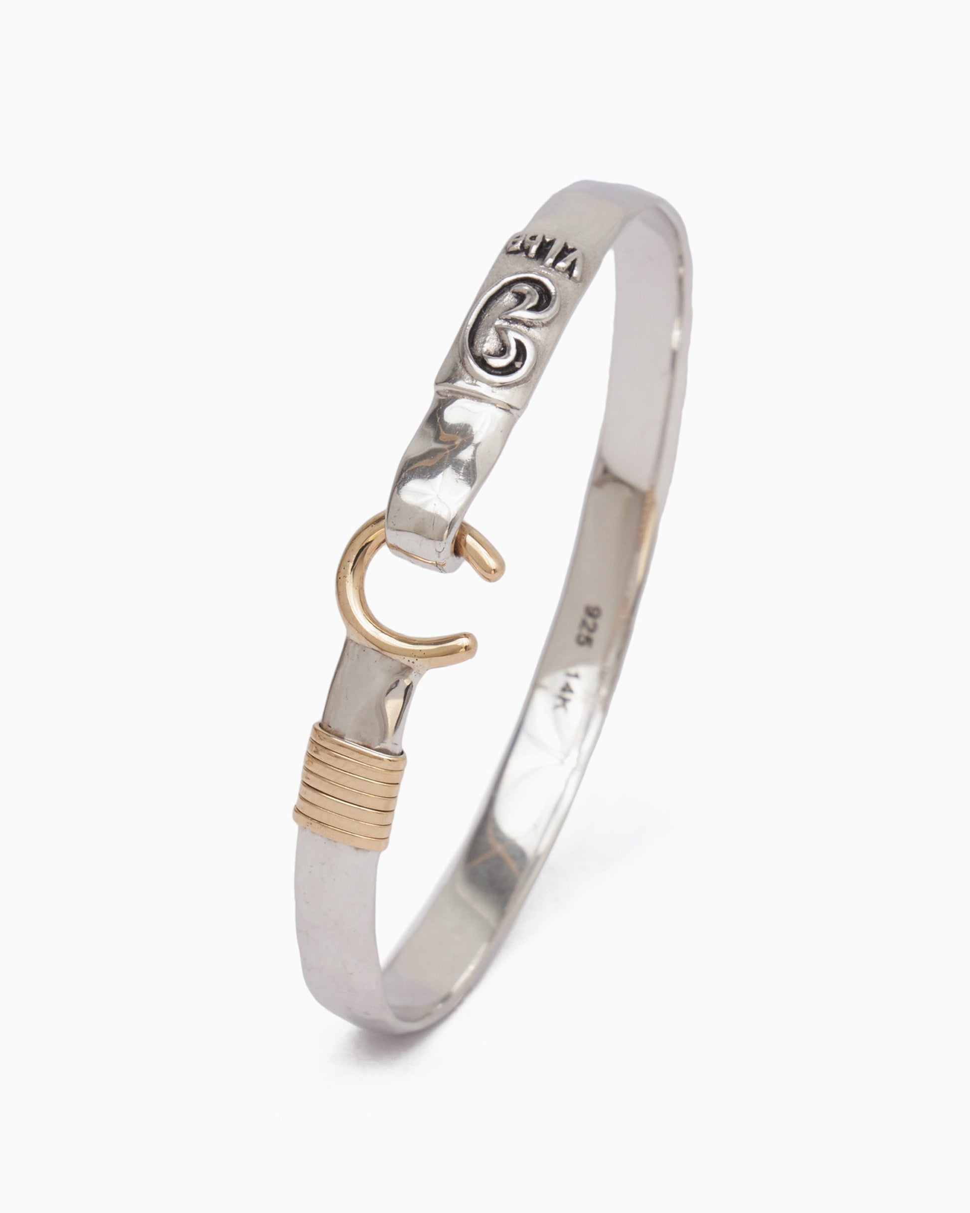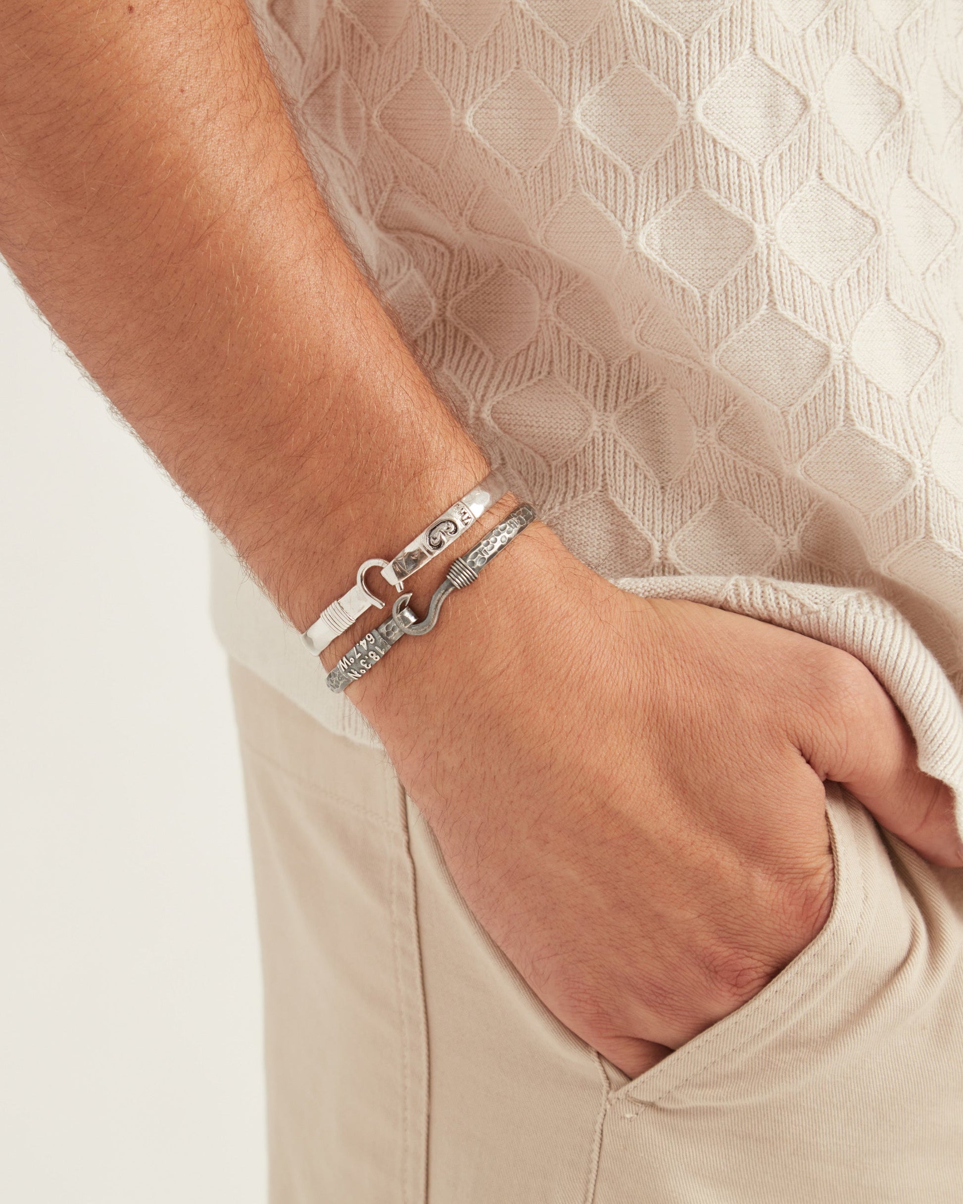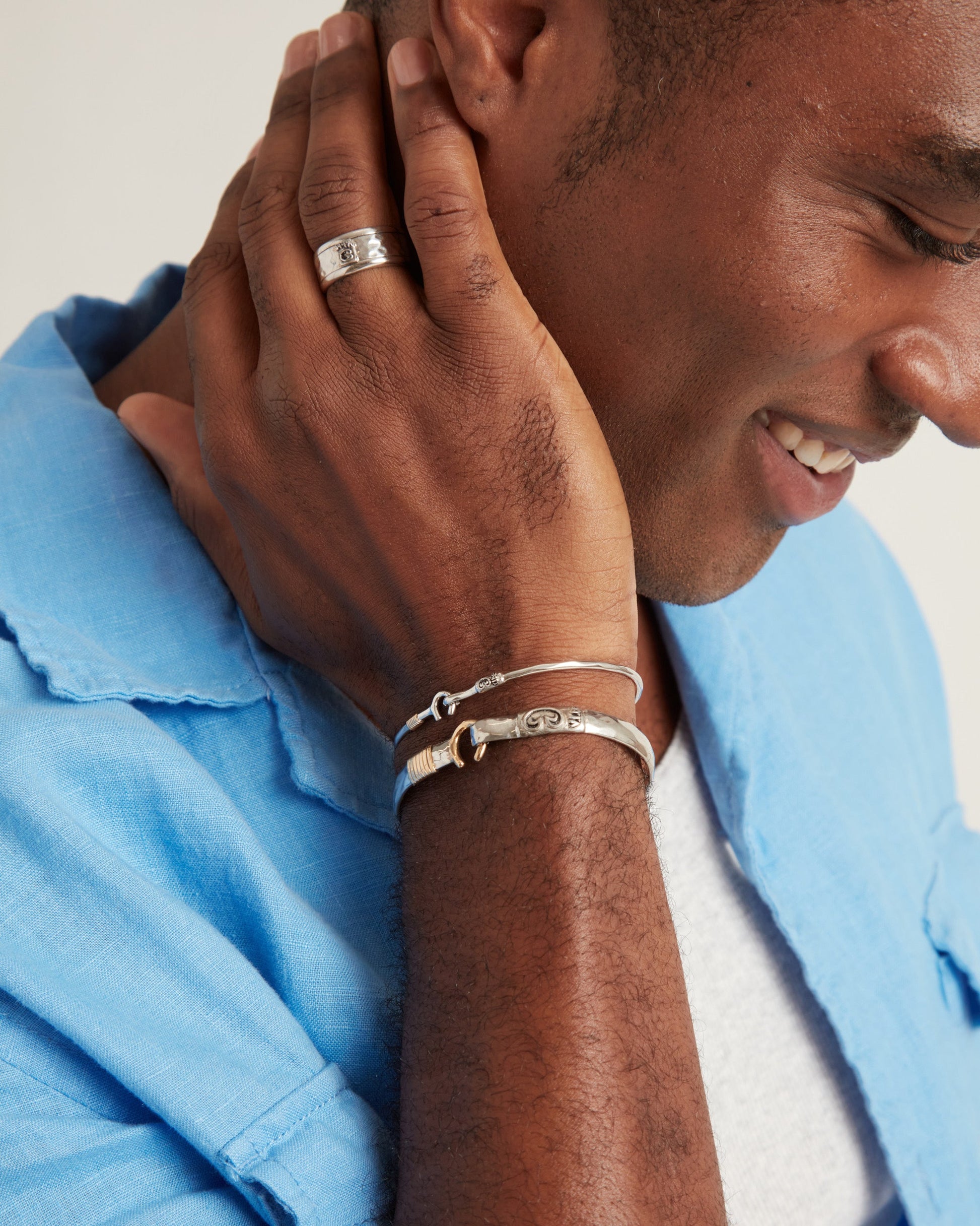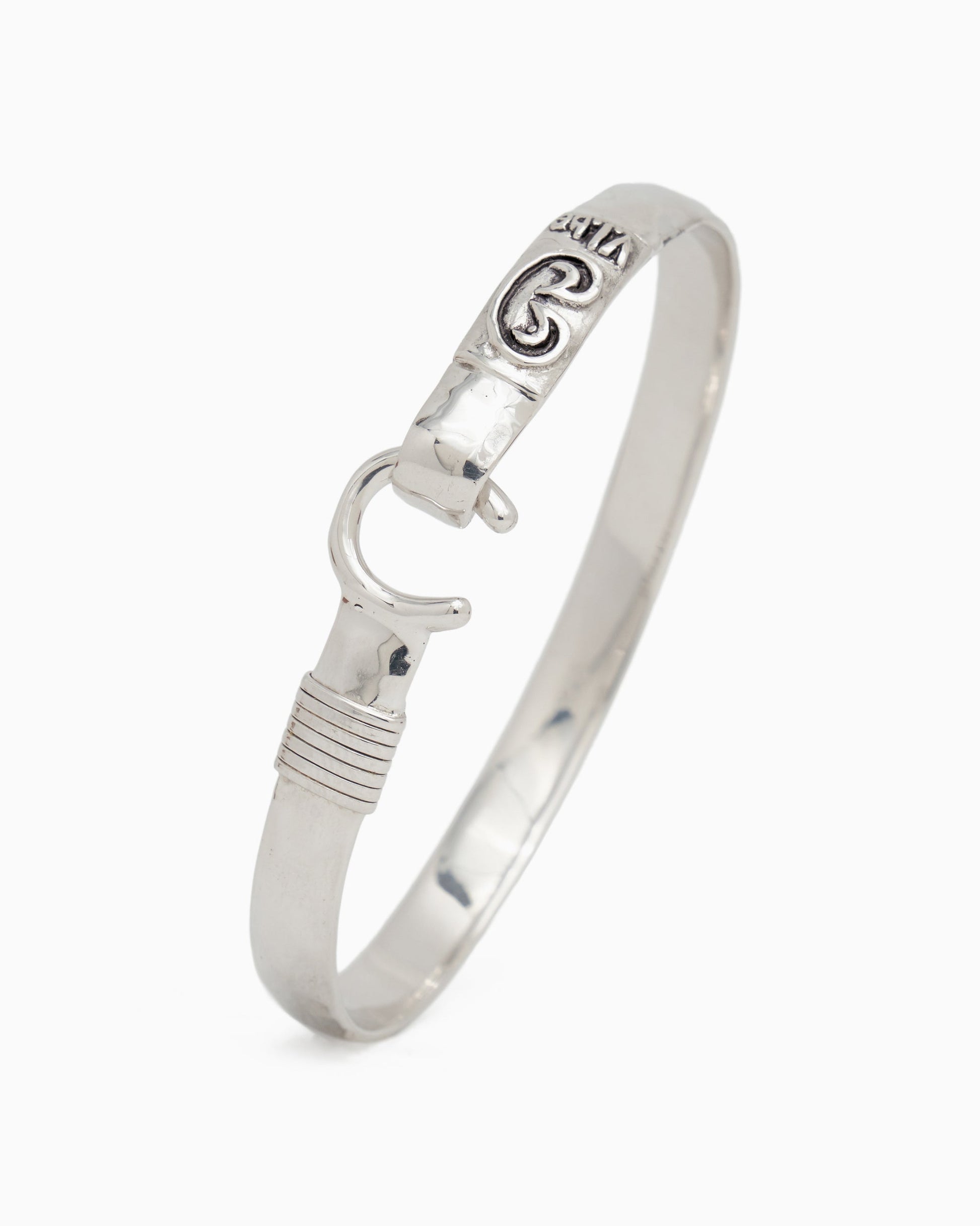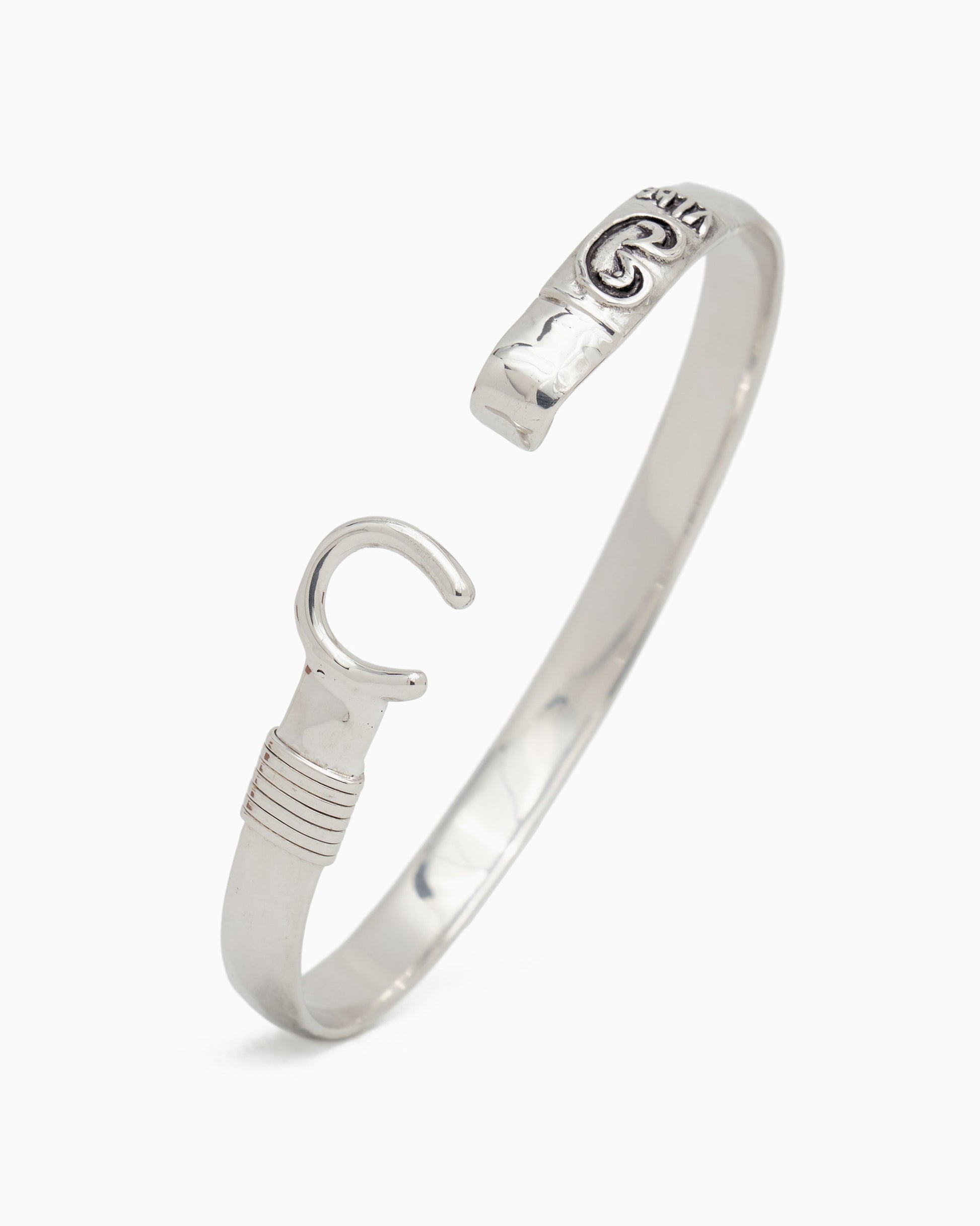 A Vibe signature, The Hook Bracelet is fashioned in gently hammered sterling silver with a "C" hook clasp. Featuring a replica of the St. John petroglyph and seven good luck wraps, solo or stacked, it is sure to be a favorite statement piece. Found in many of our designs, Vibe’s seven good luck wraps represent love, laughter, happiness, good fortune, health, unity, and peace. In the Caribbean tradition, wear your hook facing in to keep love close to your heart, and facing out if you are open to a new love in your life. Wear this piece on its own or stack it with other bracelets for a layered look. For added fun, embellish your new hook bracelet with one or more of Vibe's fun and unique charms!
