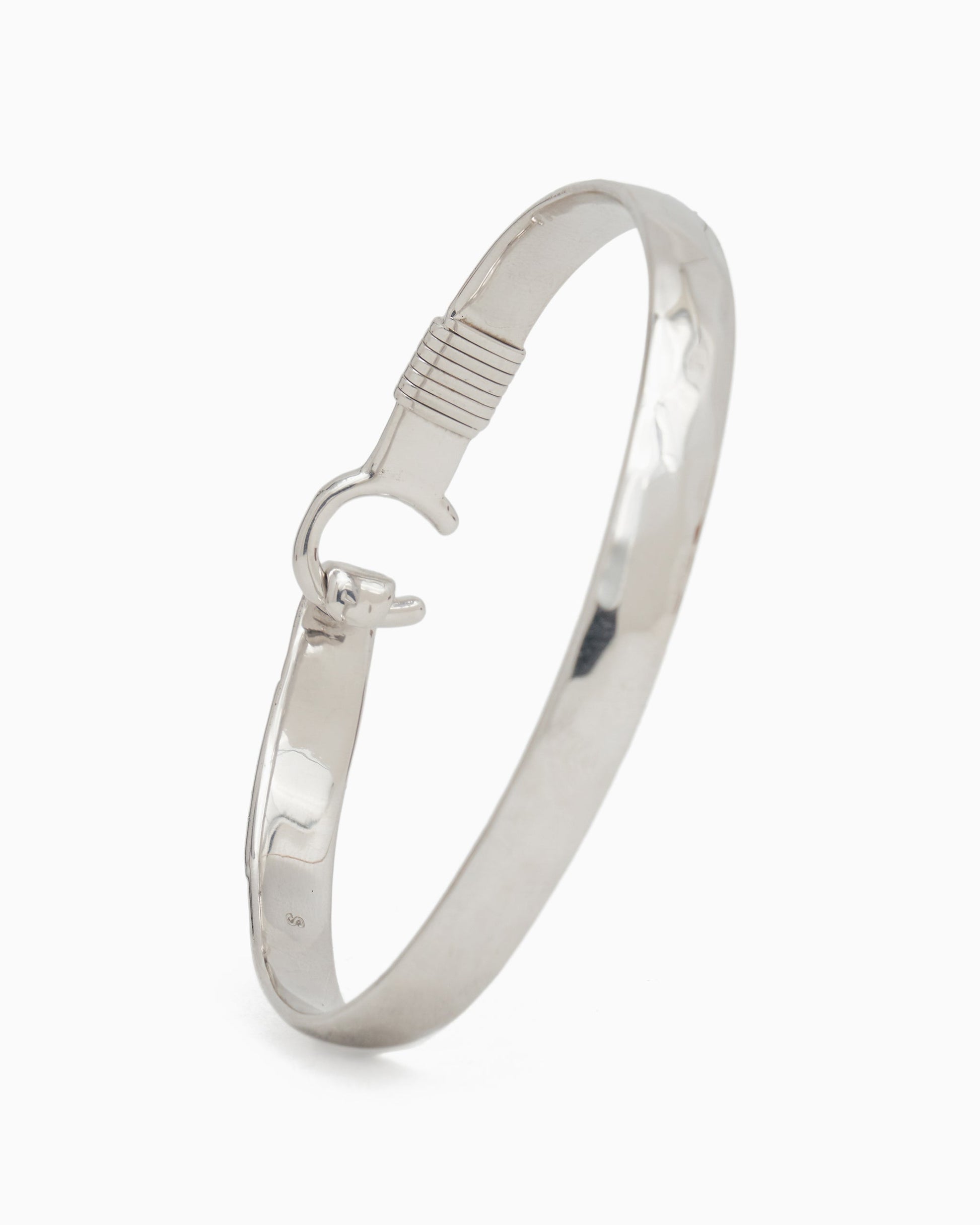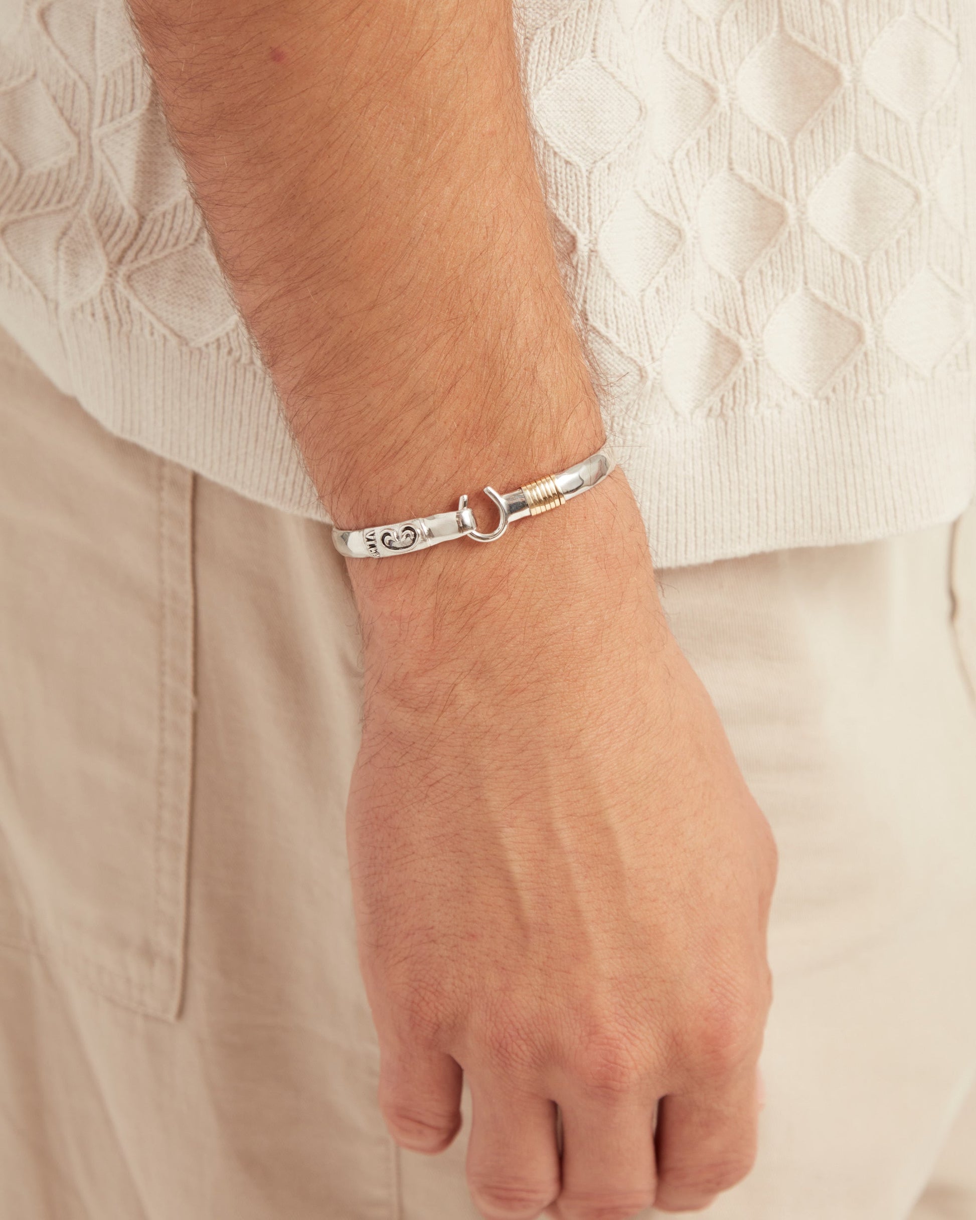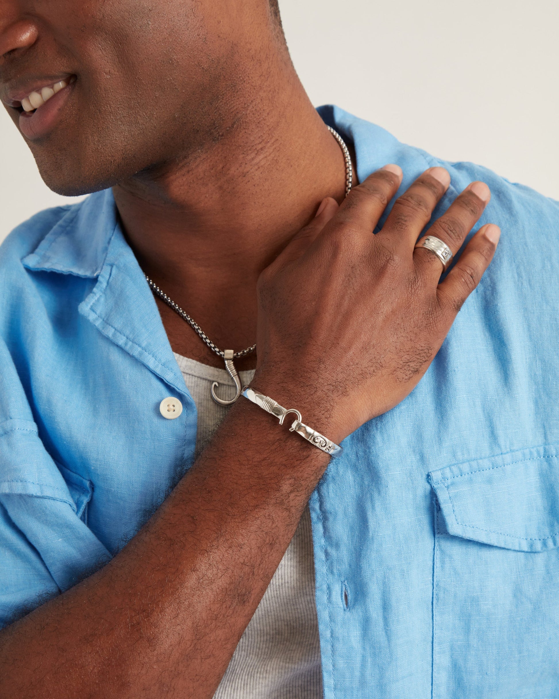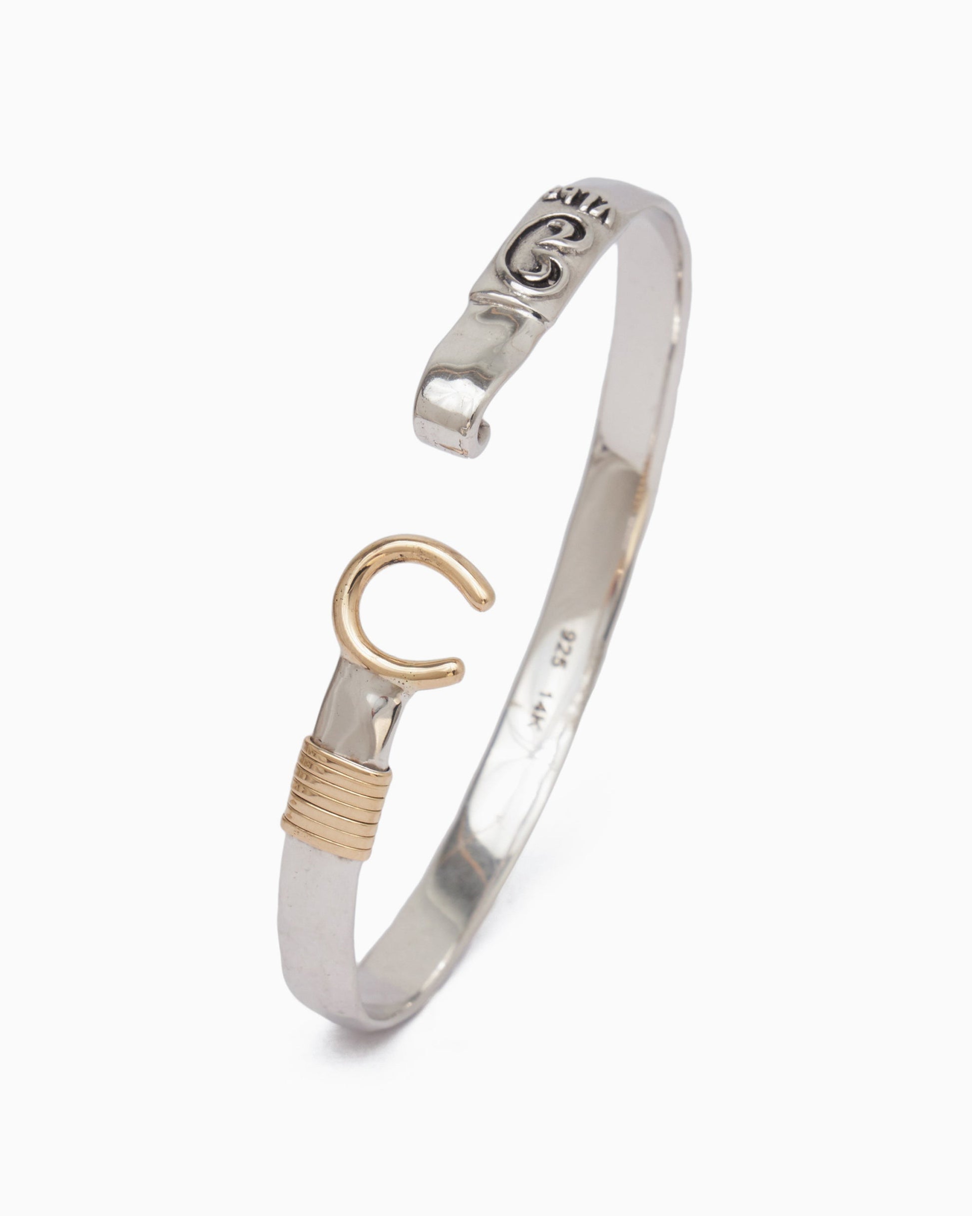 A Vibe signature, The Hook Bracelet is fashioned in gently hammered sterling silver with a "C" hook clasp. Featuring a replica of the St. John petroglyph and seven good luck wraps, solo or stacked, it is sure to be a favorite statement piece. Found in many of our designs, Vibe’s seven good luck wraps represent love, laughter, happiness, good fortune, health, unity, and peace. In the Caribbean tradition, wear your hook facing in to keep love close to your heart, and facing out if you are open to a new love in your life. Wear this piece on its own or stack it with other bracelets for a layered look. For added fun, embellish your new hook bracelet with one or more of Vibe's fun and unique charms!