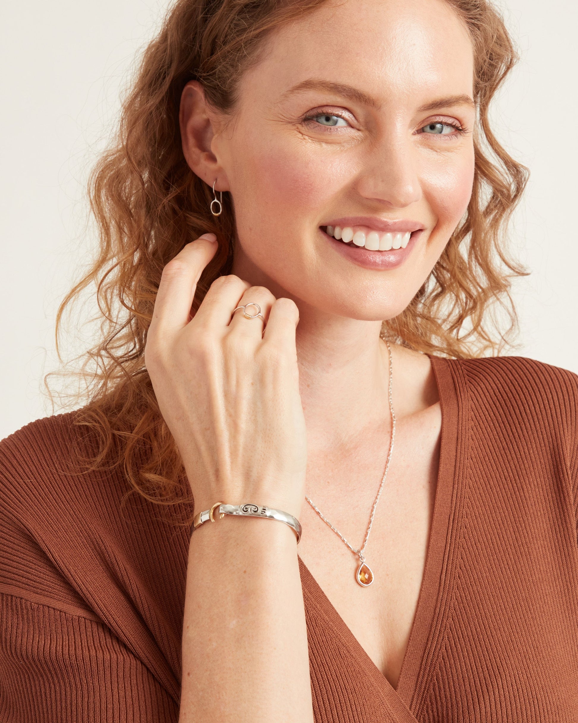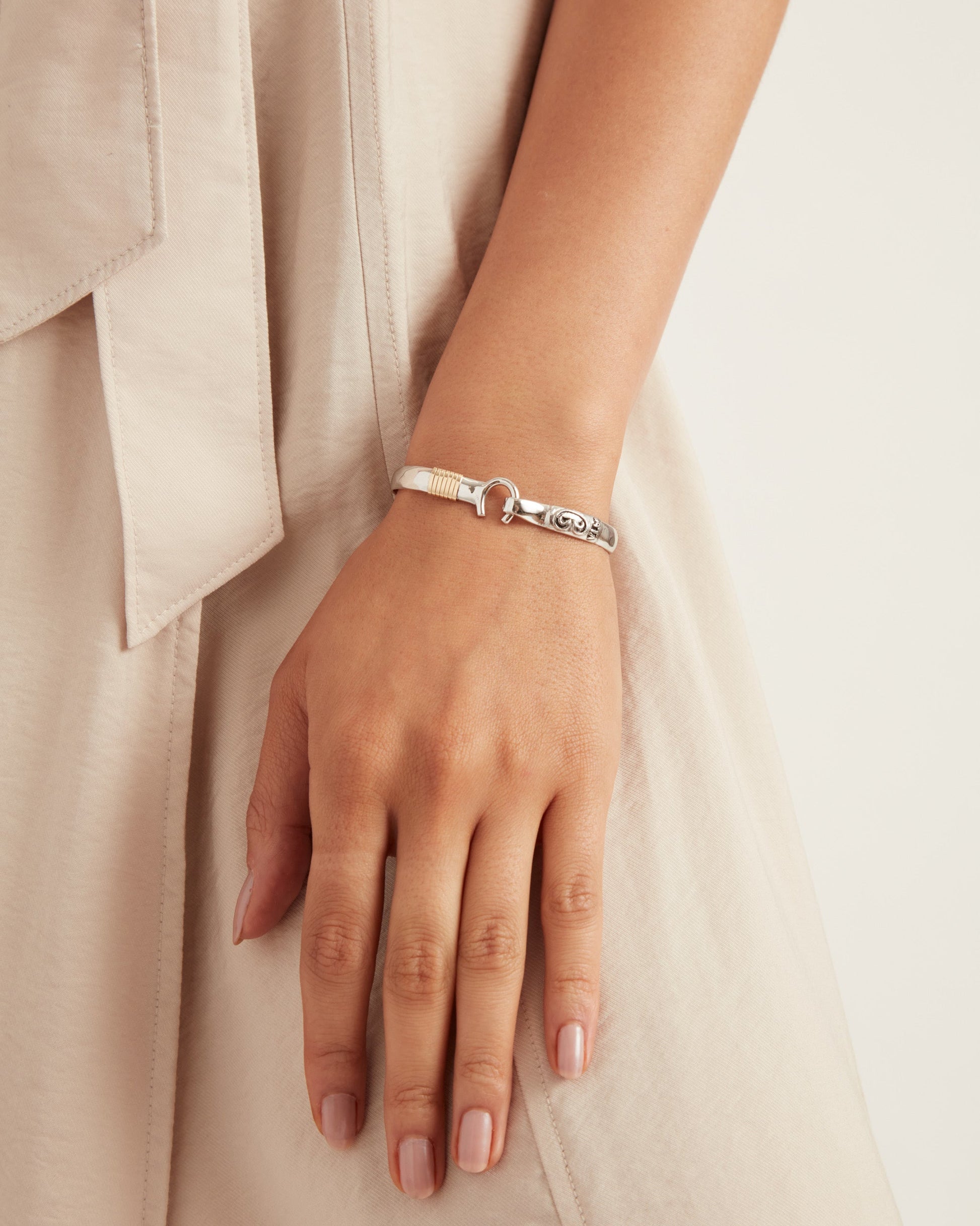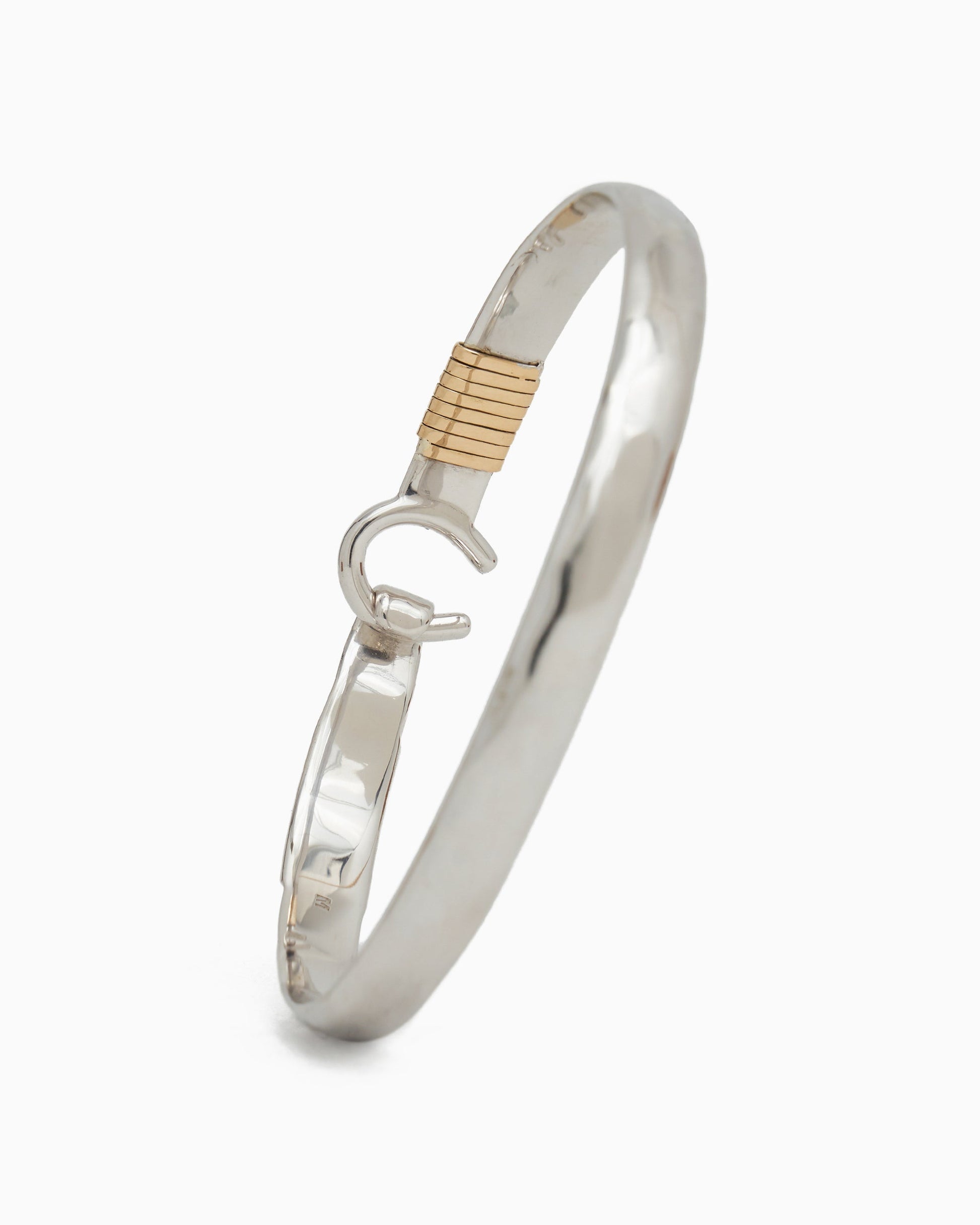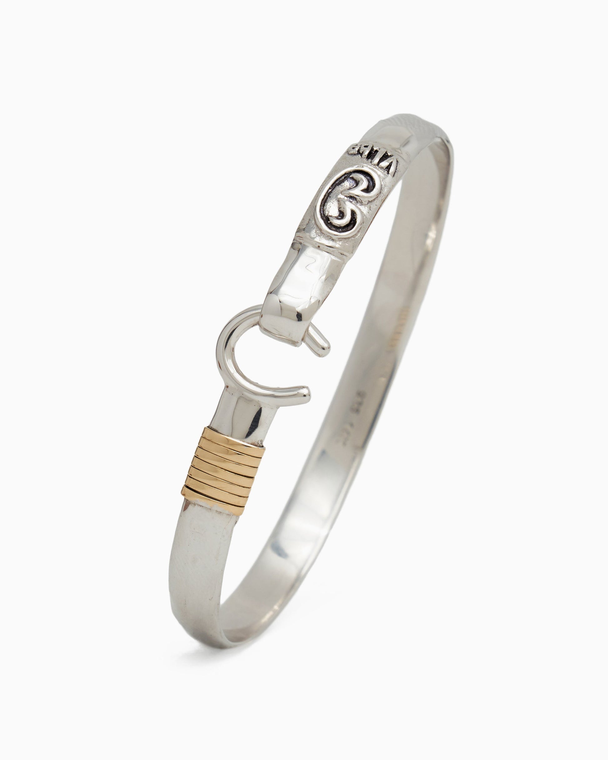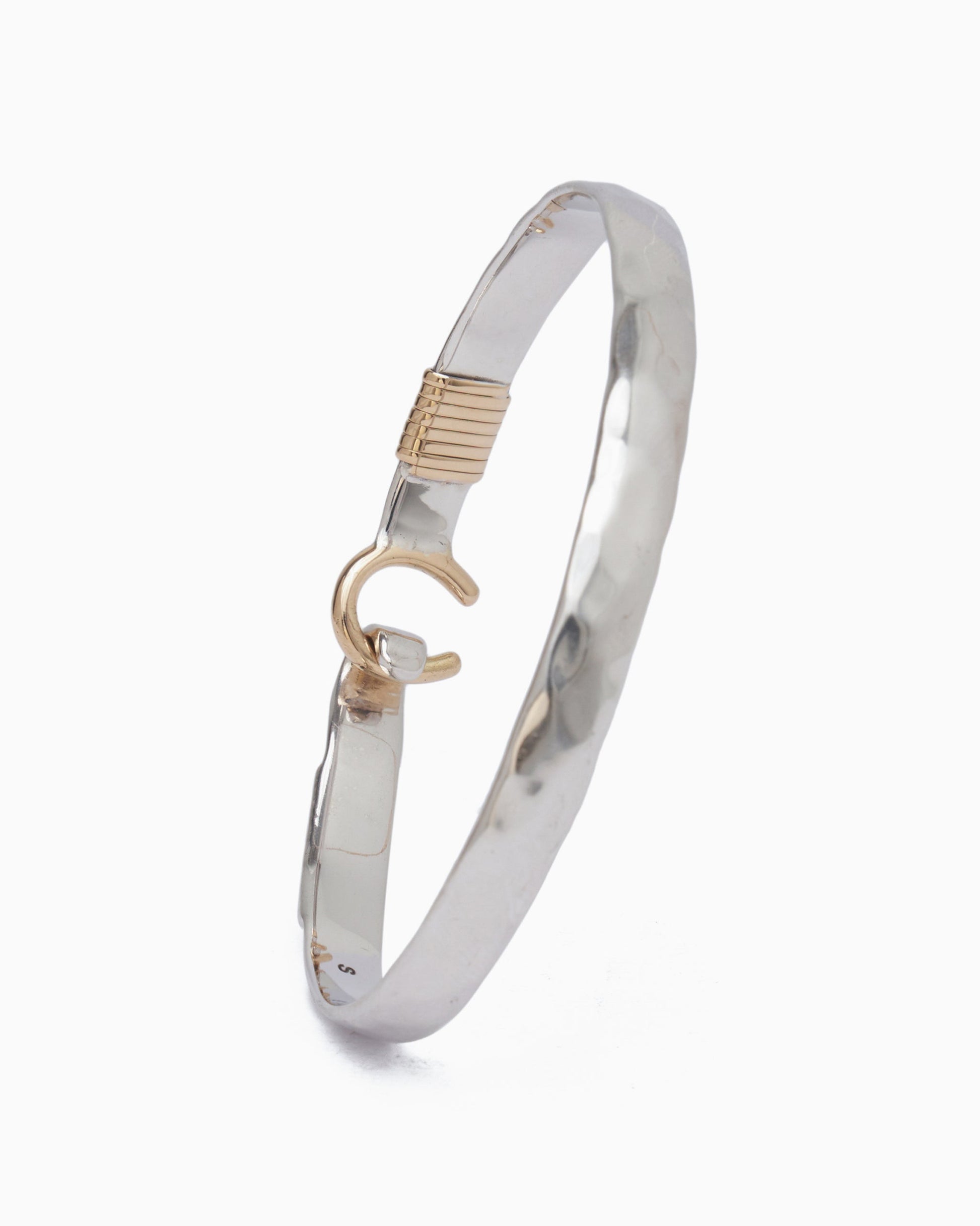 A Vibe signature, The Hook Bracelet is fashioned in gently hammered sterling silver with a "C" hook clasp. Featuring a replica of the St. John petroglyph and seven good luck wraps, solo or stacked, it is sure to be a favorite statement piece. Found in many of our designs, Vibe’s seven good luck wraps represent love, laughter, happiness, good fortune, health, unity, and peace. In the Caribbean tradition, wear your hook facing in to keep love close to your heart, and facing out if you are open to a new love in your life. Wear this piece on its own or stack it with other bracelets for a layered look. For added fun, embellish your new hook bracelet with one or more of Vibe's fun and unique charms!