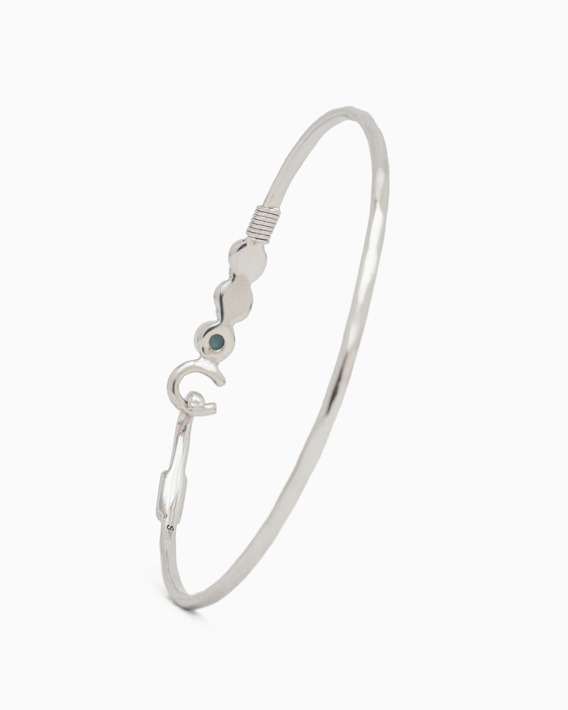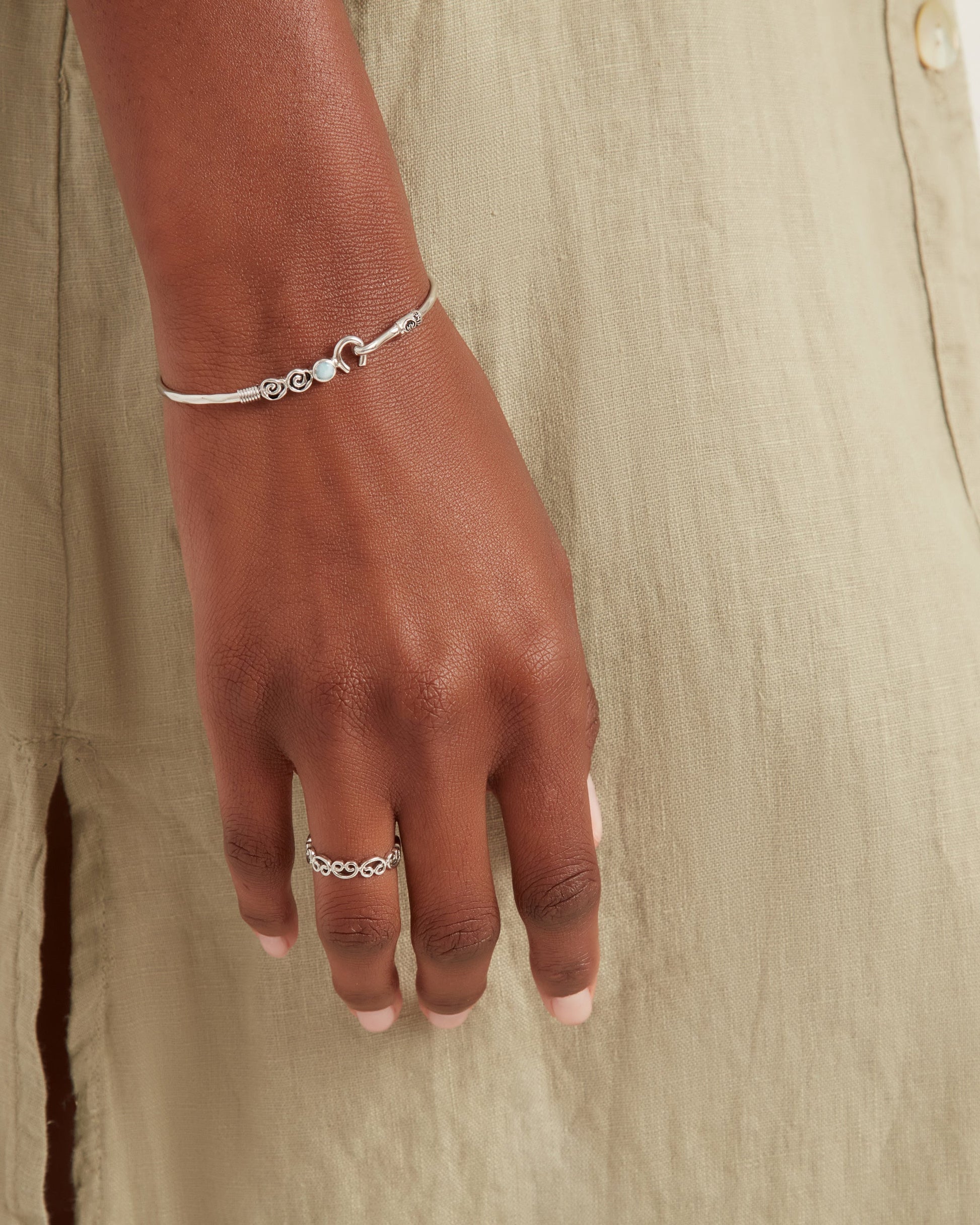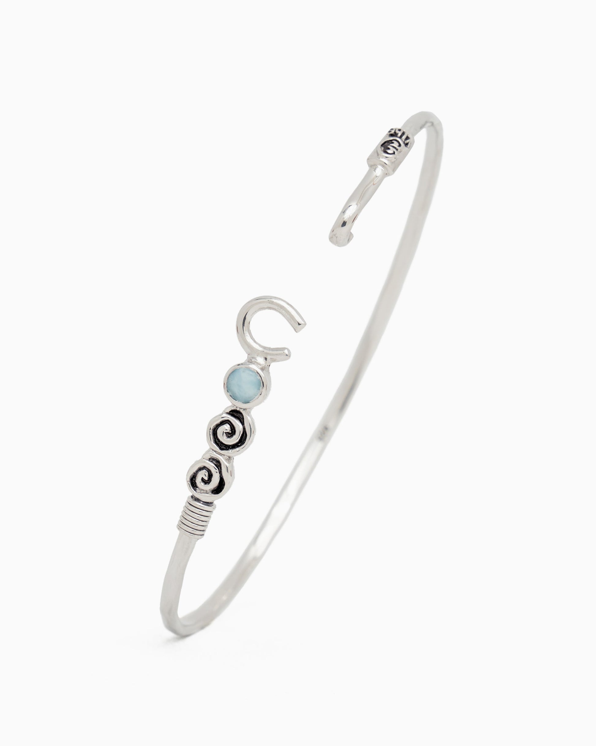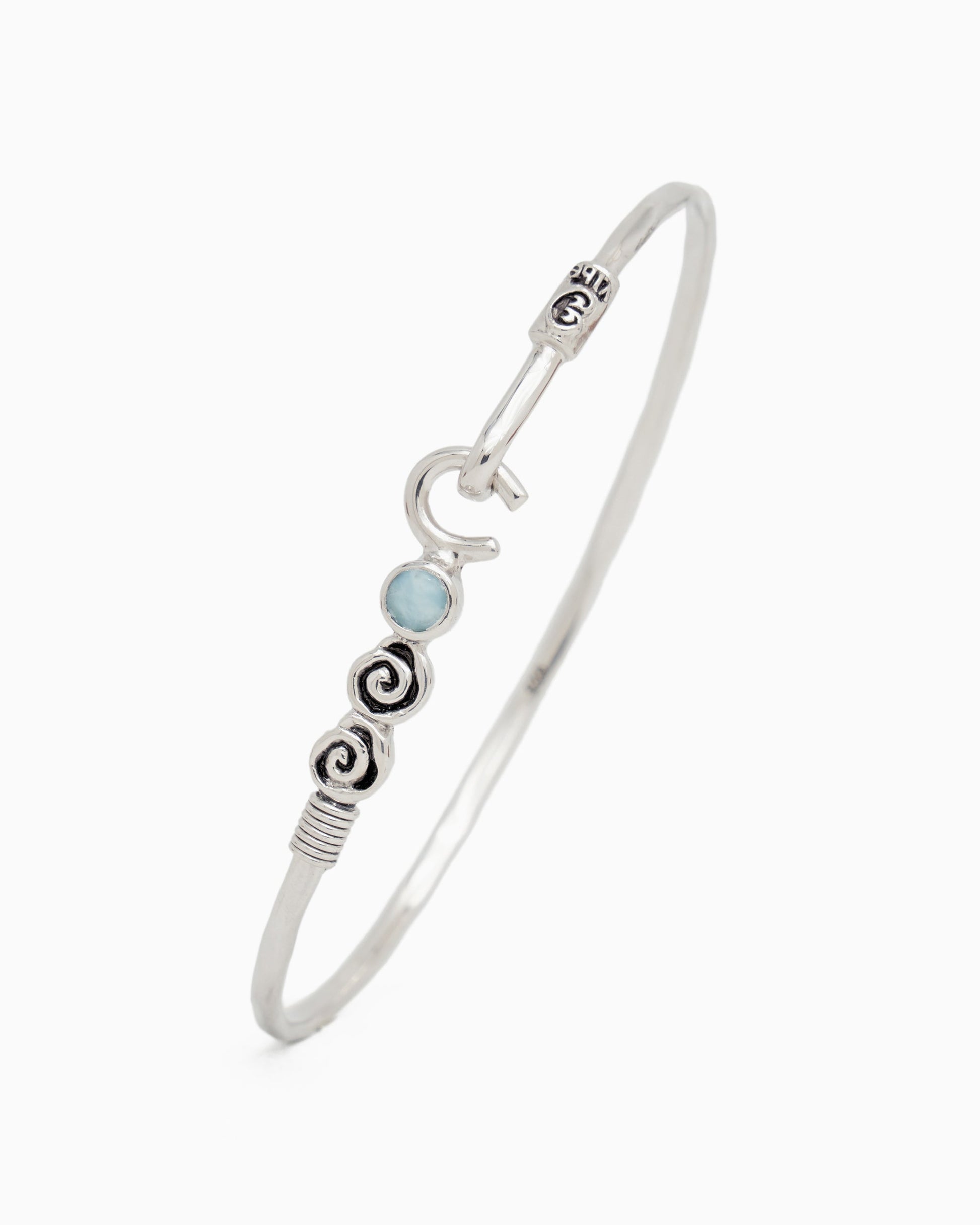 A Vibe signature, The Hook Bracelet with Double Swirls is fashioned in gently hammered sterling silver with a larimar cabochon and "C" hook clasp. Featuring a unique double swirl design replicating drawings of the Taino people that symbolize strength and fortitude. In the Caribbean tradition, wear your hook facing in to keep love close to your heart, and facing out if you are open to a new love in your life. Wear this piece on its own or stack it with other bracelets for a layered look.